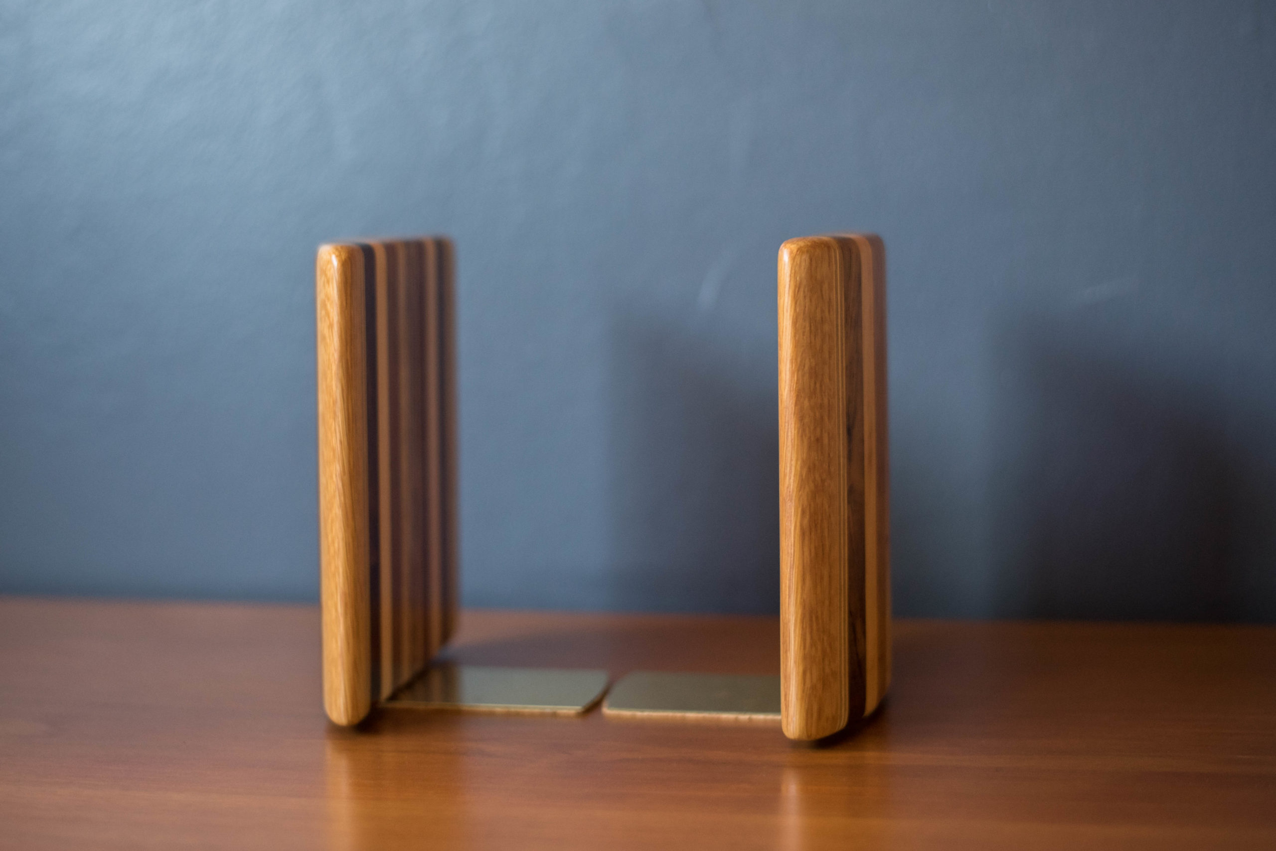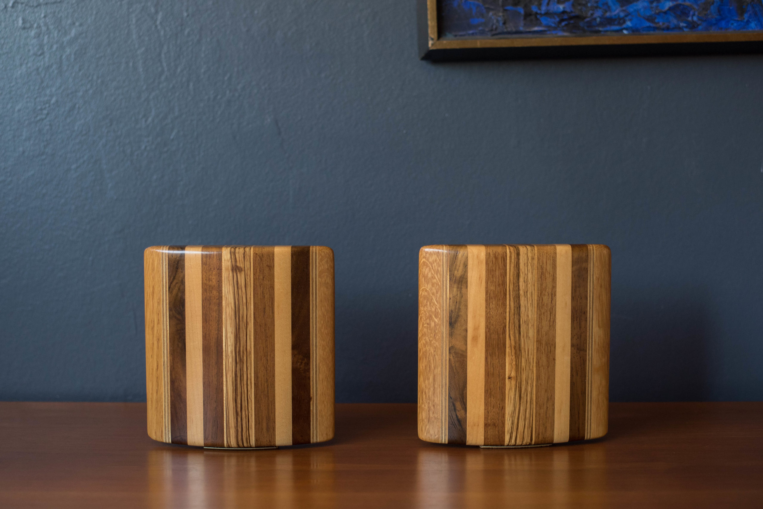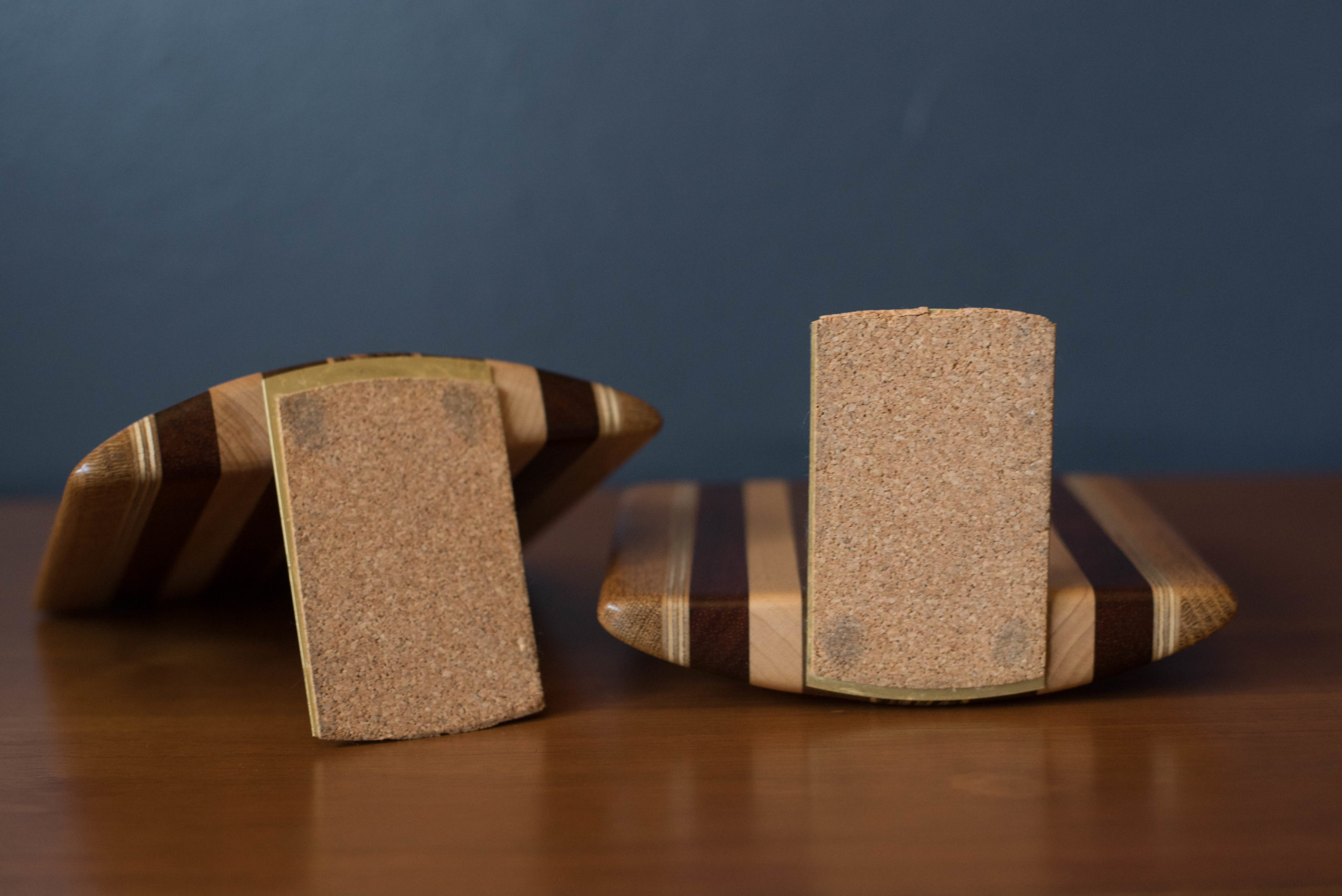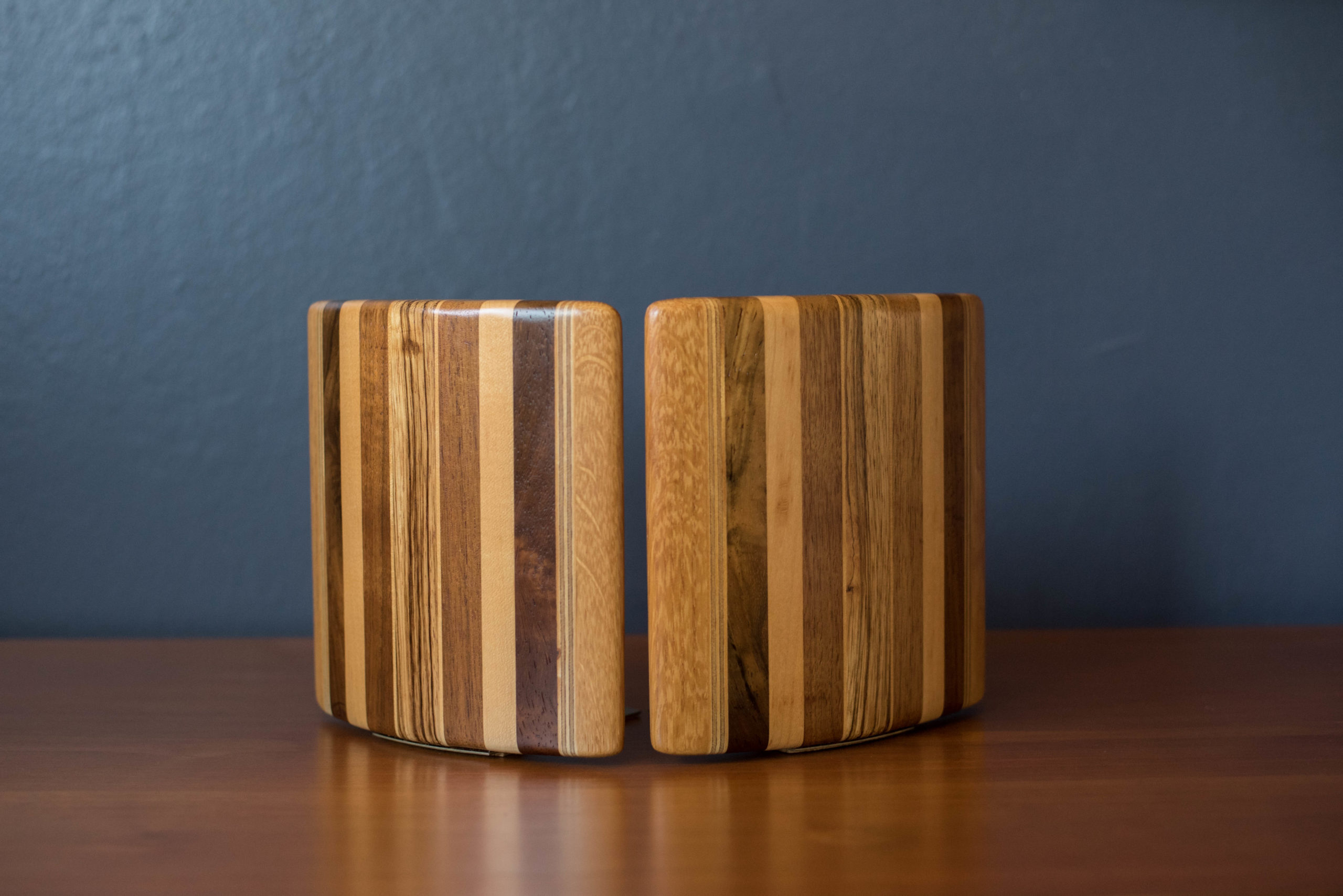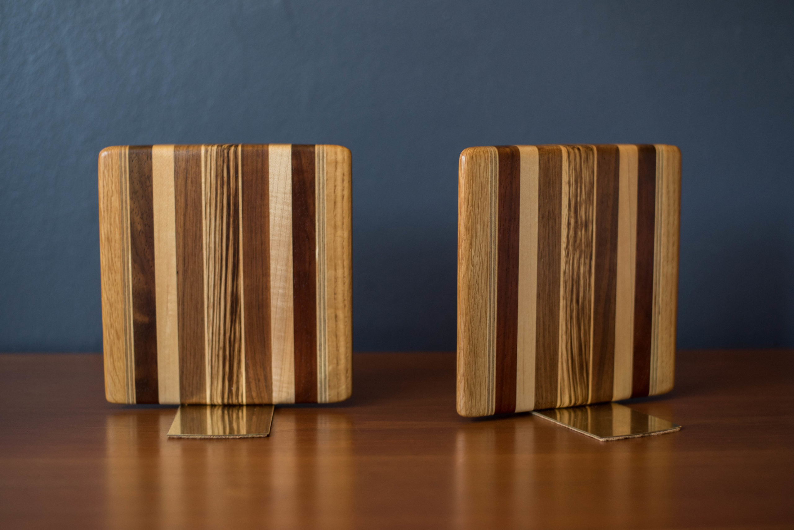 Vintage studio solid planked mixed wood bookends, circa 1970s. This unique set is handcrafted in zebrawood, walnut, maple, oak, rosewood and plywood. Perfect to display with any Danish modern or contemporary decor. Price is for the pair.
