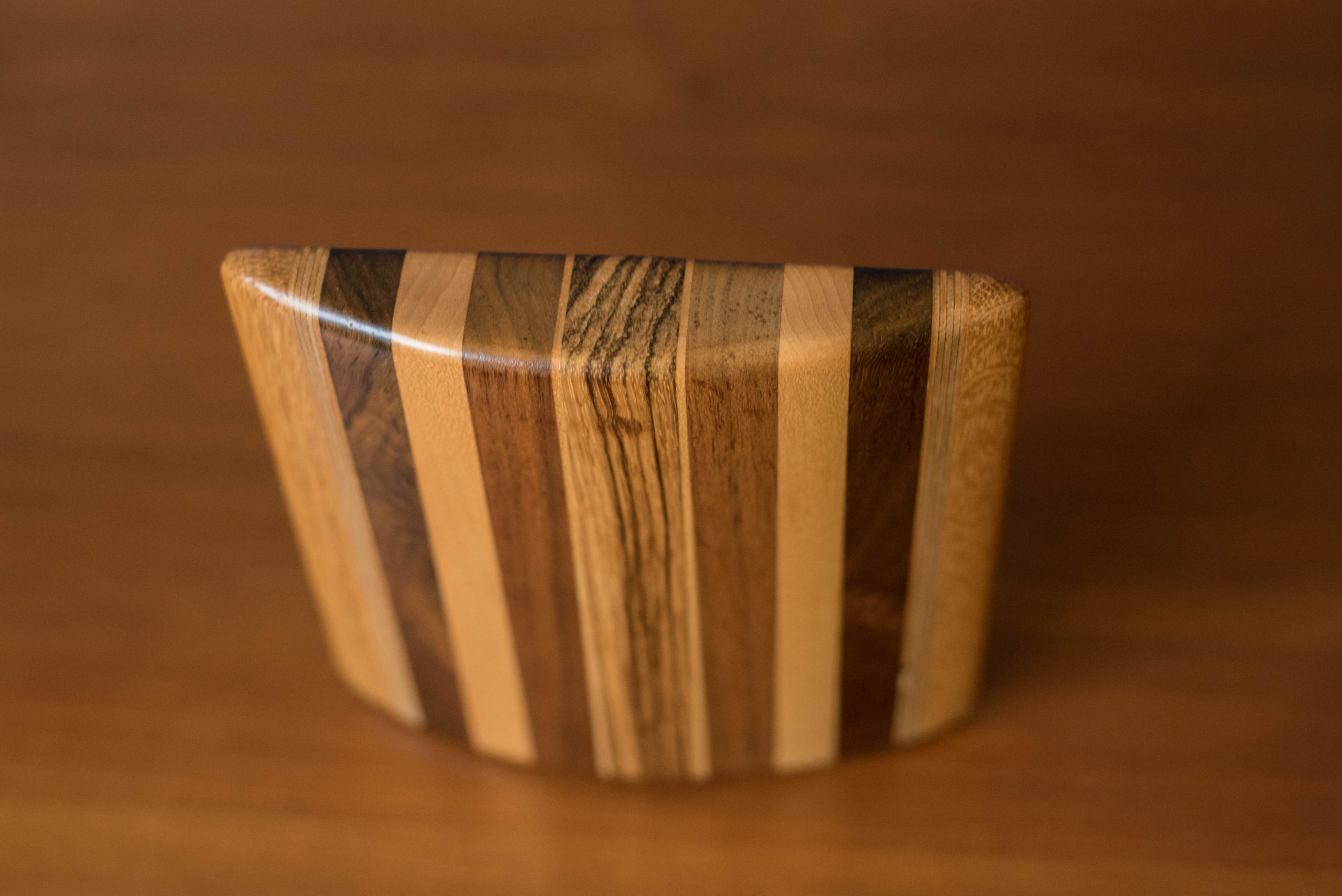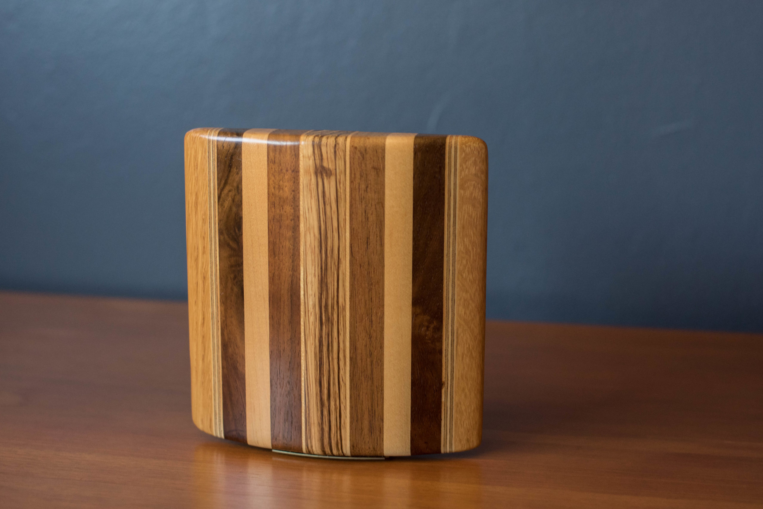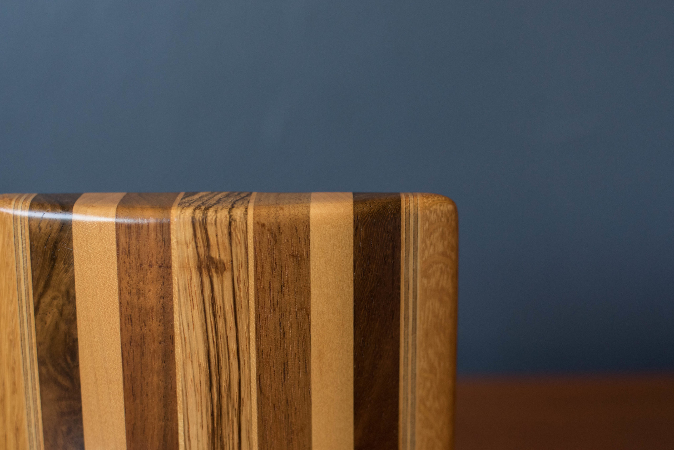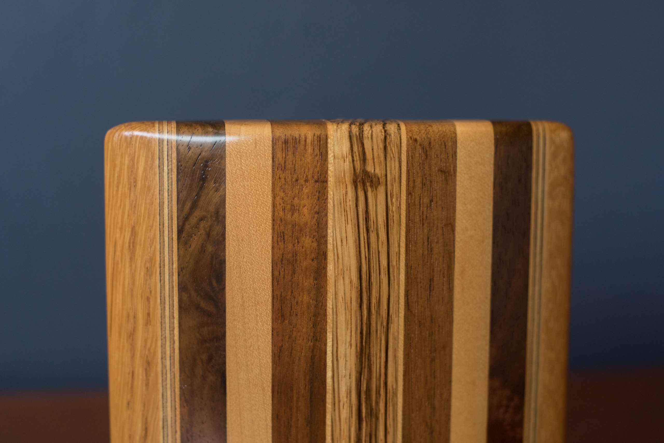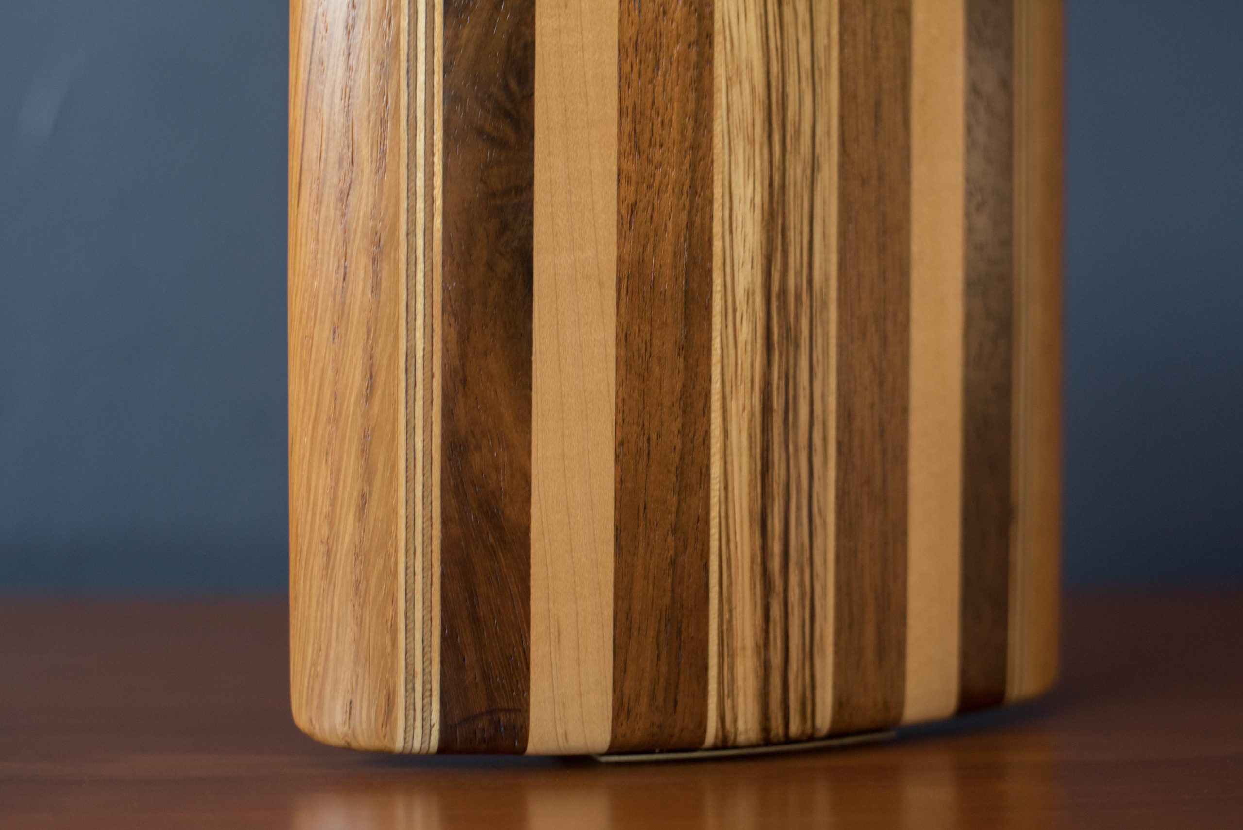 Vintage studio solid planked mixed wood bookends, circa 1970s. This unique set is handcrafted in zebrawood, walnut, maple, oak, rosewood and plywood. Perfect to display with any Danish modern or contemporary decor. Price is for the pair.