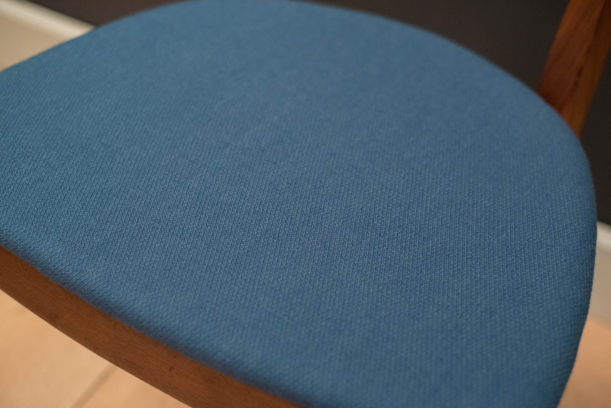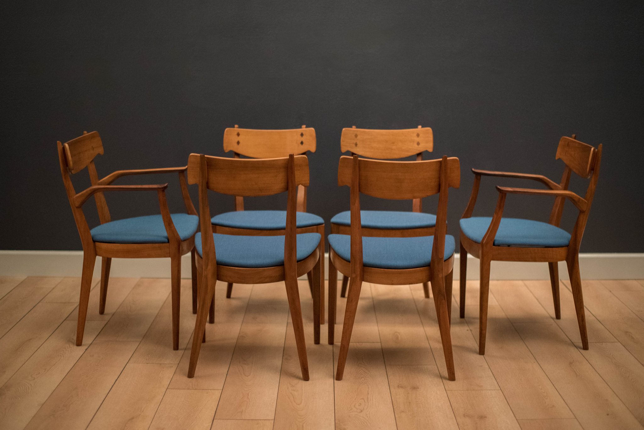 Mid-century modern set of six dining chairs in walnut designed by Kipp Stewart and Stewart McDougall for Drexel Declaration. This set includes two captain armchairs and four side chairs. Backrests feature signature rosewood inlay. Seats have been newly reupholstered in a blue tweed fabric. Price is for the set.