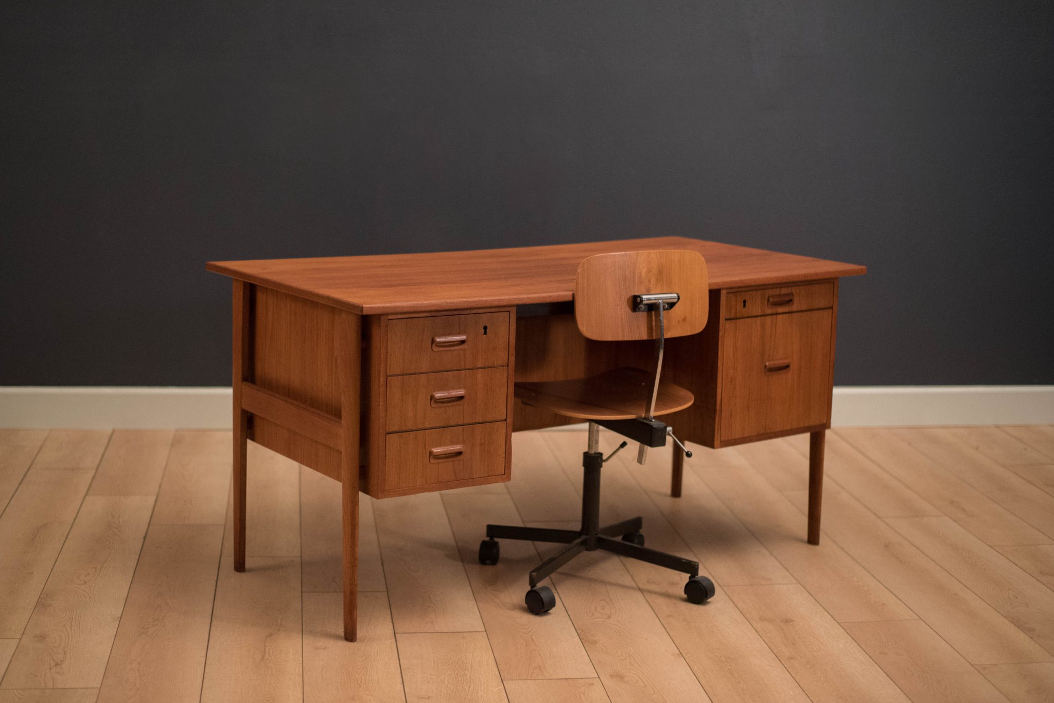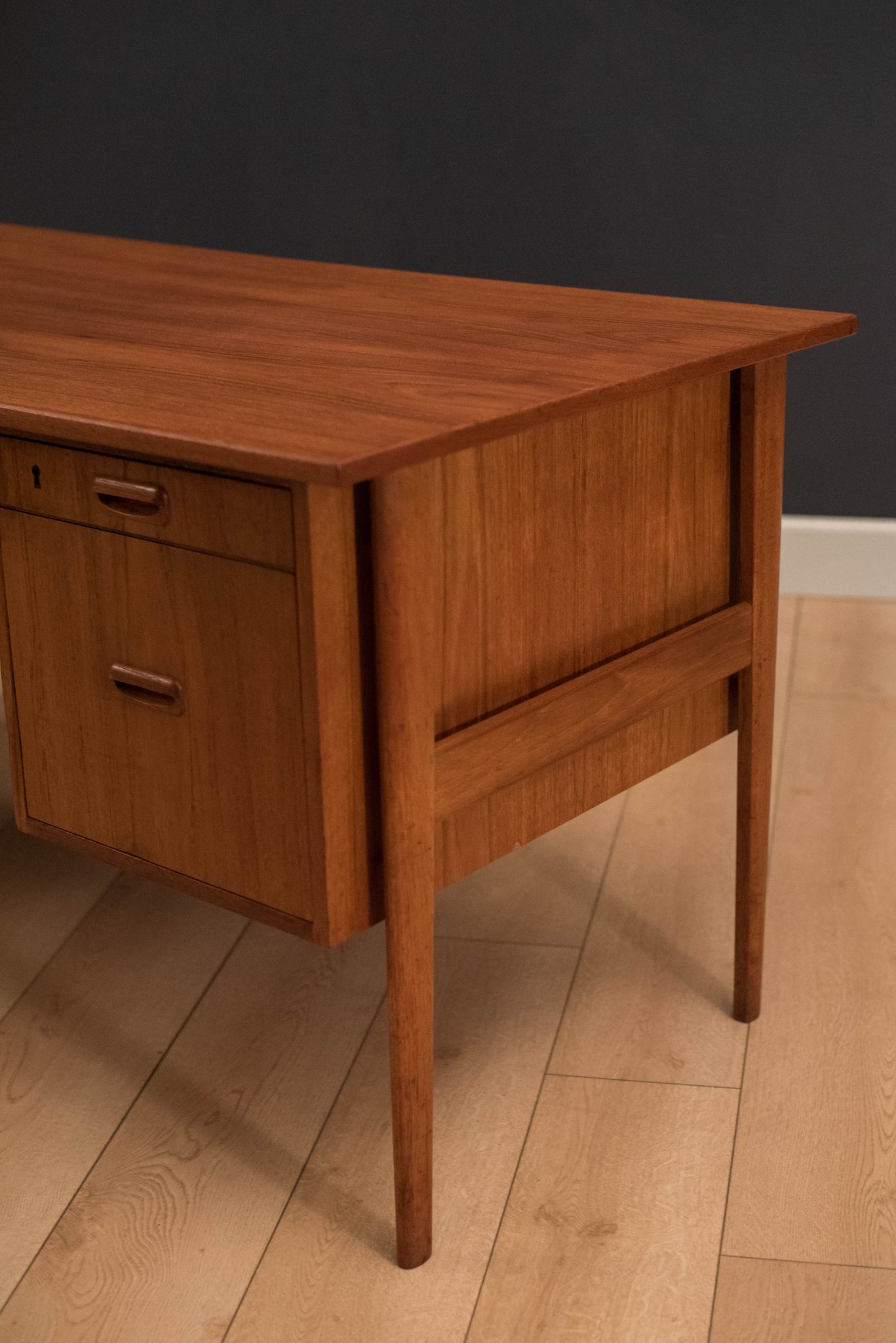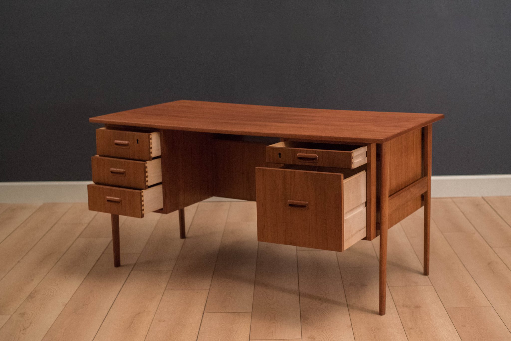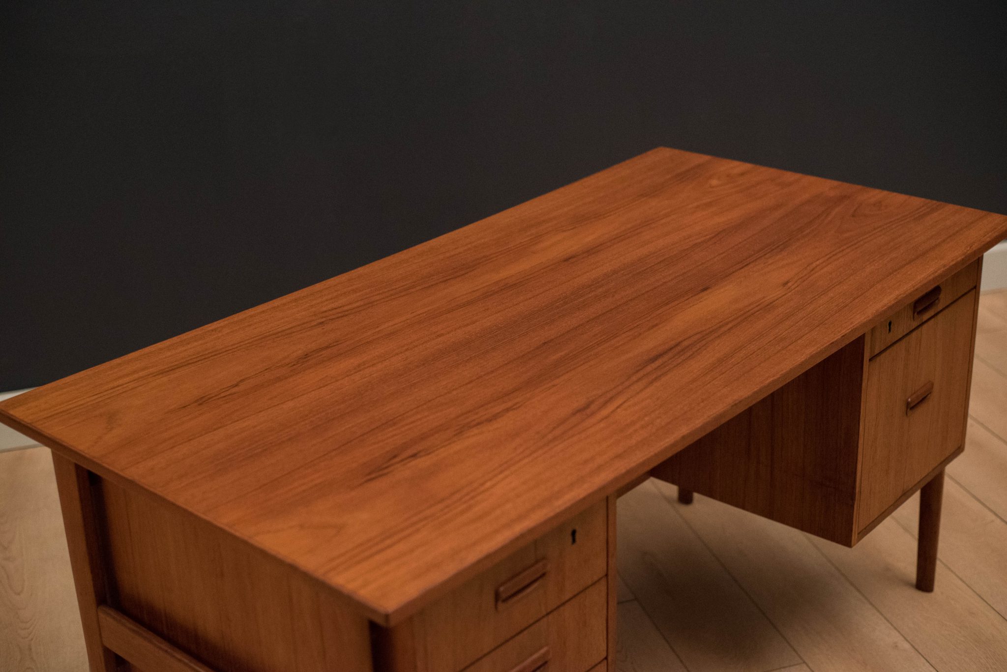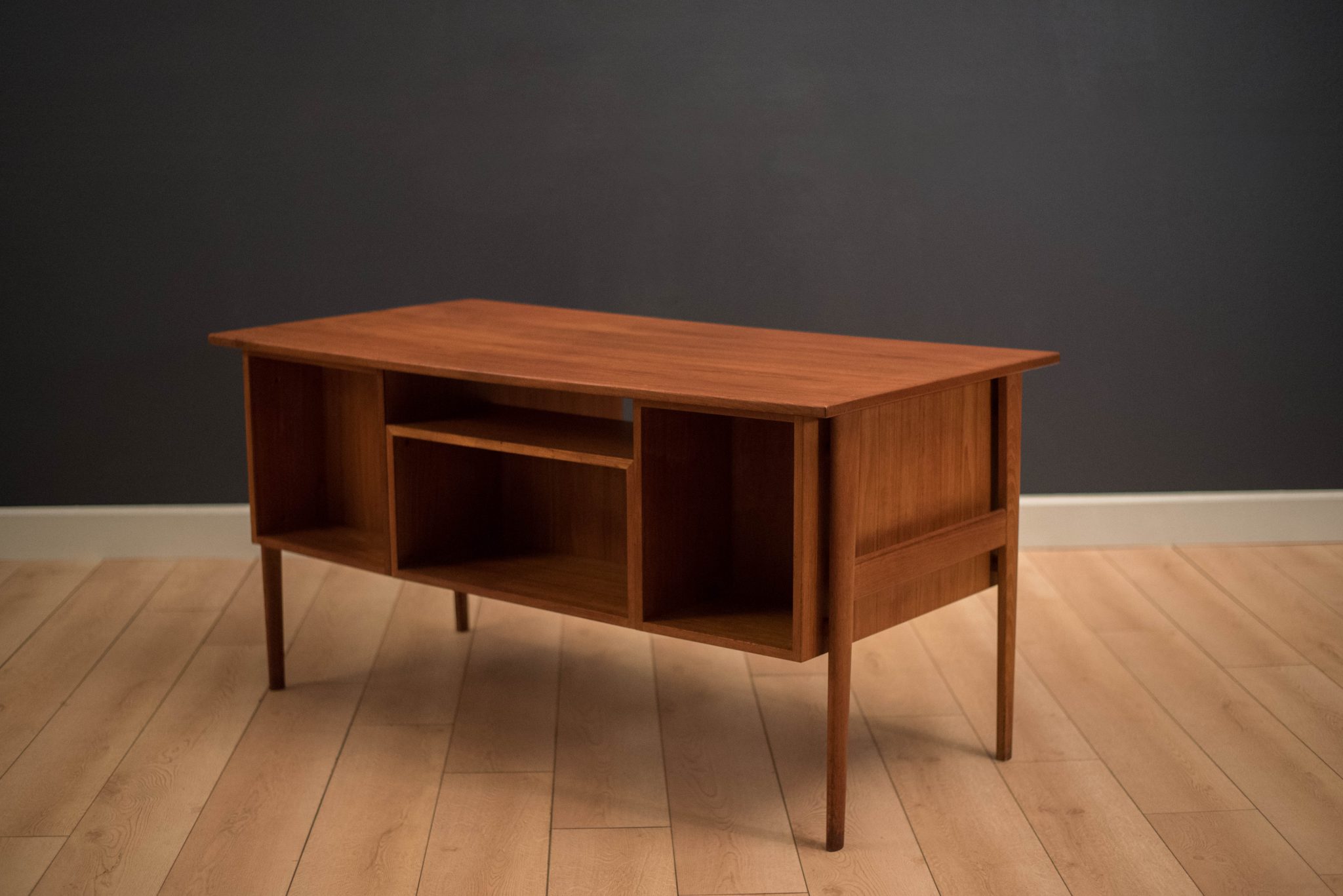 Mid-Century Modern office desk in teak, circa 1960s. This piece features external splayed legs and a floating bookshelf that can be displayed from any angle. Equipped with five dovetailed drawers with sculpted handles, including one file drawer. Skeleton key is also included.