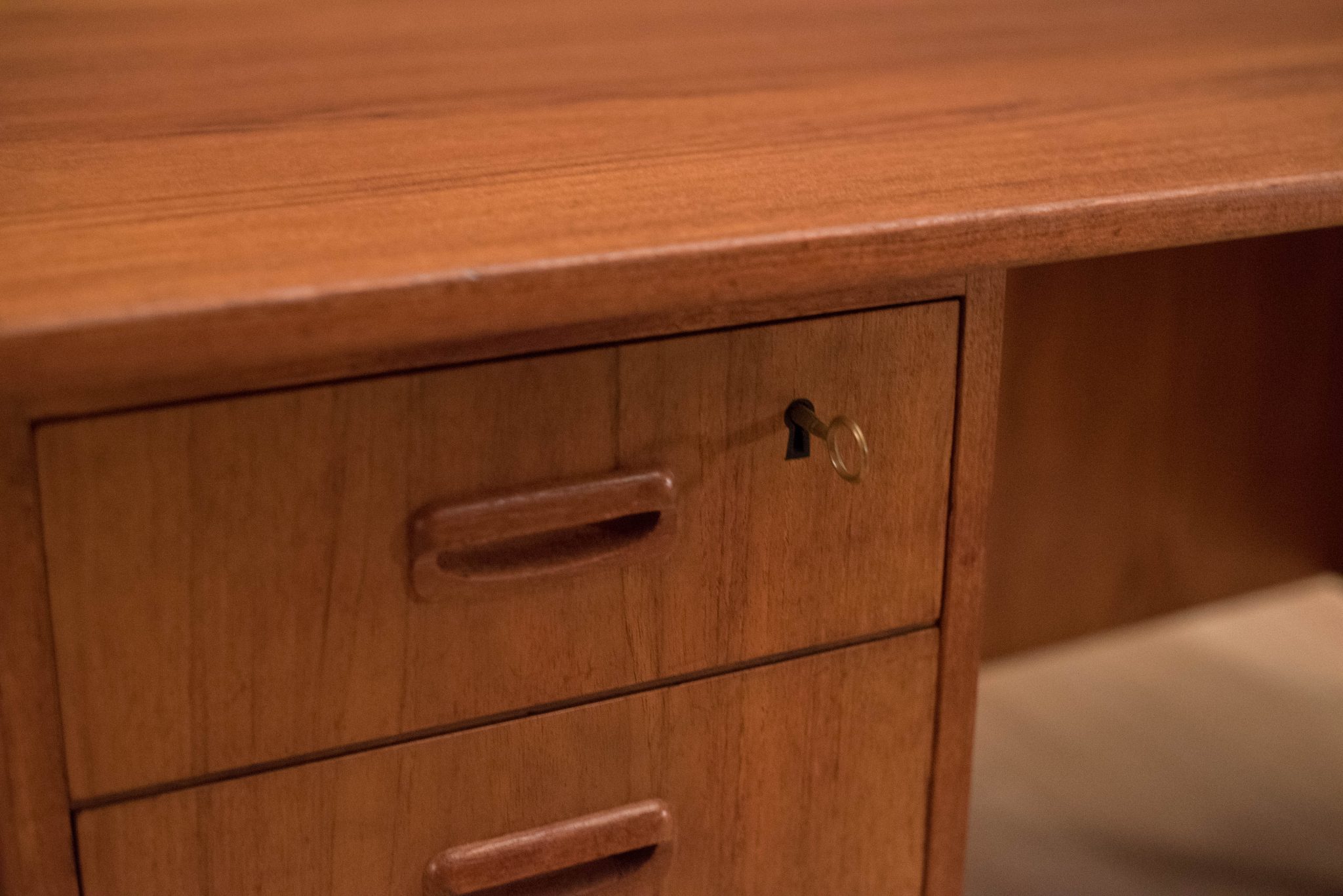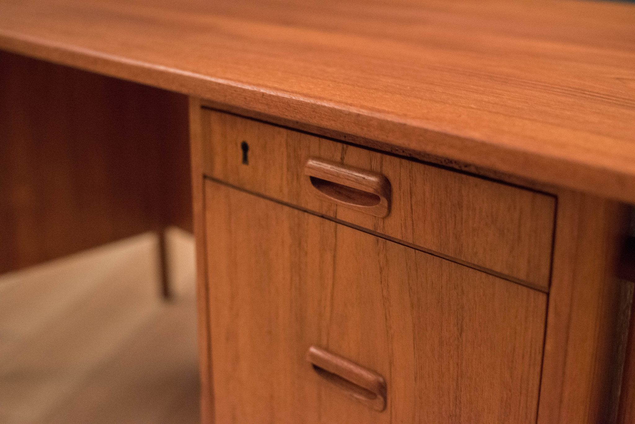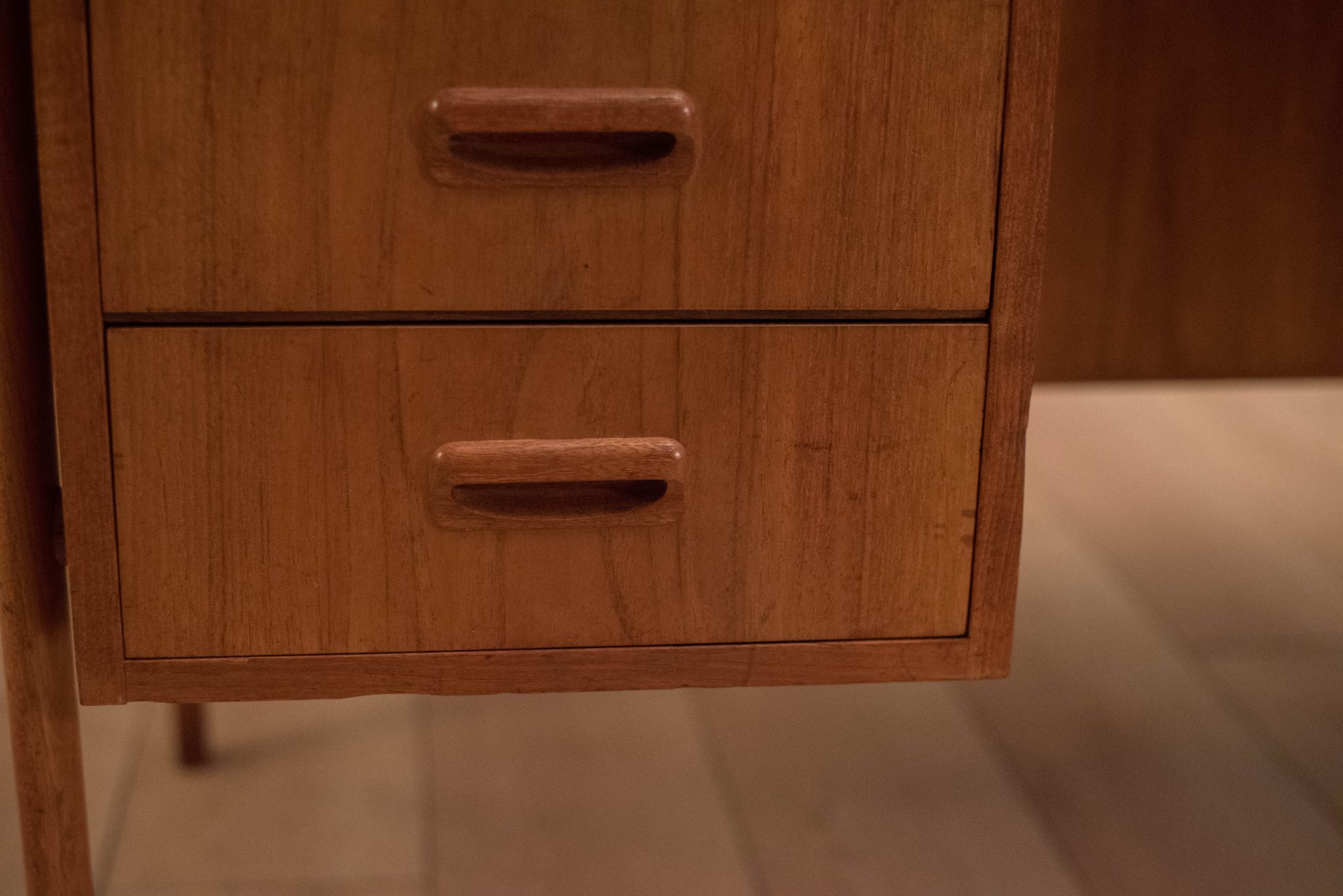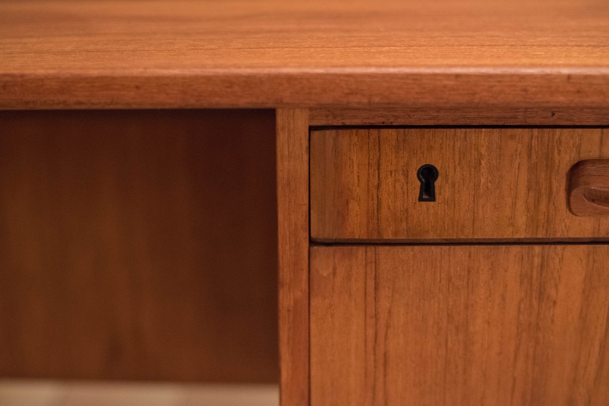 Mid-Century Modern office desk in teak, circa 1960s. This piece features external splayed legs and a floating bookshelf that can be displayed from any angle. Equipped with five dovetailed drawers with sculpted handles, including one file drawer. Skeleton key is also included.