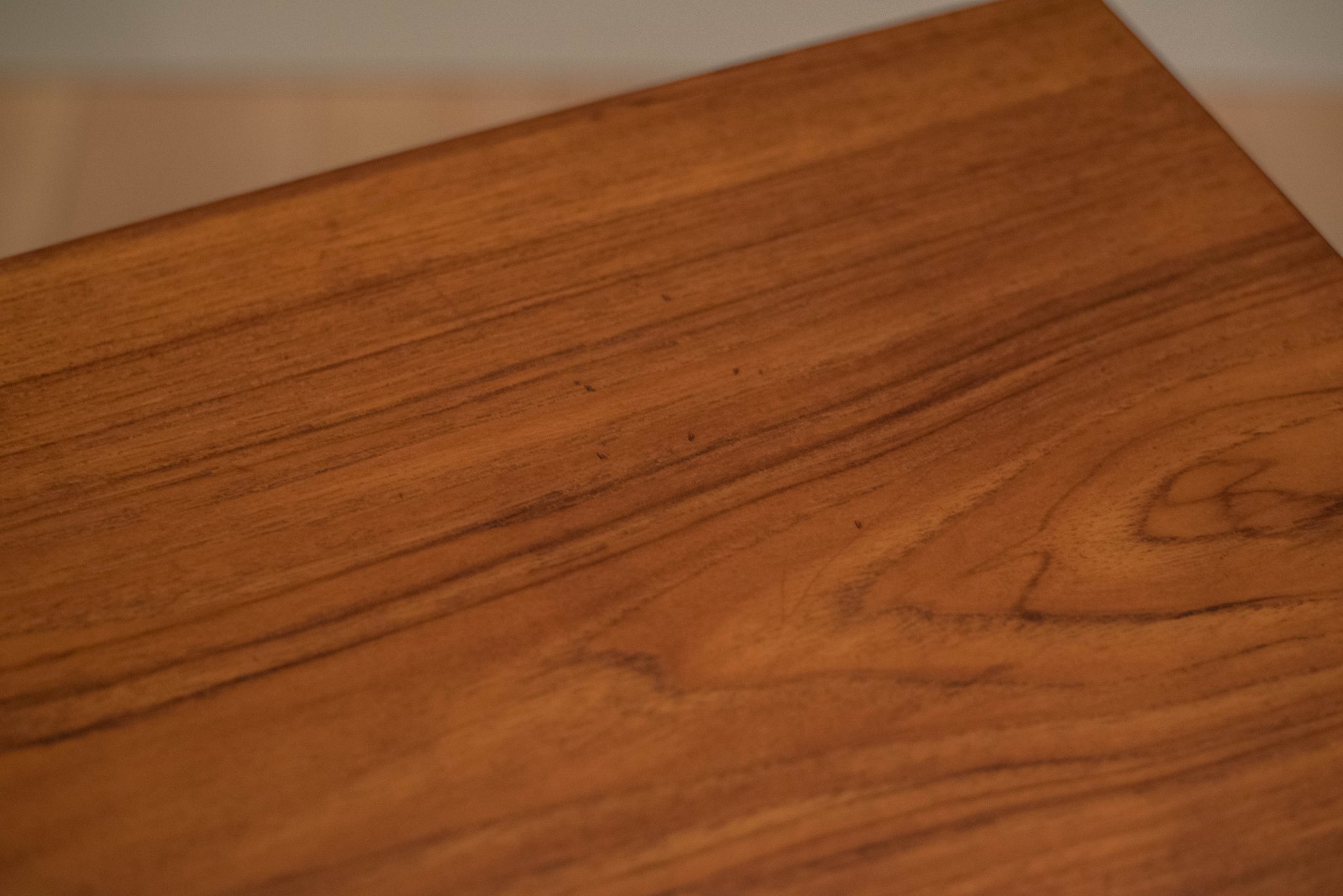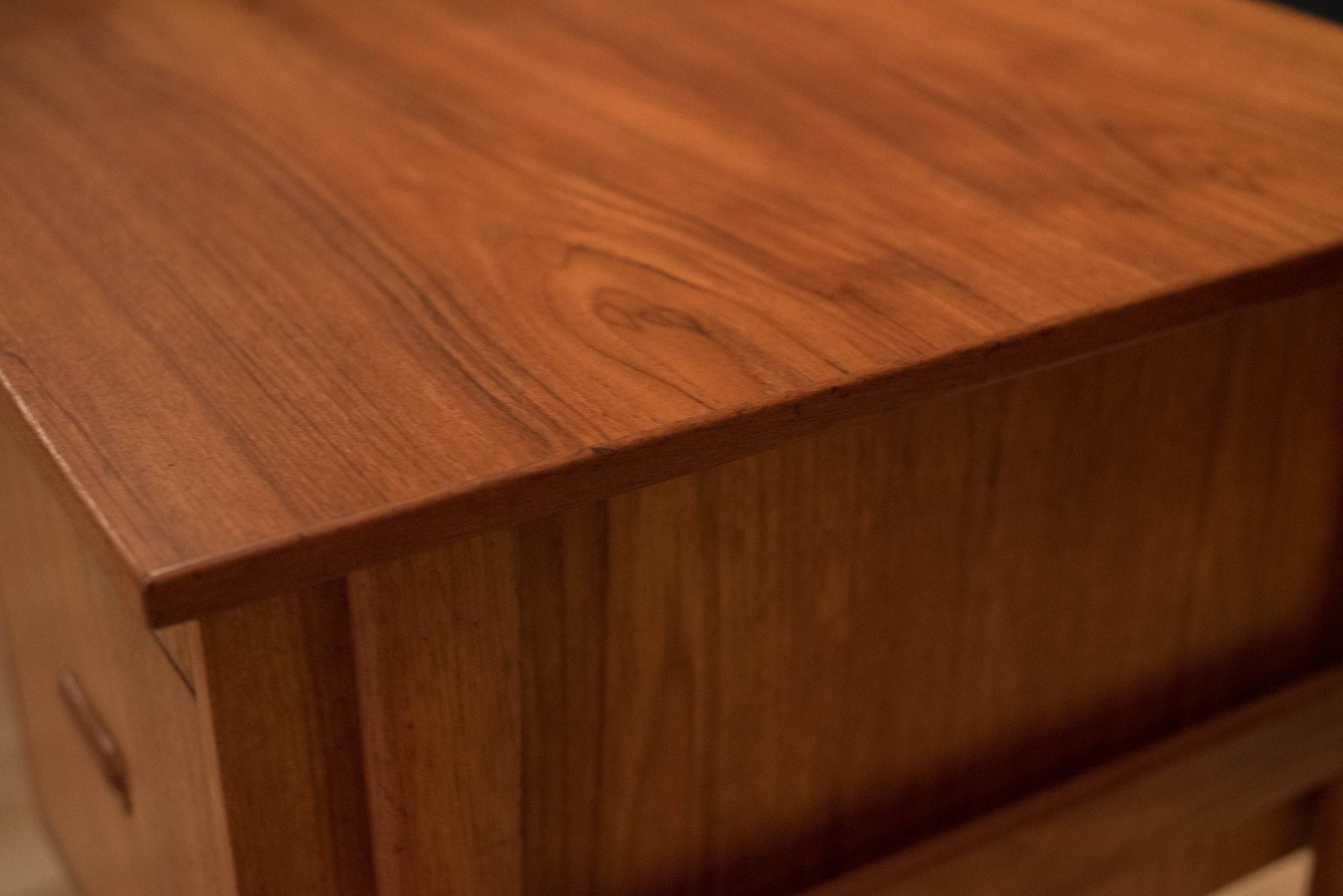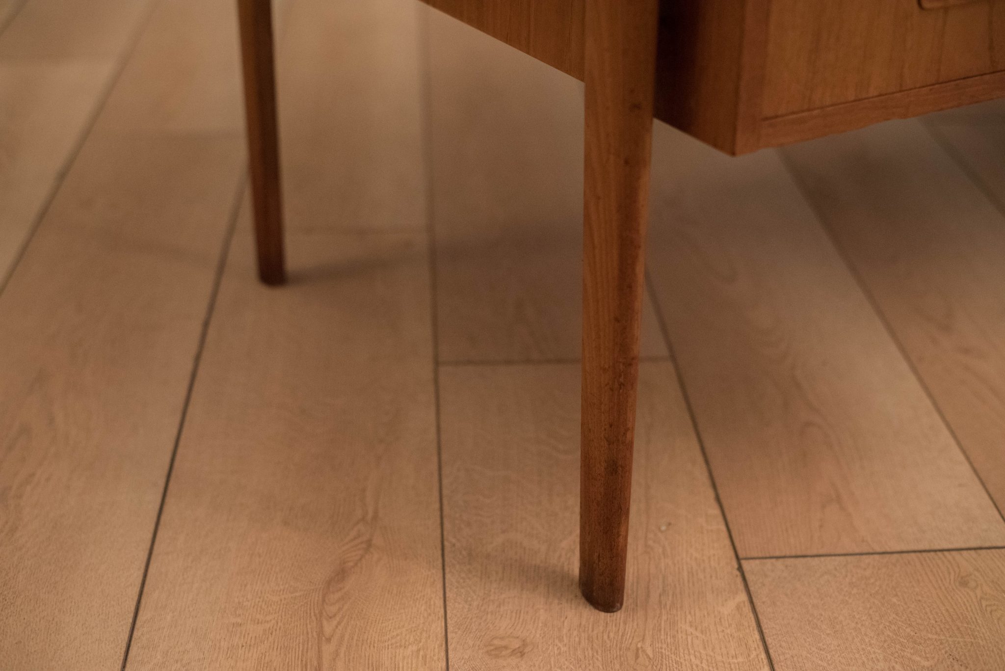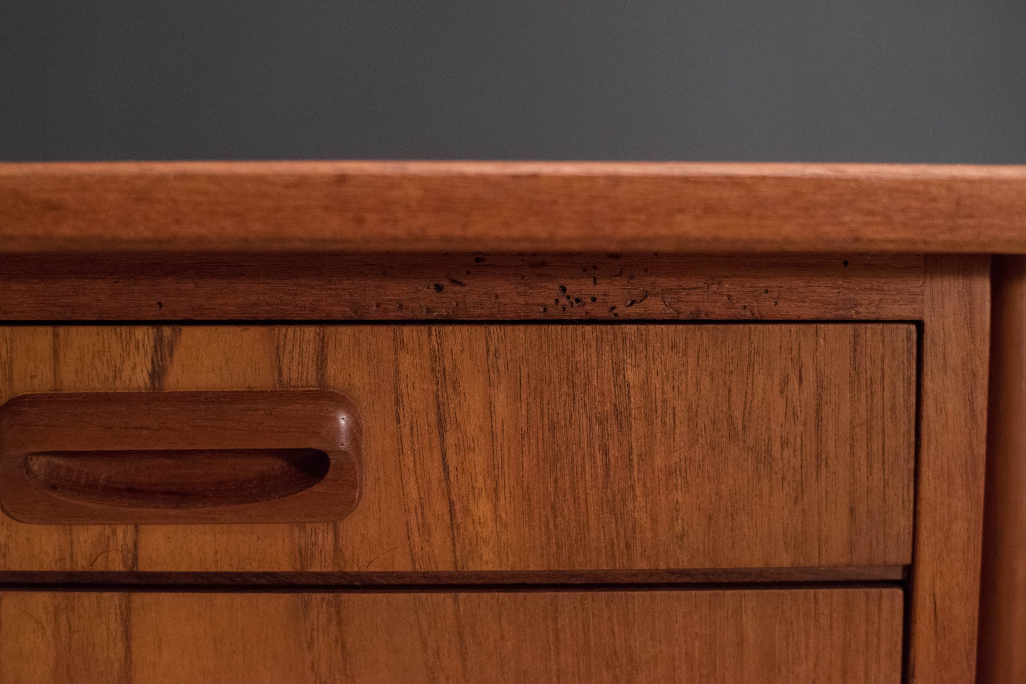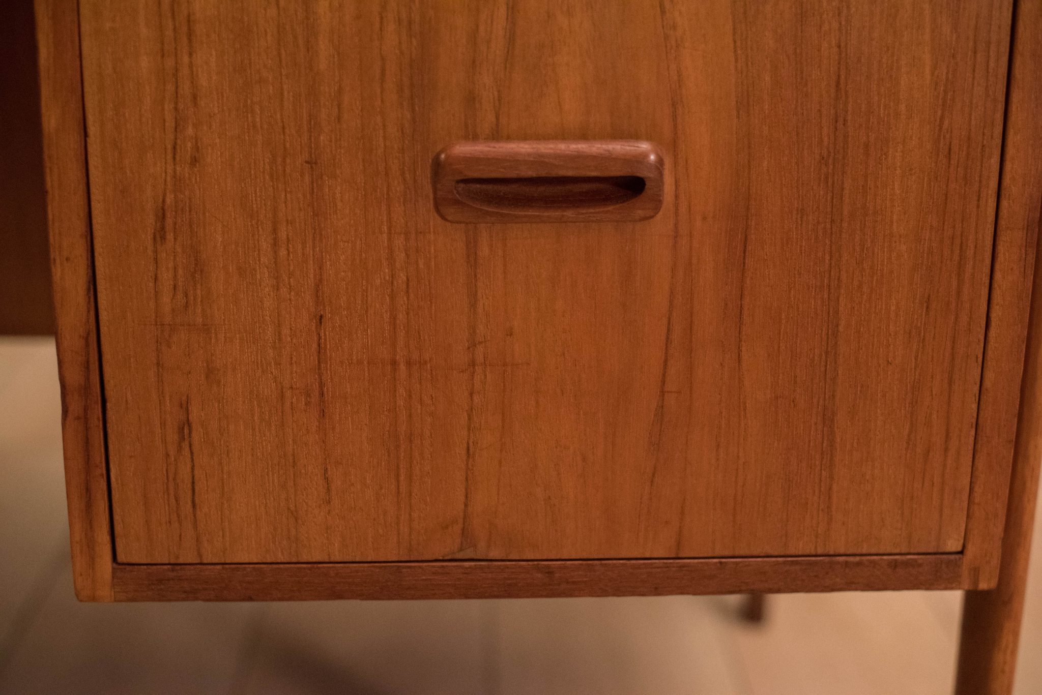 Mid-Century Modern office desk in teak, circa 1960s. This piece features external splayed legs and a floating bookshelf that can be displayed from any angle. Equipped with five dovetailed drawers with sculpted handles, including one file drawer. Skeleton key is also included.