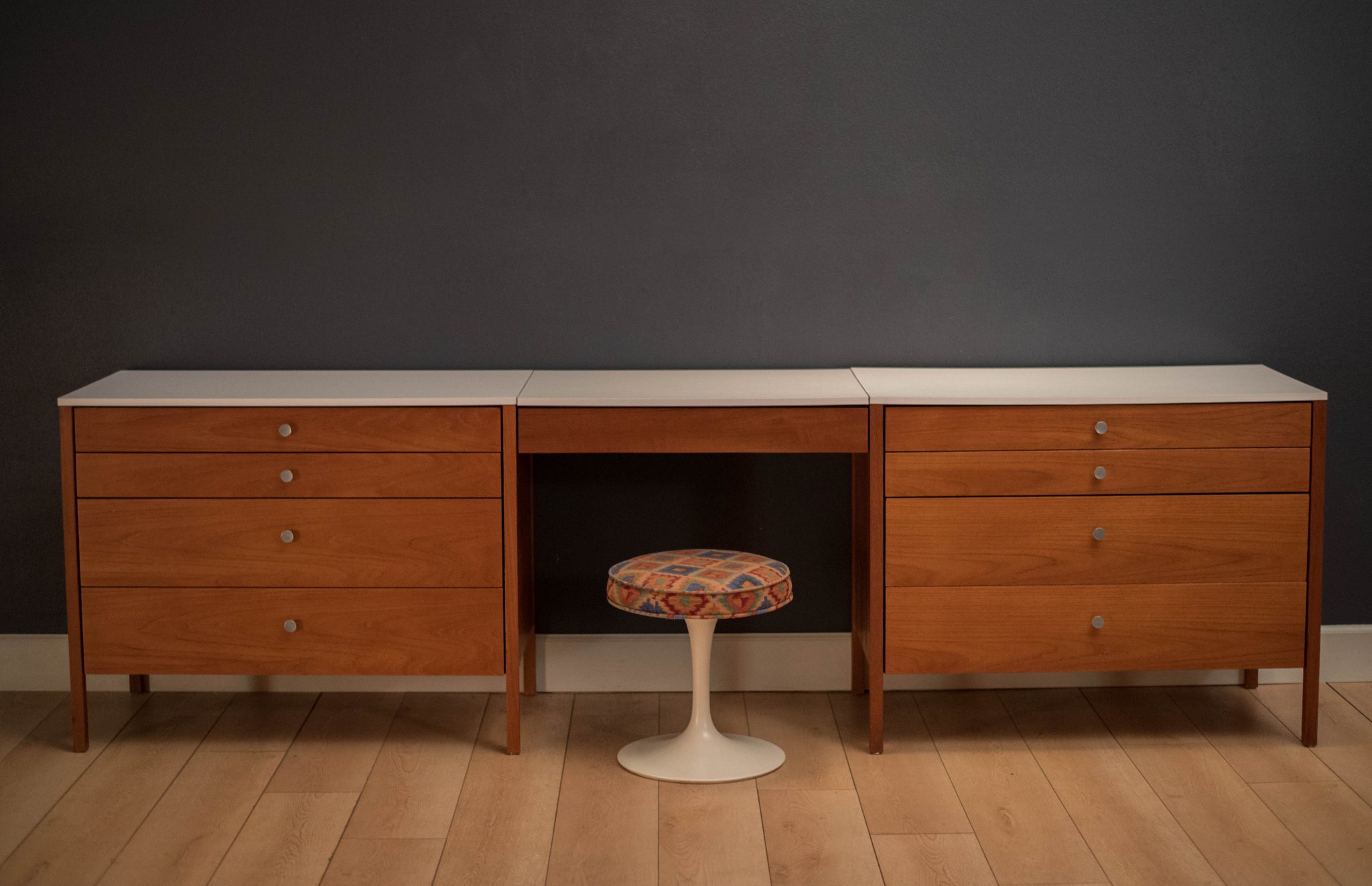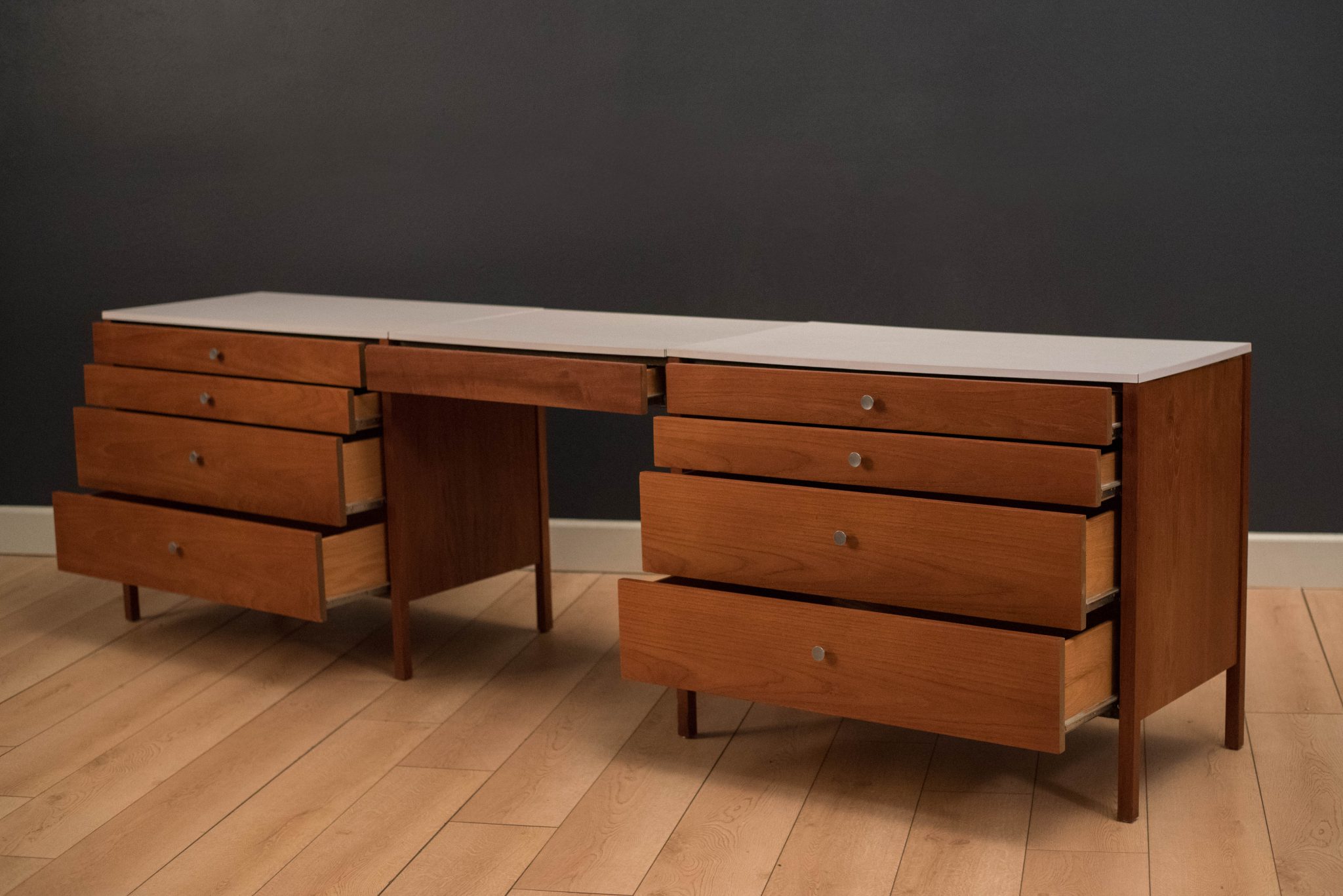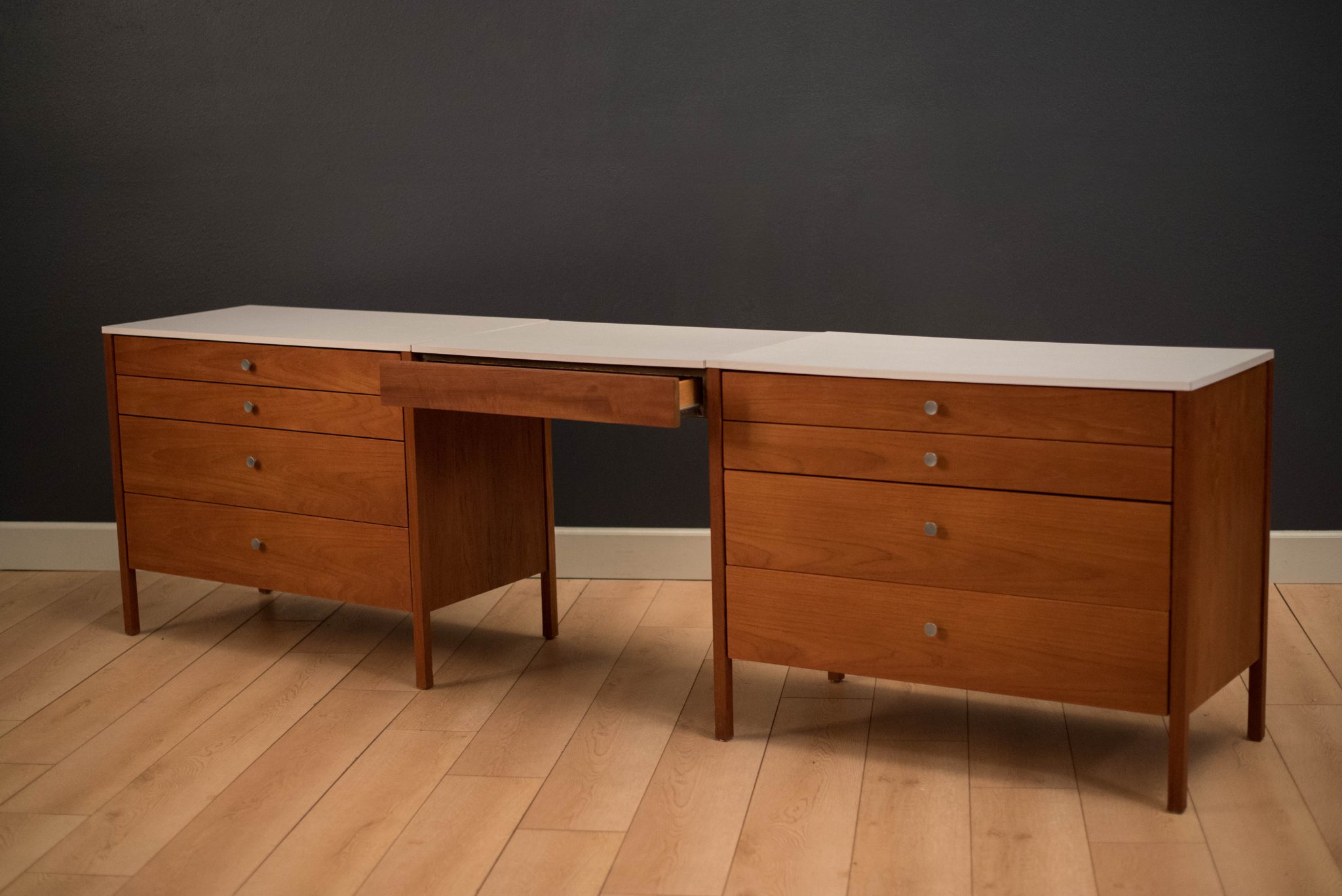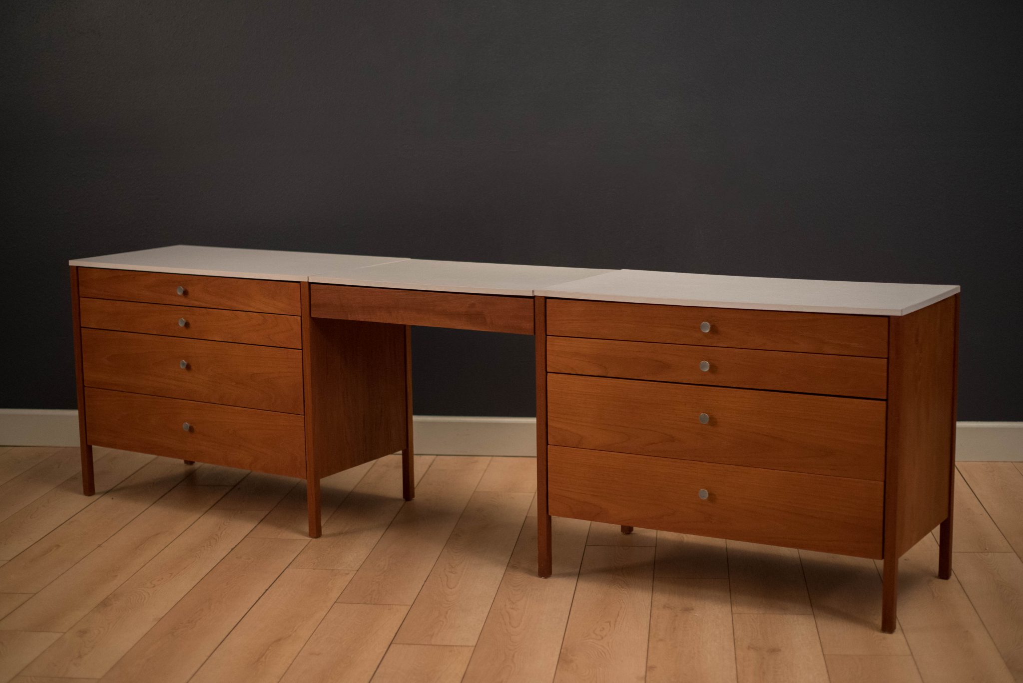 Vintage three piece dresser set in teak designed by Florence Knoll, circa 1950s. This set includes a pair of matching dressers with aluminum pulls and a removable drawer vanity or desk. White laminate tops allow for easy maintenance and are also finished on the back.