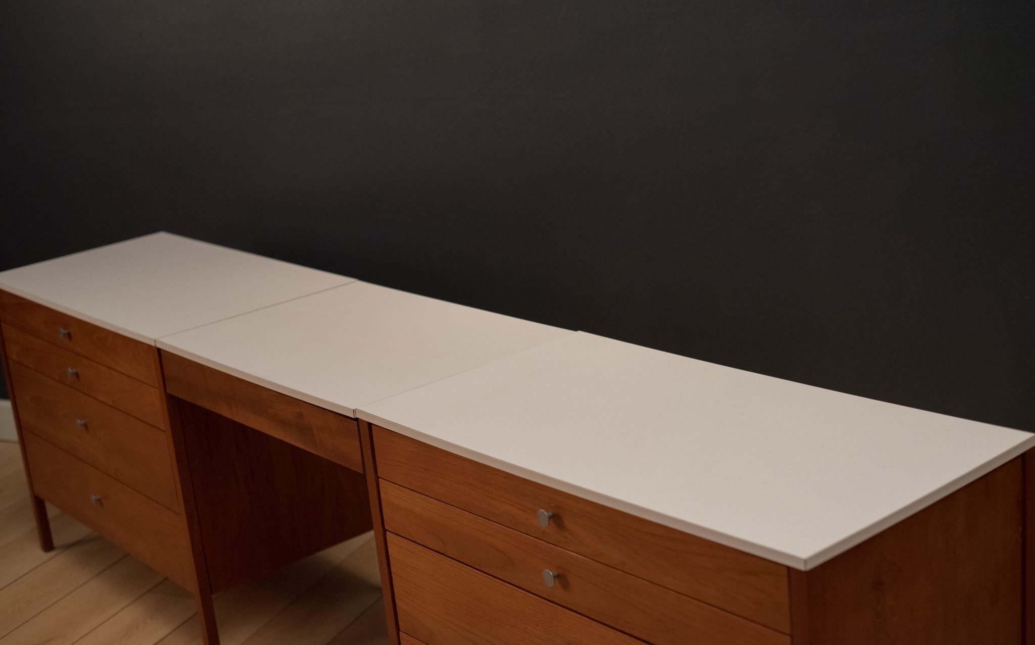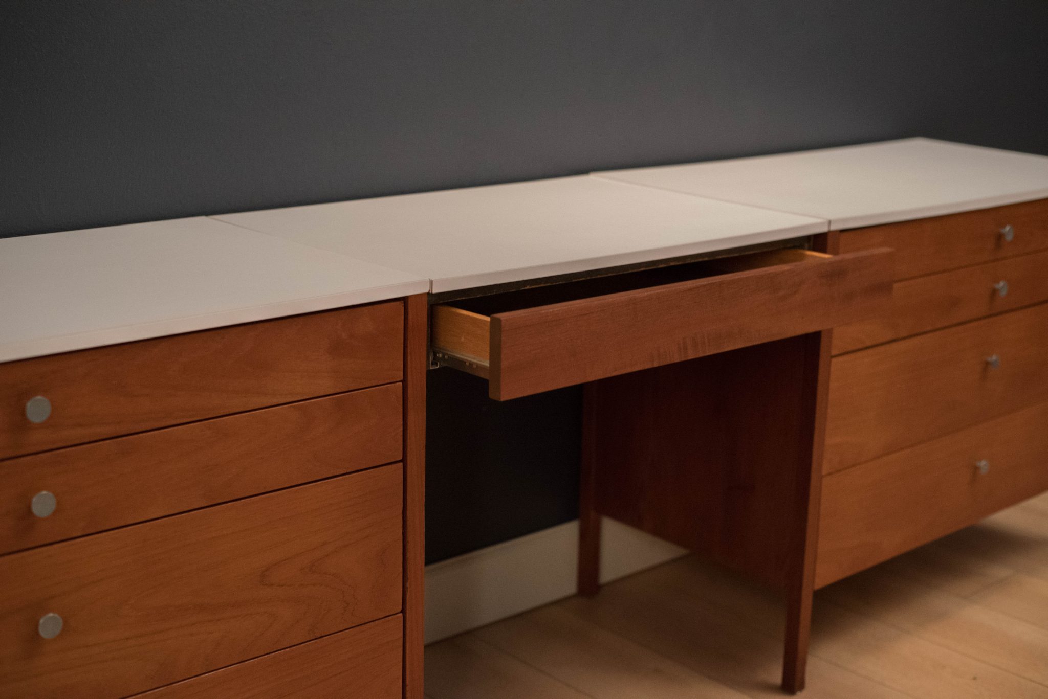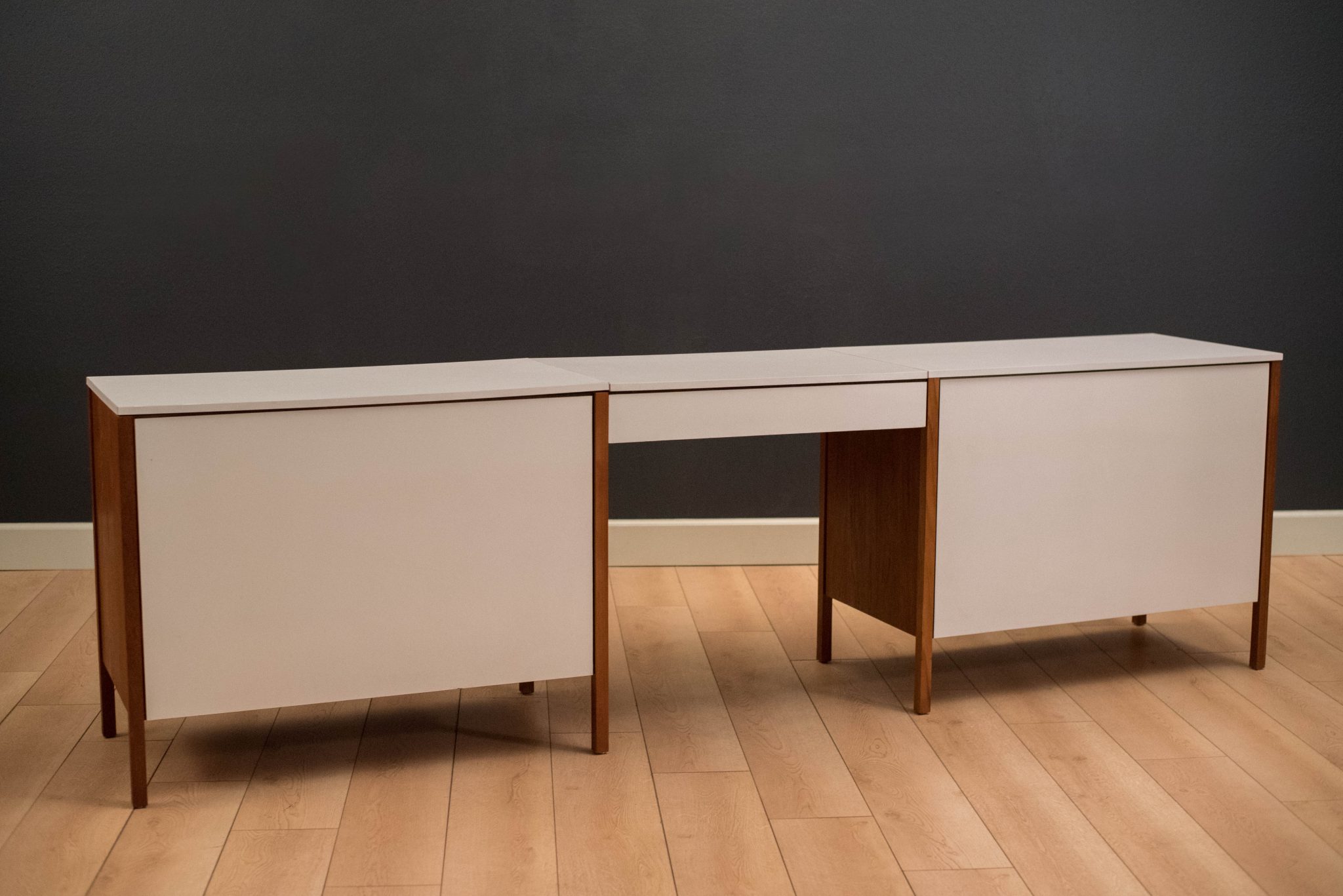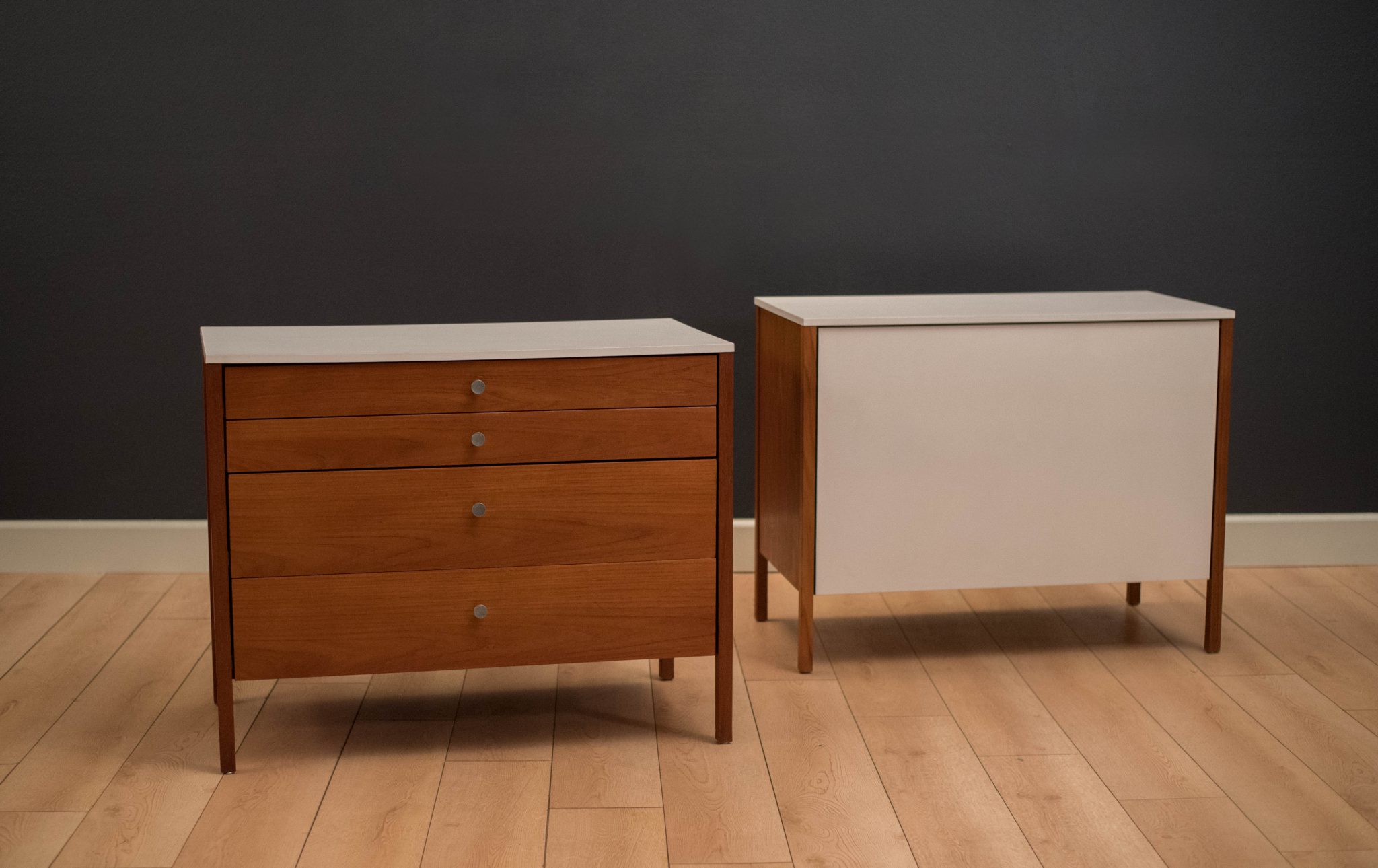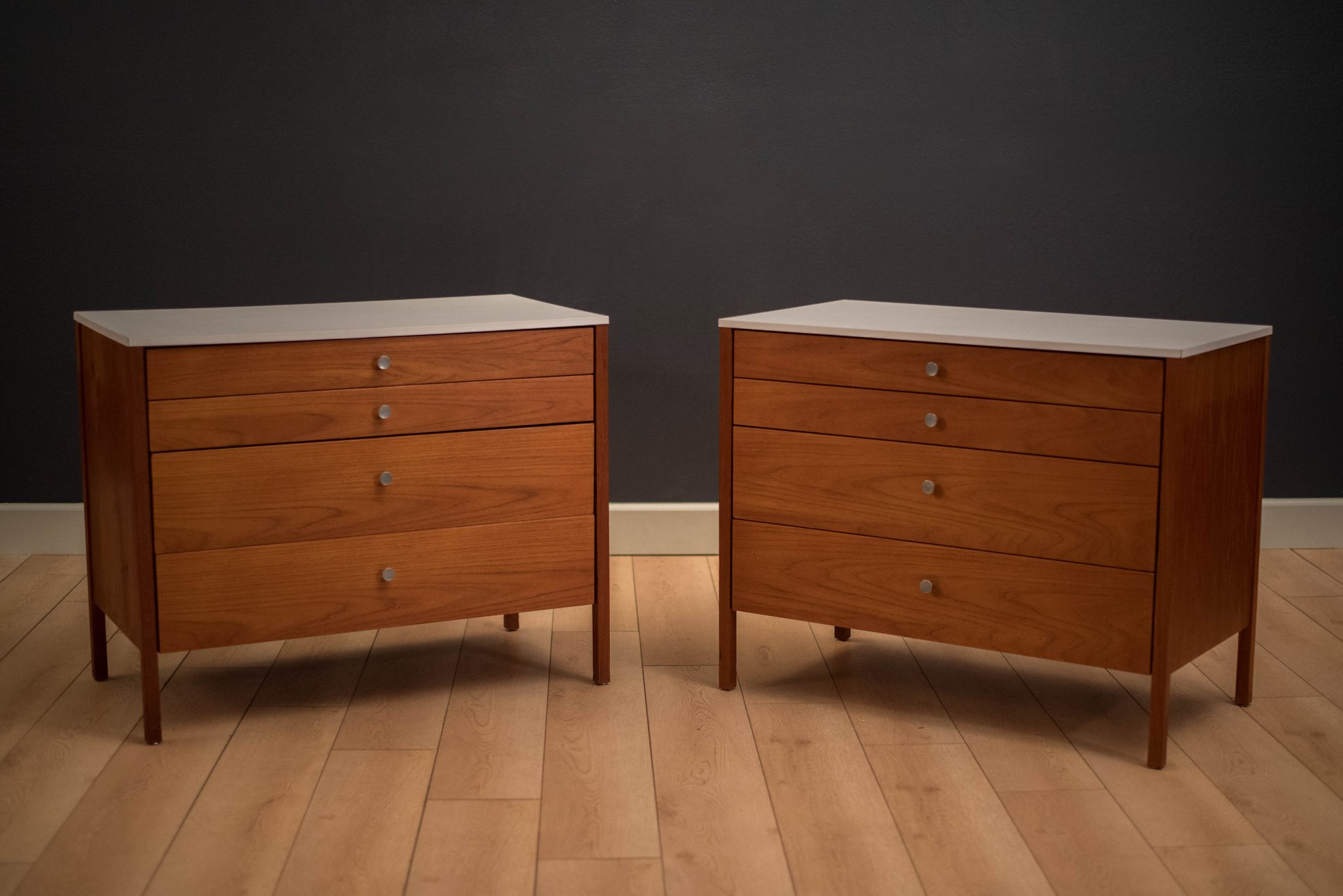 Vintage three piece dresser set in teak designed by Florence Knoll, circa 1950s. This set includes a pair of matching dressers with aluminum pulls and a removable drawer vanity or desk. White laminate tops allow for easy maintenance and are also finished on the back.