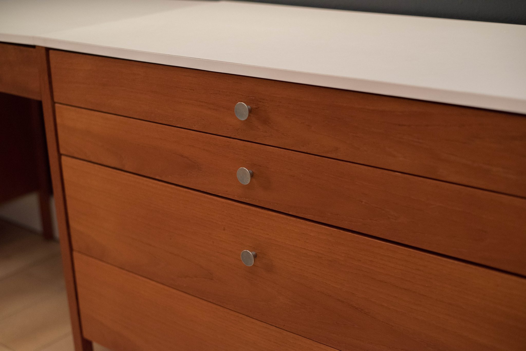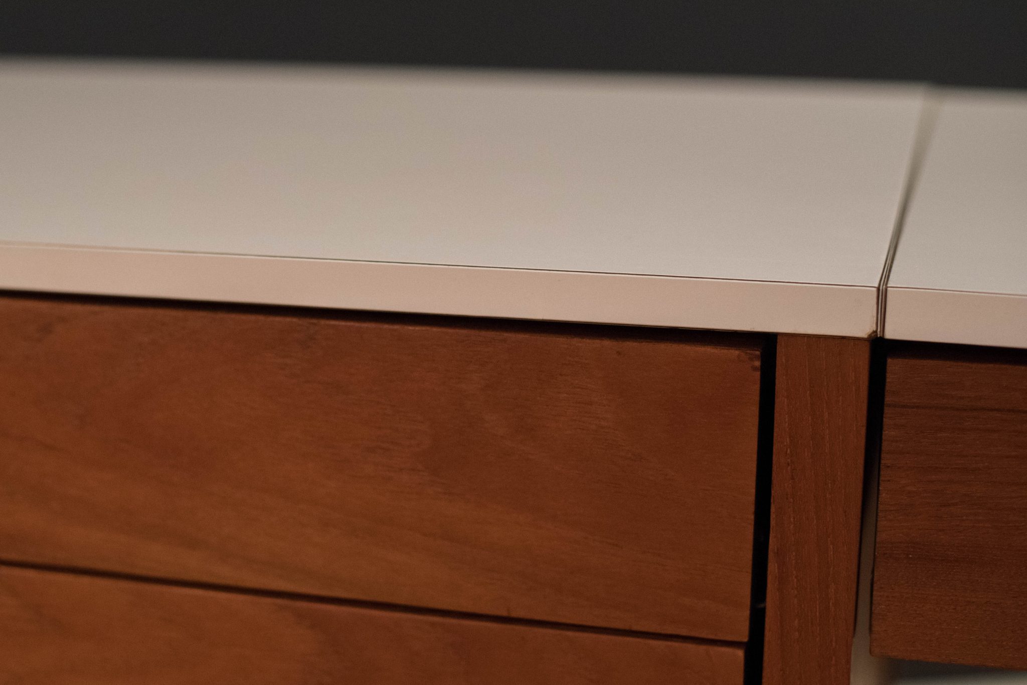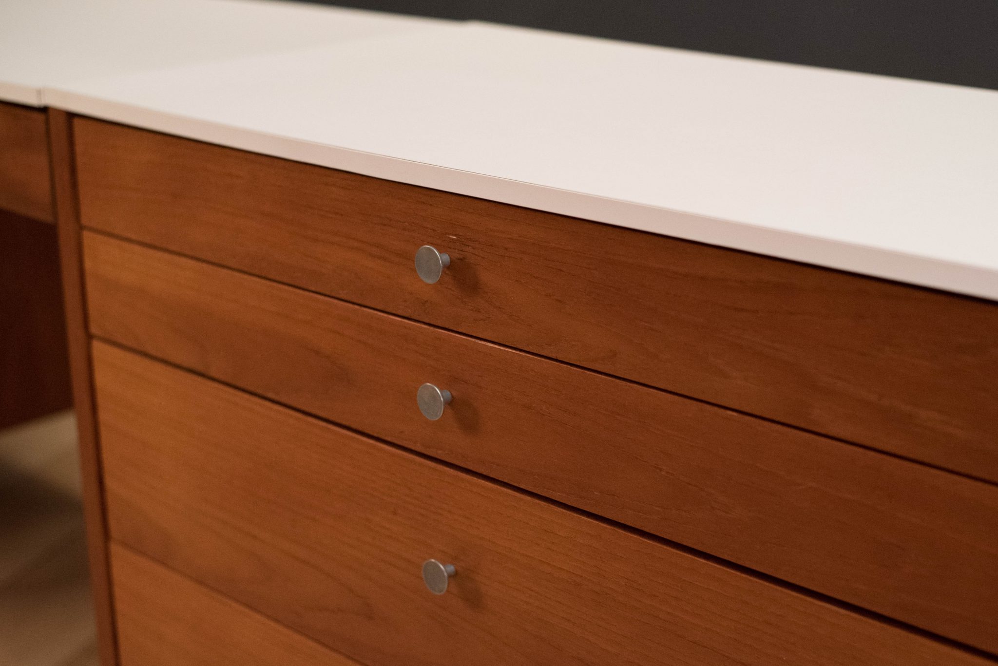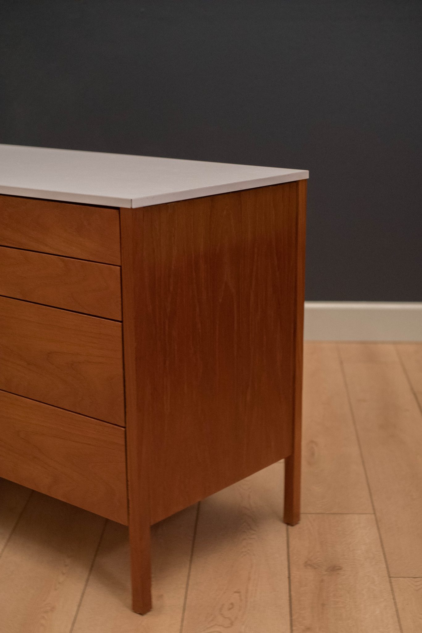 Vintage three piece dresser set in teak designed by Florence Knoll, circa 1950s. This set includes a pair of matching dressers with aluminum pulls and a removable drawer vanity or desk. White laminate tops allow for easy maintenance and are also finished on the back.