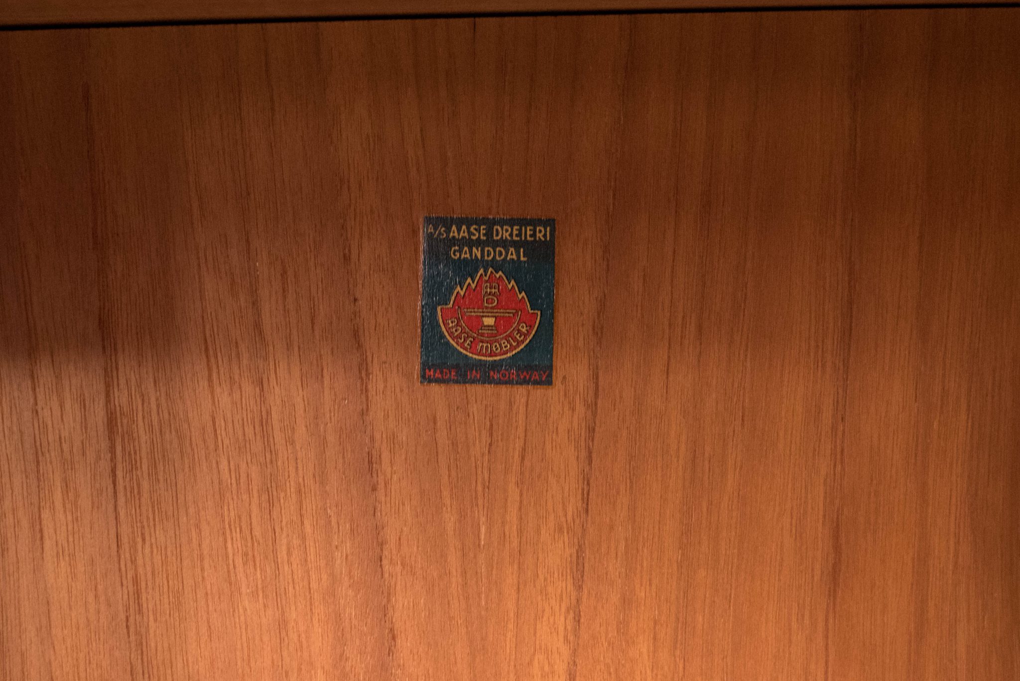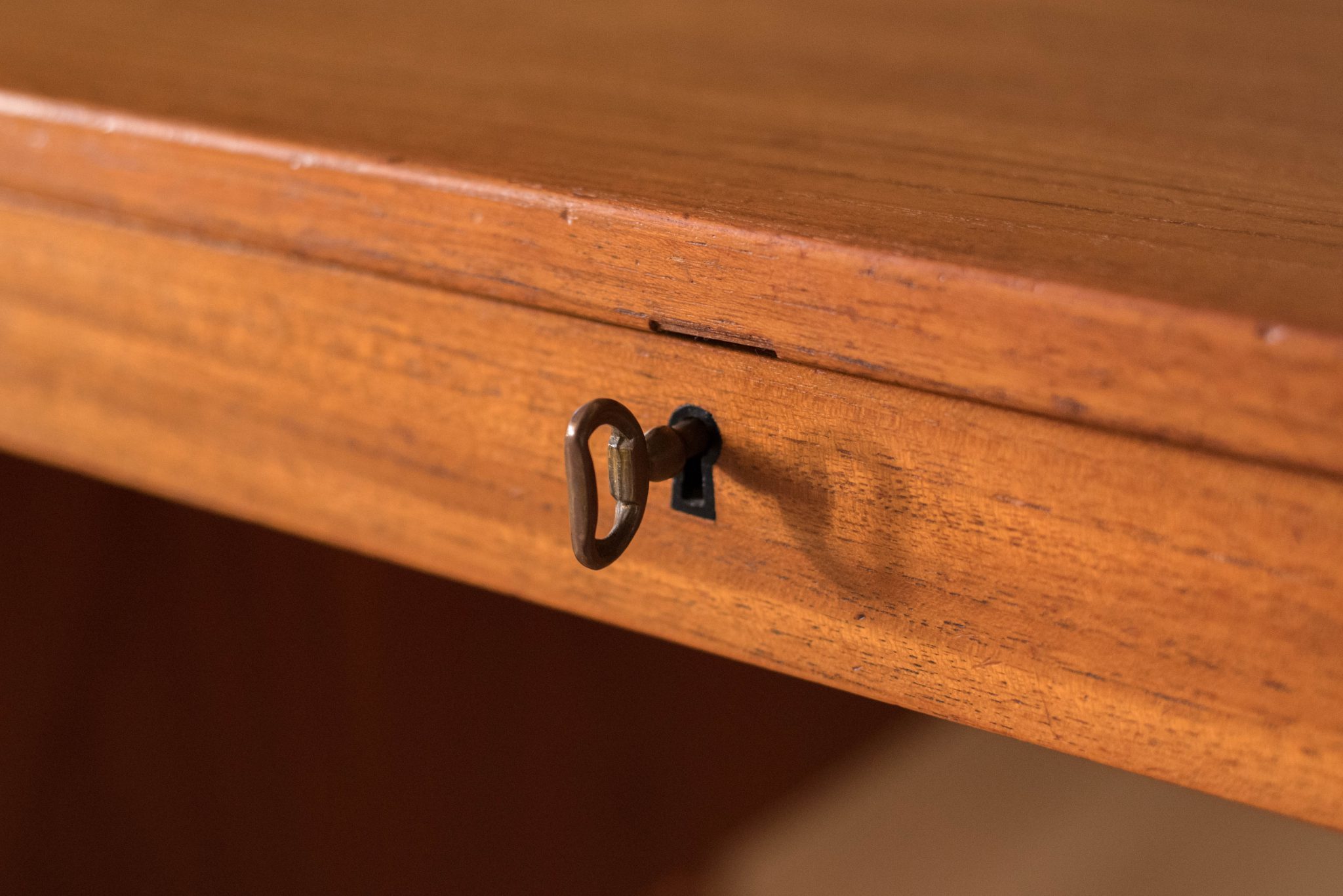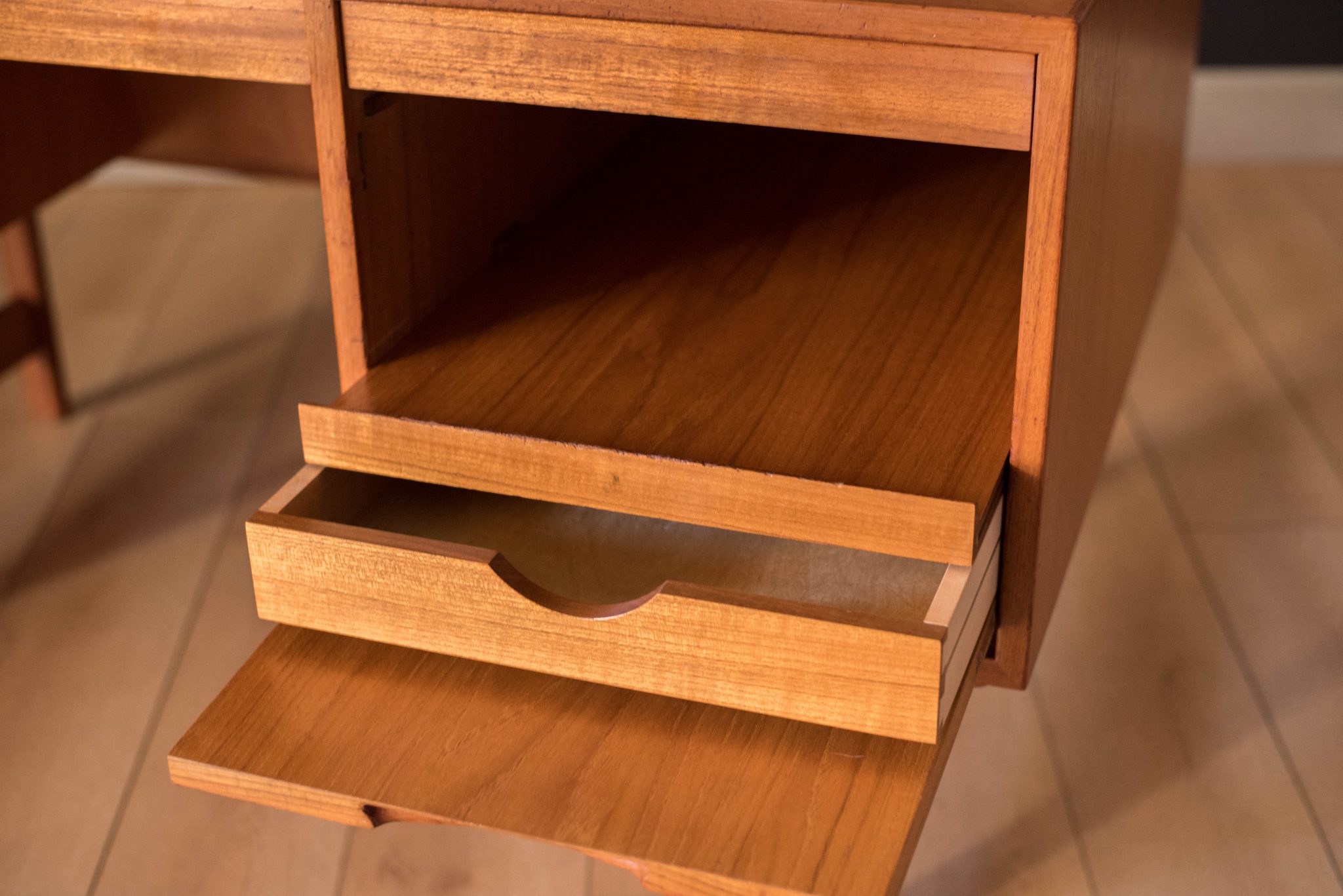 Mid Century teak desk by AASE Dreieri Ganddal for Aase Mobler, Norway. Features a pull-out writing surface and three dovetailed drawers that includes one locking filing cabinet. Also, equipped with an additional open storage space with pull-out tray and small drawer. Finished on the backside which allows the desk to be a focal point in the room. Skeleton key is included.