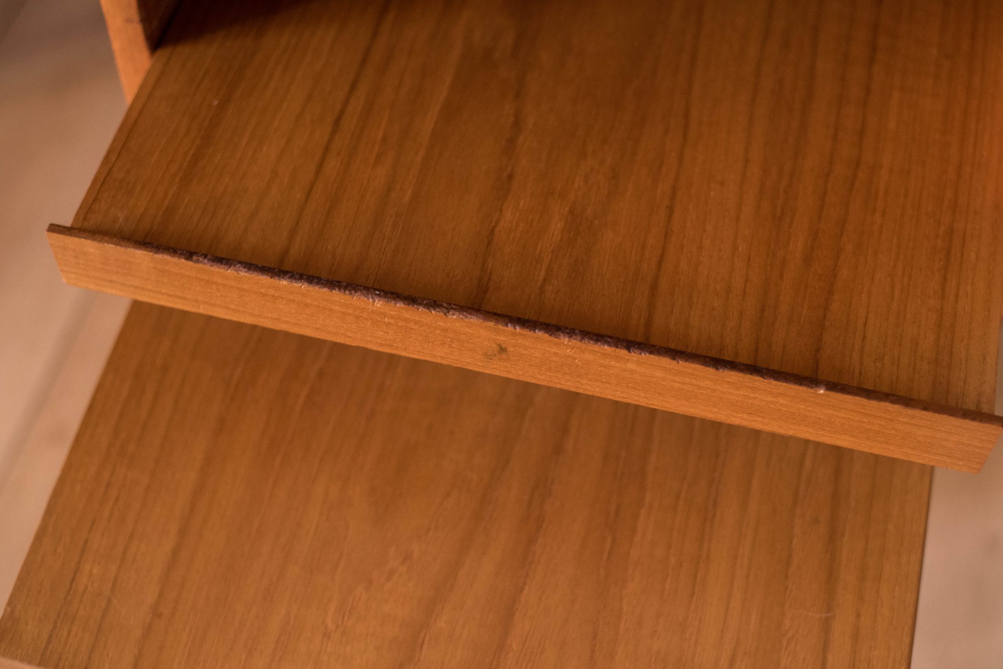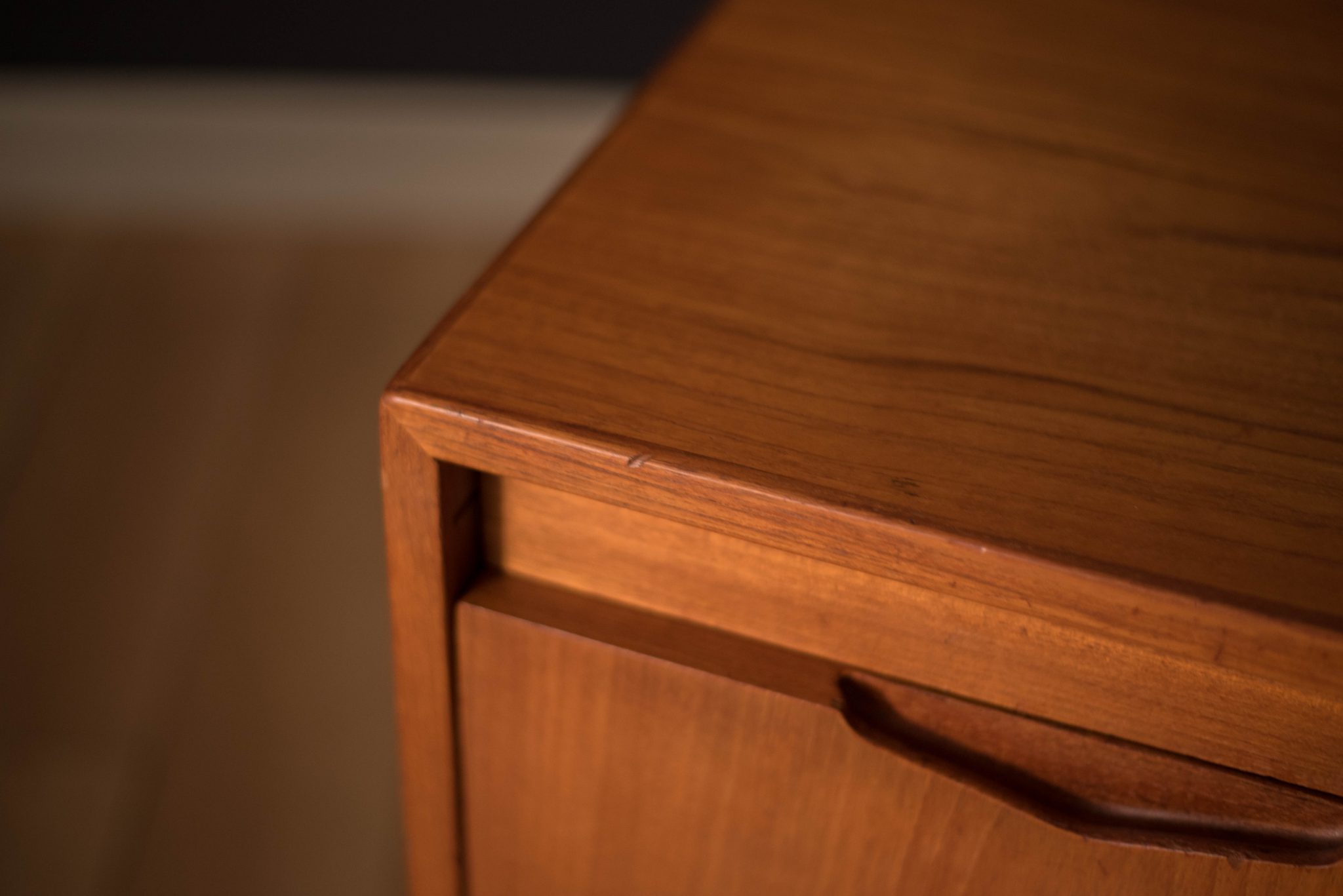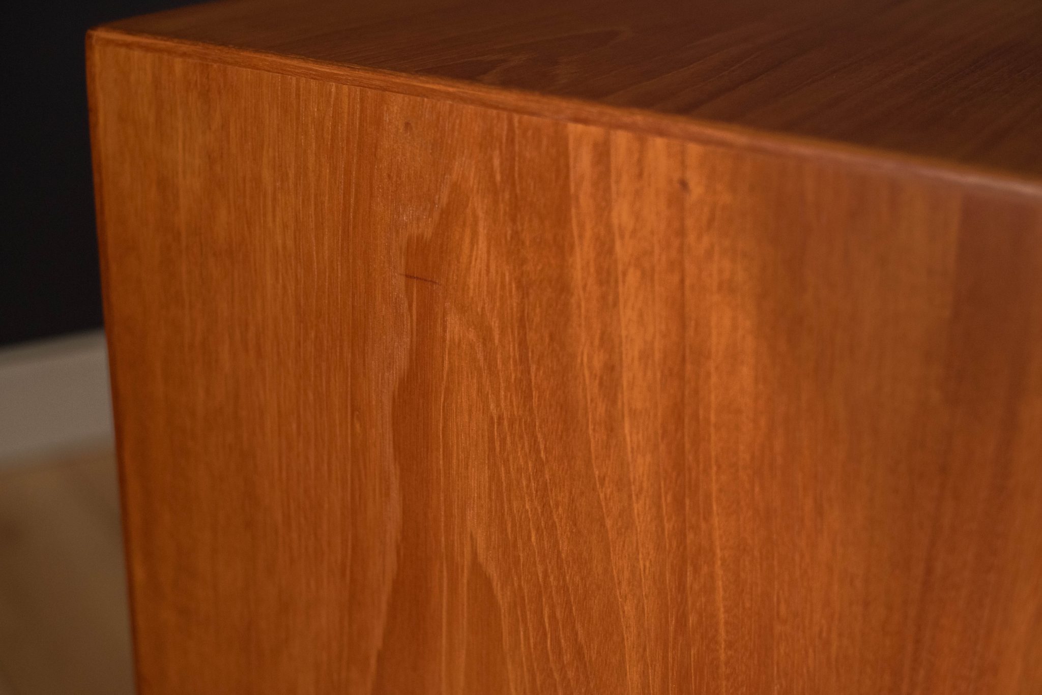 Mid Century teak desk by AASE Dreieri Ganddal for Aase Mobler, Norway. Features a pull-out writing surface and three dovetailed drawers that includes one locking filing cabinet. Also, equipped with an additional open storage space with pull-out tray and small drawer. Finished on the backside which allows the desk to be a focal point in the room. Skeleton key is included.