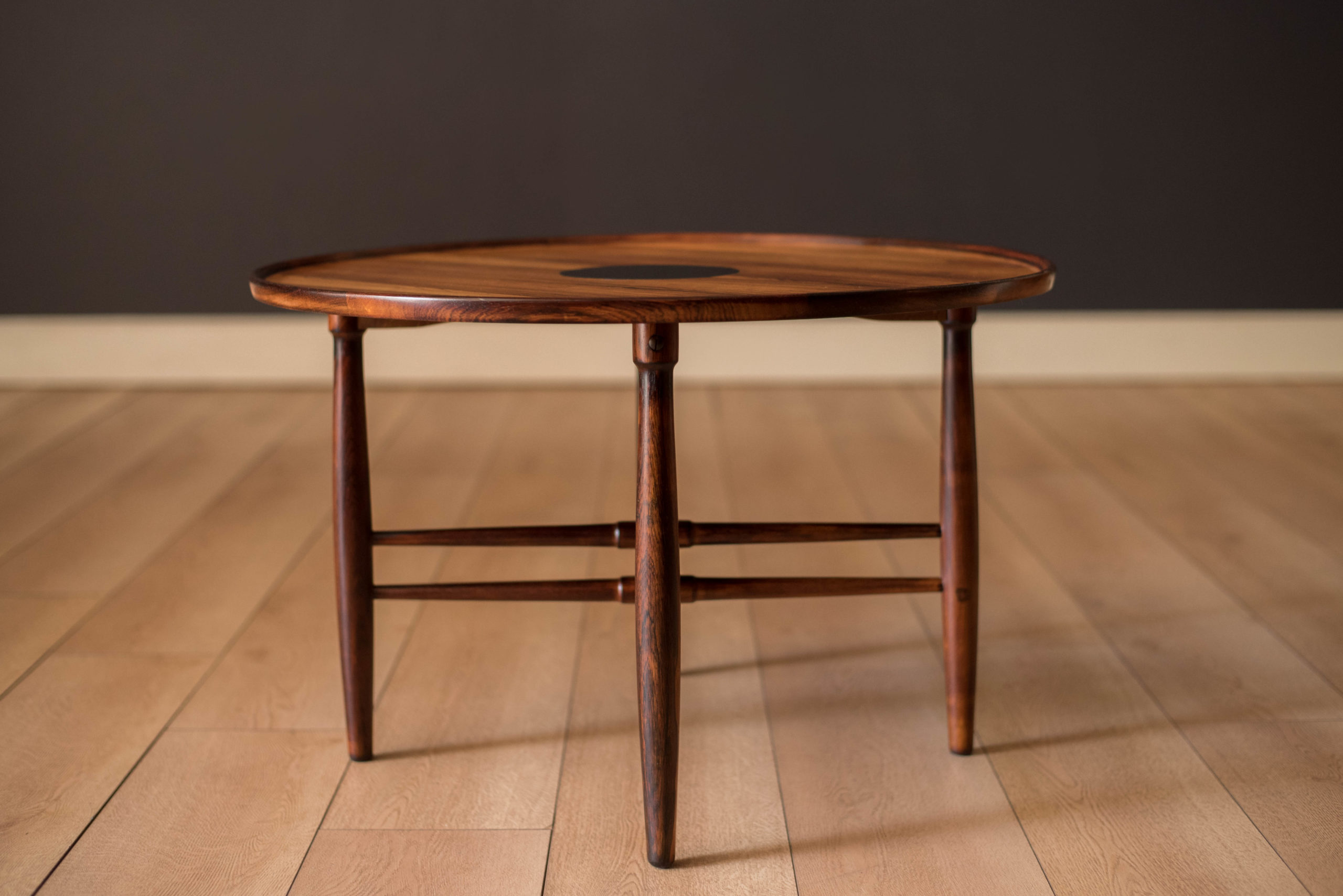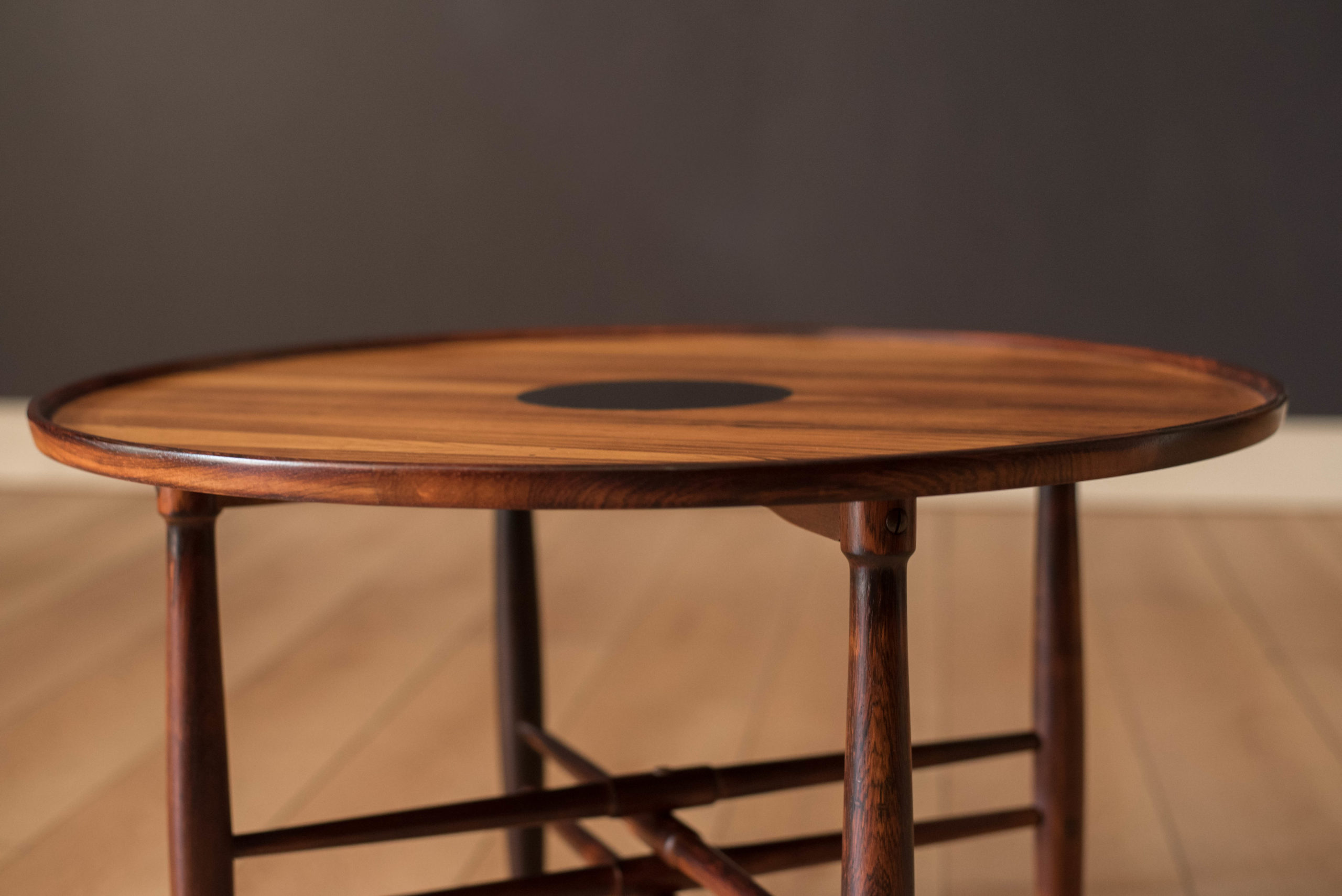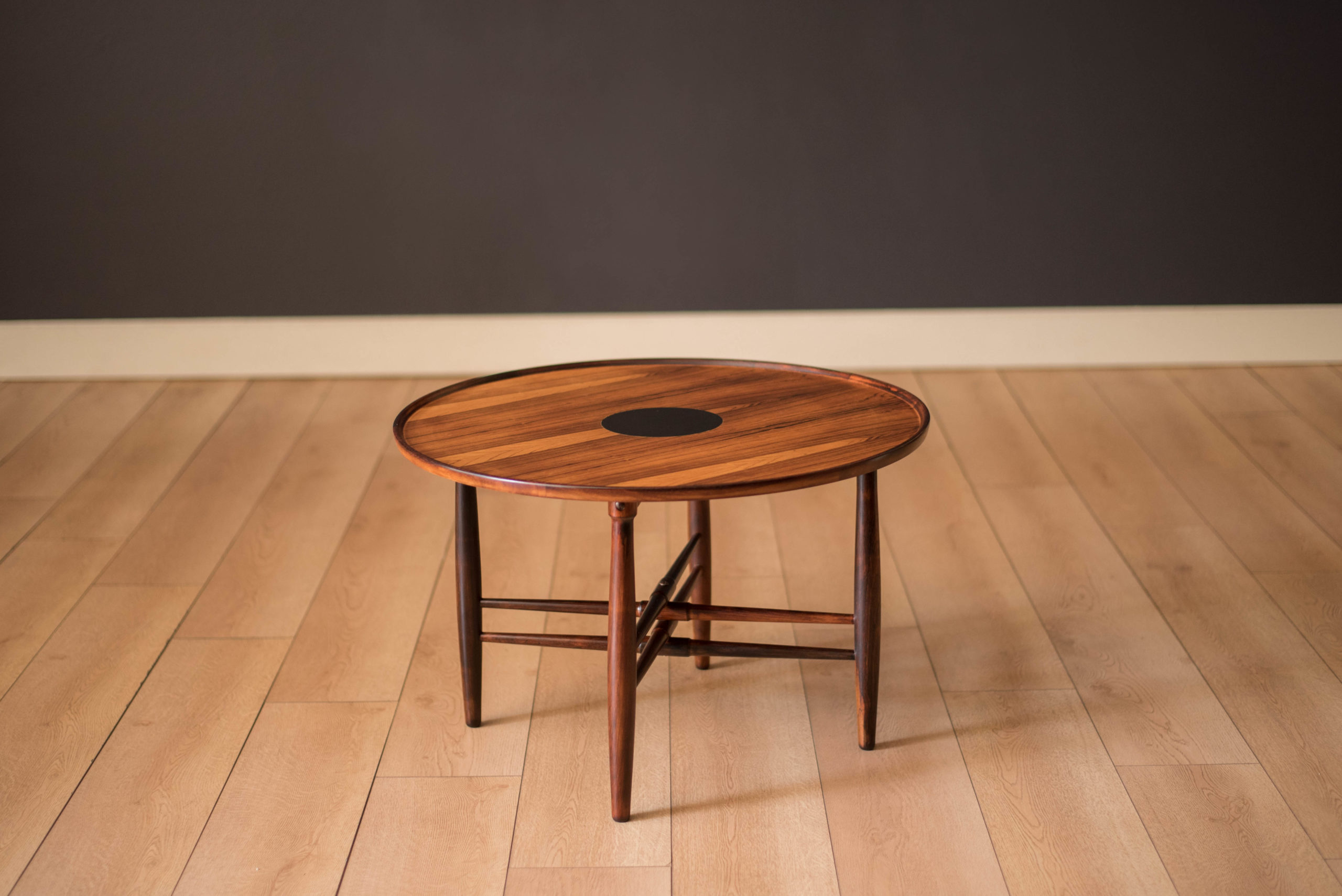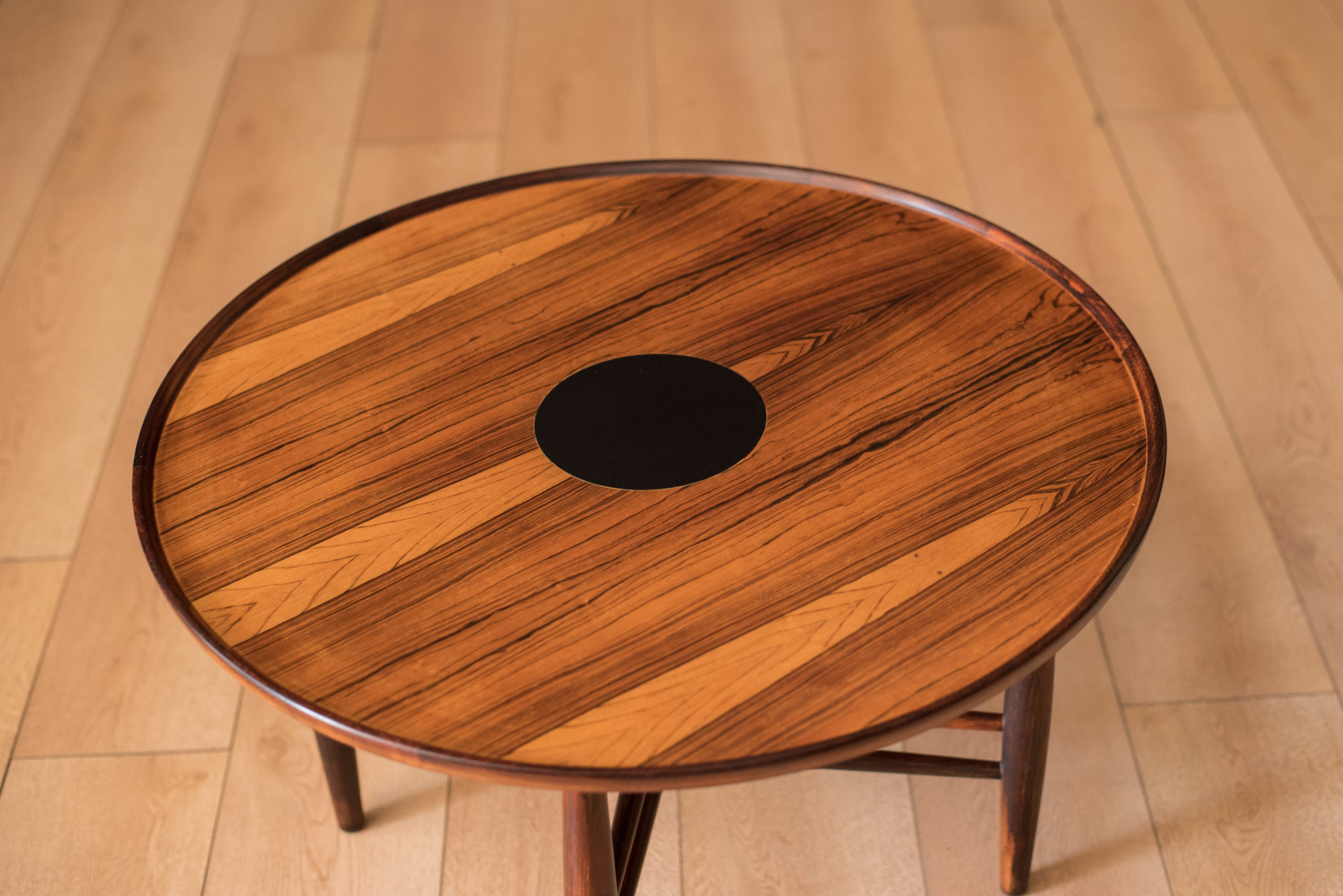 Mid century Modern round end table in rosewood designed by Poul Hundevad for Vamdrup Stolefabrik, Denmark. This occasional table features stunning rosewood grains and a unique black laminate insert convenient for resting drinks on. Supported by tapered legs with an X-base accented in brass hardware. Additionally, can be used as a coffee table.