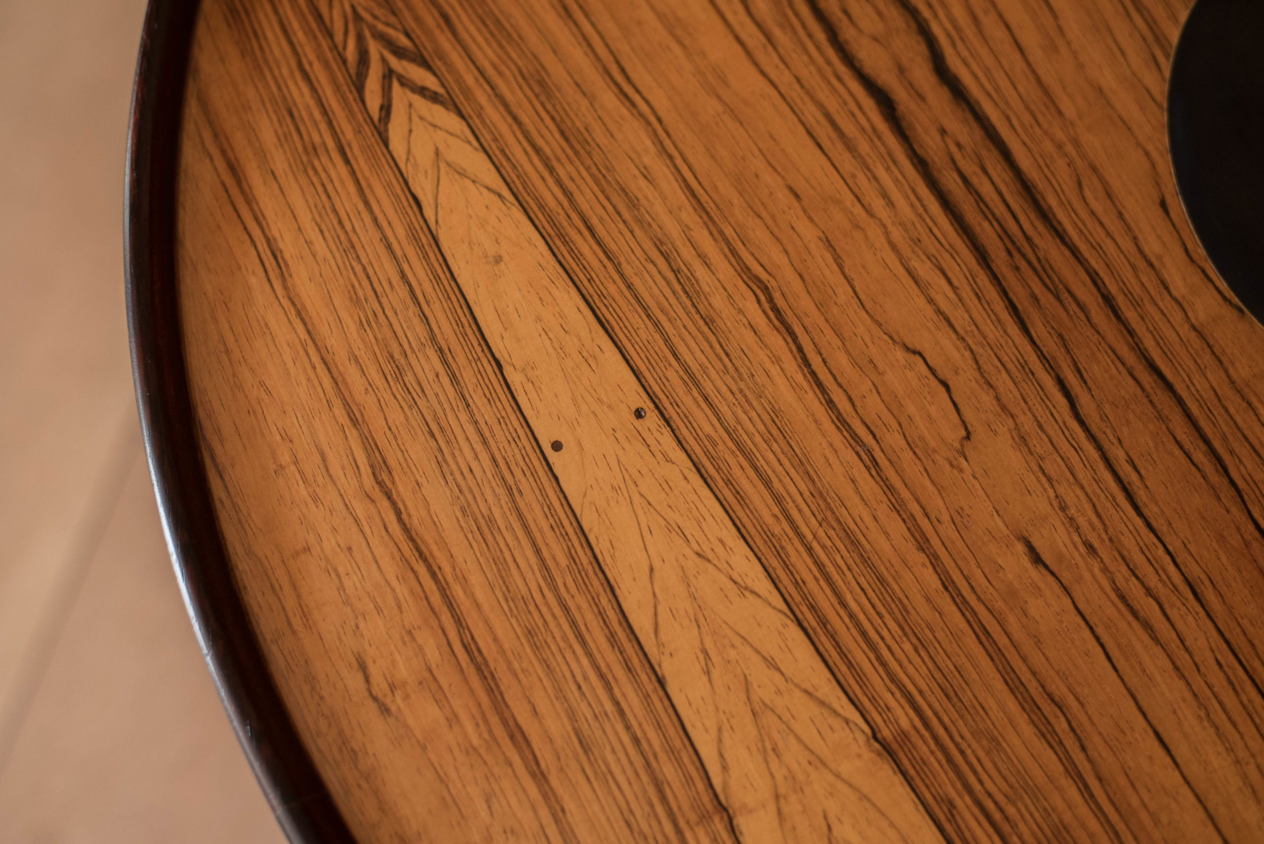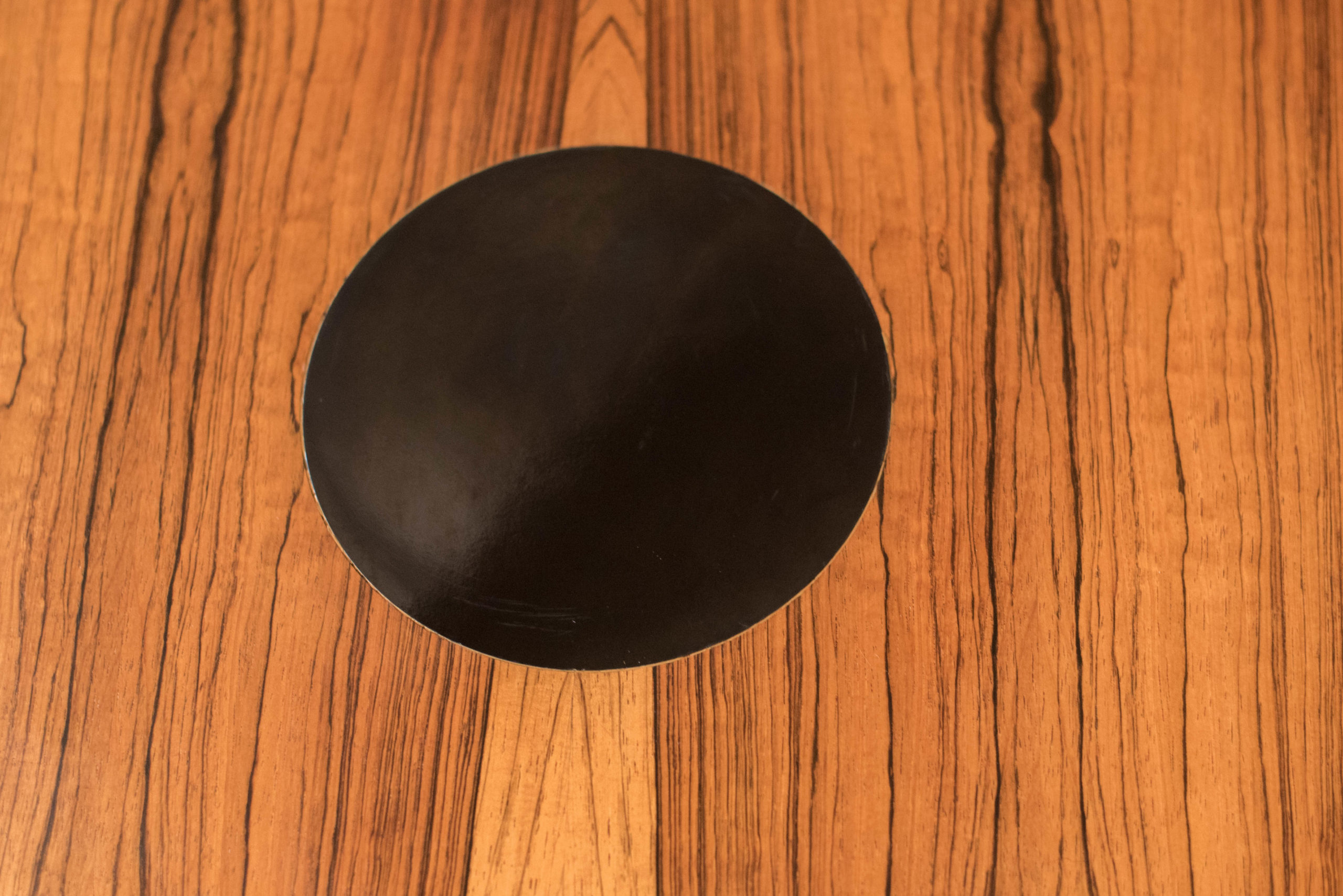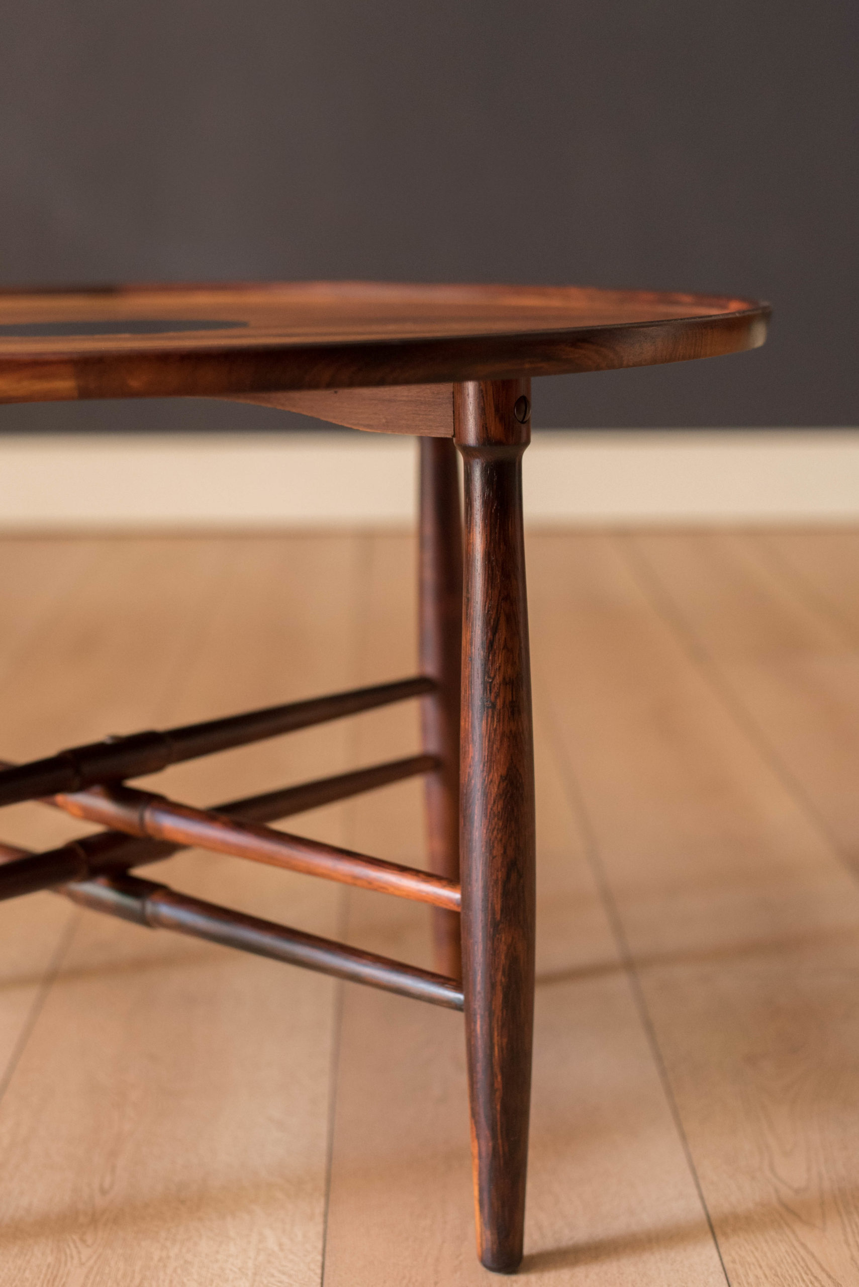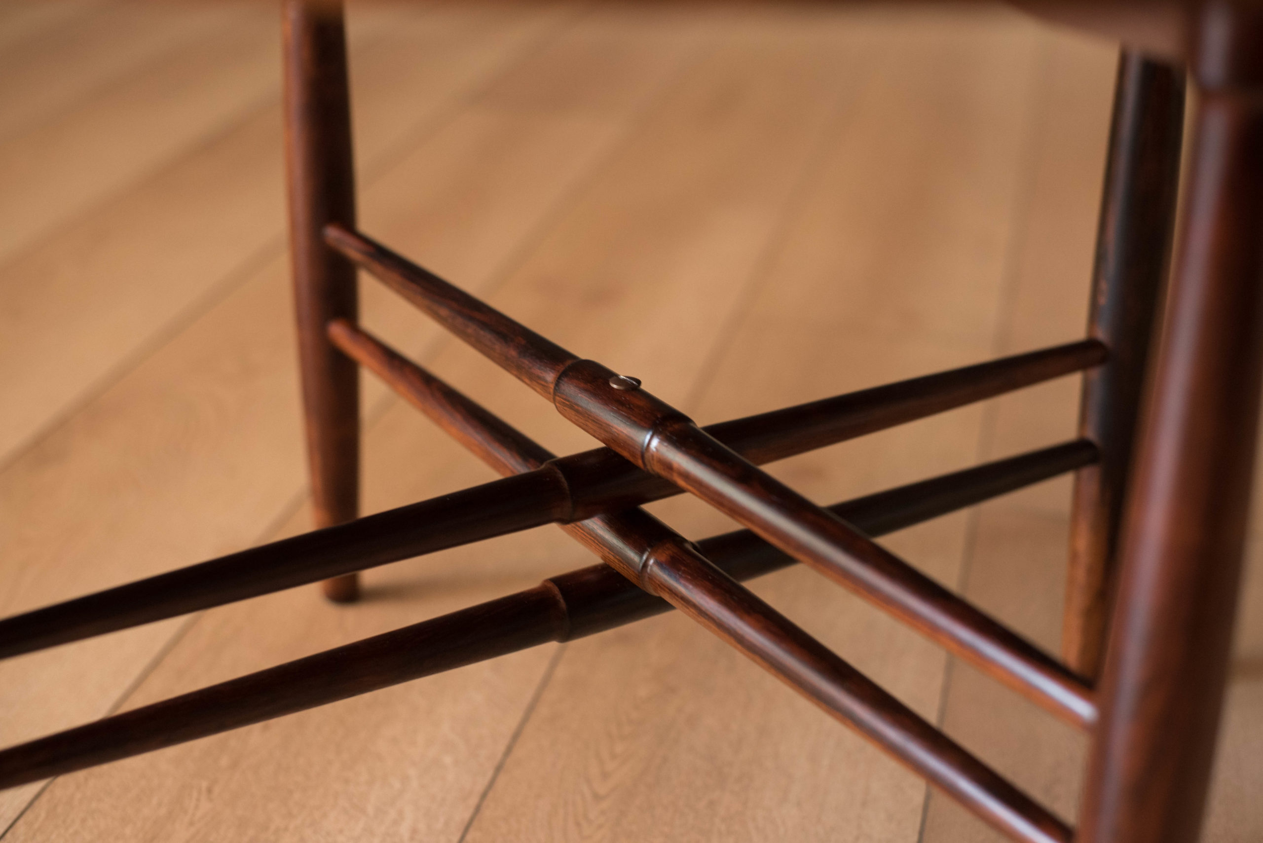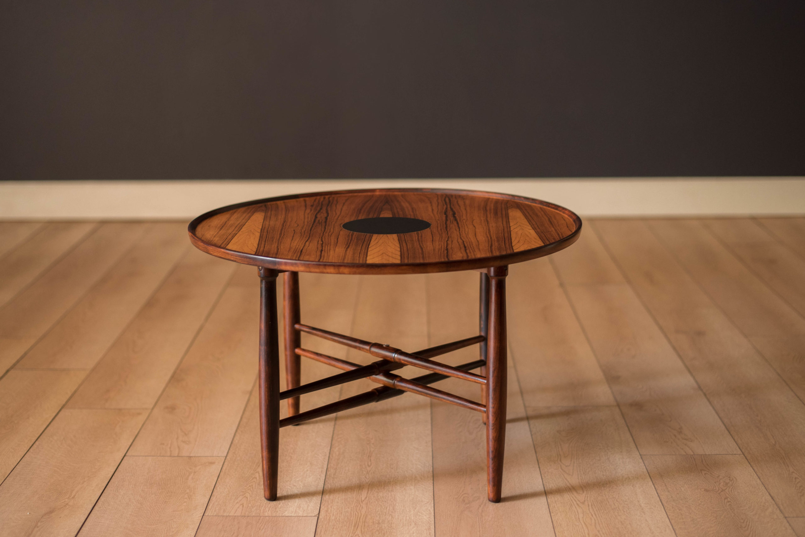 Mid century Modern round end table in rosewood designed by Poul Hundevad for Vamdrup Stolefabrik, Denmark. This occasional table features stunning rosewood grains and a unique black laminate insert convenient for resting drinks on. Supported by tapered legs with an X-base accented in brass hardware. Additionally, can be used as a coffee table.