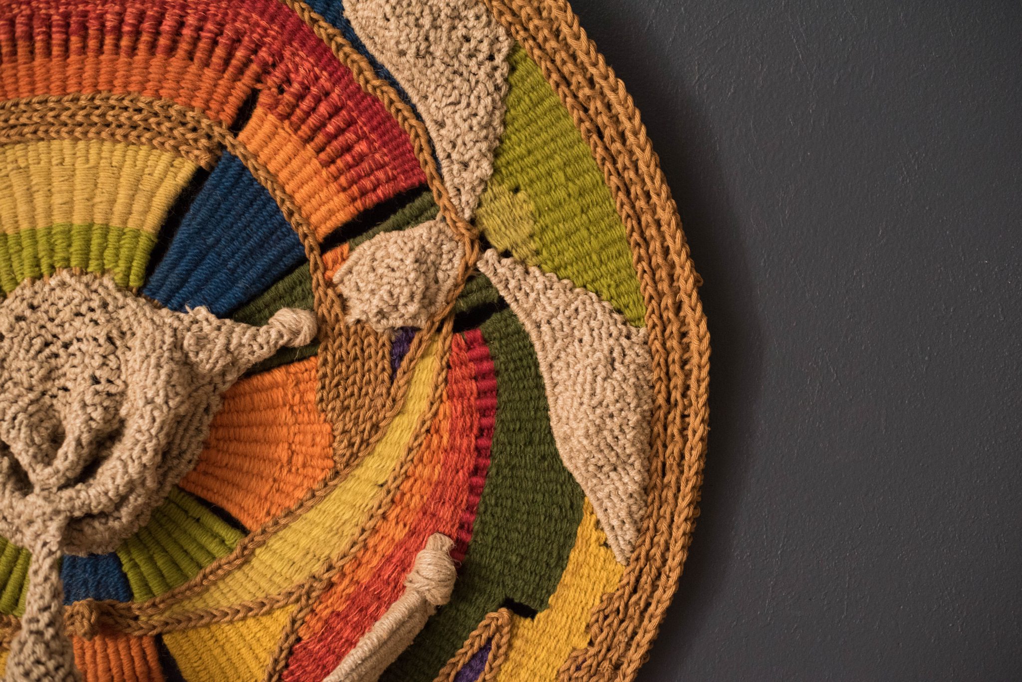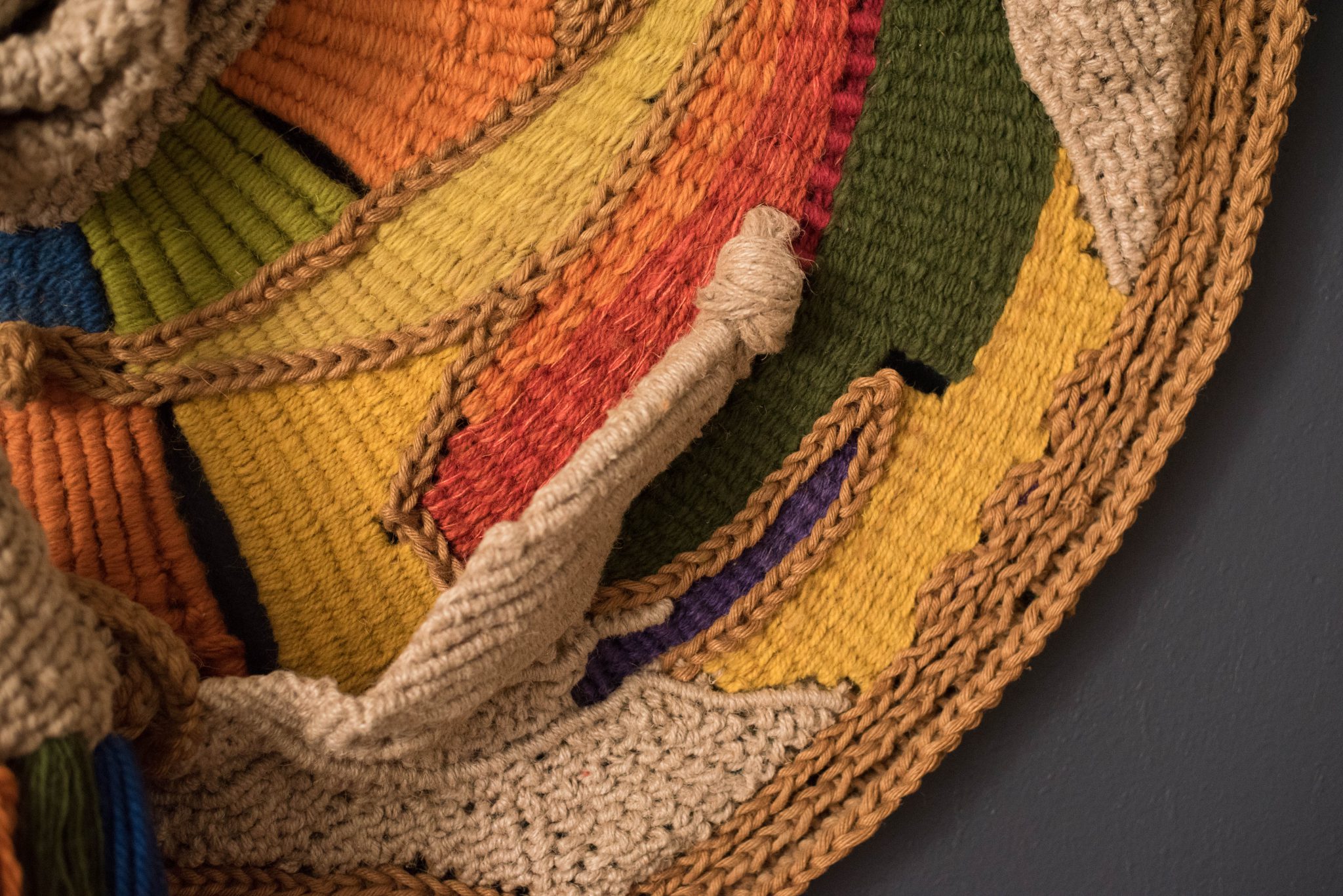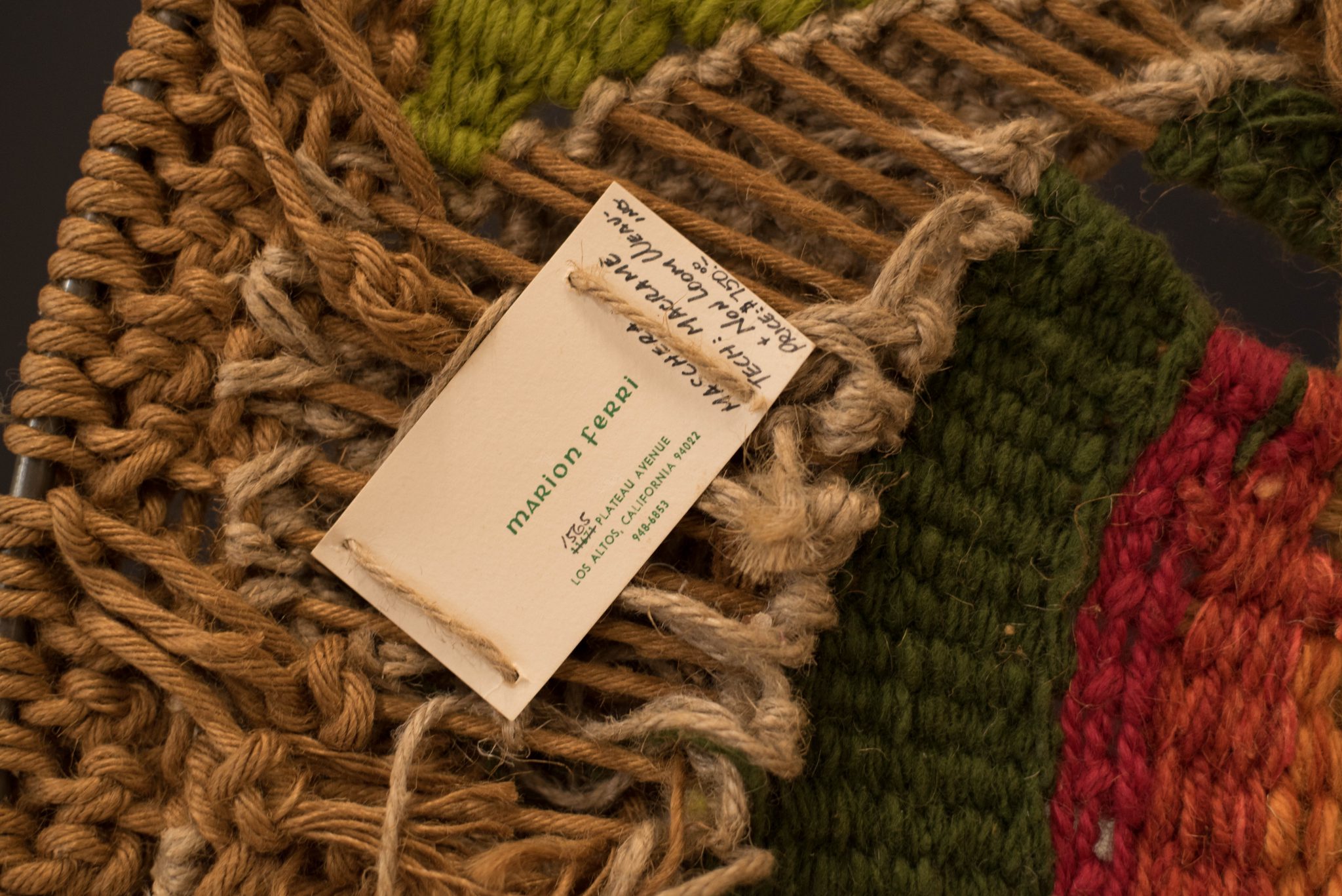 Vibrant colorful wall hanging fiber art tapestry made by California artist Marion Ferri, circa 1970s. This oversized piece features intricate hand woven natural and dyed fibers. Adds a soft texture and a pop of lively colors to any space.