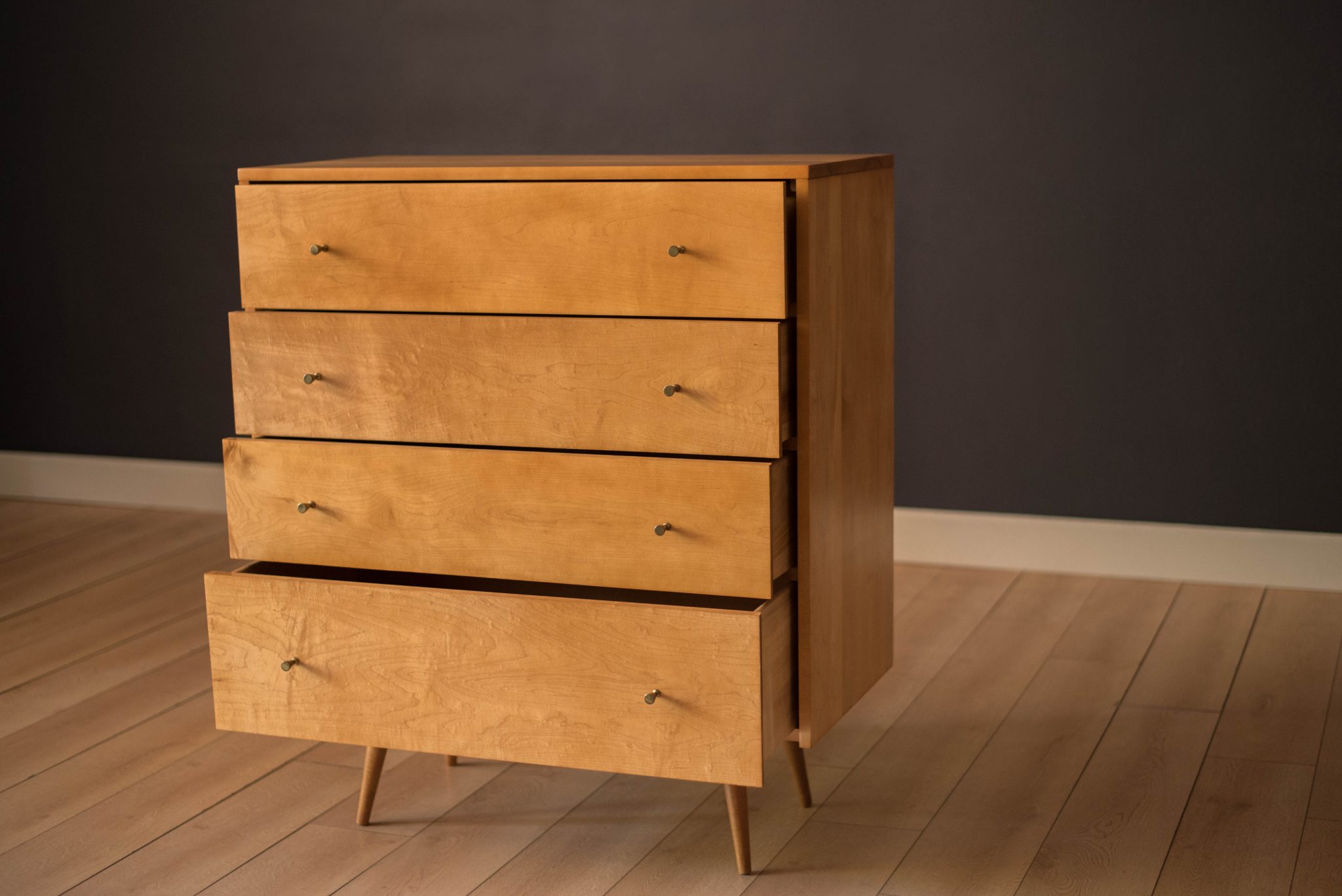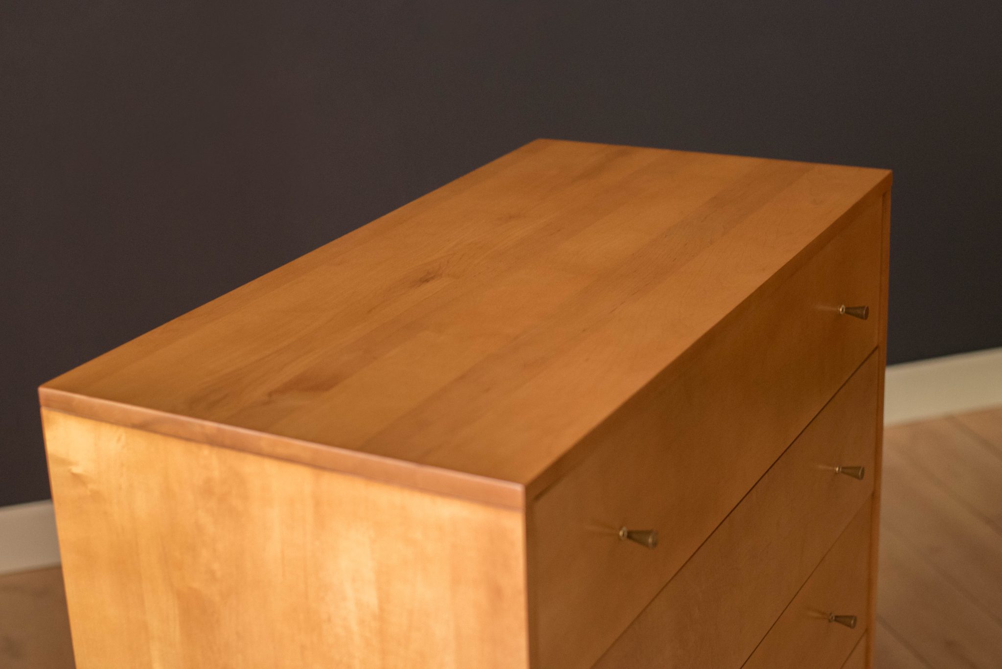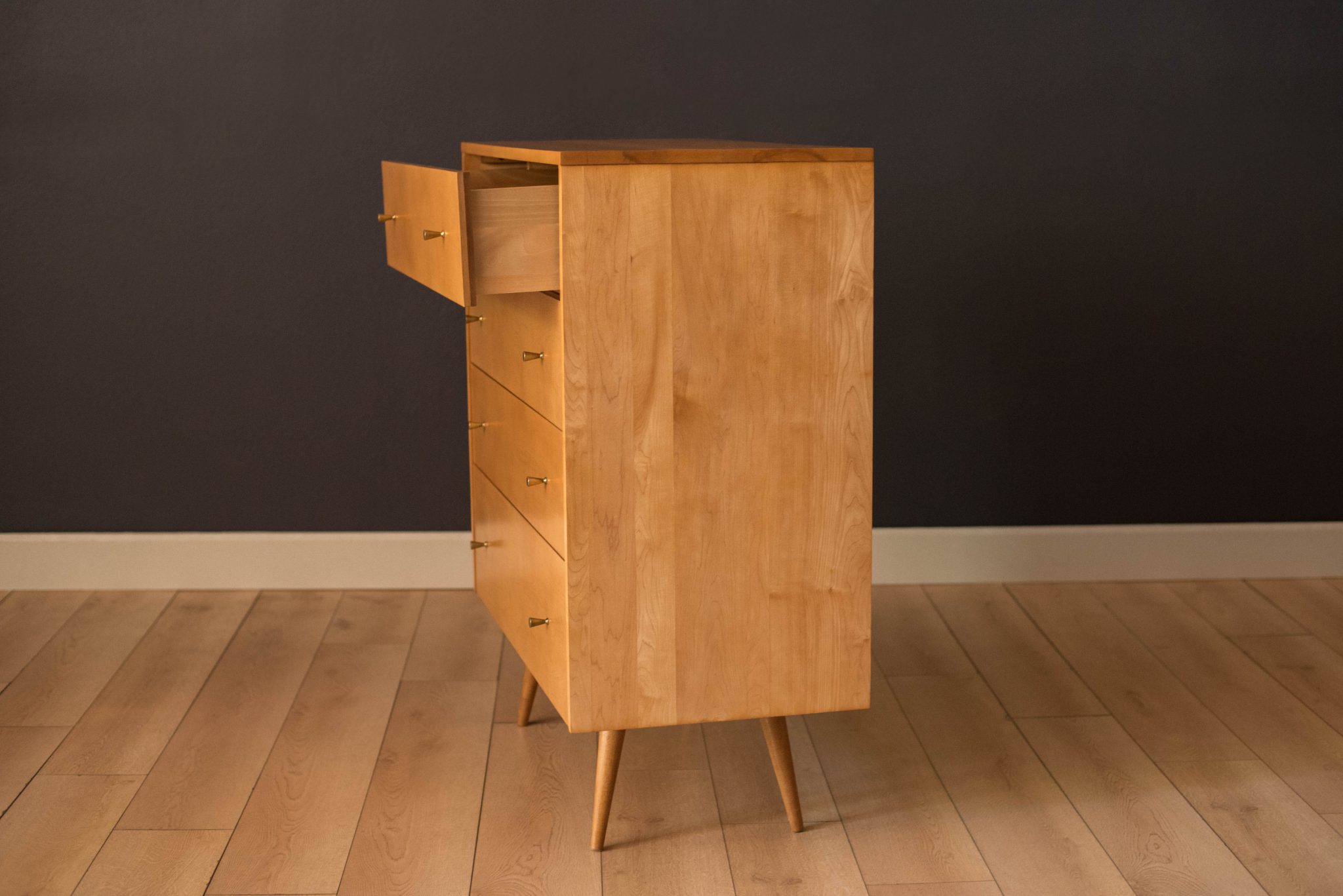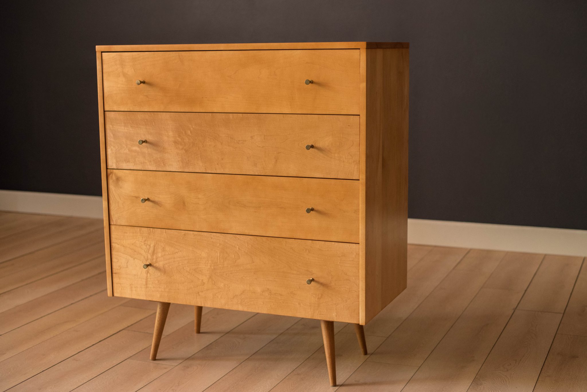 Vintage tall dresser chest in solid planked maple designed by Paul McCobb for Winchendon Furniture Co. circa 1950’s. This piece offers plenty of storage including four deep drawers with the original signature brass hardware and splayed legs.