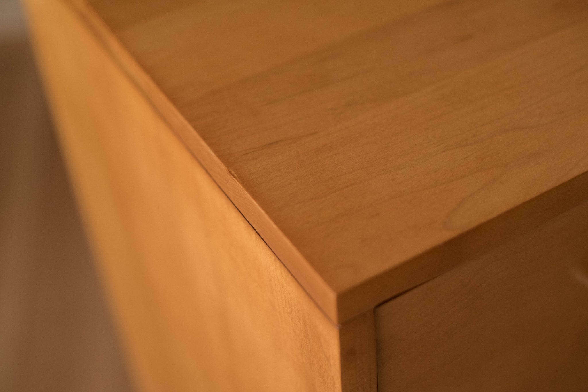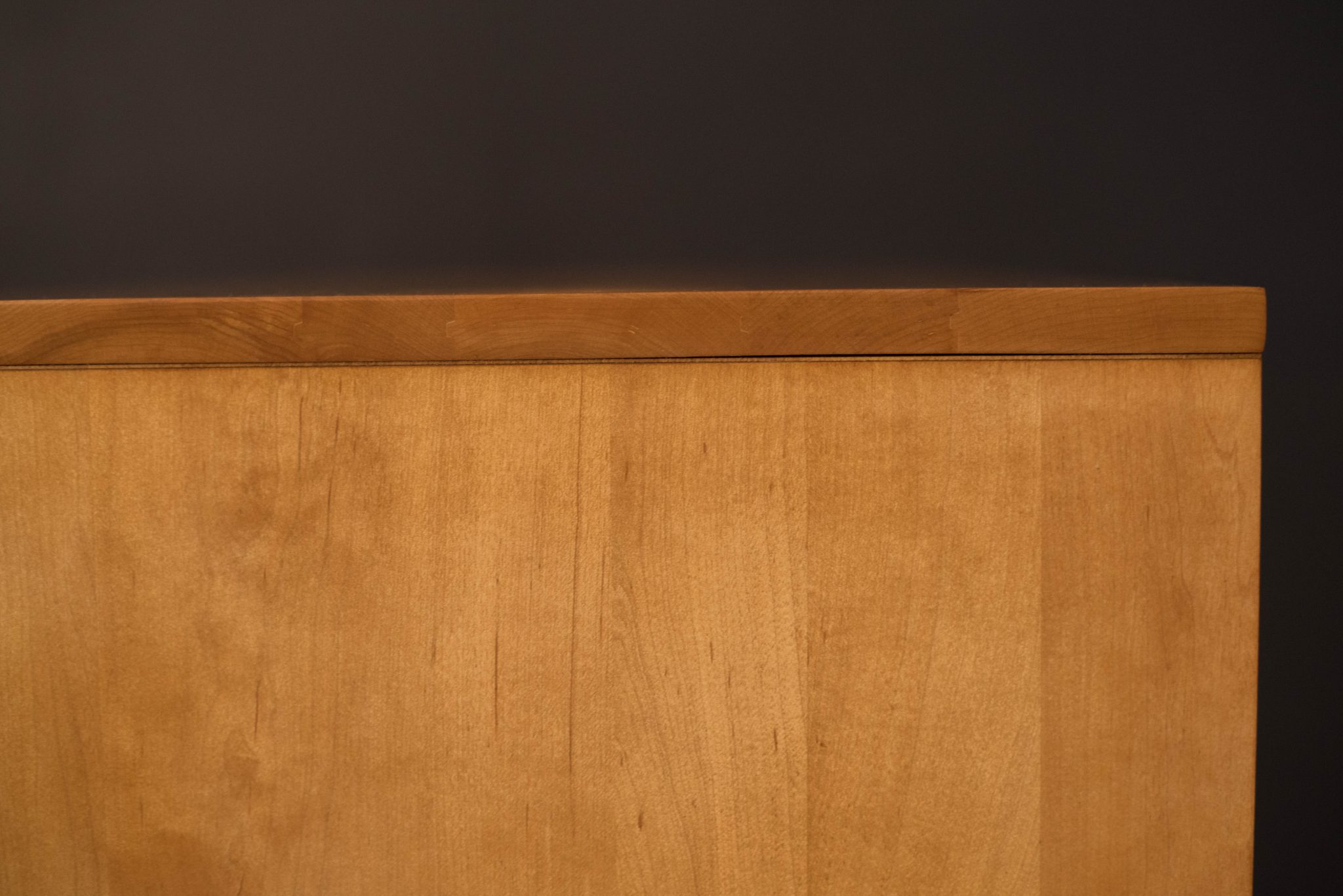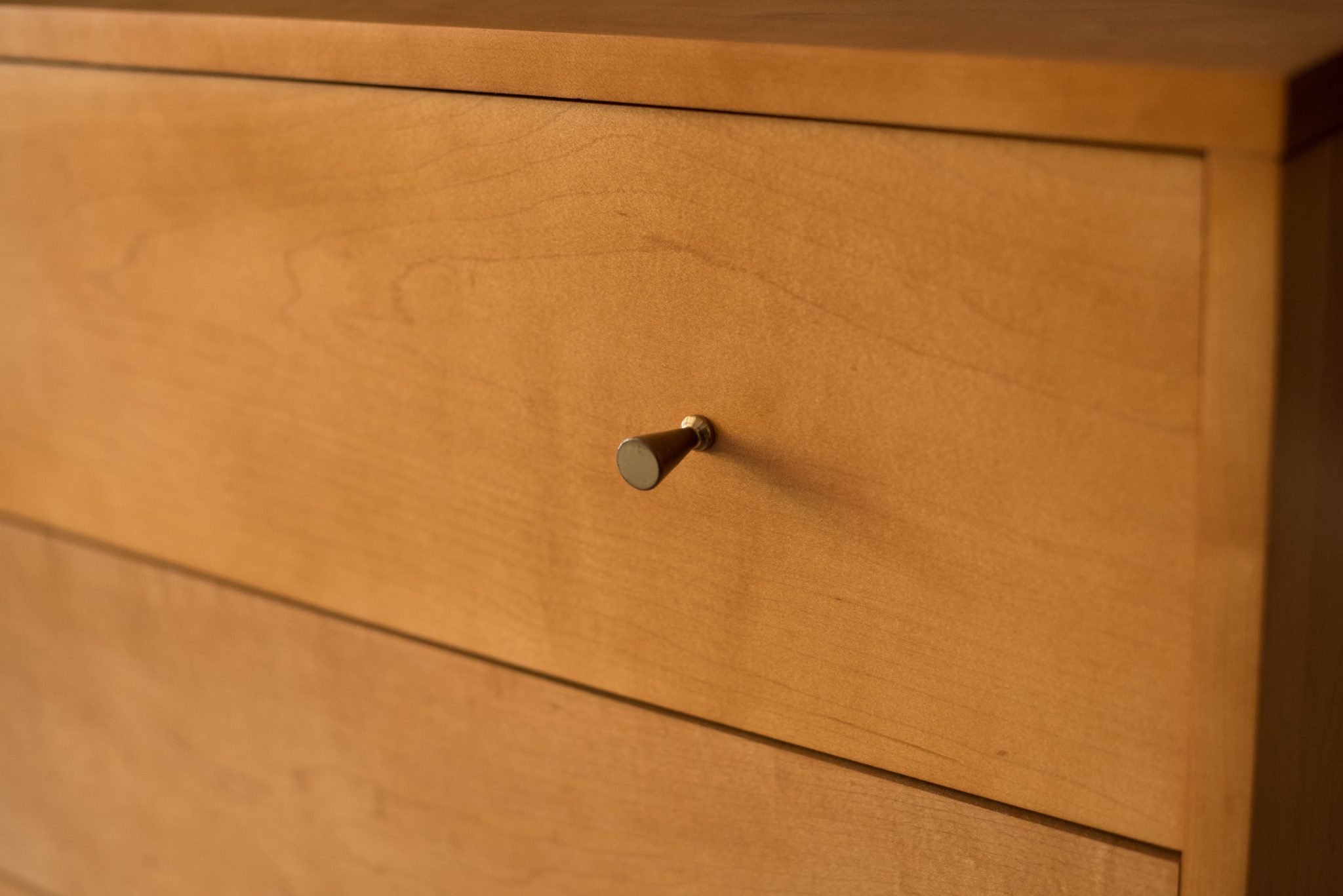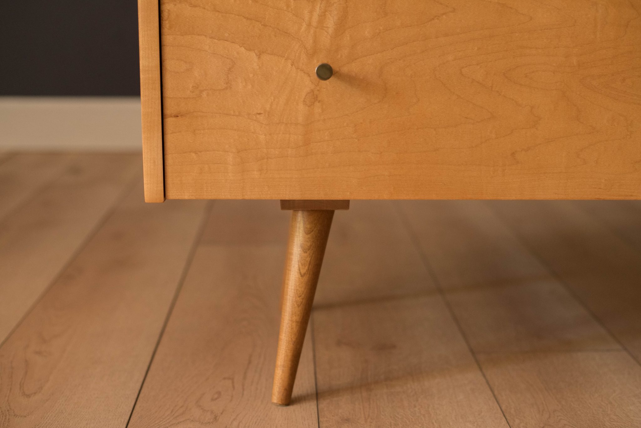Vintage tall dresser chest in solid planked maple designed by Paul McCobb for Winchendon Furniture Co. circa 1950’s. This piece offers plenty of storage including four deep drawers with the original signature brass hardware and splayed legs.