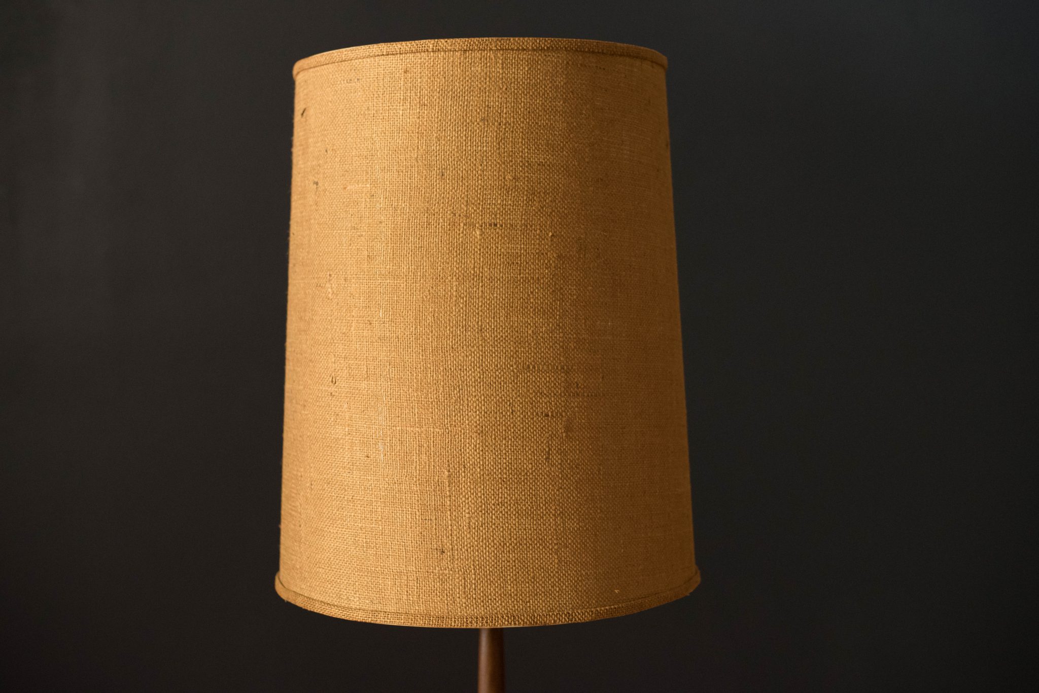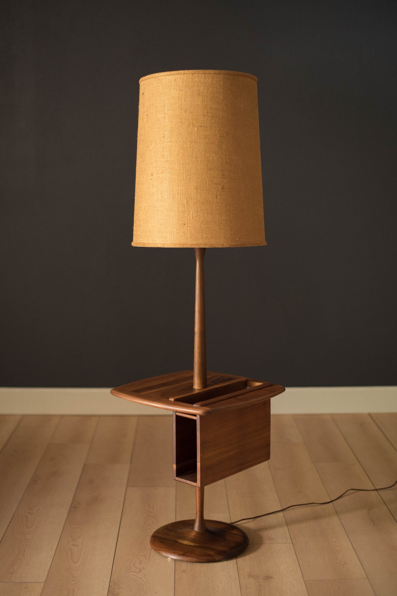 Vintage floor lamp with attached side table in walnut by Laurel Lamp Co. This versatile piece includes a magazine or book holder and burlap drum shade.