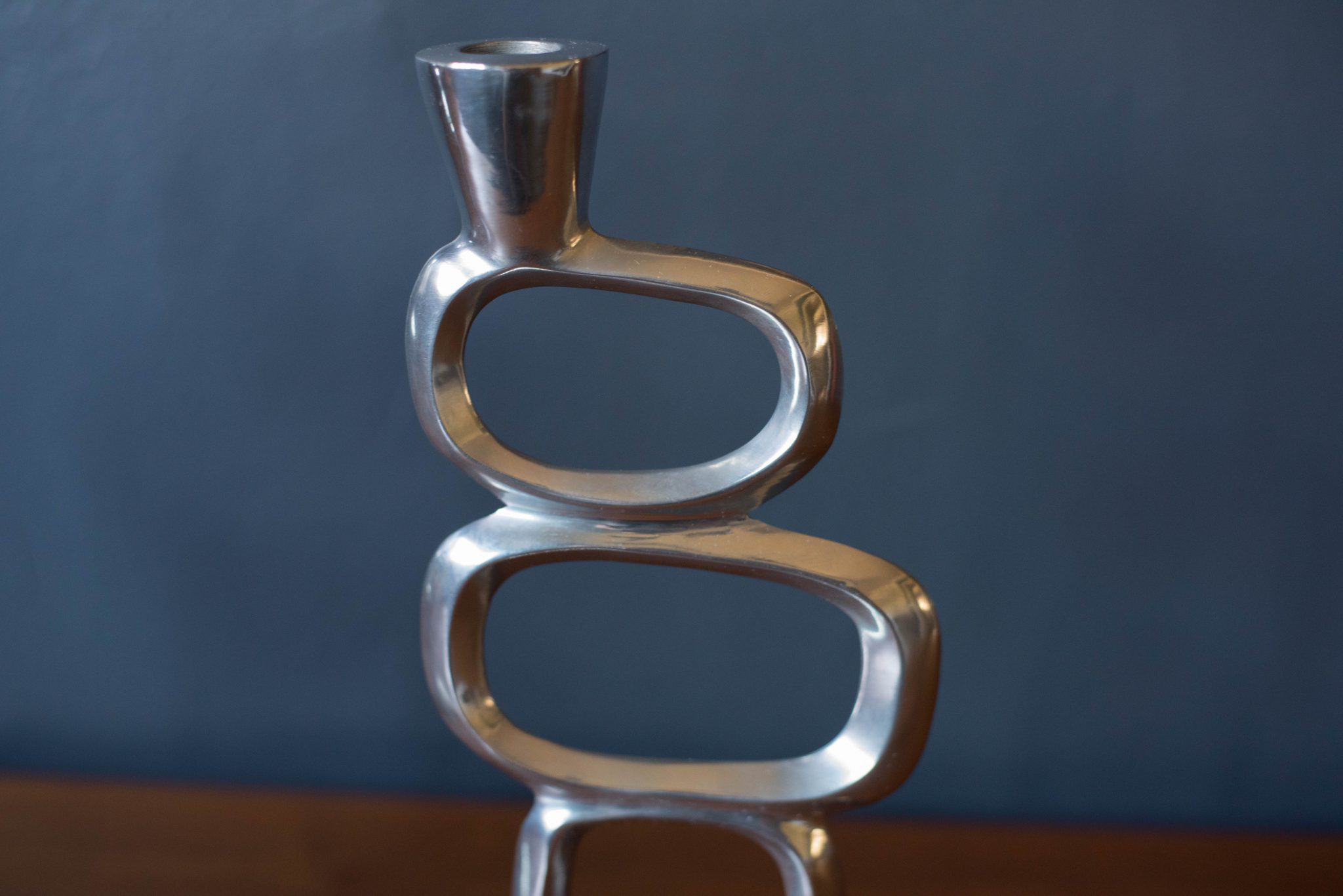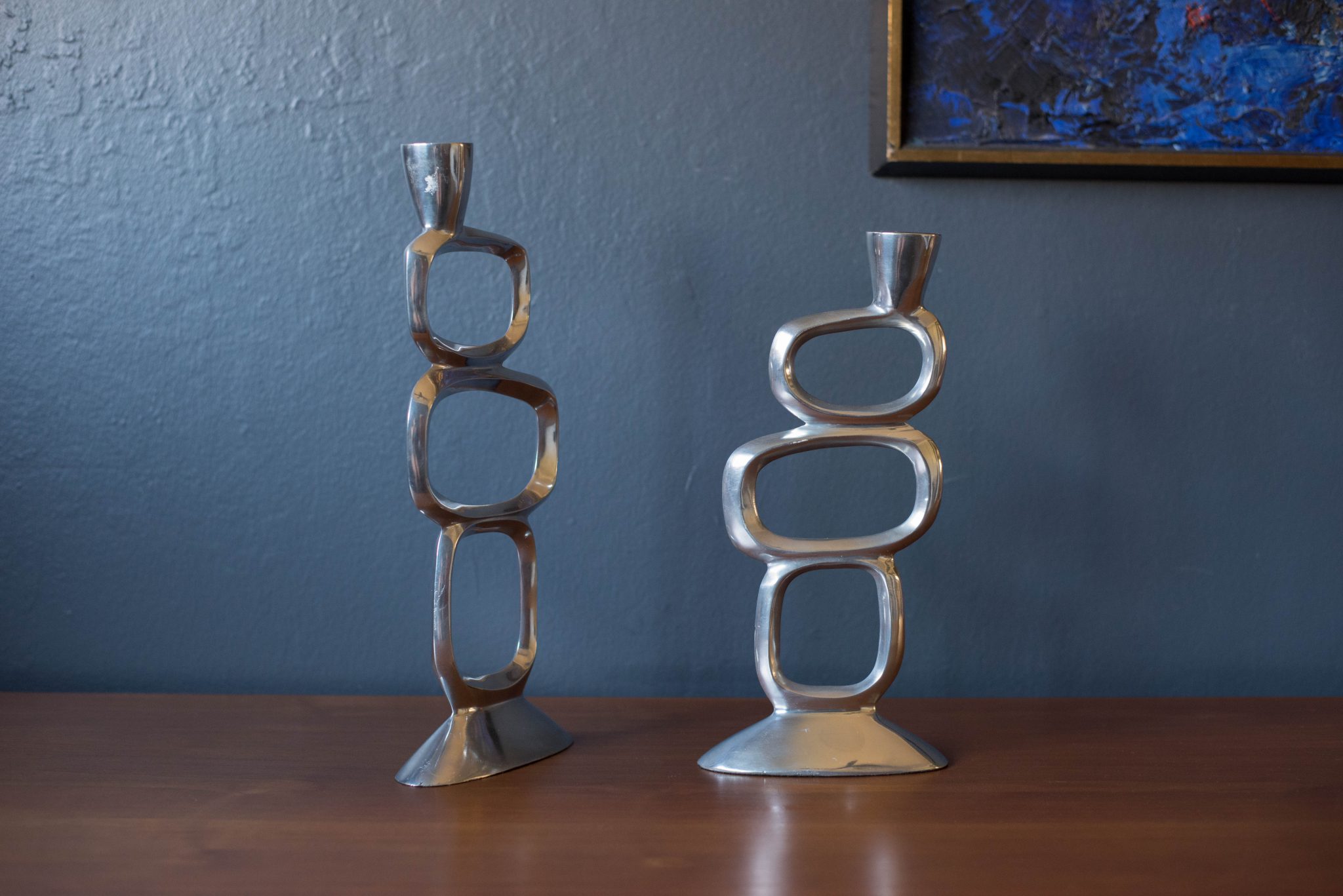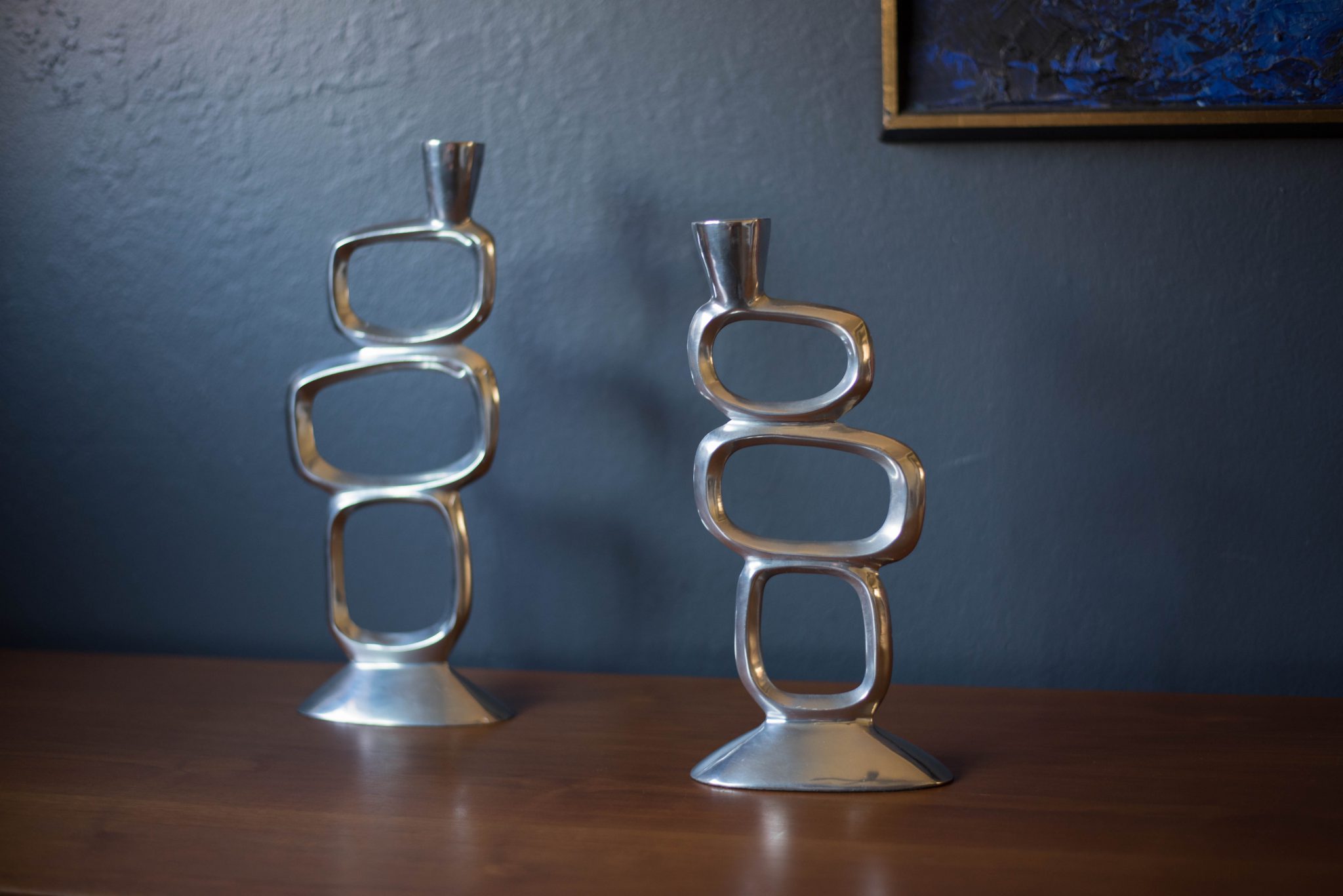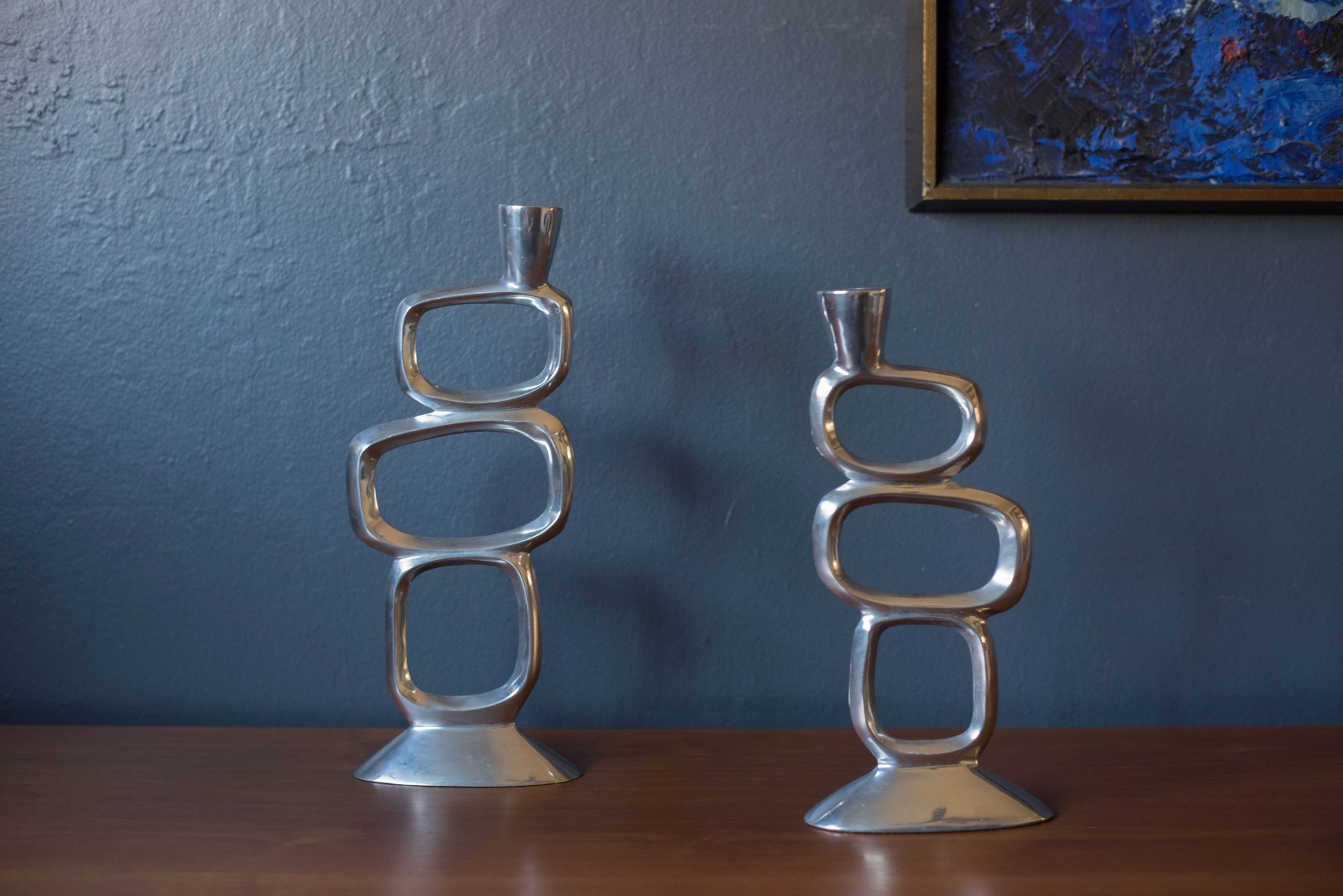 Vintage set of abstract taper candle holders designed with a sculptural modernist form circa 1970s. This set is made of aluminum and includes two different sizes. Price is for the pair. Fits .75″ diameter taper candles.