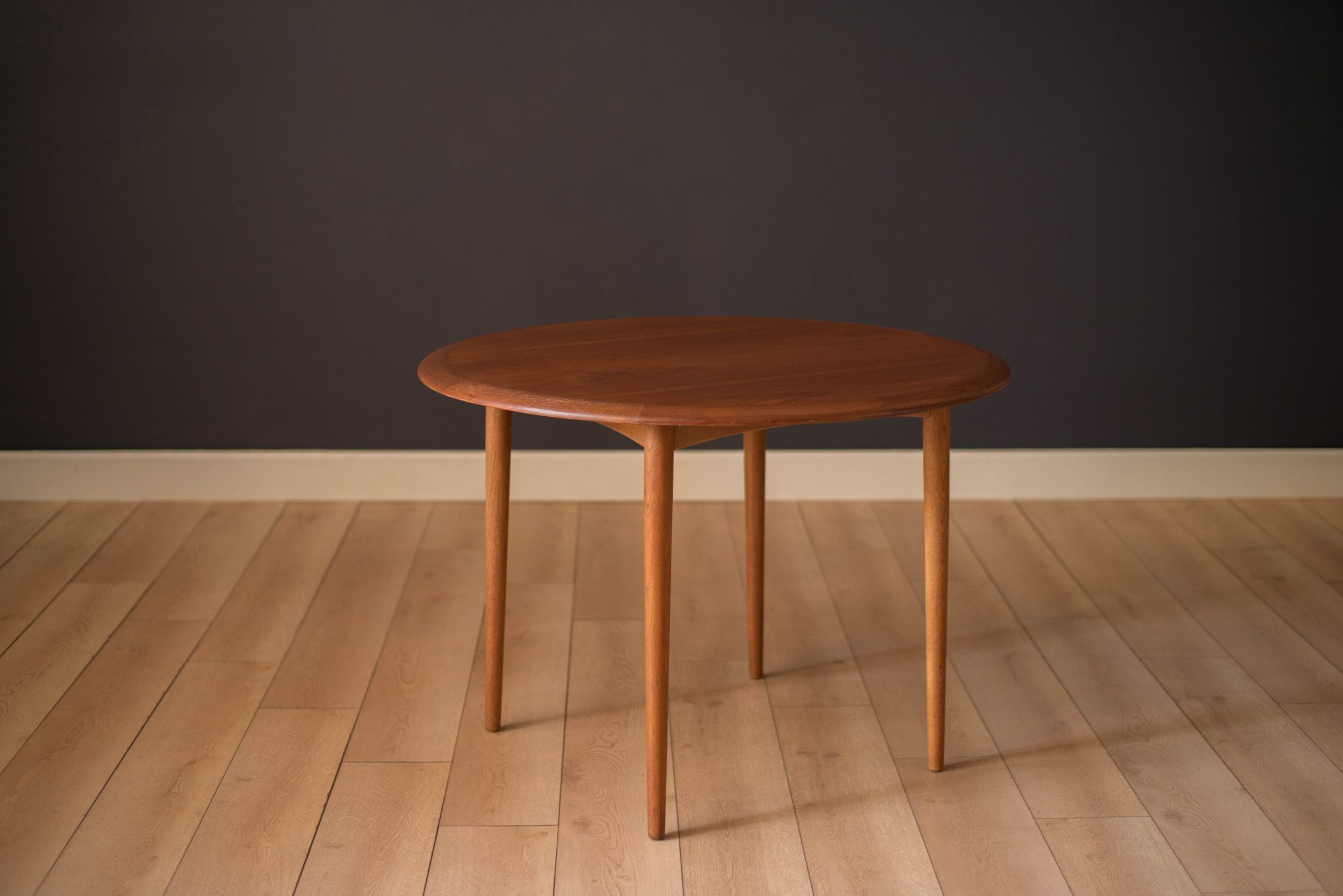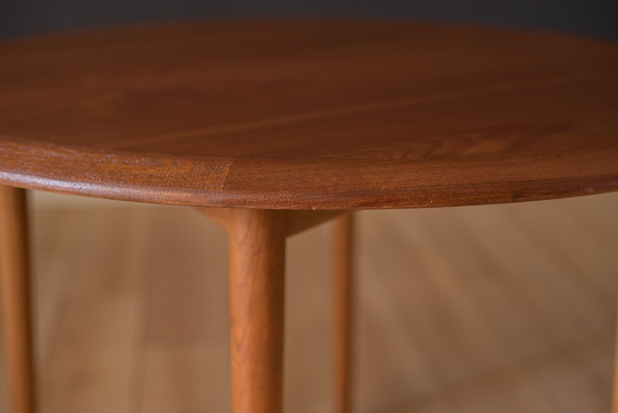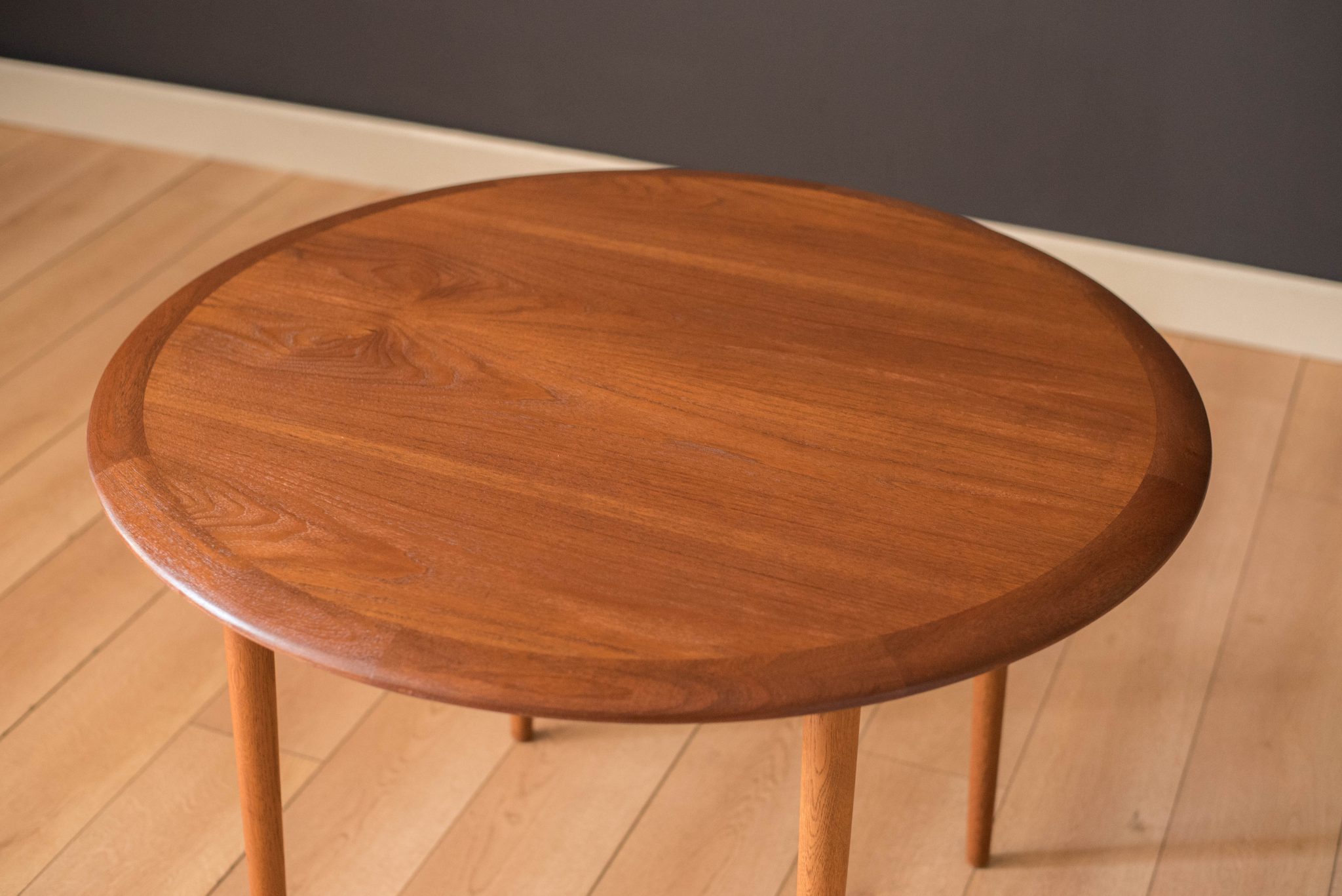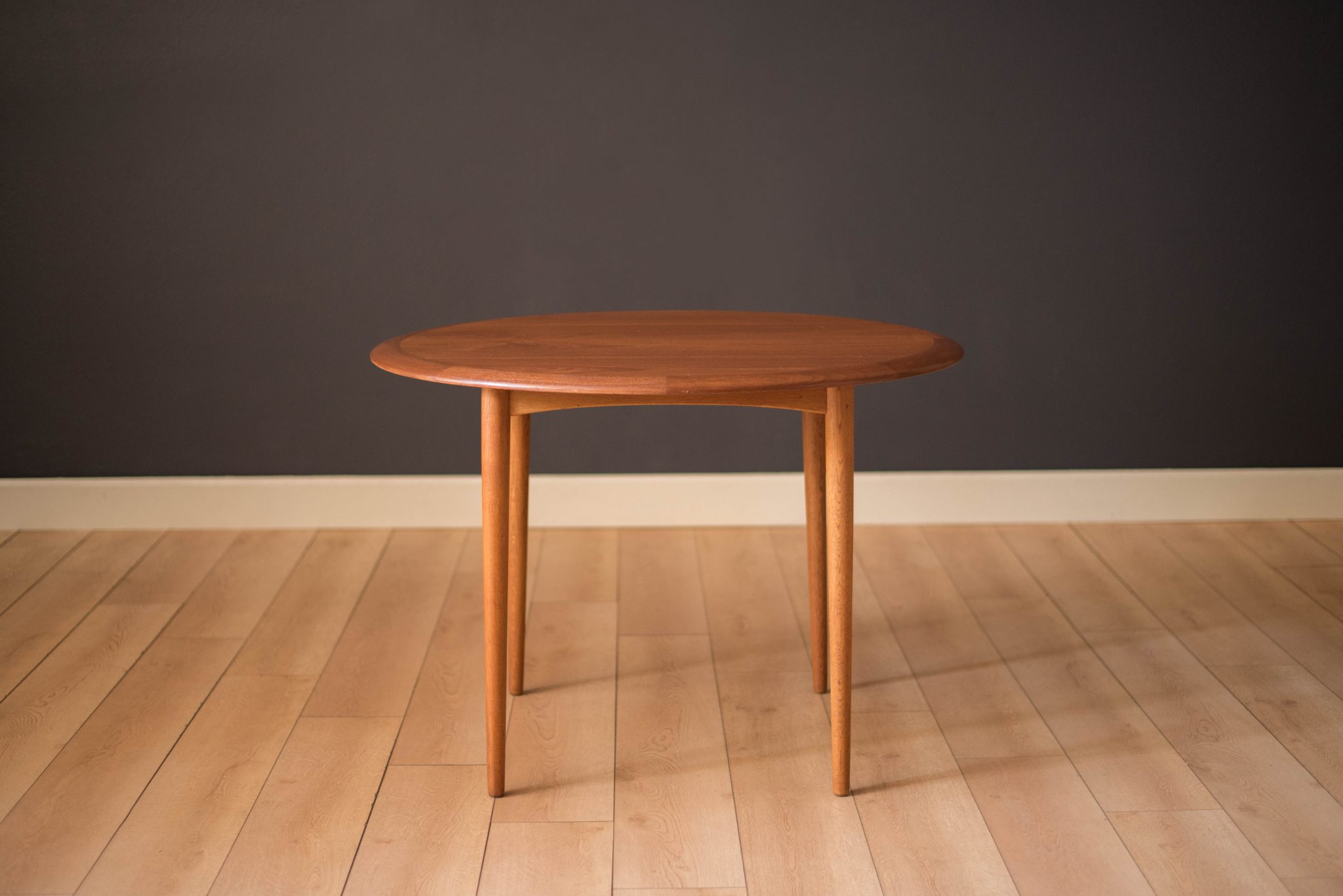 Mid-Century Modern round dining table in teak, circa 1960s, Denmark. This simple design seats up to four people and is perfect to use as a card game table. The tabletop features thick solid teak edge banding and is supported by contrasting oak tapered legs.