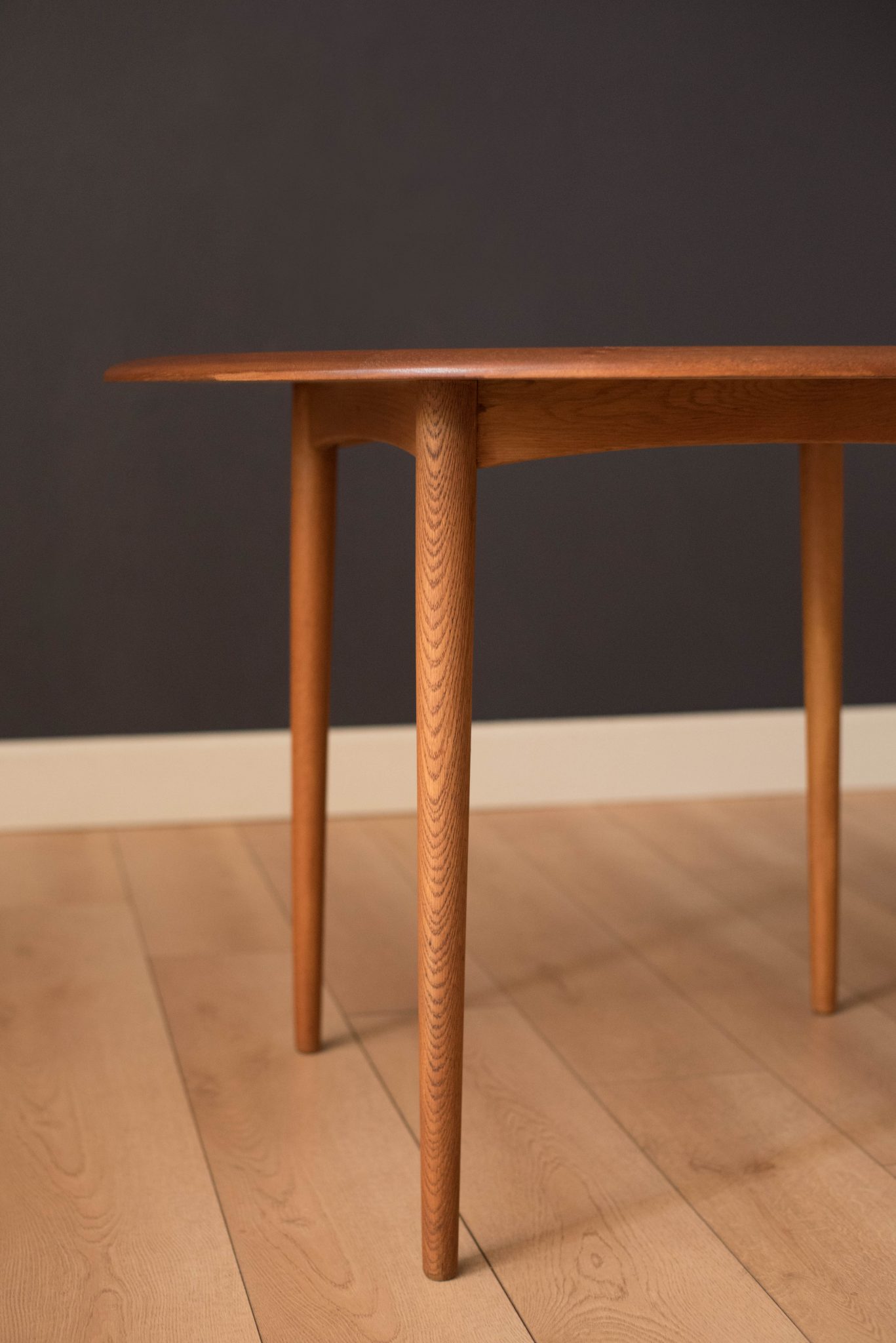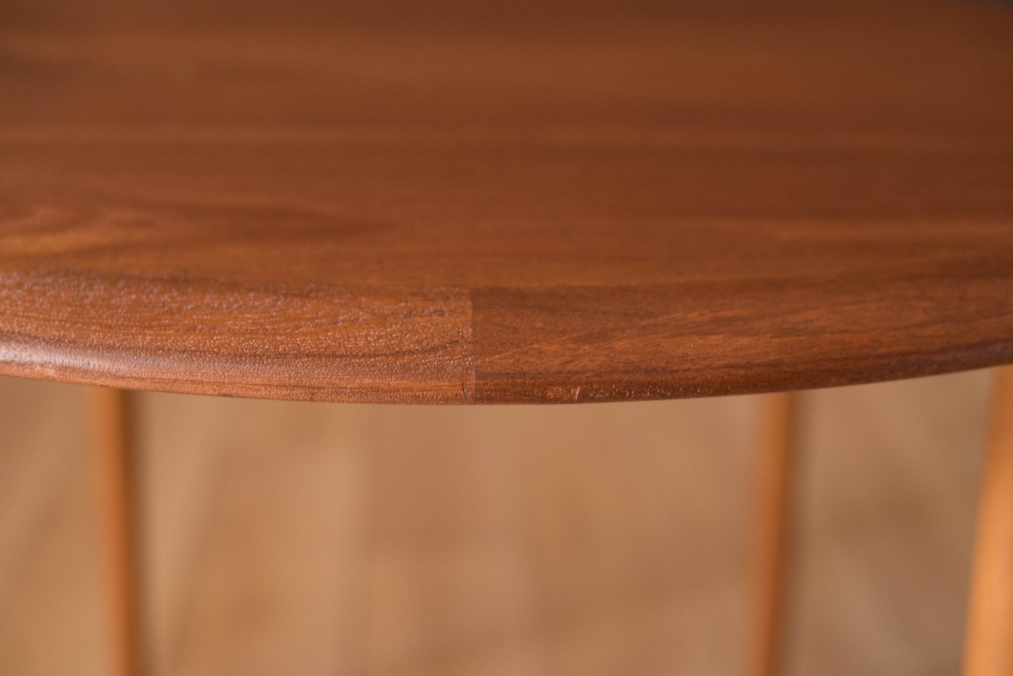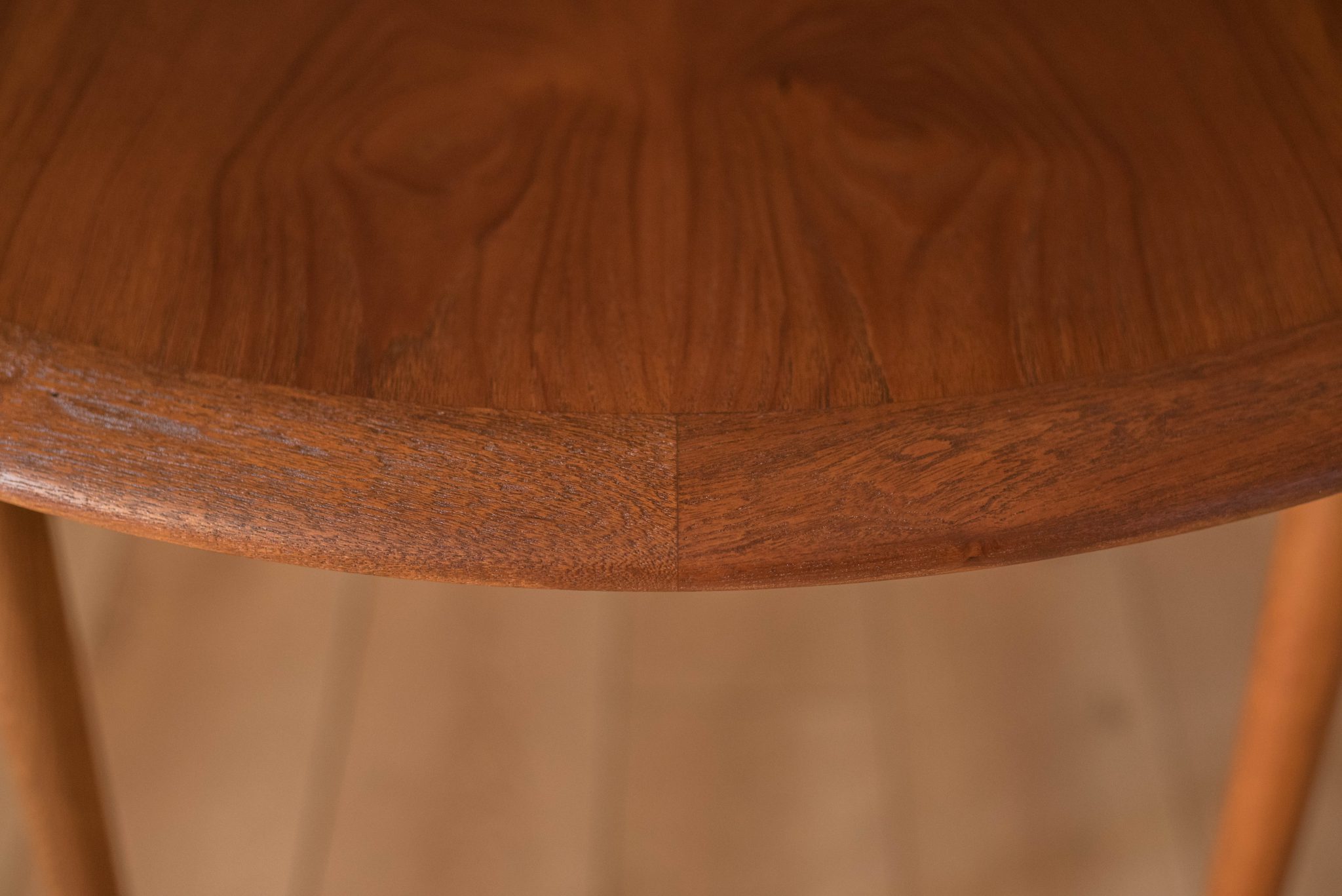 Mid-Century Modern round dining table in teak, circa 1960s, Denmark. This simple design seats up to four people and is perfect to use as a card game table. The tabletop features thick solid teak edge banding and is supported by contrasting oak tapered legs.