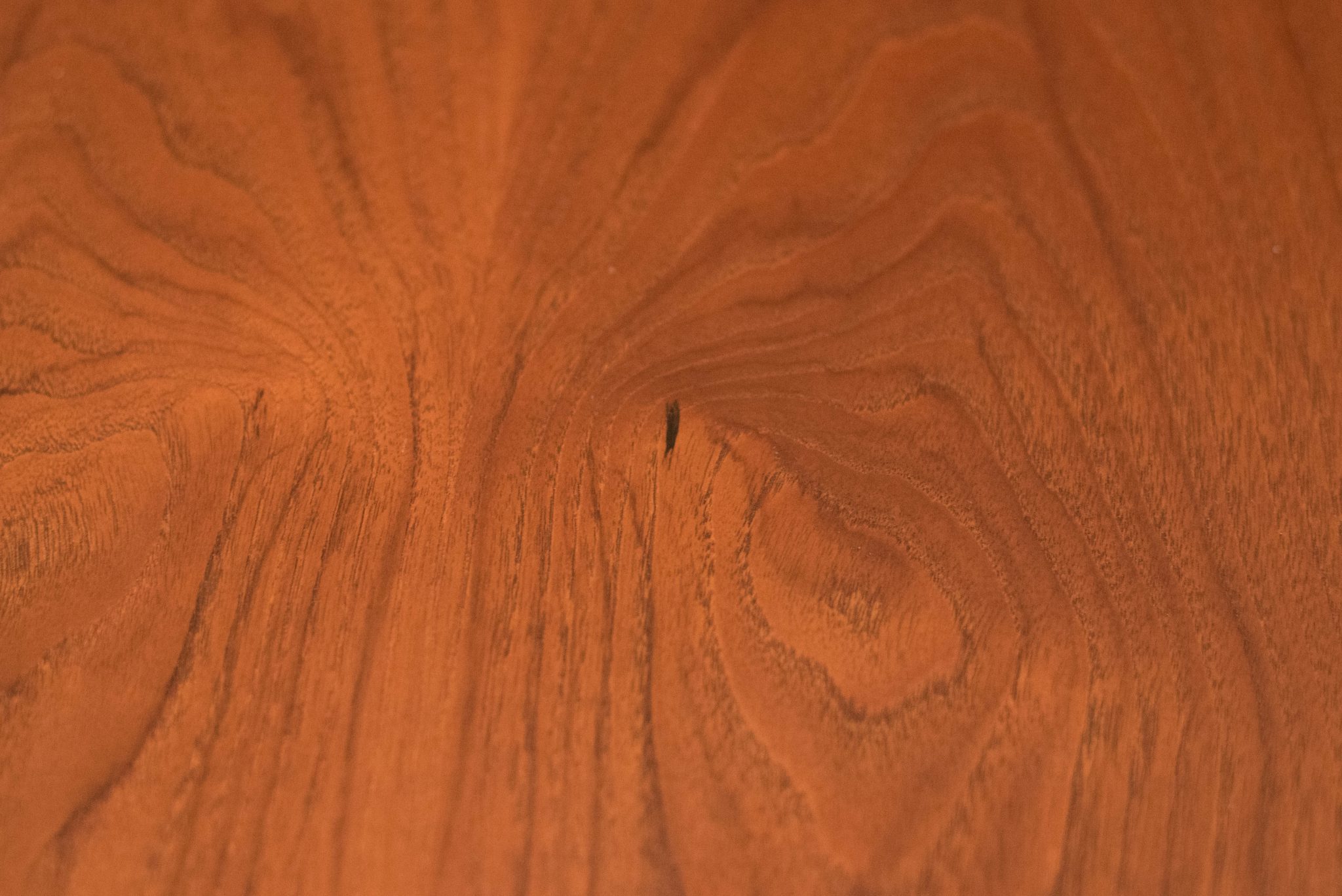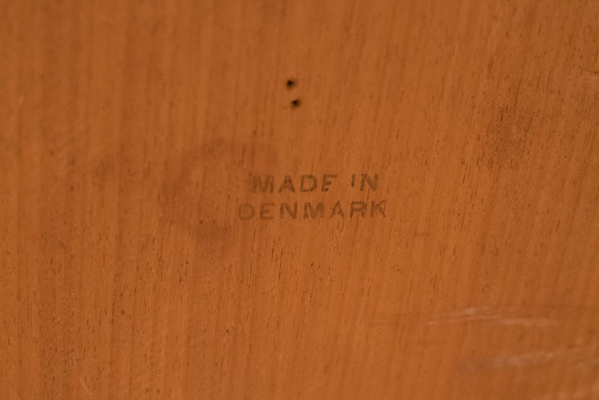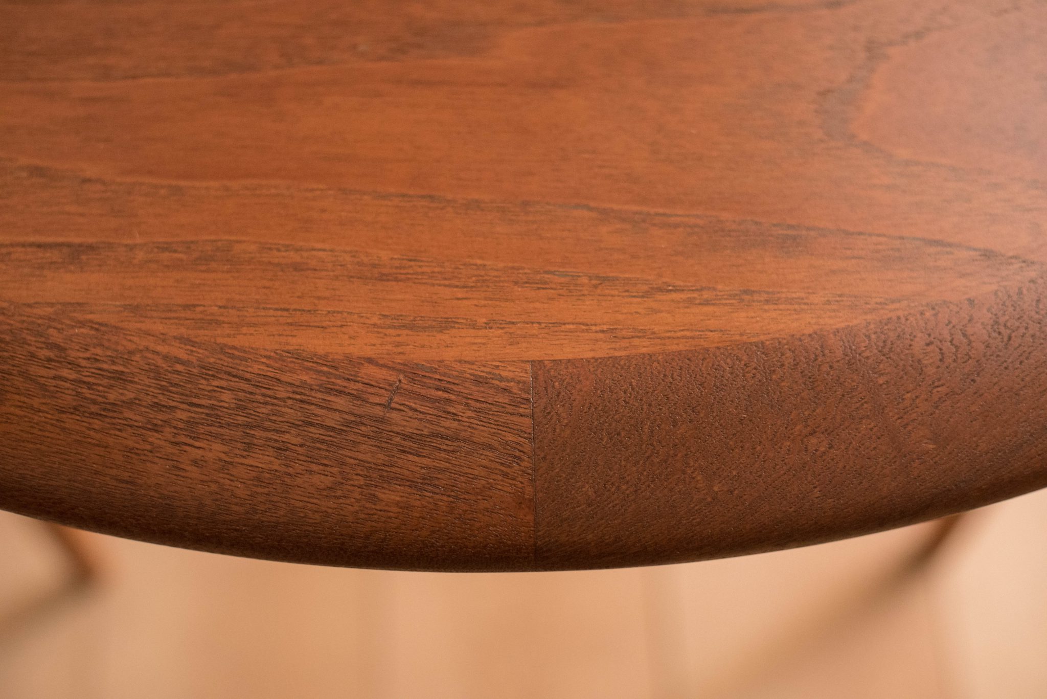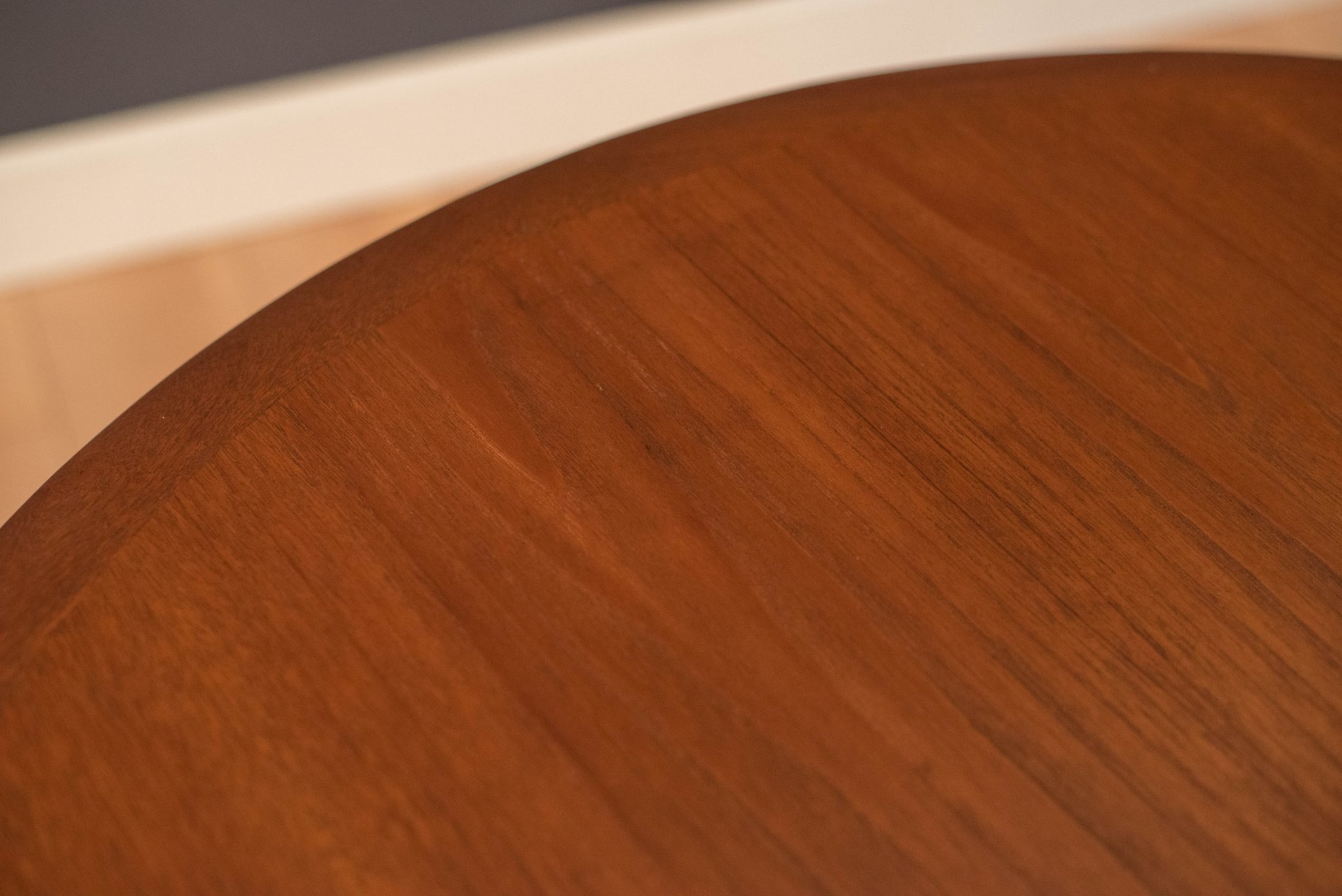 Mid-Century Modern round dining table in teak, circa 1960s, Denmark. This simple design seats up to four people and is perfect to use as a card game table. The tabletop features thick solid teak edge banding and is supported by contrasting oak tapered legs.