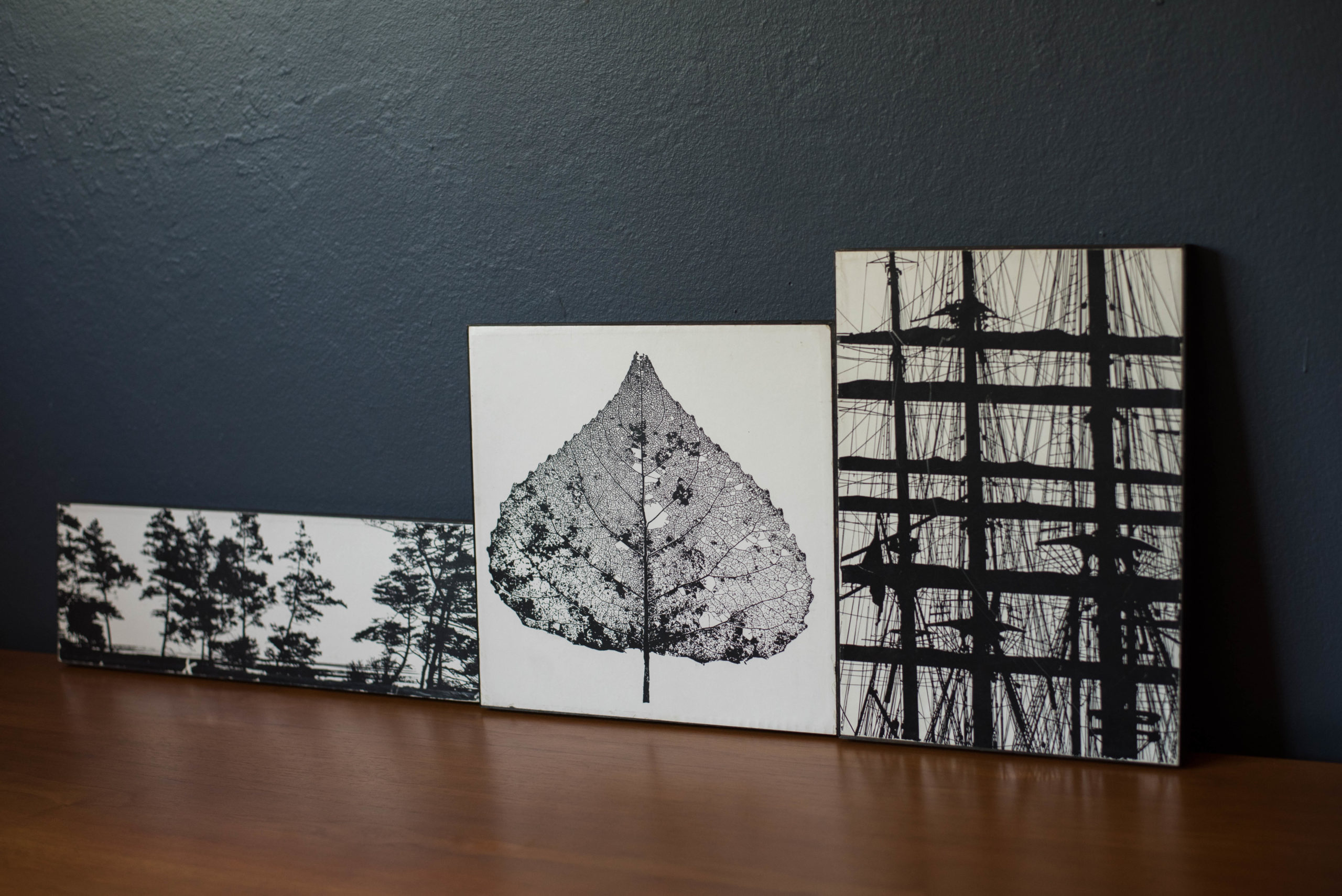 Mid century modern set of three black and white framed prints on fiberboard circa 1970’s, A/S Minerva Reproduktioner, Copenhagen. These hanging art prints are mounted onto a wood black frame perfect for a gallery wall layout and to create depth into a space.