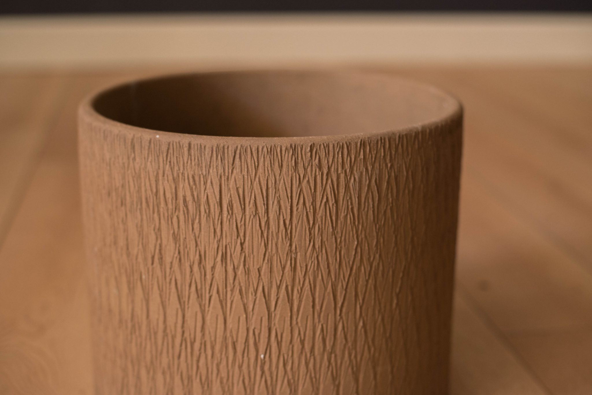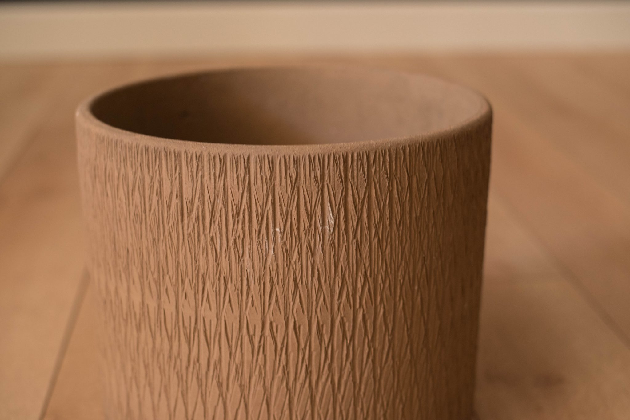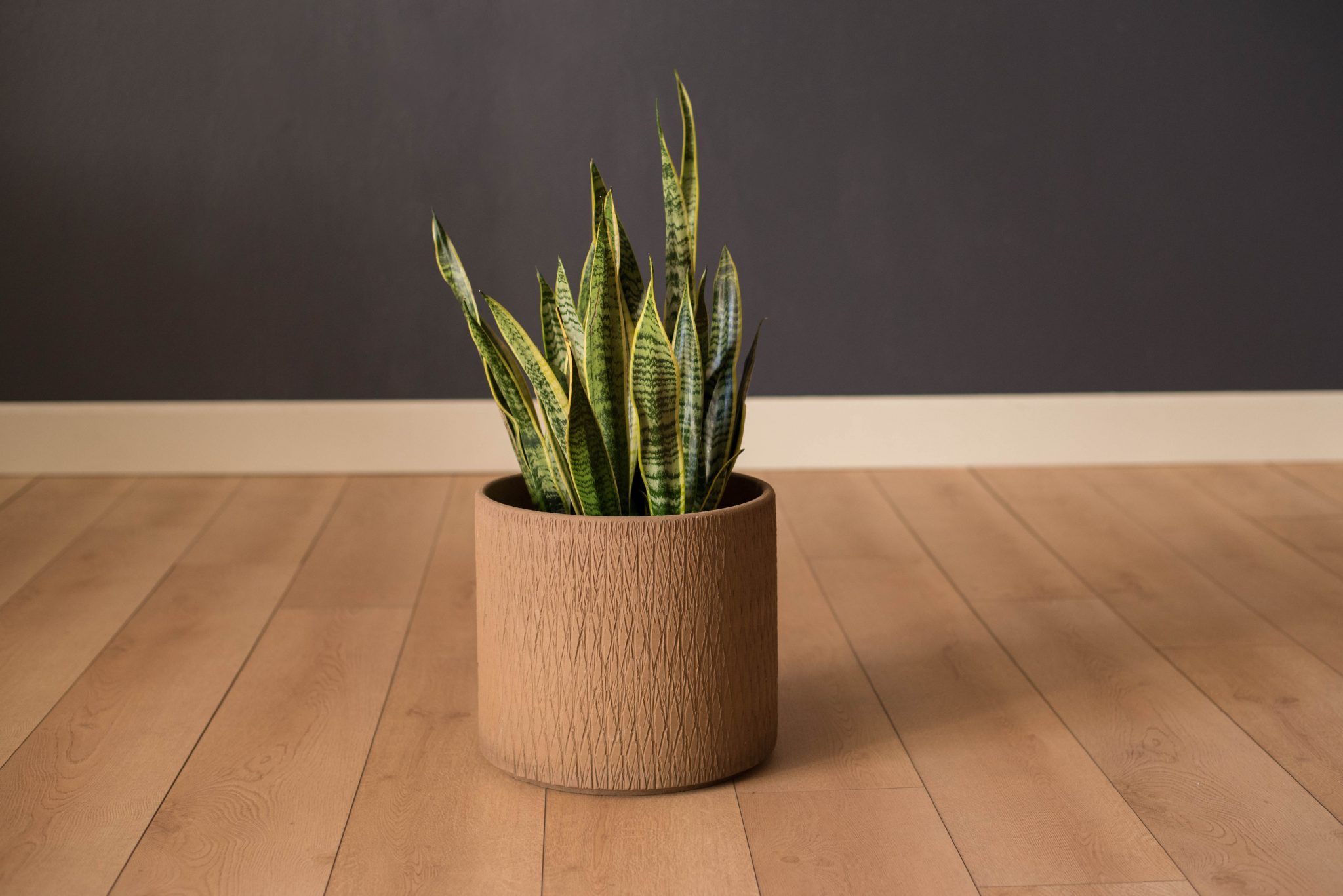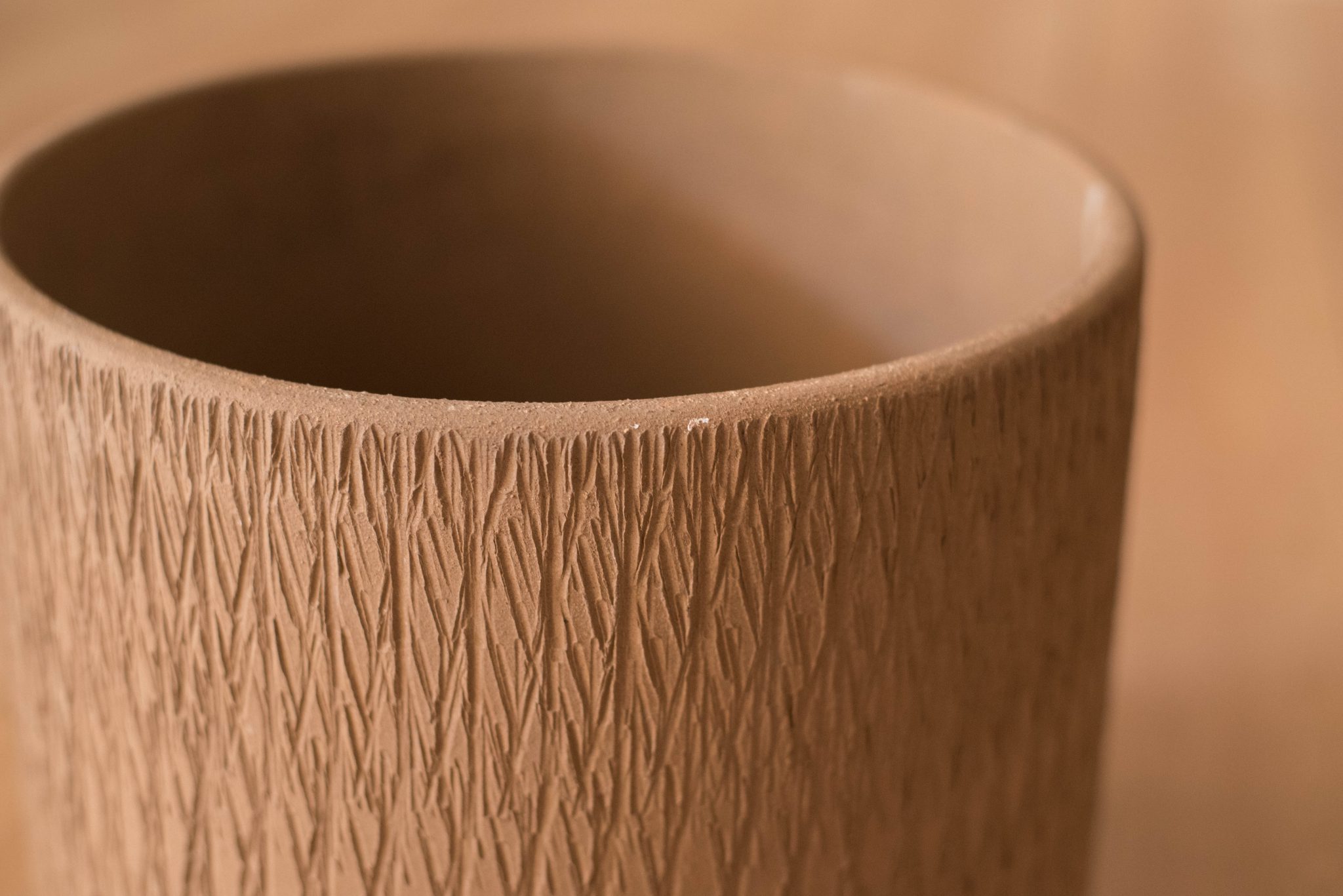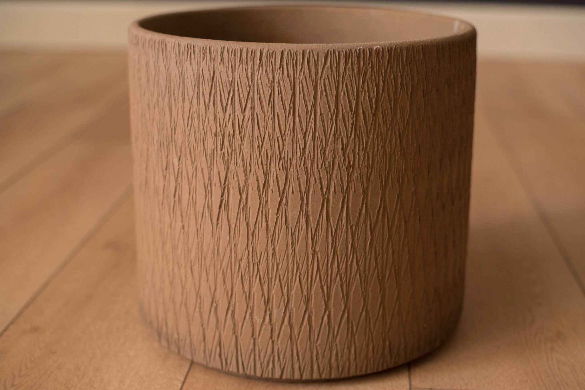 Mid-Century Modern sgraffito ceramic planter made by Gainey Ceramics. This piece can be used both indoor or outdoor and displays a unique etched design with a neutral matte brown finish.