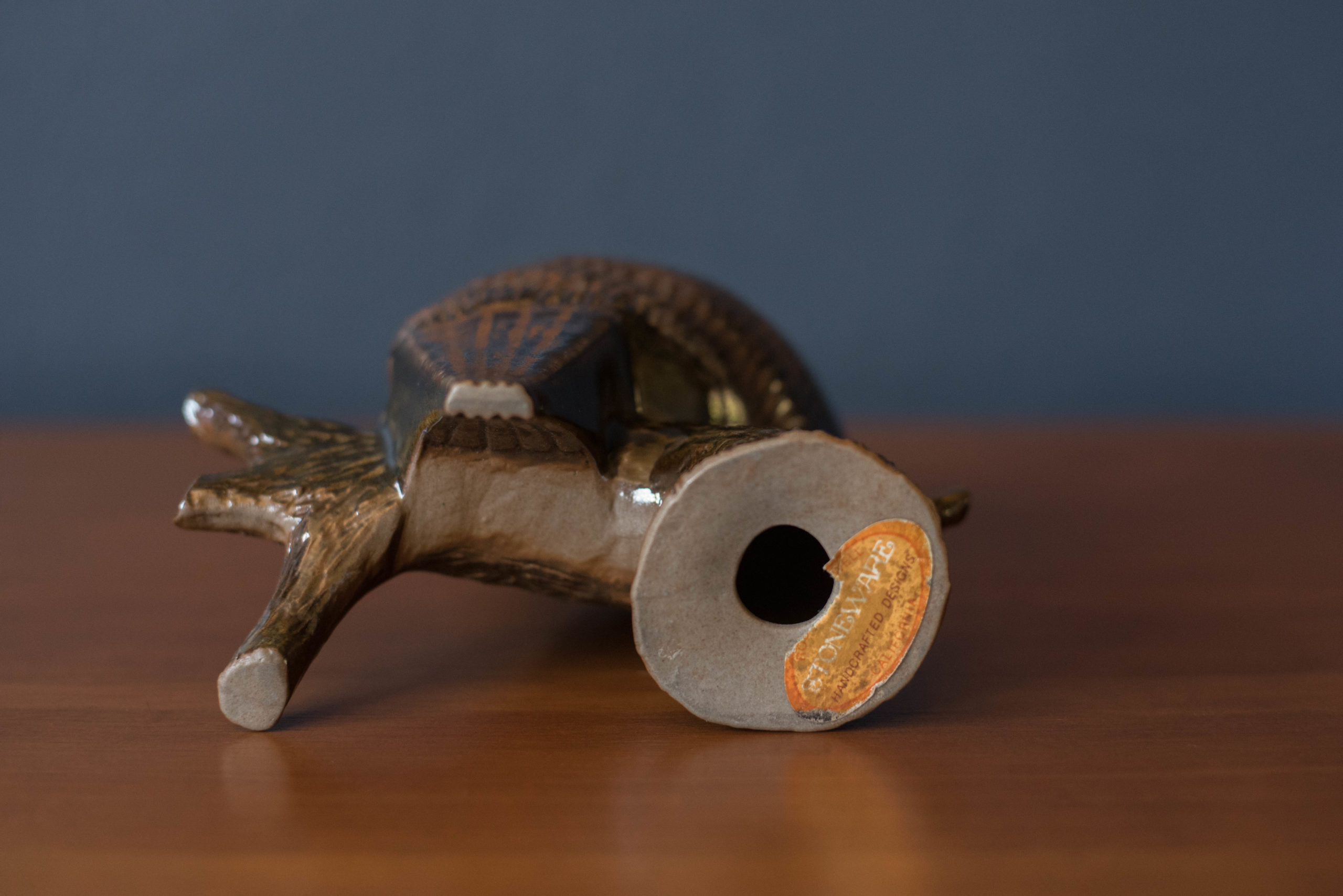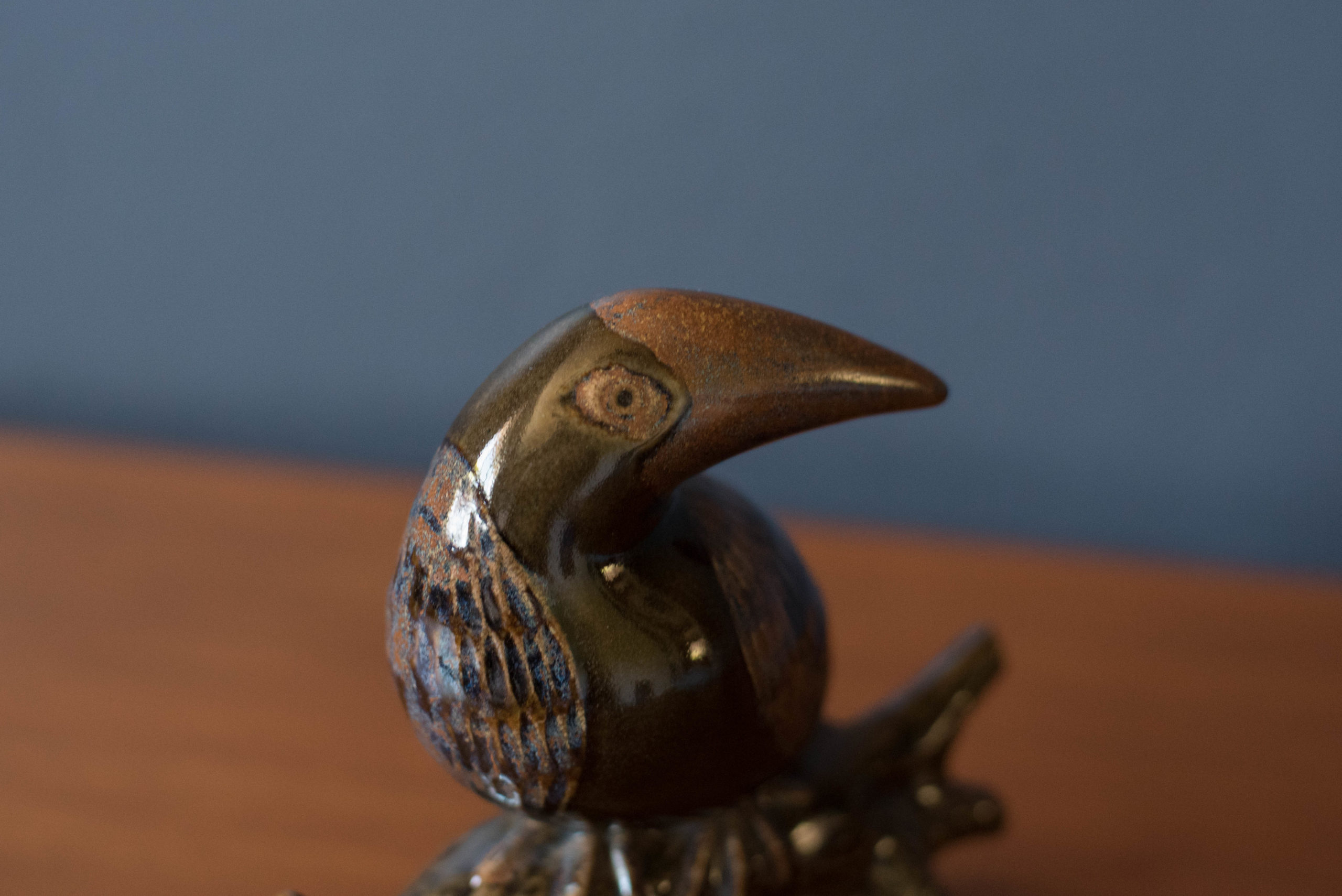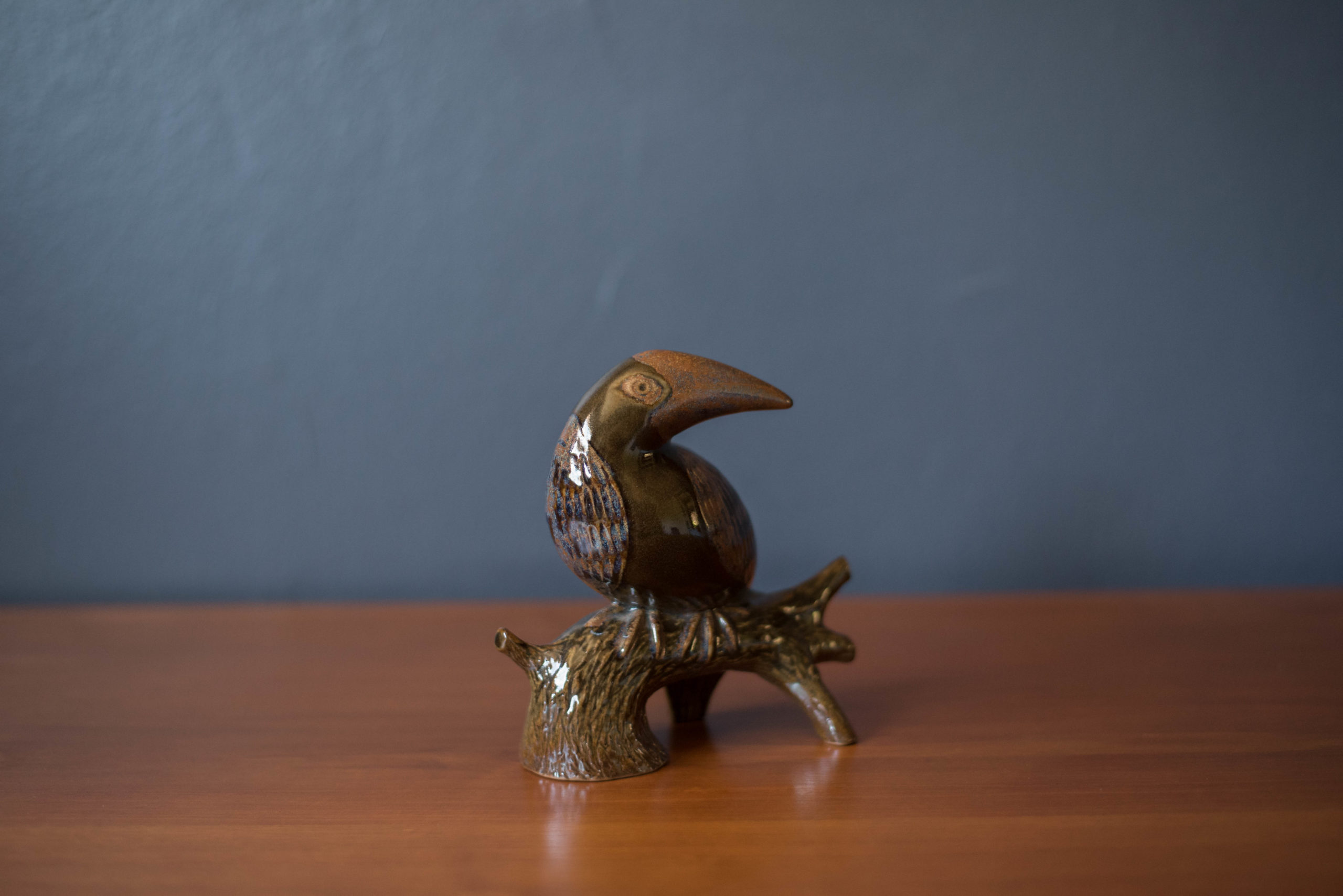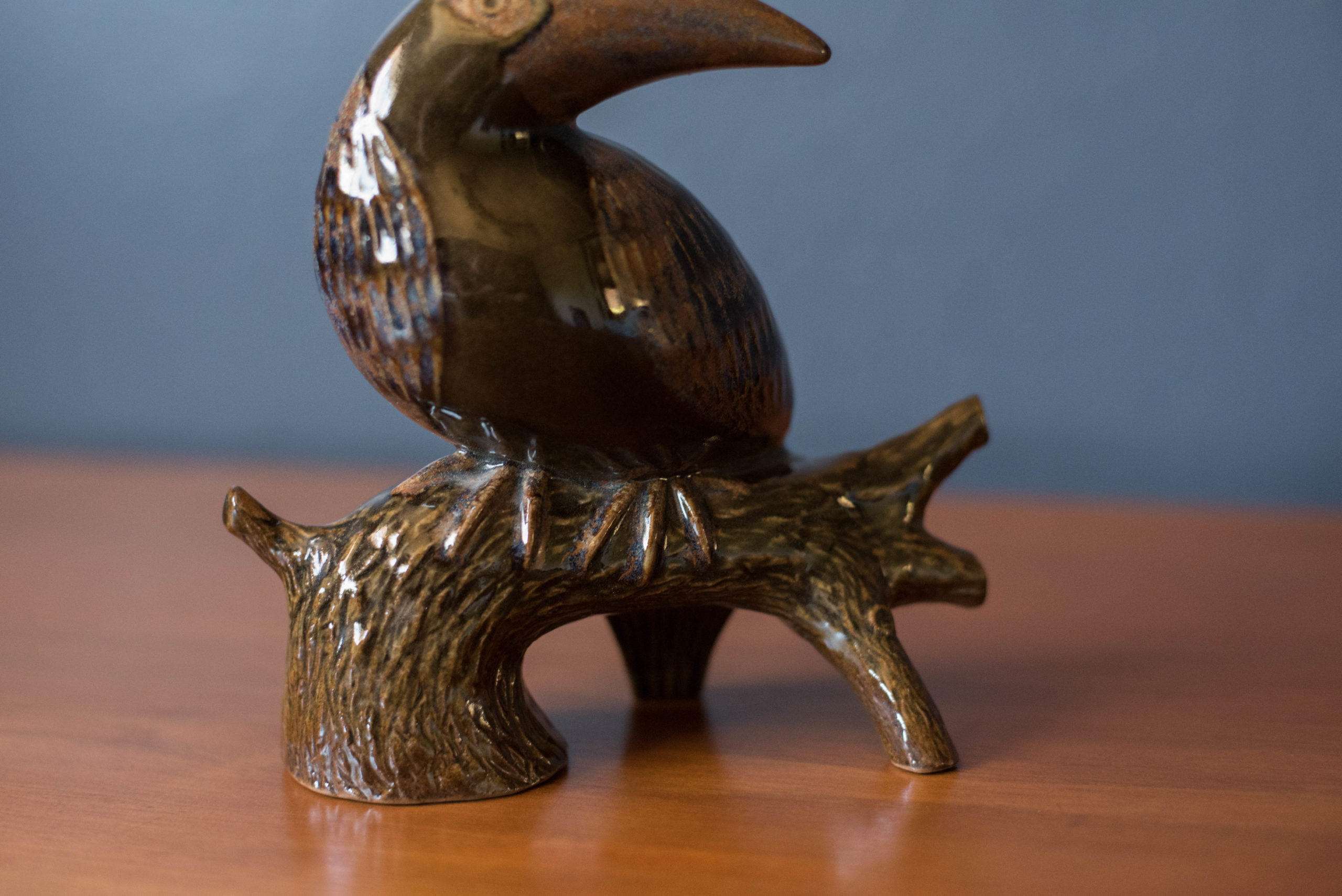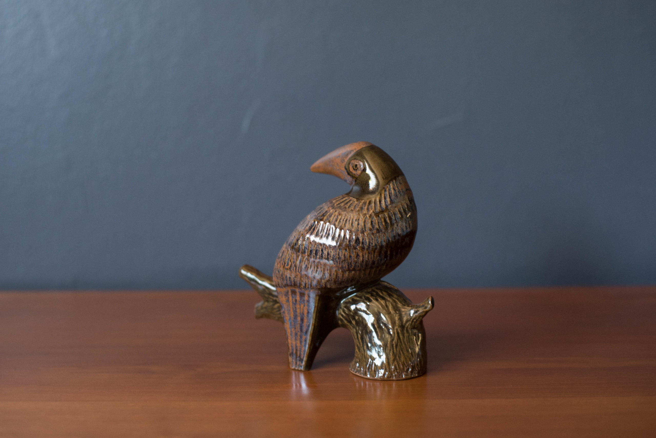 Vintage ceramic pottery stoneware zoo bird sculpture designed by Robert Maxwell circa 1960’s in Venice, California. This slip-cast studio piece is reminiscent of a “toucan resting on a tree” featuring a vibrant blue and earthtone glaze rarely seen in the artist’s work. Labeled ‘Robert Maxwell Stoneware Handcrafted Designs California’.
