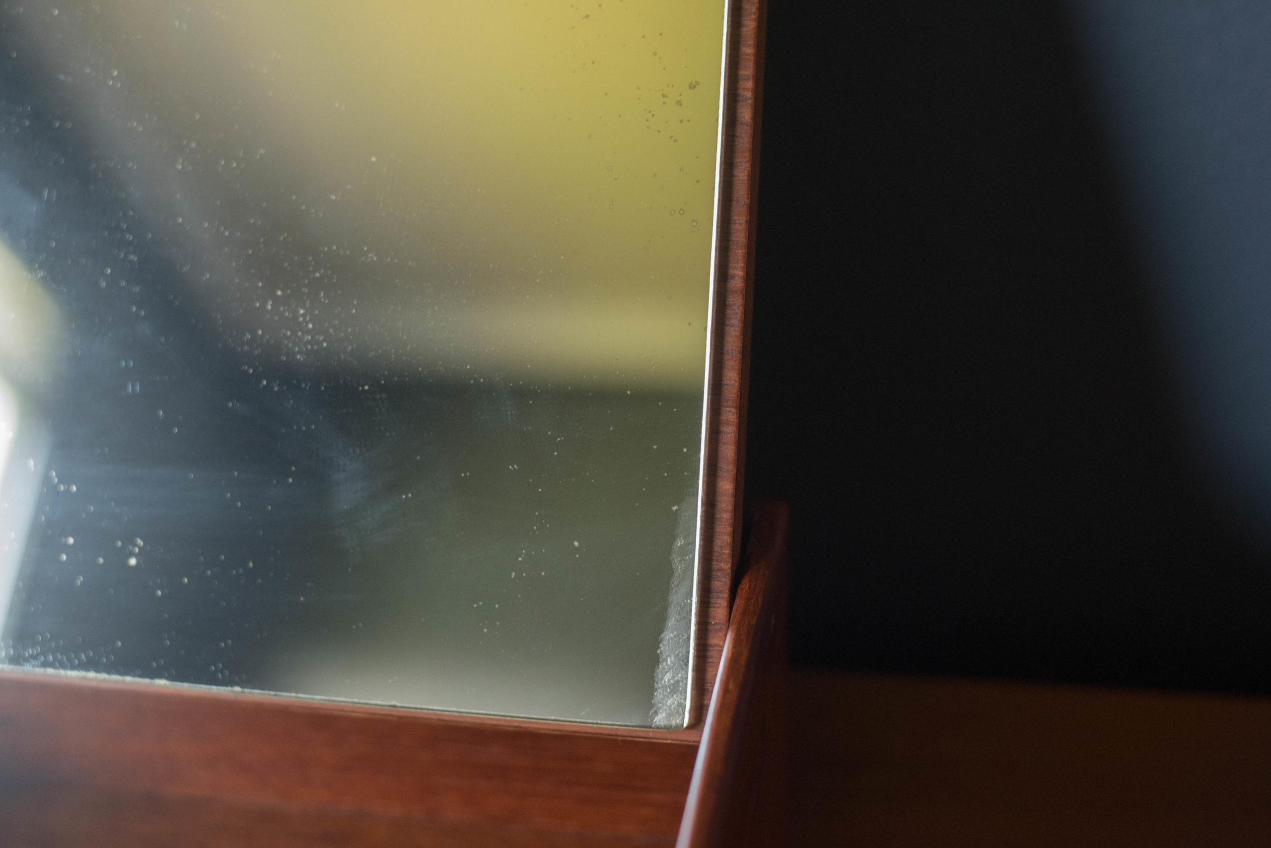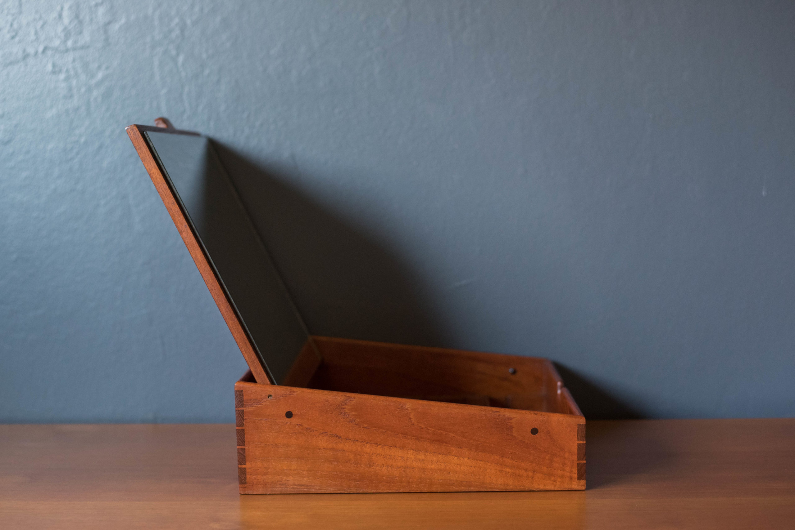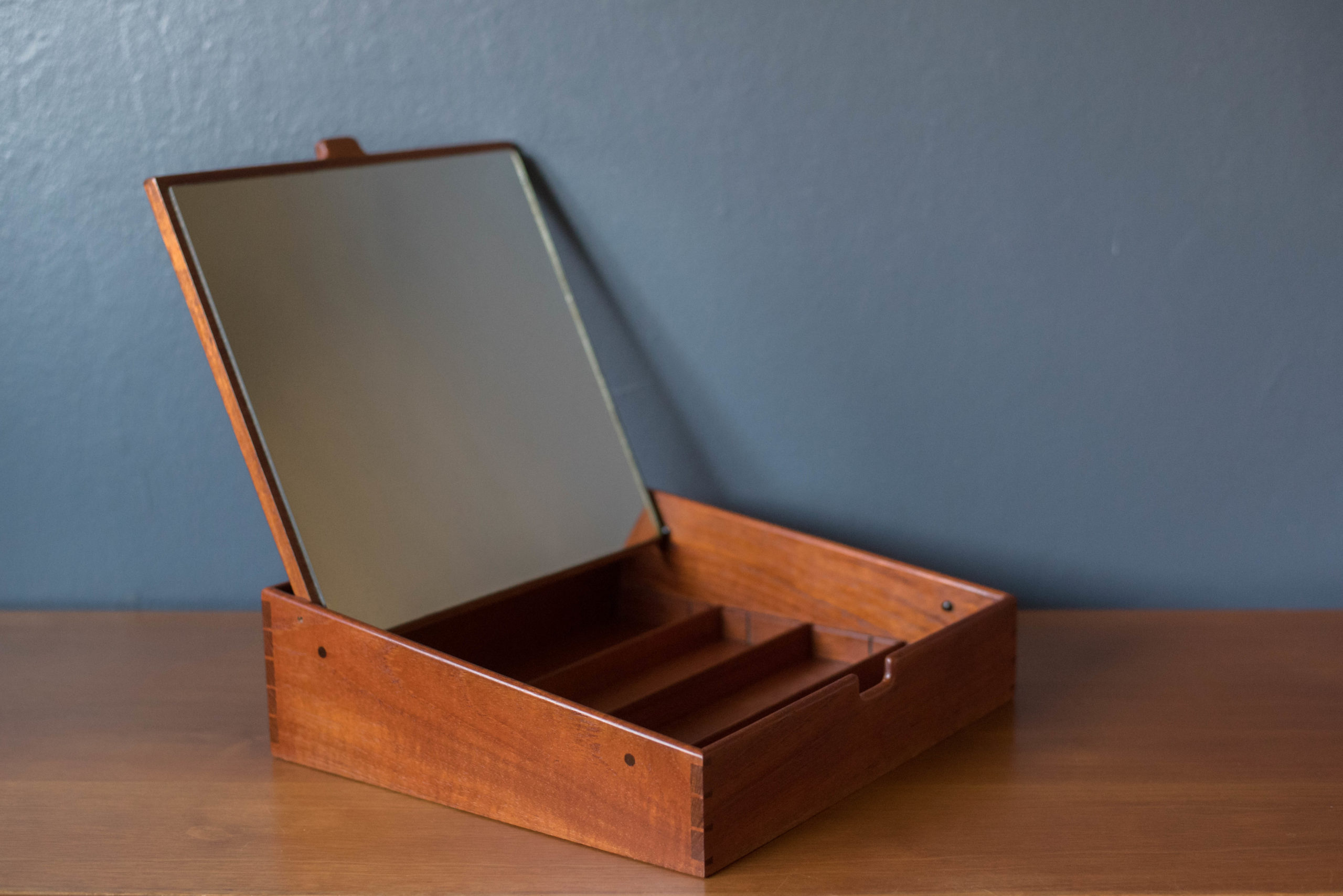 Mid century modern organizing trinket jewelry box designed by Ejner Larsen and Aksel Bender Madsen for cabinet maker Willy Beck, Denmark. This piece features gorgeous wood grains and detailed joinery constructed of solid teak. Includes a vanity mirror with three adjustable dividers to keepsake jewelry, accessories, and small personal belongings. The perfect decorative storage piece for a bedroom vanity or dresser. In good condition with wear such as blemishes and nicks on the wood. Patina on the mirror. See photos.