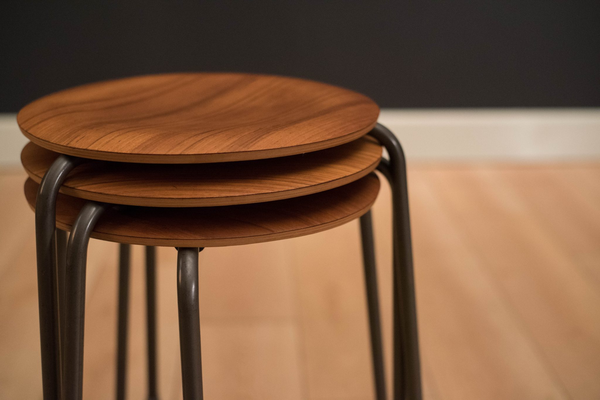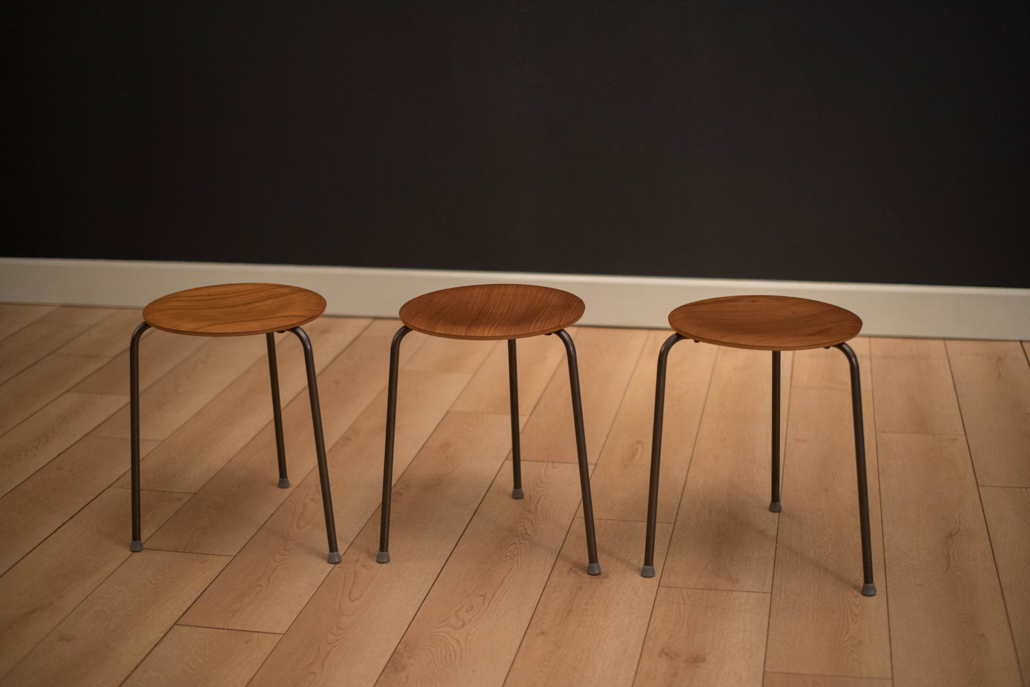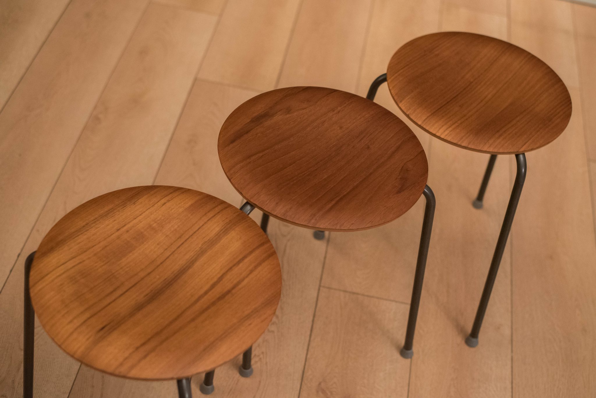 Mid Century set of three dot stools by Arne Jacobsen for Fritz Hansen. This stackable collection features a curved teak tabletop and the original three legged base.