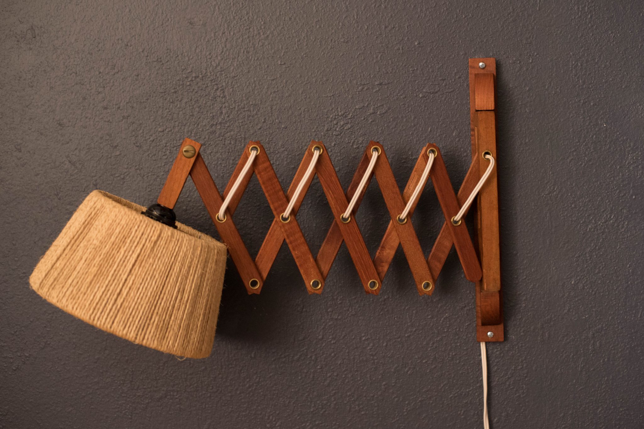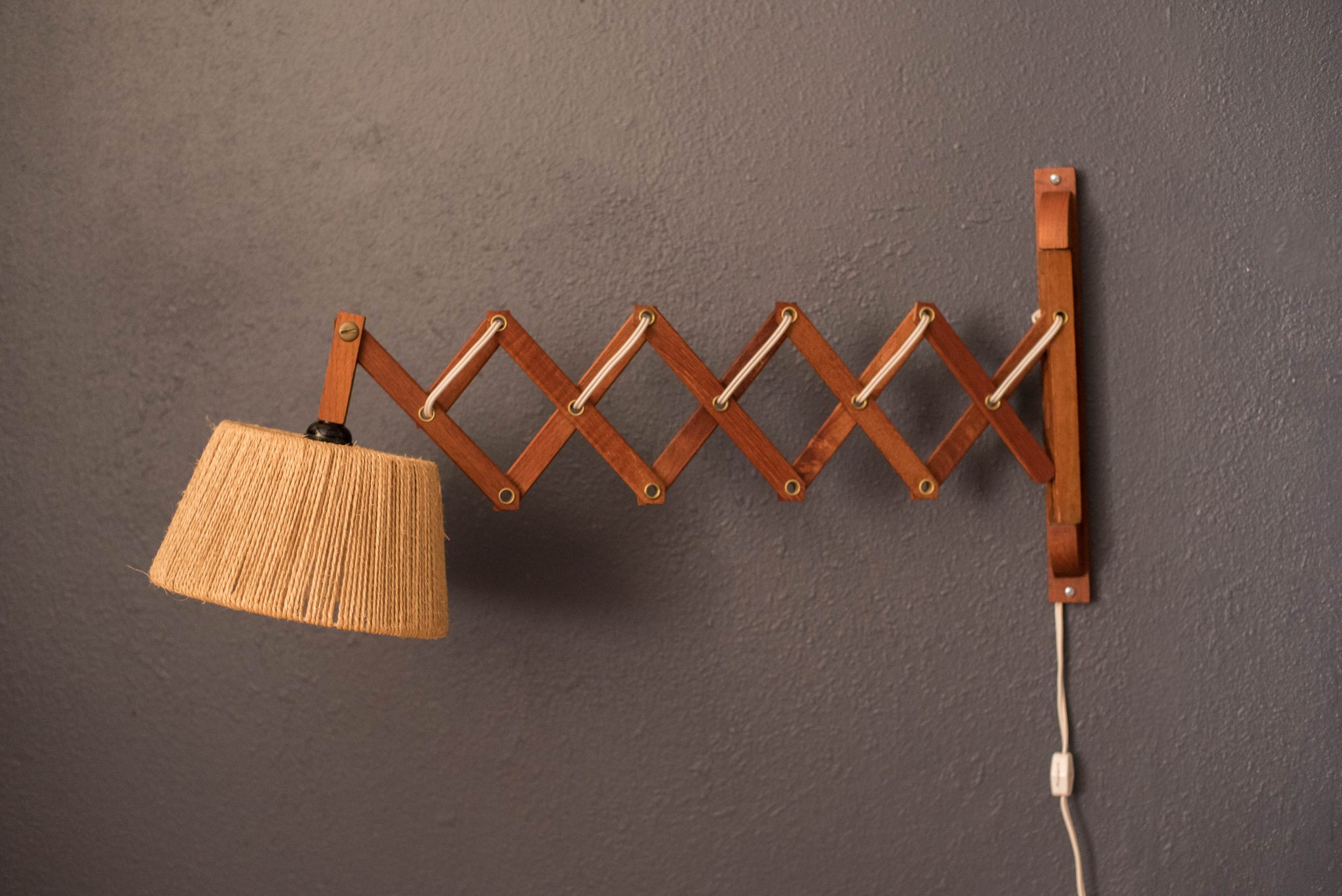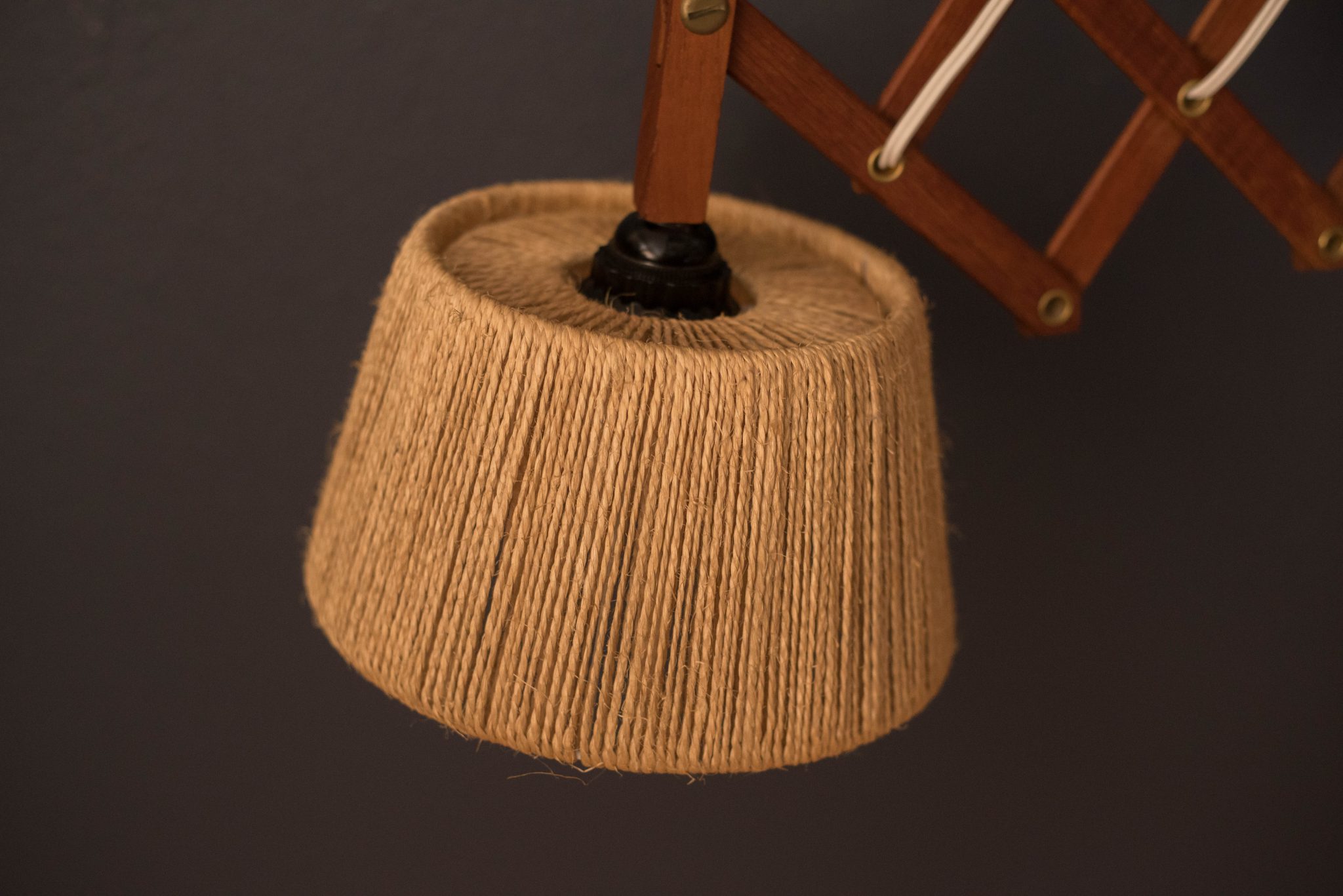 Mid century mounted wall pendant lamp by Fog and Morup in teak. This piece is equipped with an accordion style swing arm and pivoting jute shade.