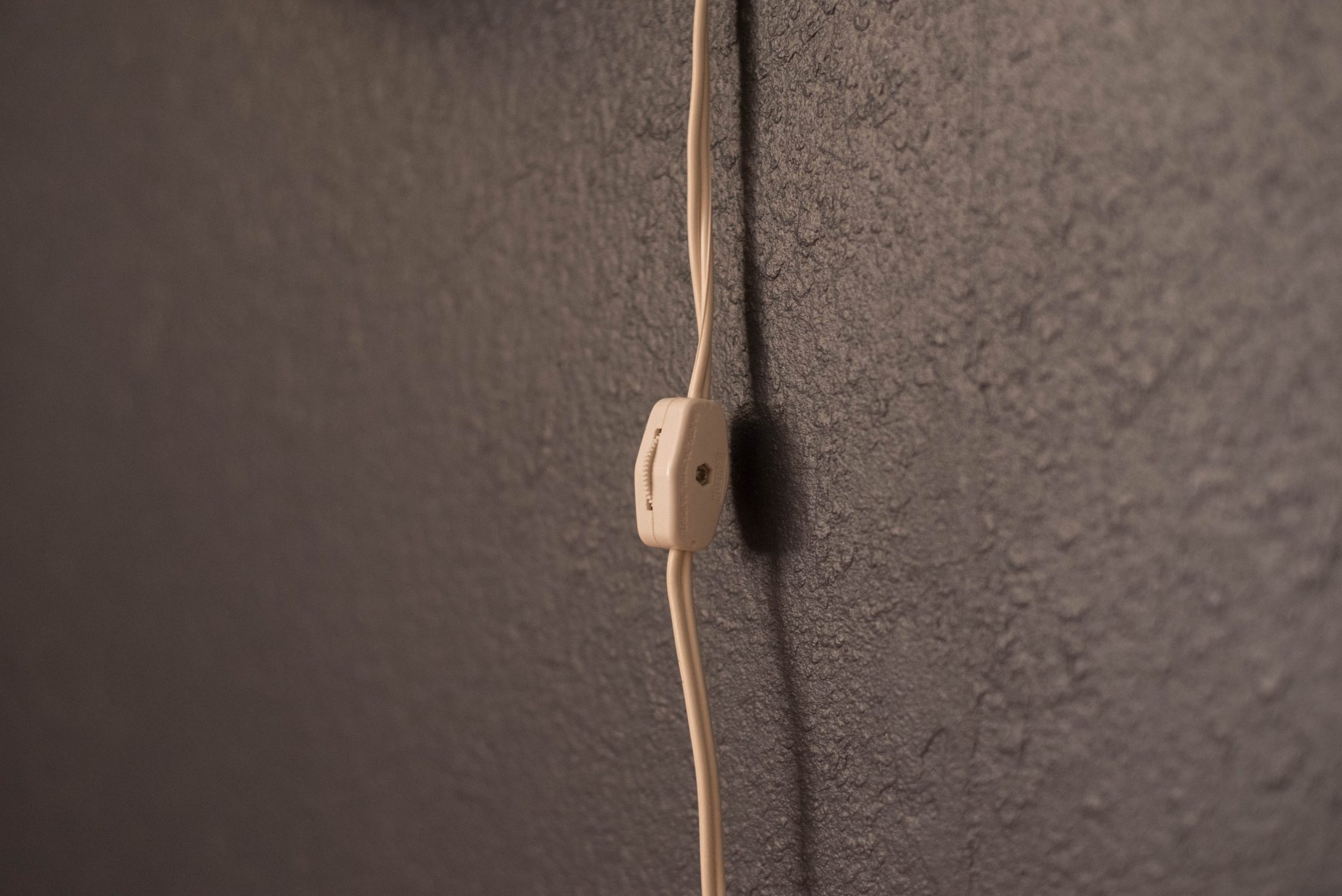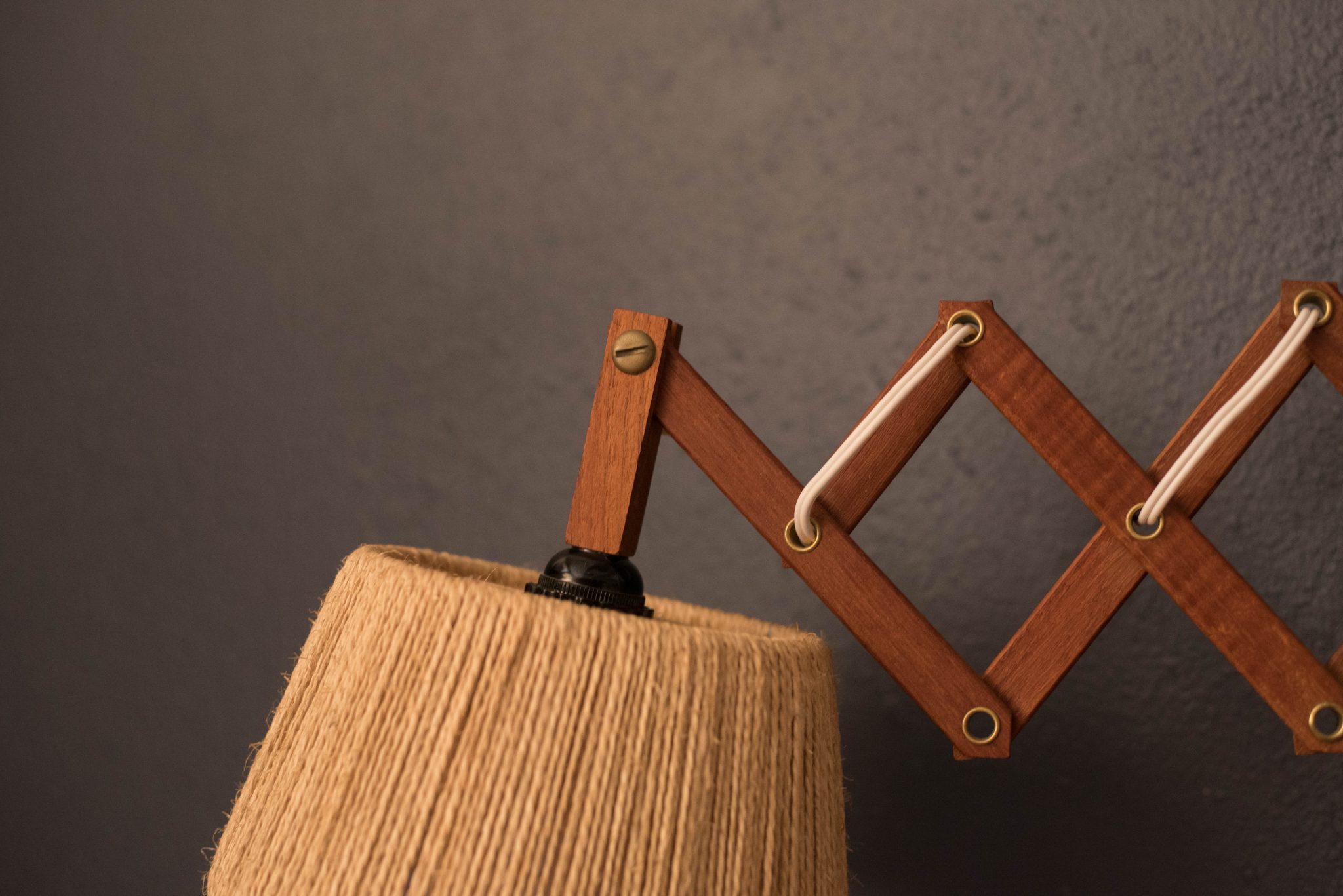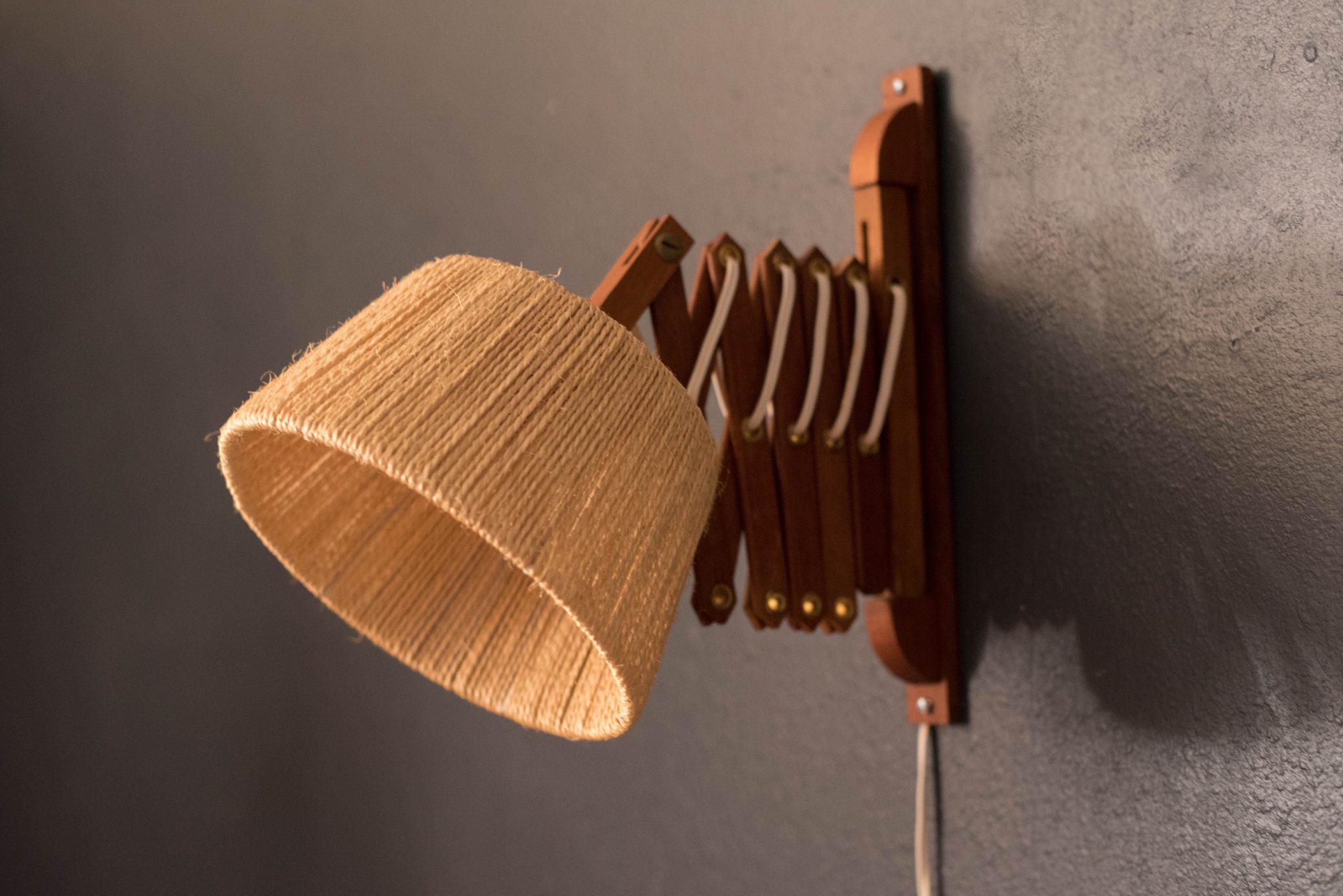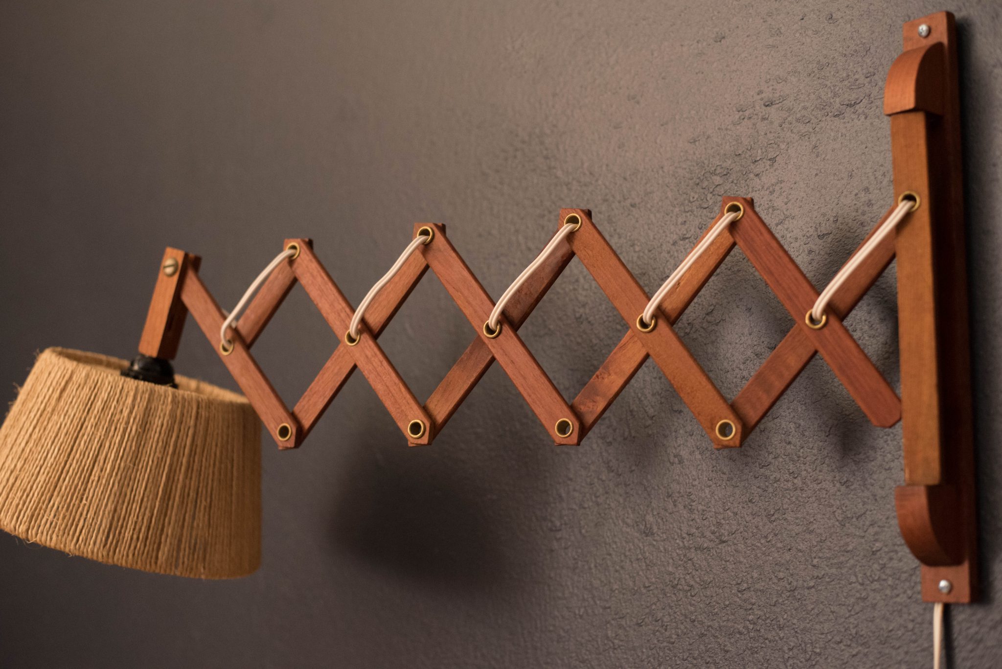 Mid century mounted wall pendant lamp by Fog and Morup in teak. This piece is equipped with an accordion style swing arm and pivoting jute shade.