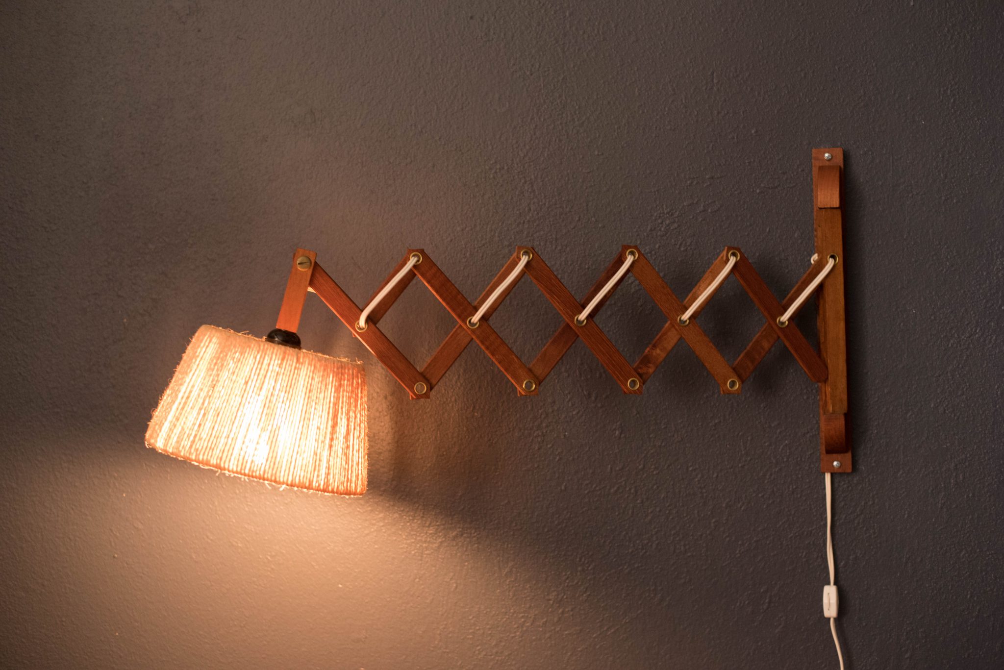 Mid century mounted wall pendant lamp by Fog and Morup in teak. This piece is equipped with an accordion style swing arm and pivoting jute shade.