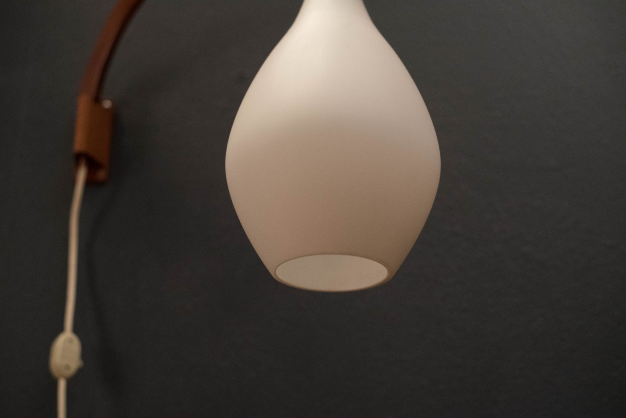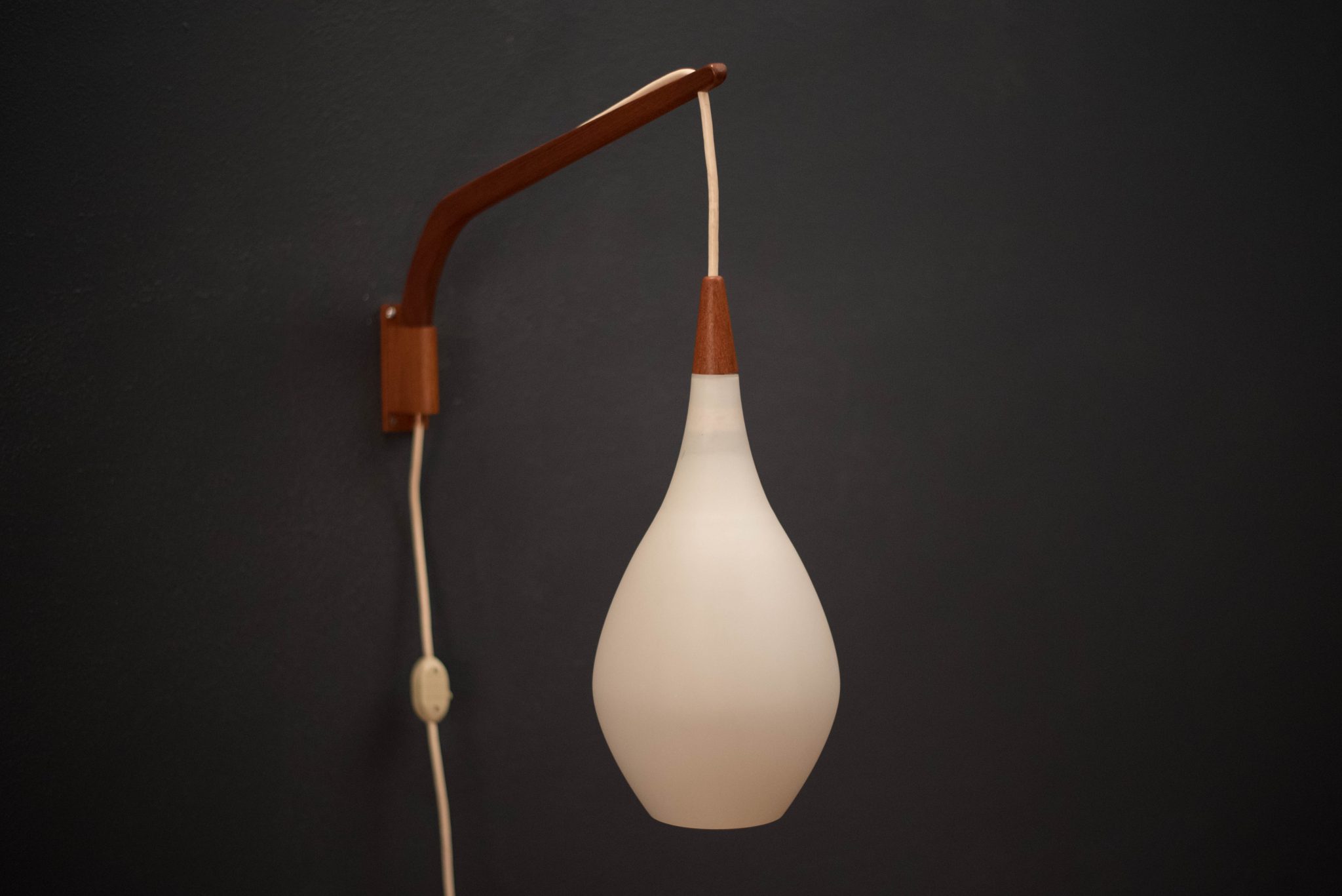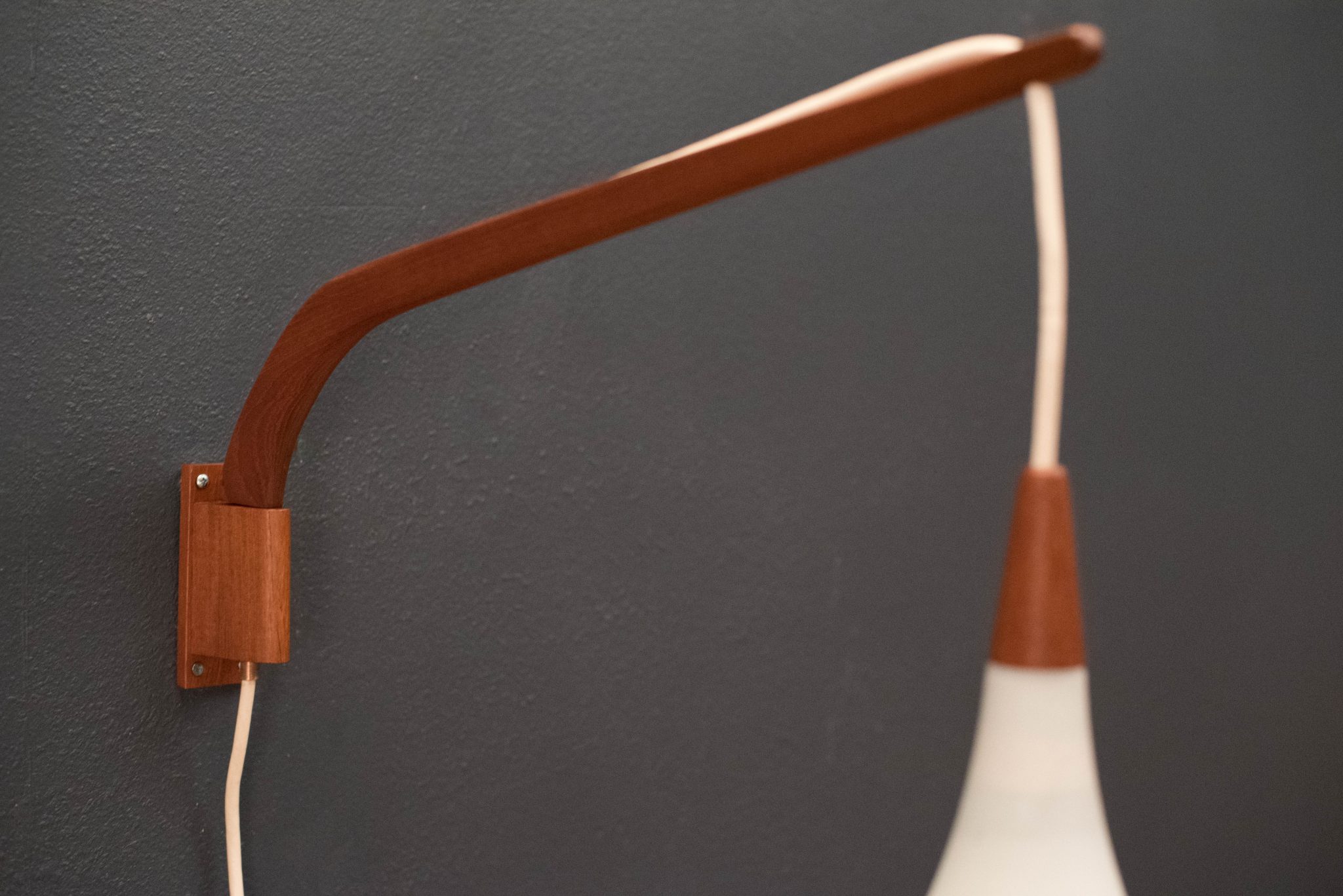 Mid-Century Modern hanging wall light by Holmegaard in teak. This piece displays a white frosted glass shade and includes a teak swing arm with adjustable cord.