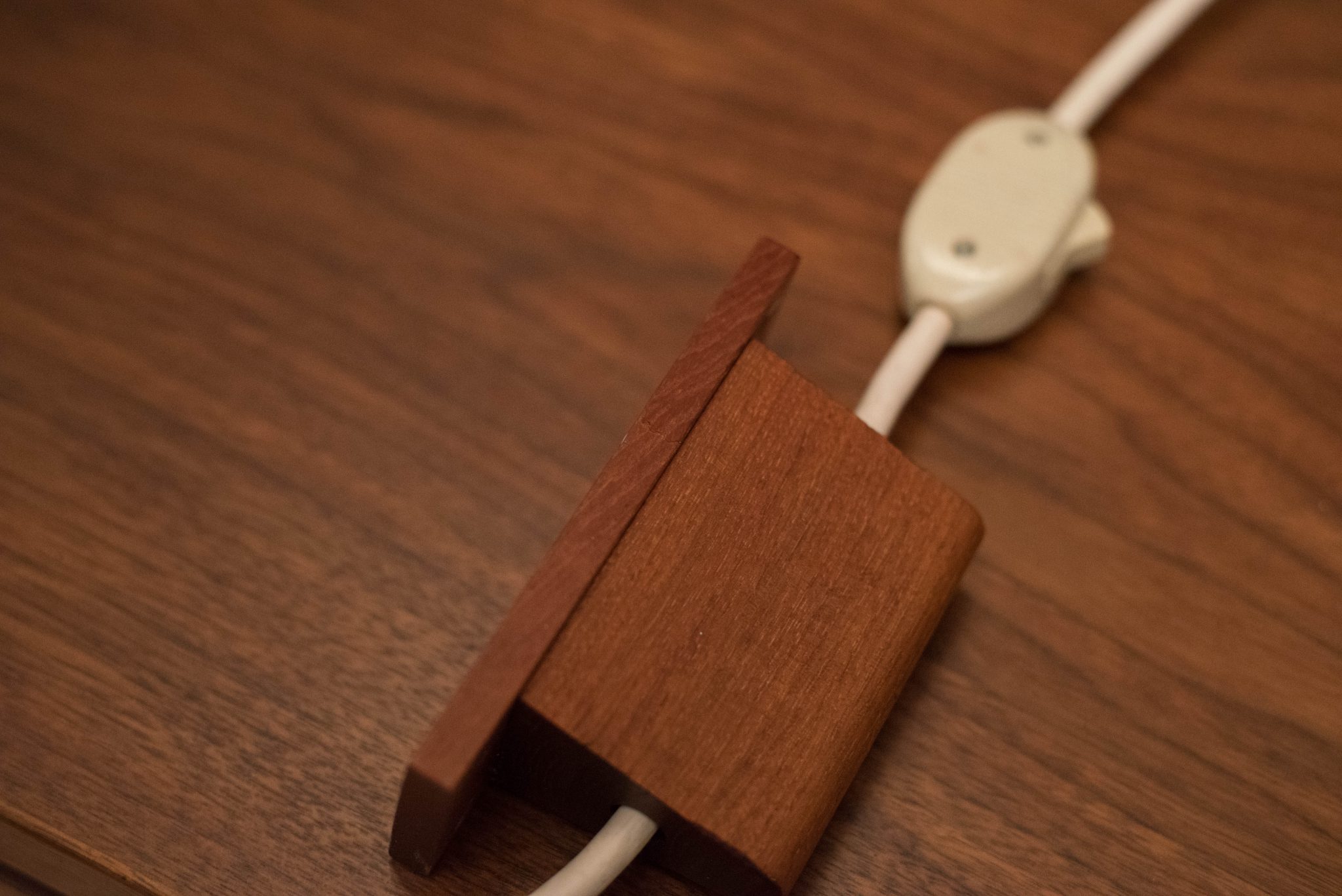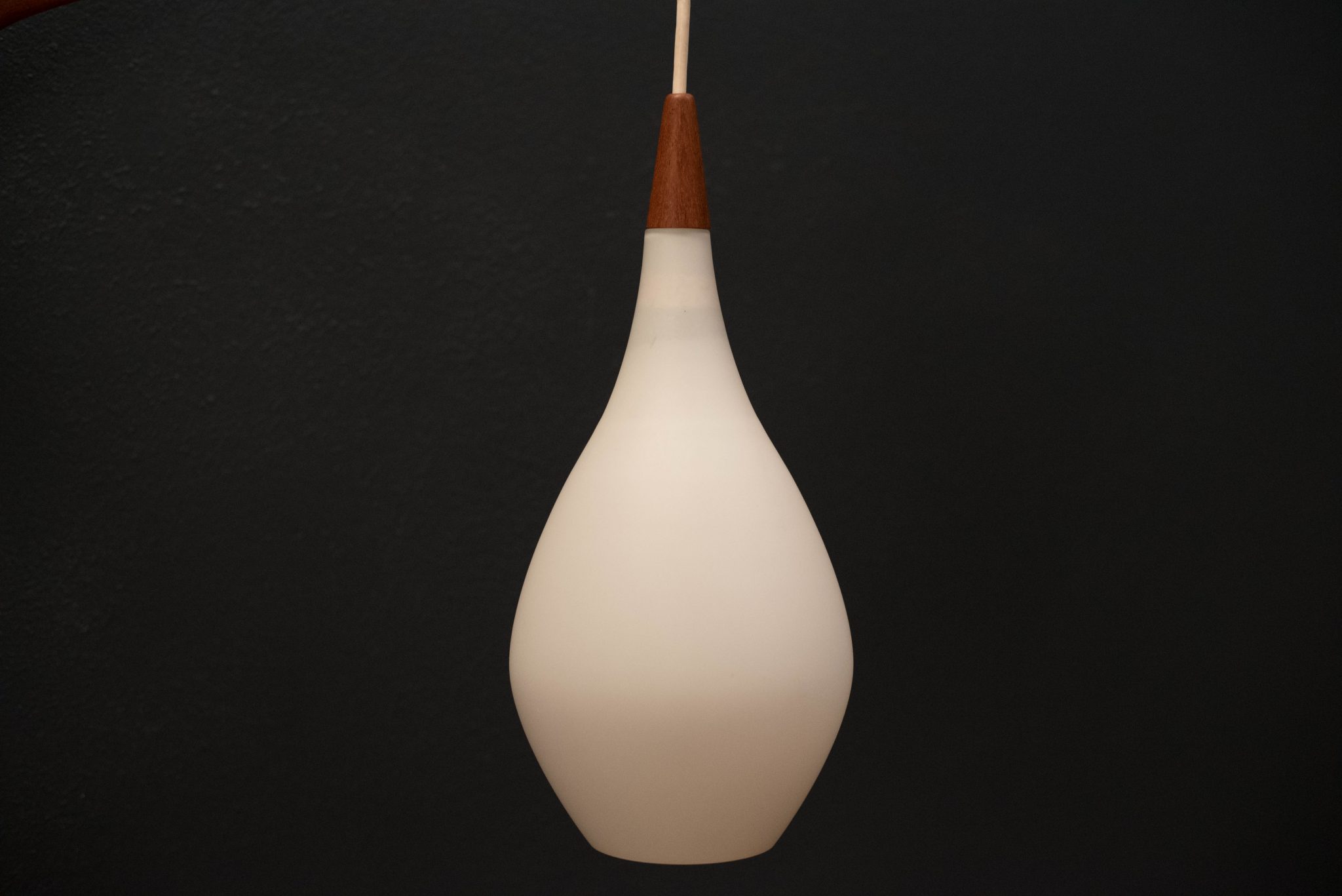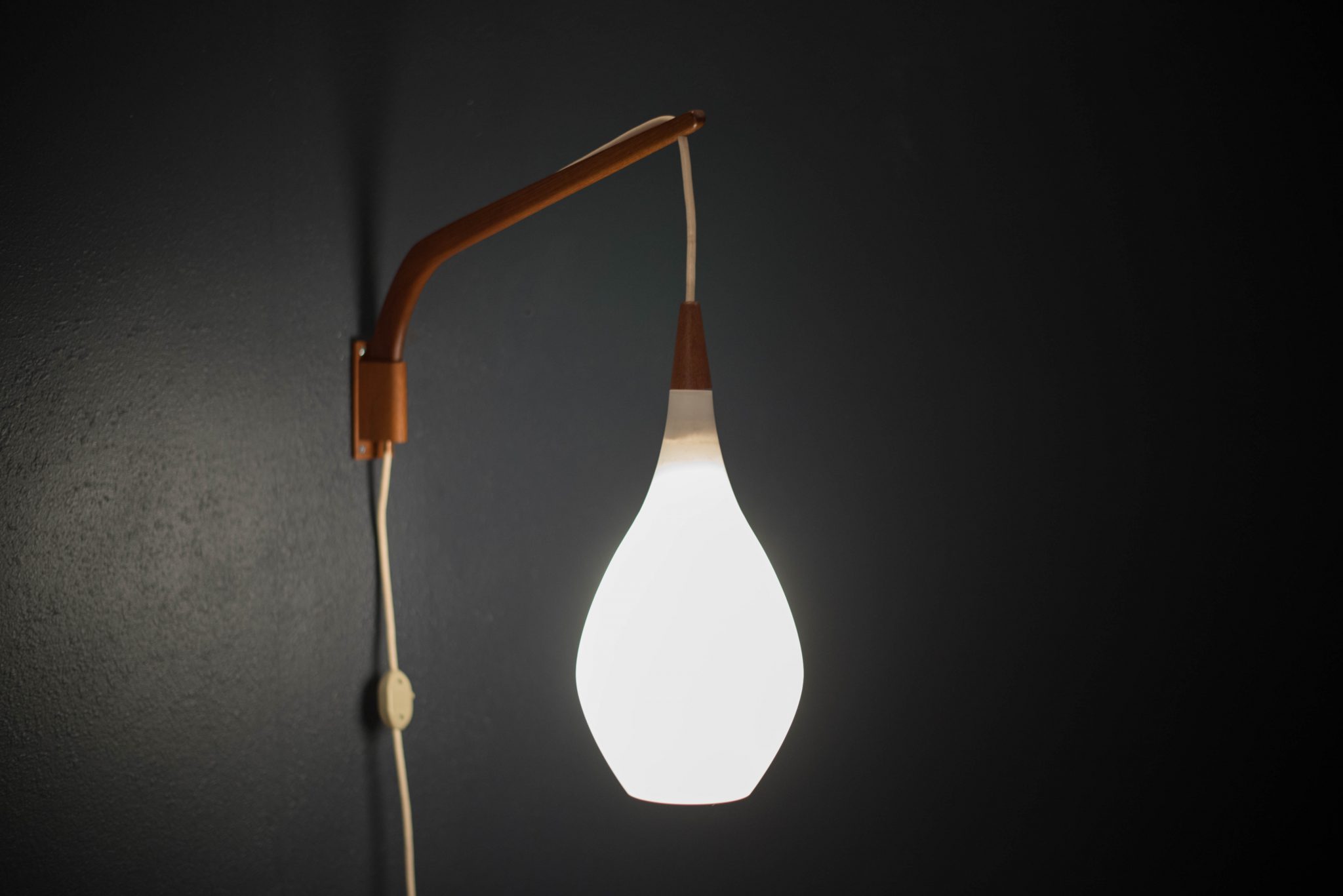 Mid-Century Modern hanging wall light by Holmegaard in teak. This piece displays a white frosted glass shade and includes a teak swing arm with adjustable cord.