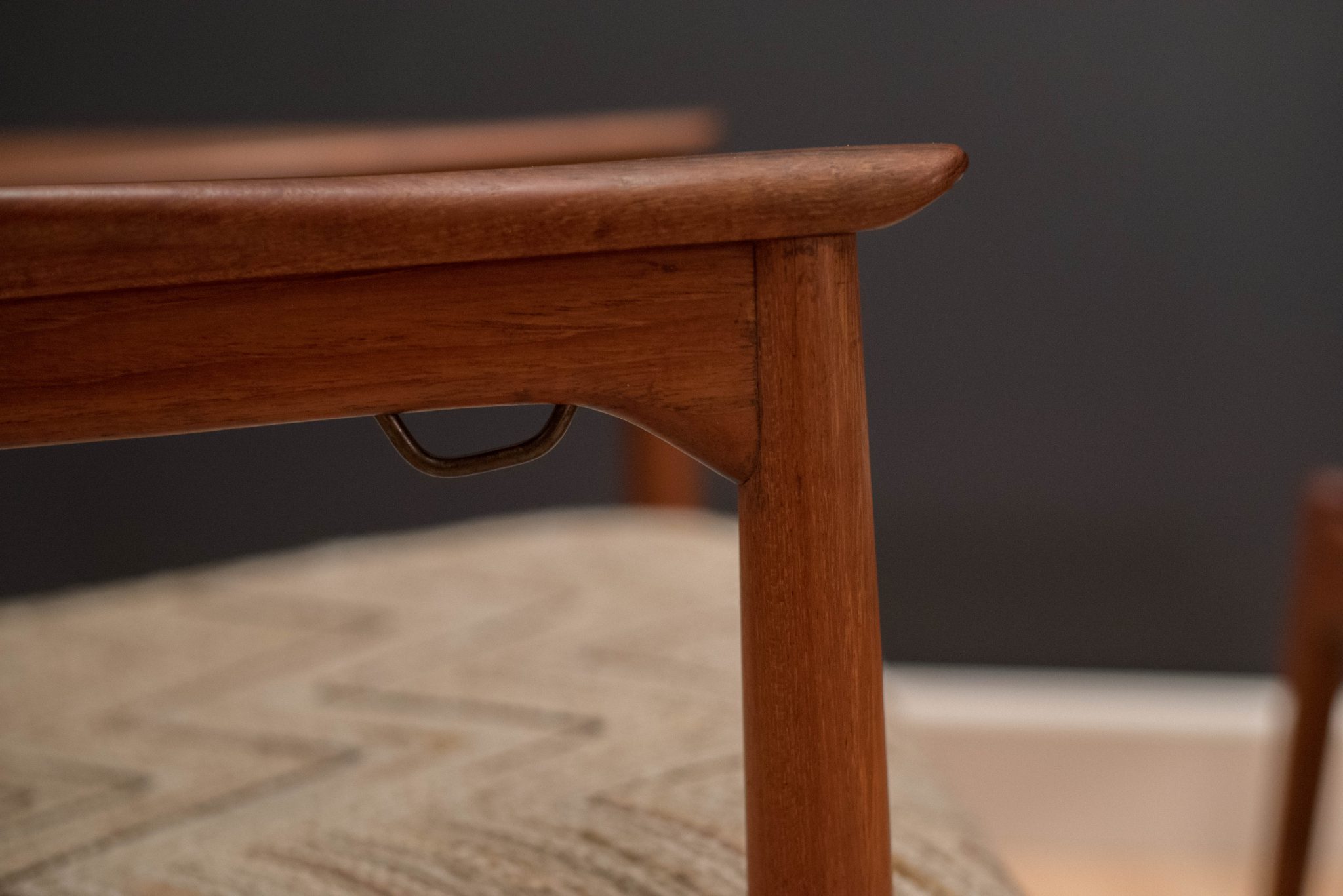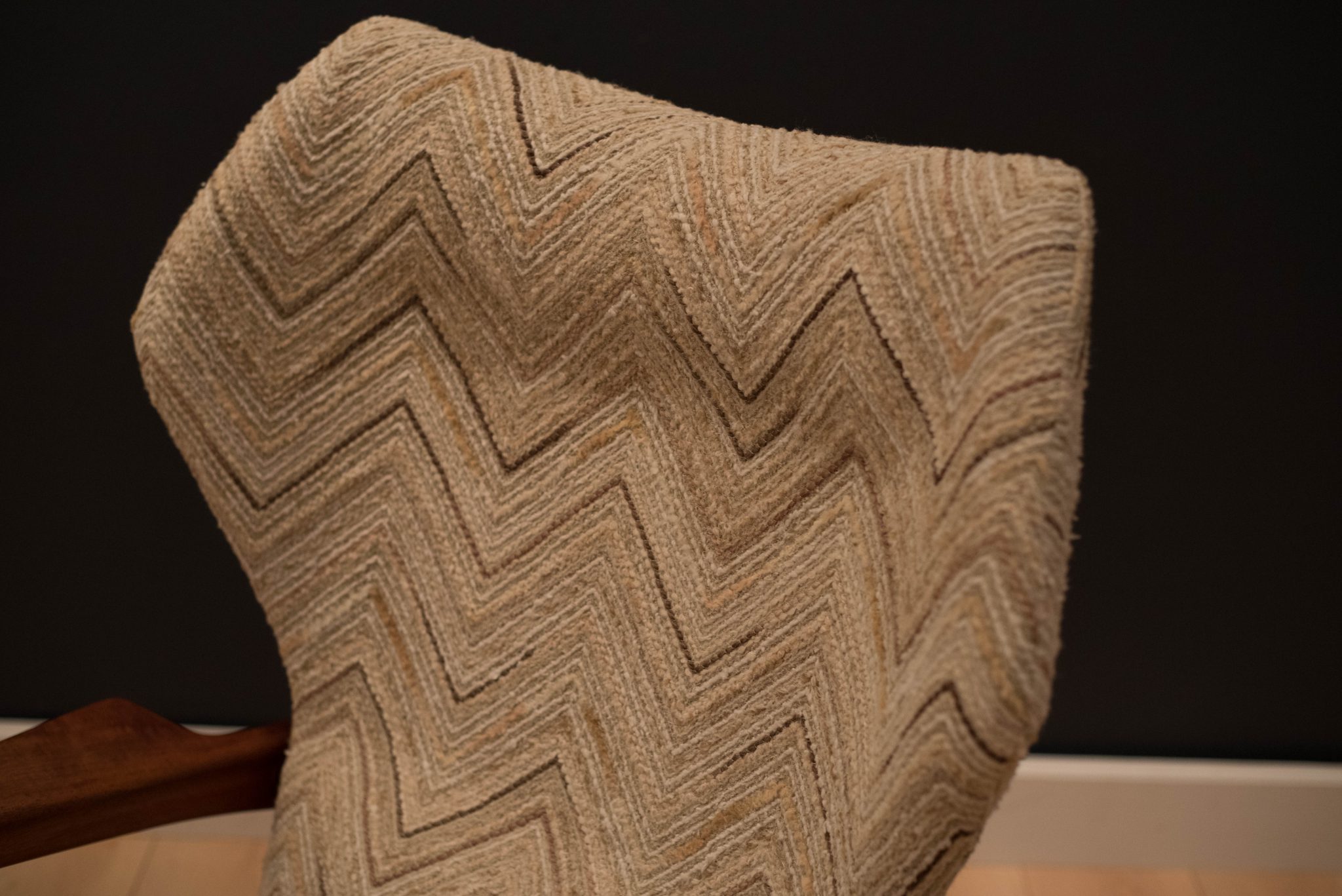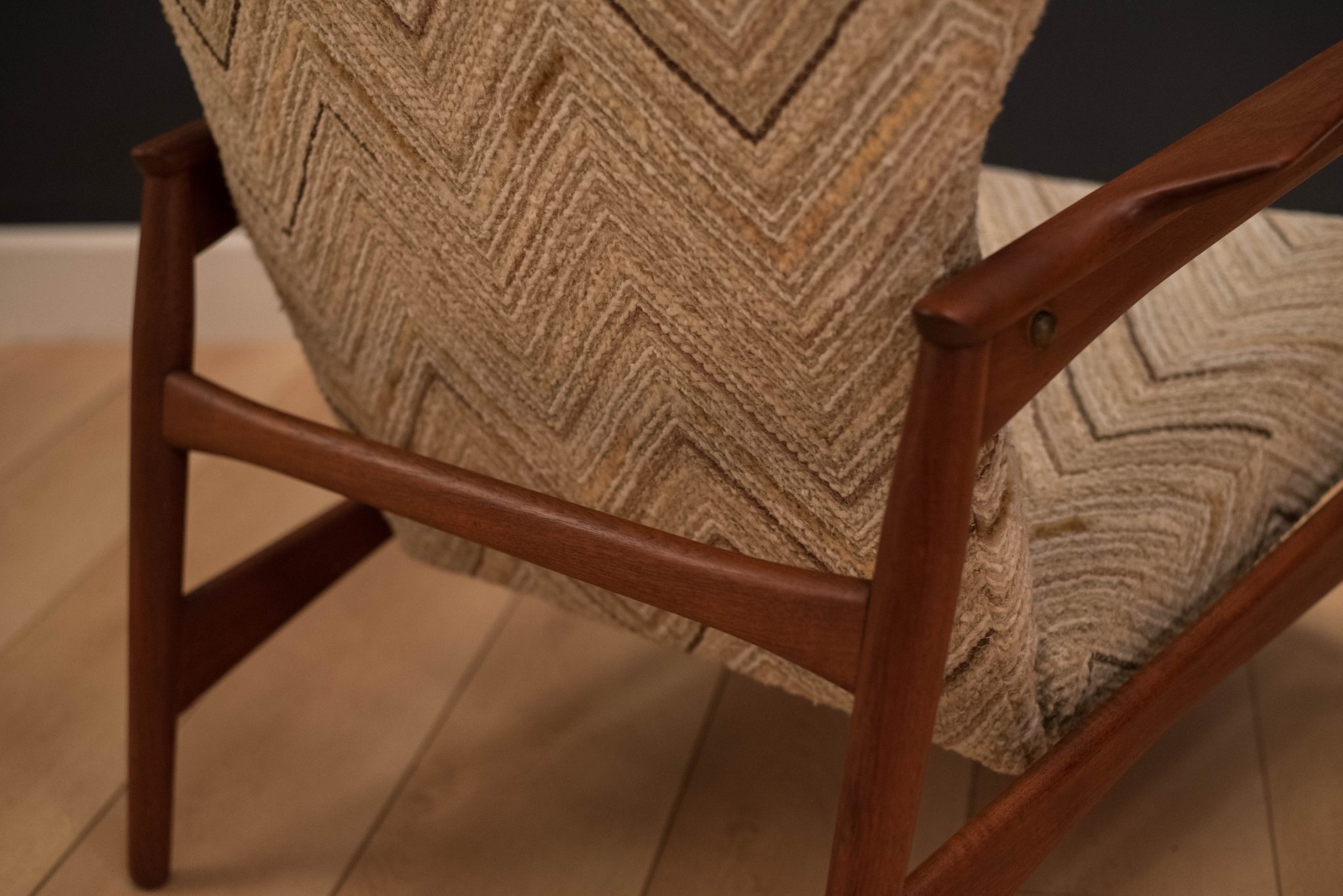Mid Century Lounge Chair by Ib Kofod-Larsen for Carlo Garhn in teak. This piece features a sculpted teak base and a unique curved head rest. Lounge chair reclines by tilting back. Fabric is original to the piece and is in good condition with minimal vintage wear.