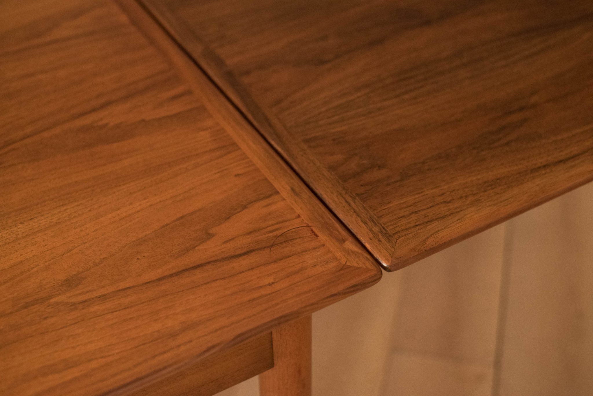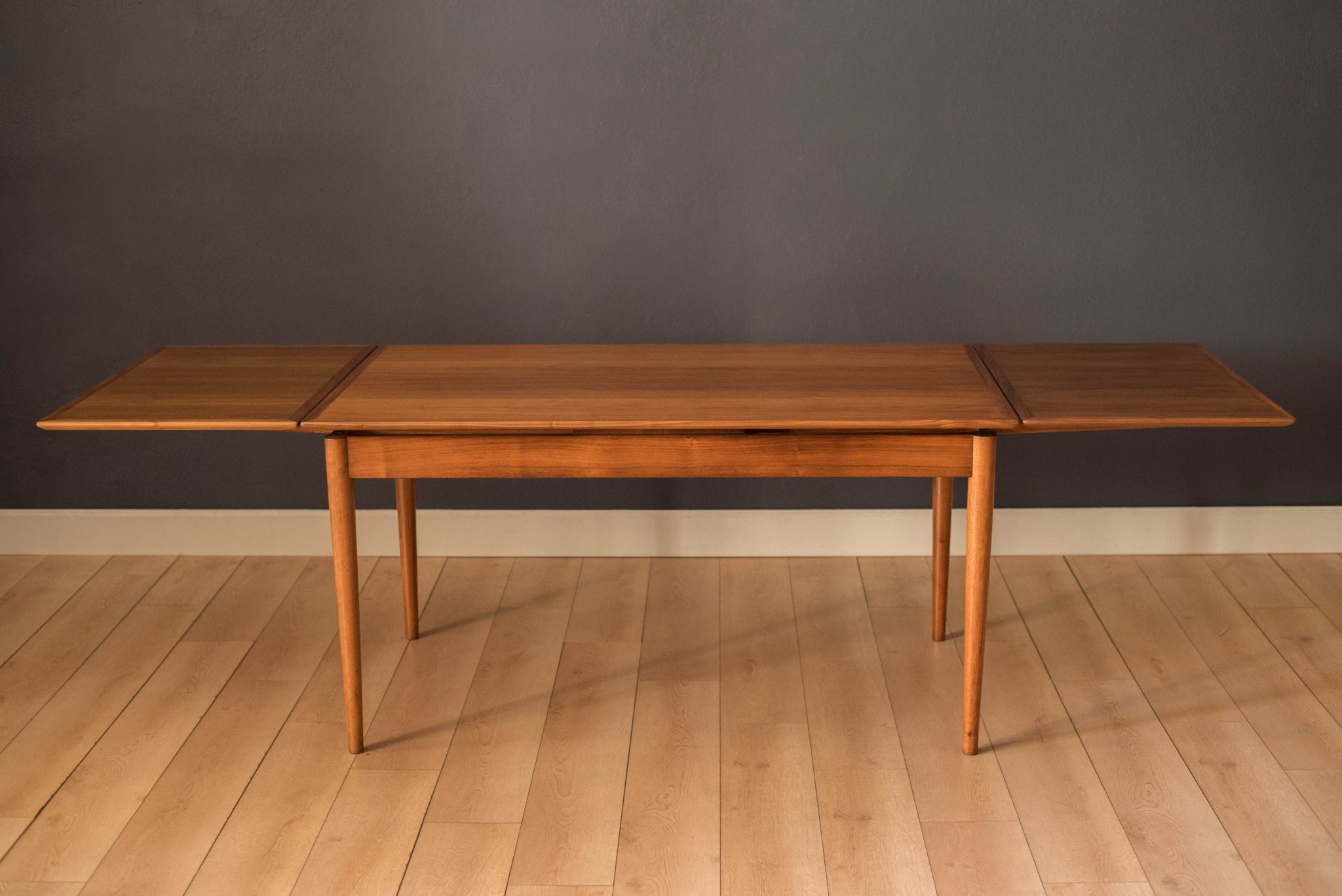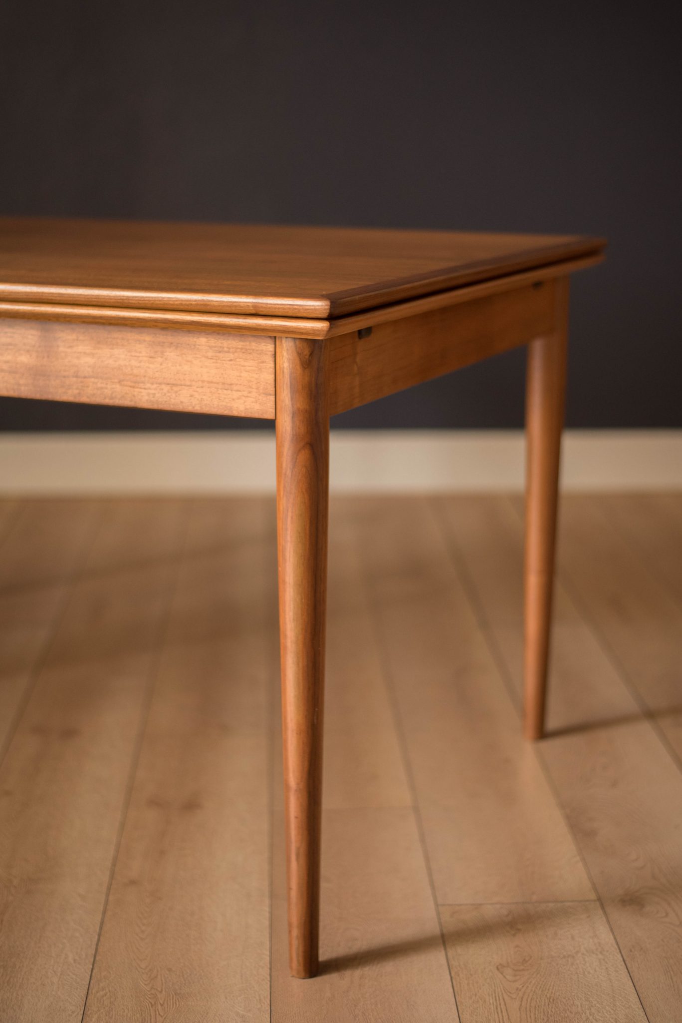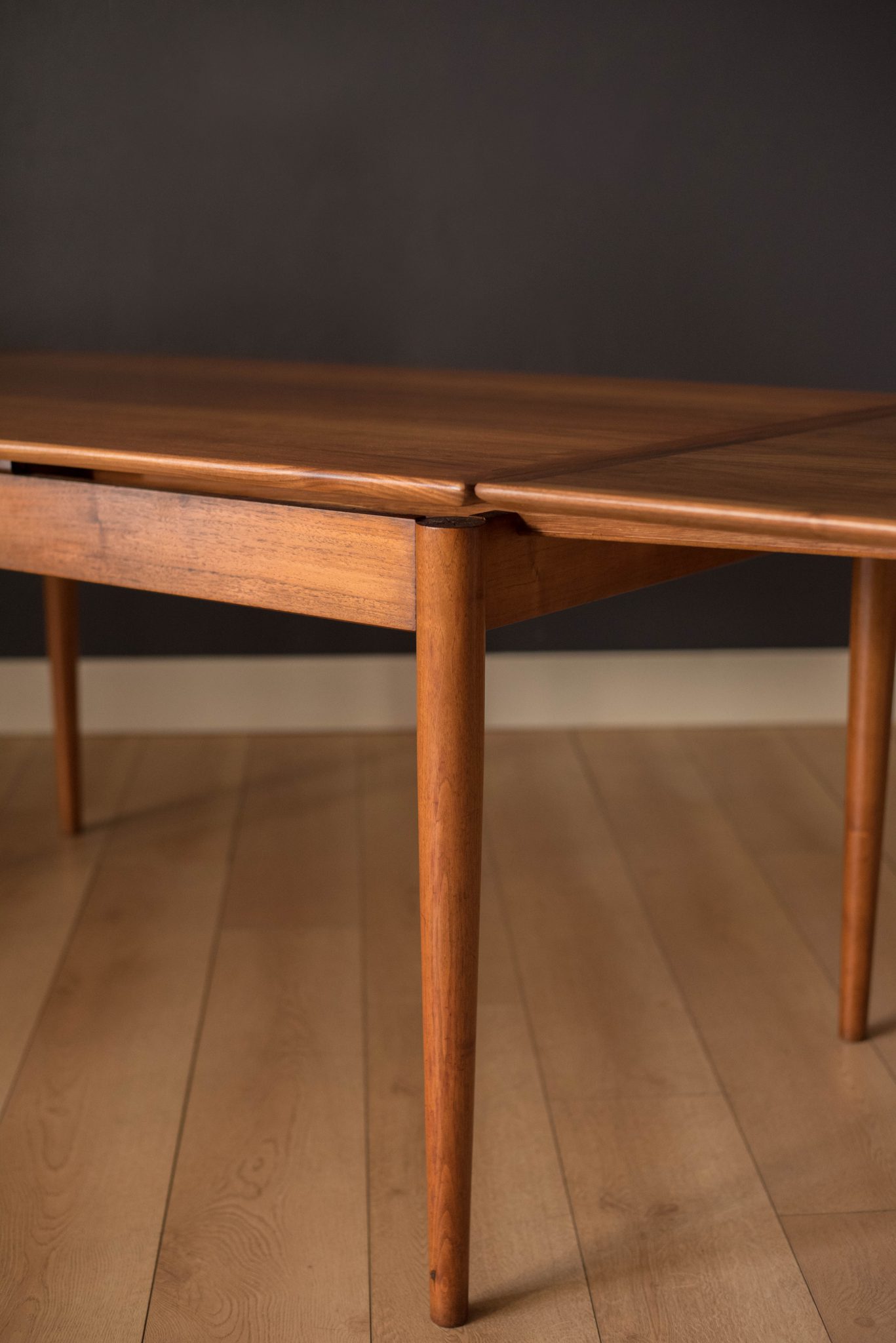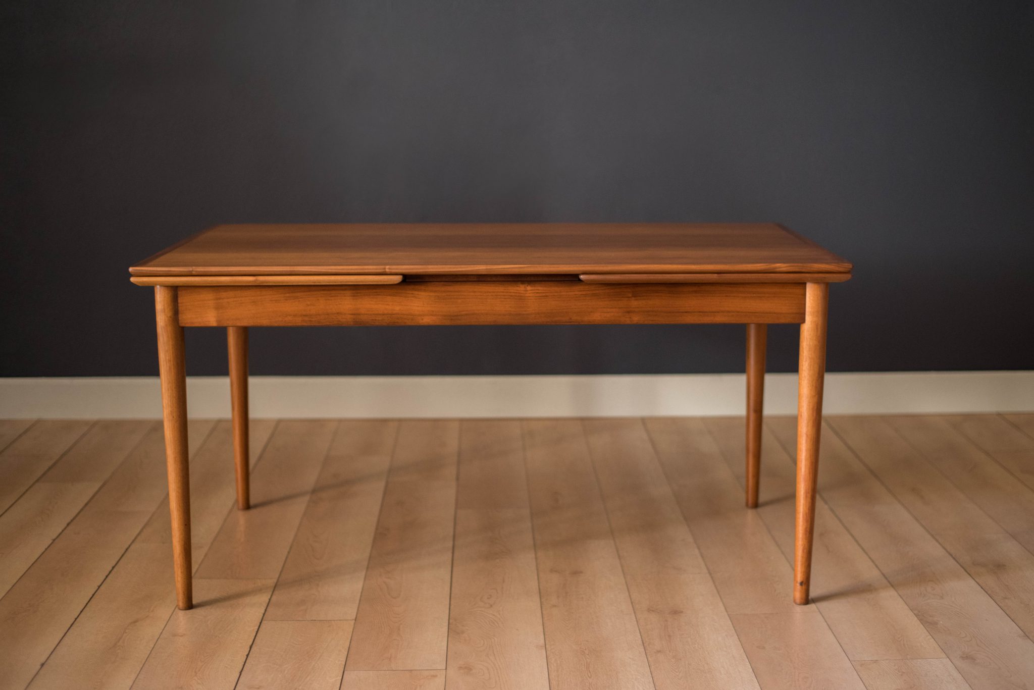 Mid-century modern expandable dining table by Hornslet Mobelfabrik in walnut circa 1960’s. This simple and classic piece seats six comfortably extending with two leaves that self store underneath the tabletop.