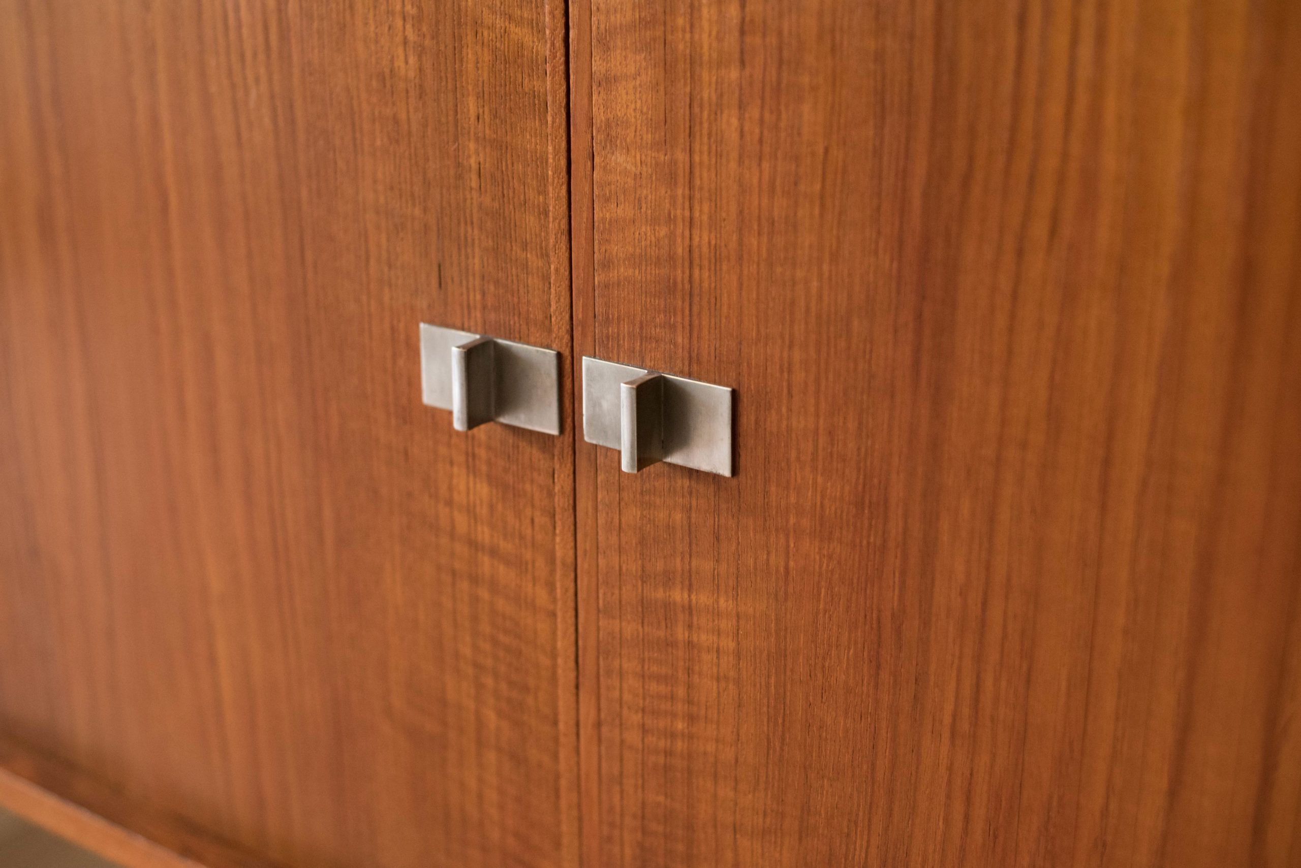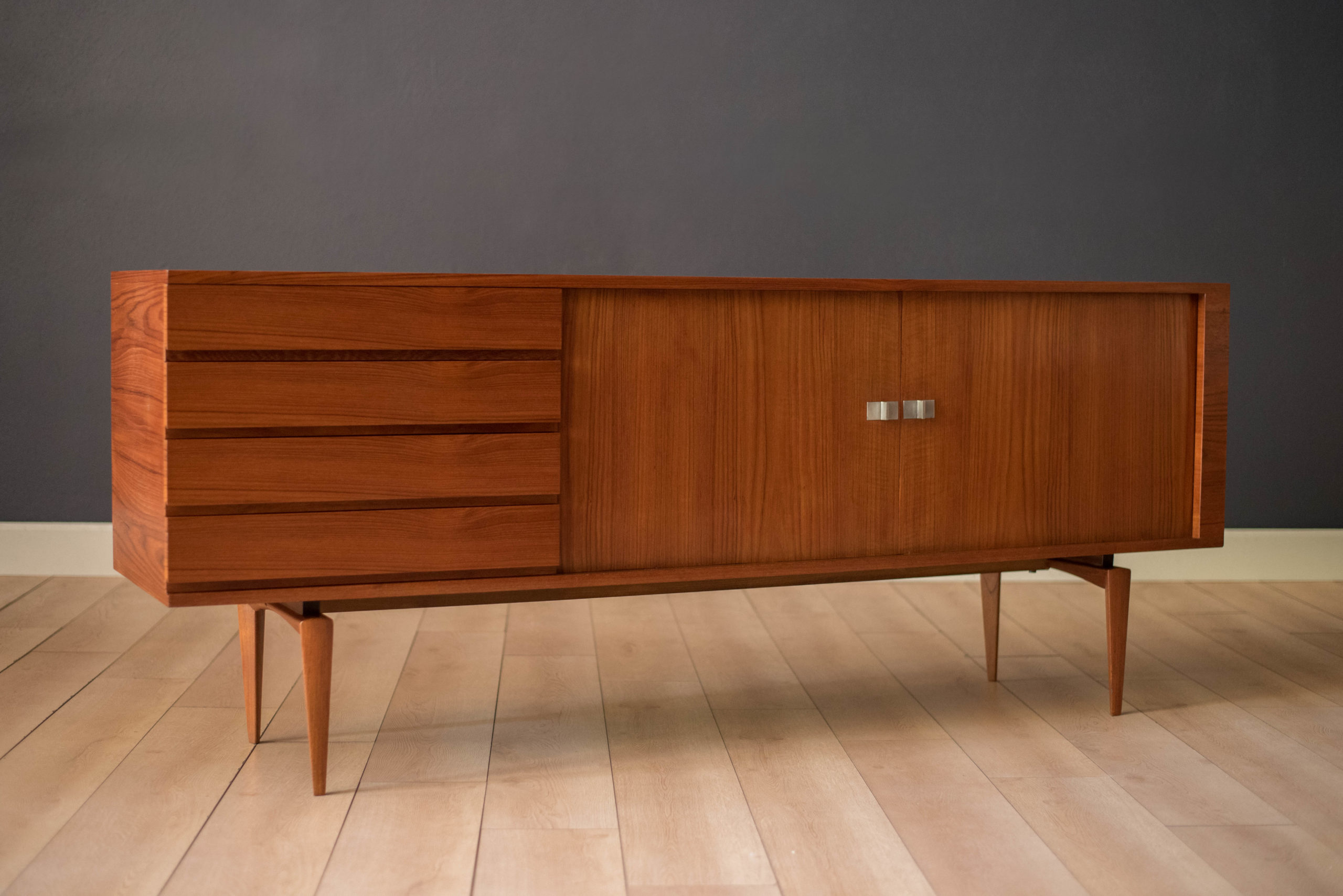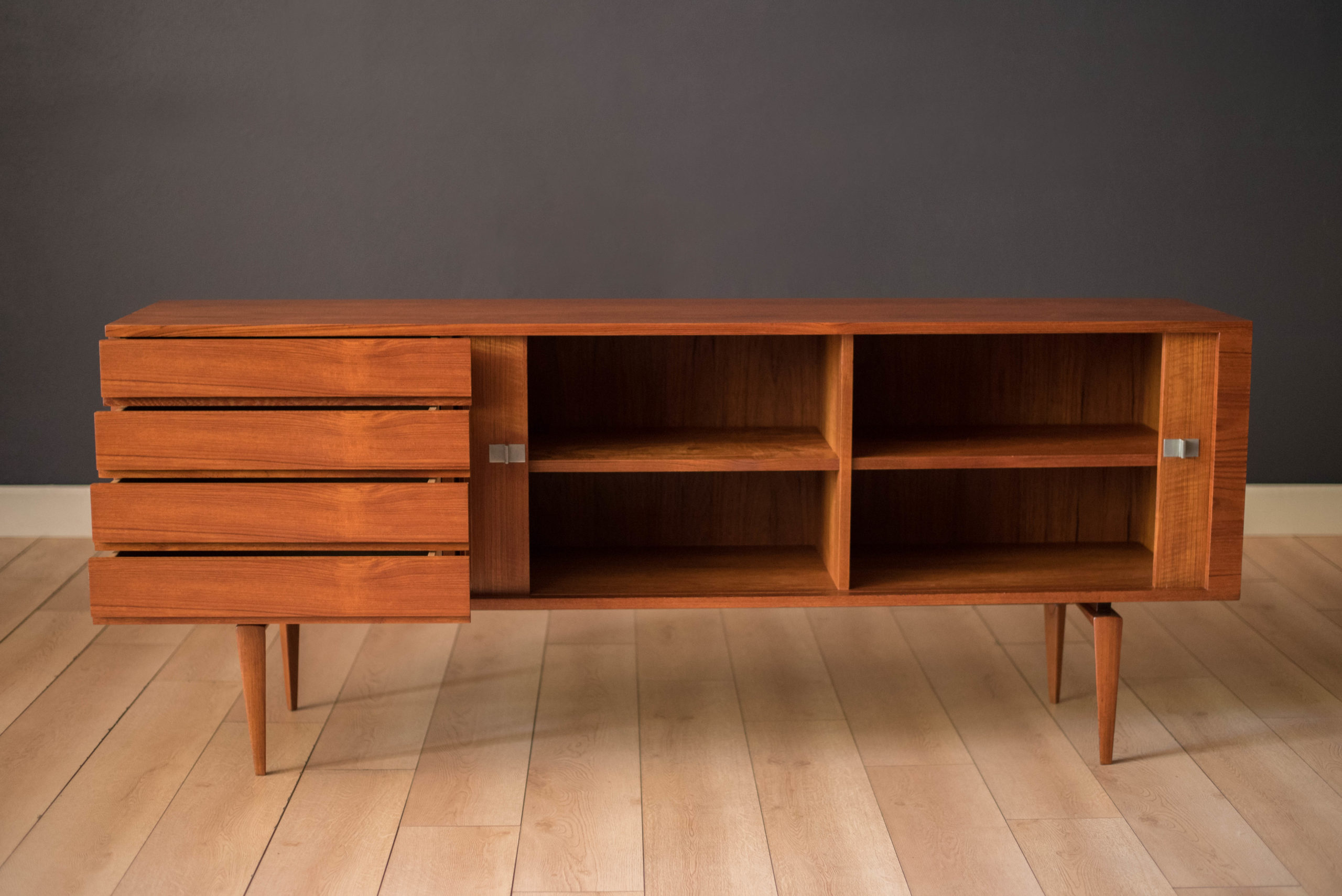 Mid-Century Modern sideboard credenza designed by H.W. Klein for Bramin, Denmark circa 1960’s. Features stunning sculpted legs and sliding tambour doors accented with polished aluminum handles. Equipped with four seamless drawers and two adjustable interior shelves.