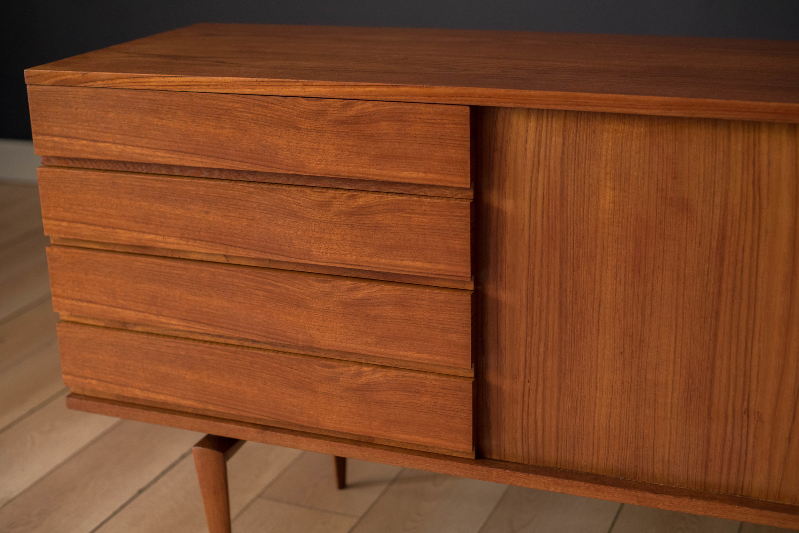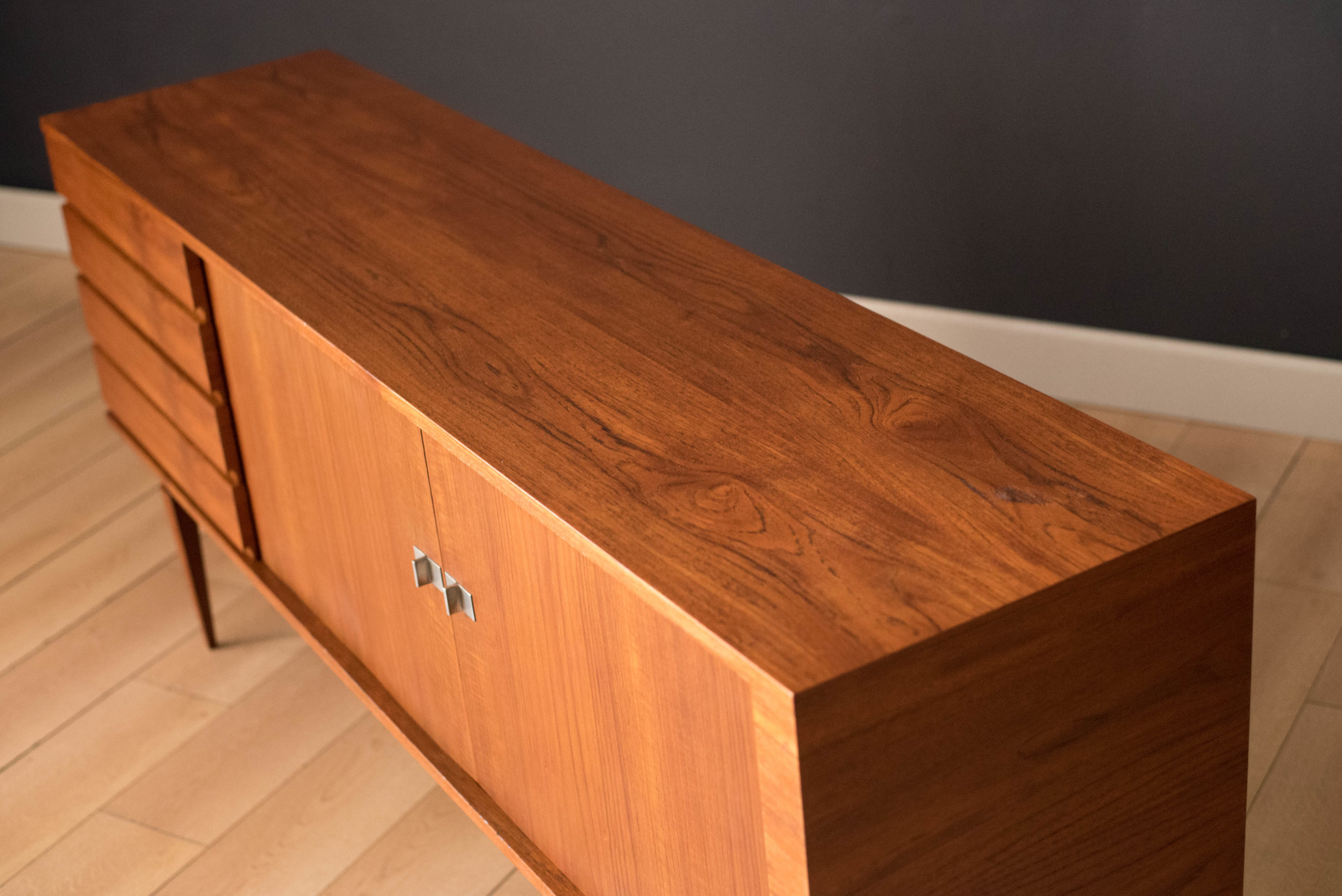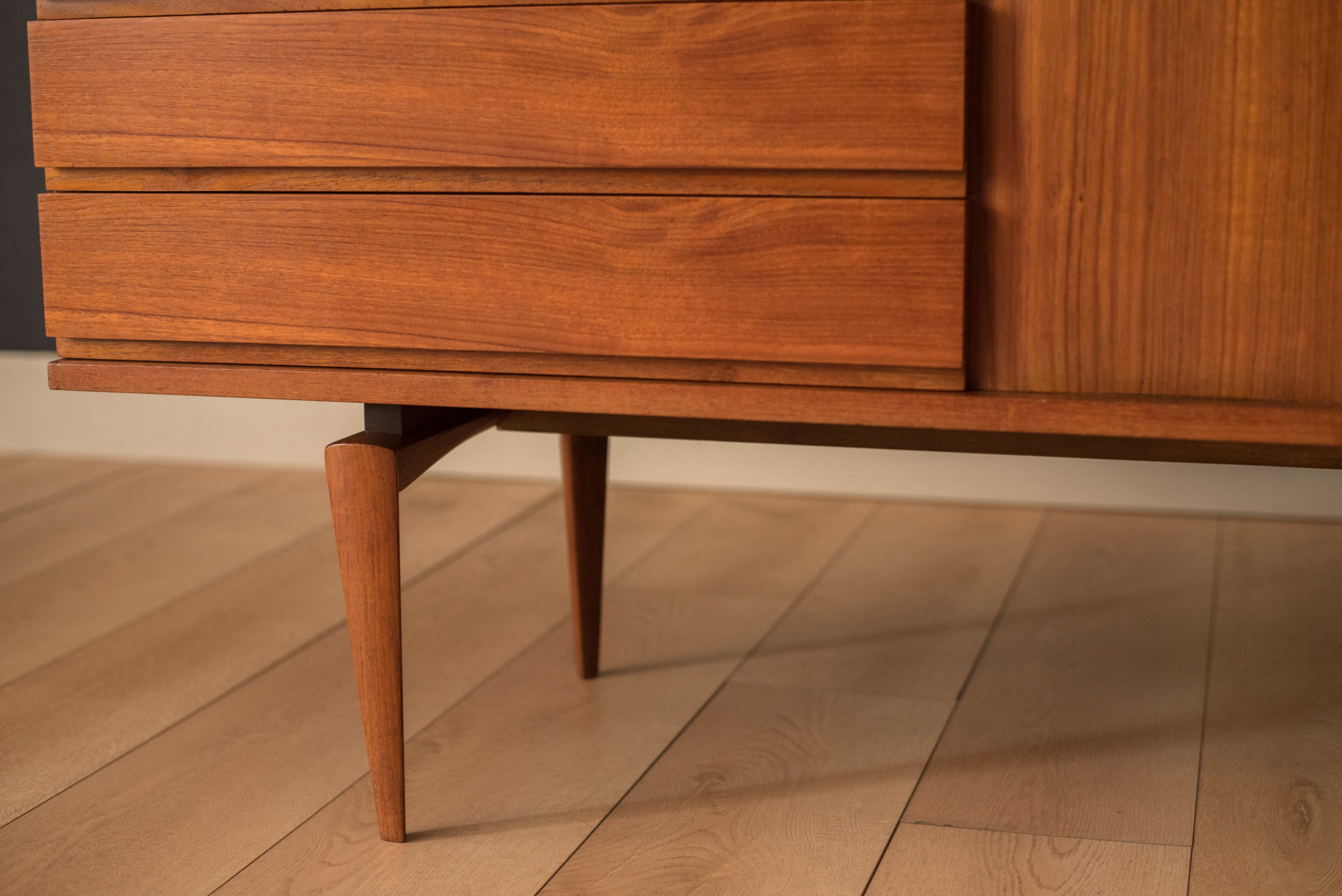 Mid-Century Modern sideboard credenza designed by H.W. Klein for Bramin, Denmark circa 1960’s. Features stunning sculpted legs and sliding tambour doors accented with polished aluminum handles. Equipped with four seamless drawers and two adjustable interior shelves.
