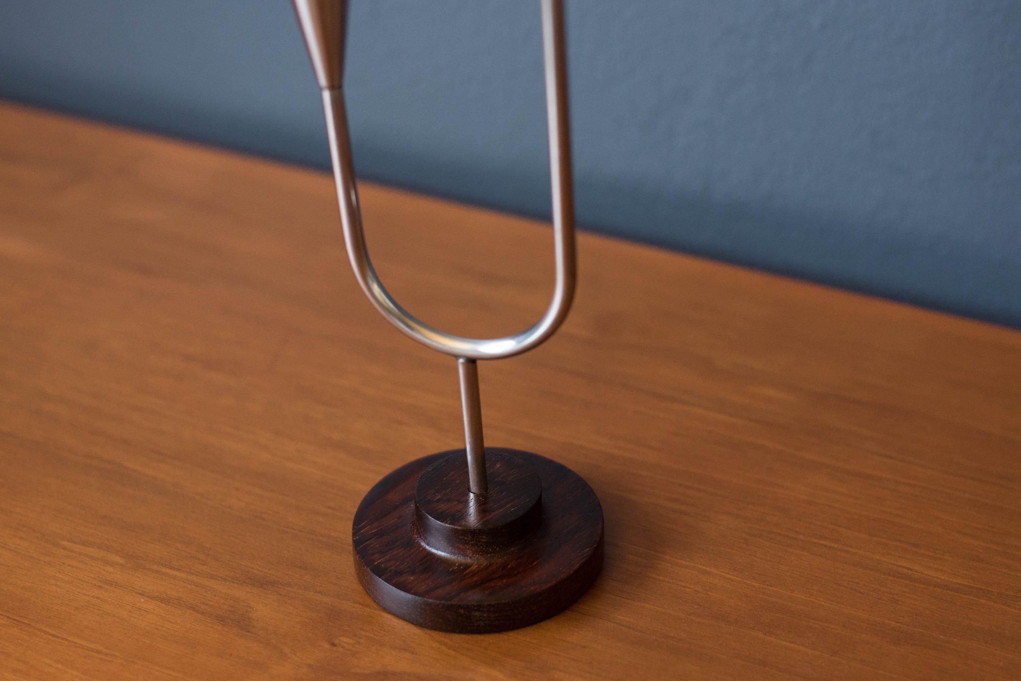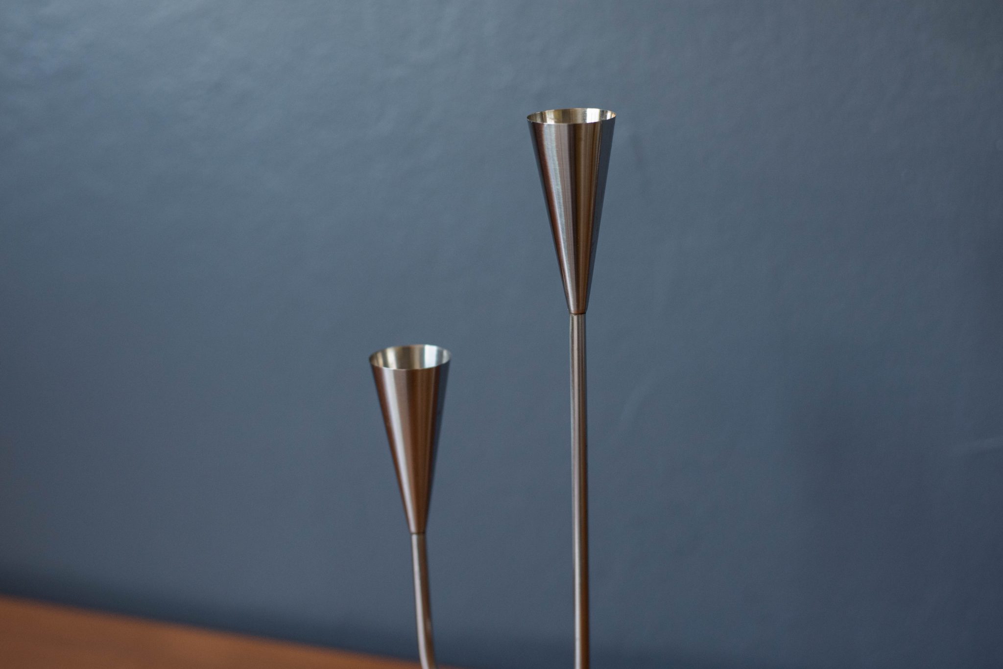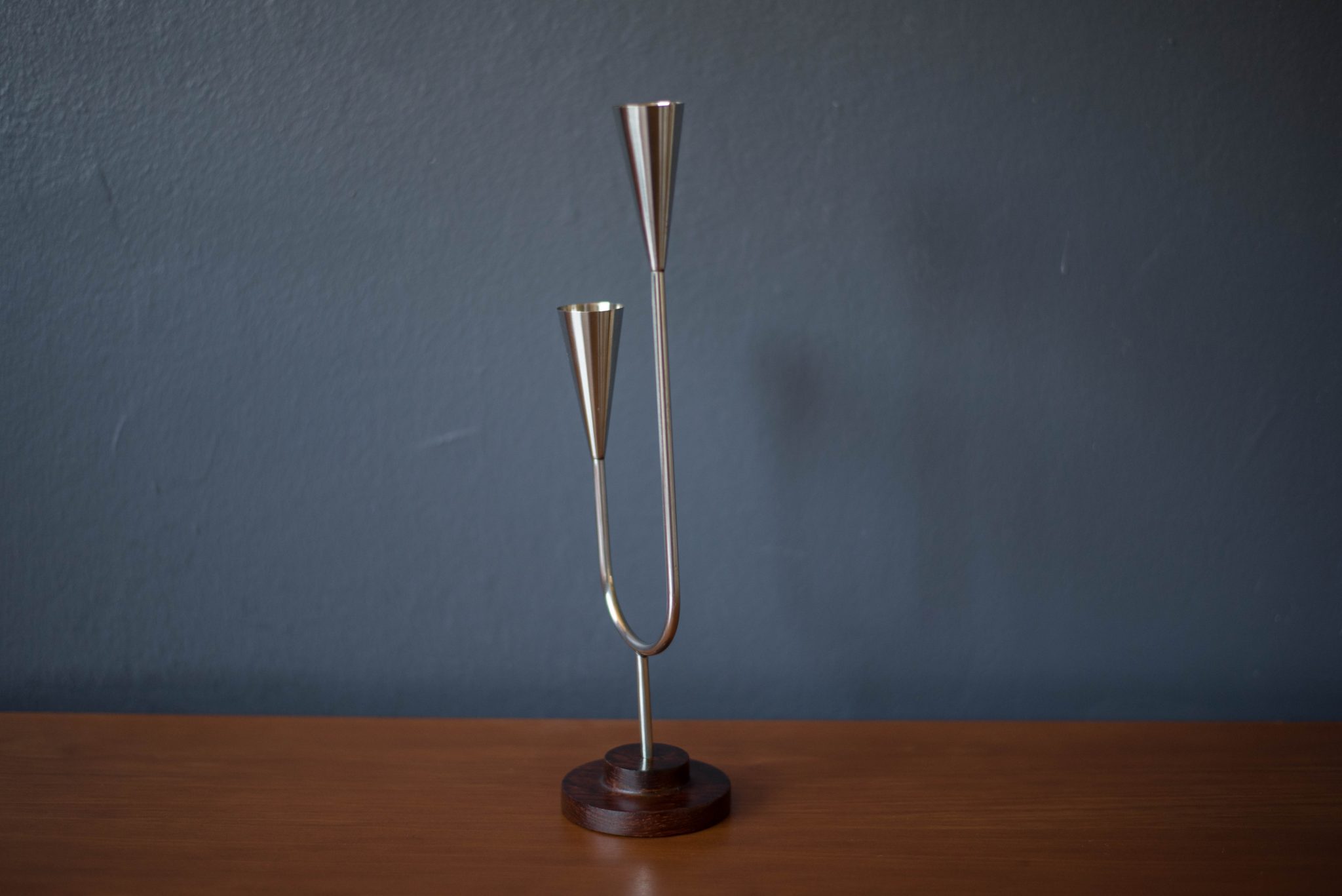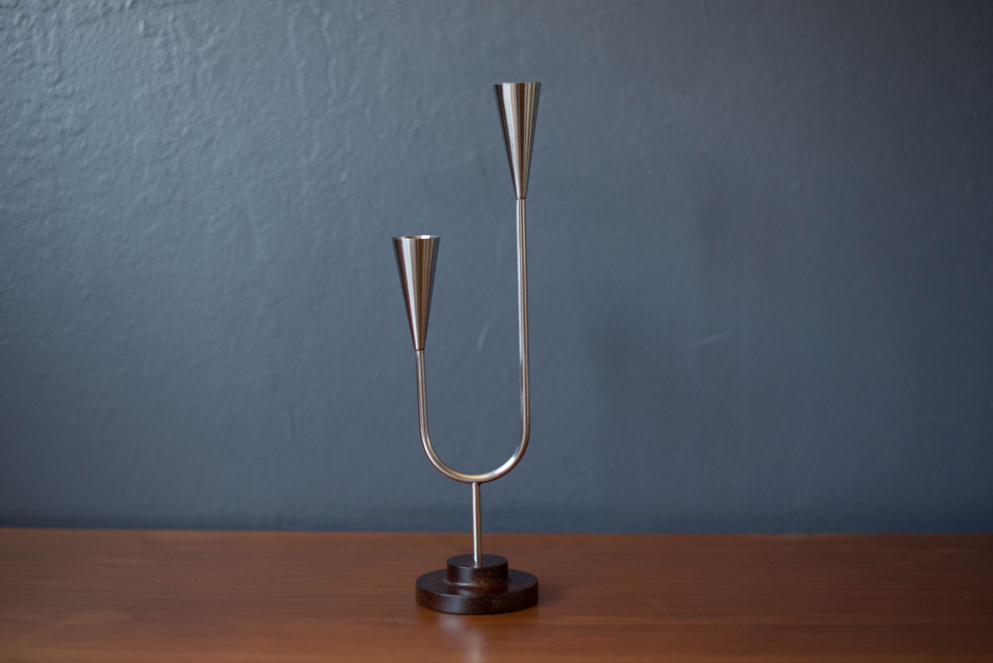 Mid-Century Modern candle holder manufactured by DFK Lundtofte, Denmark, c. 1960’s. Features a solid rosewood pedestal base and a polished stainless steel stem that fits two taper candles.