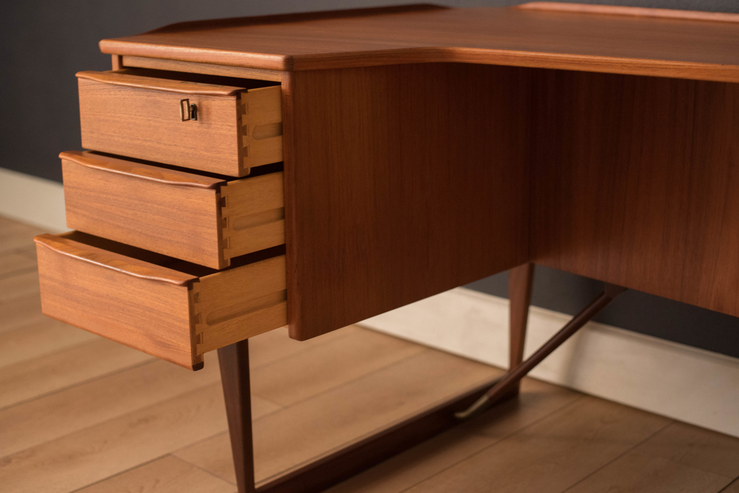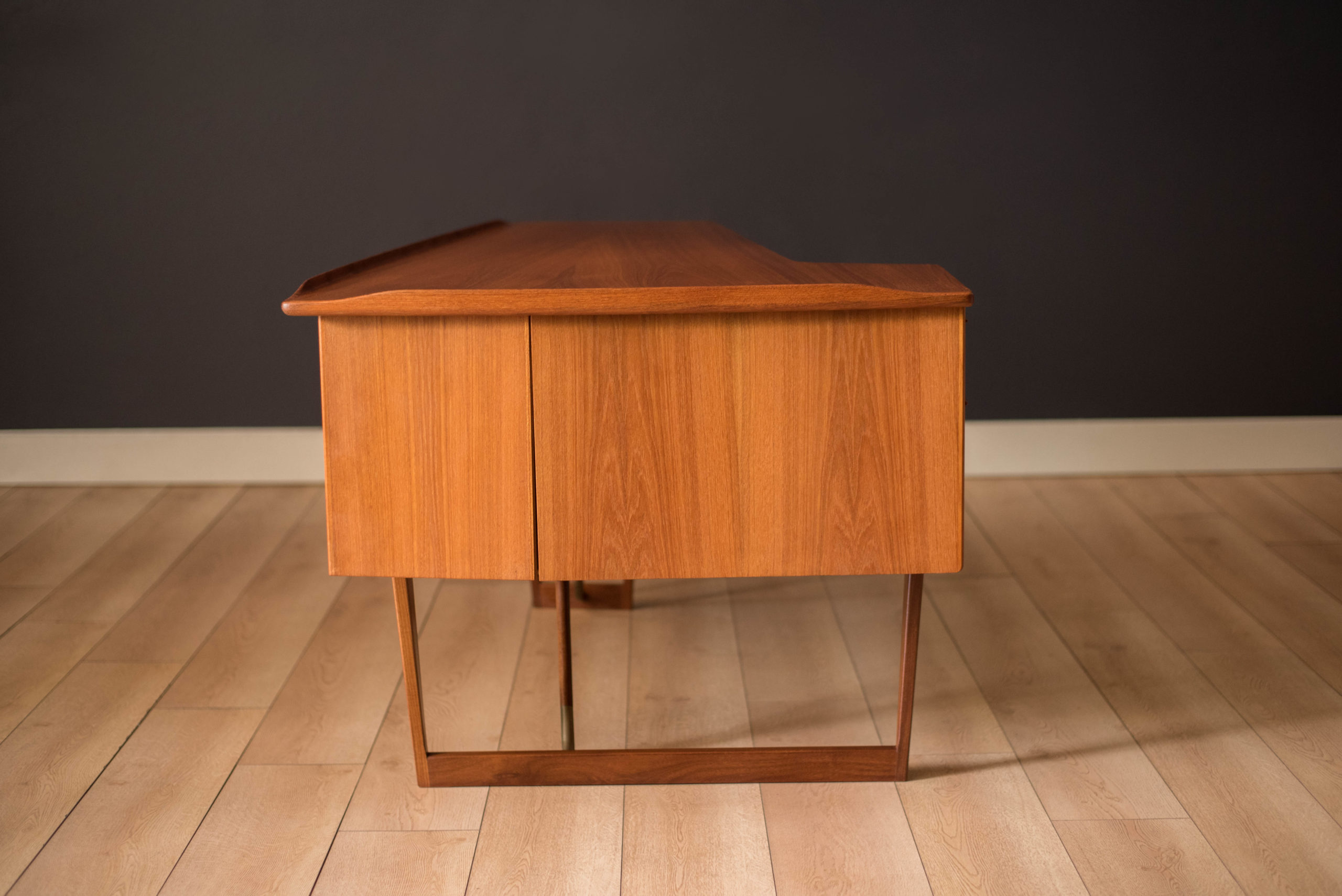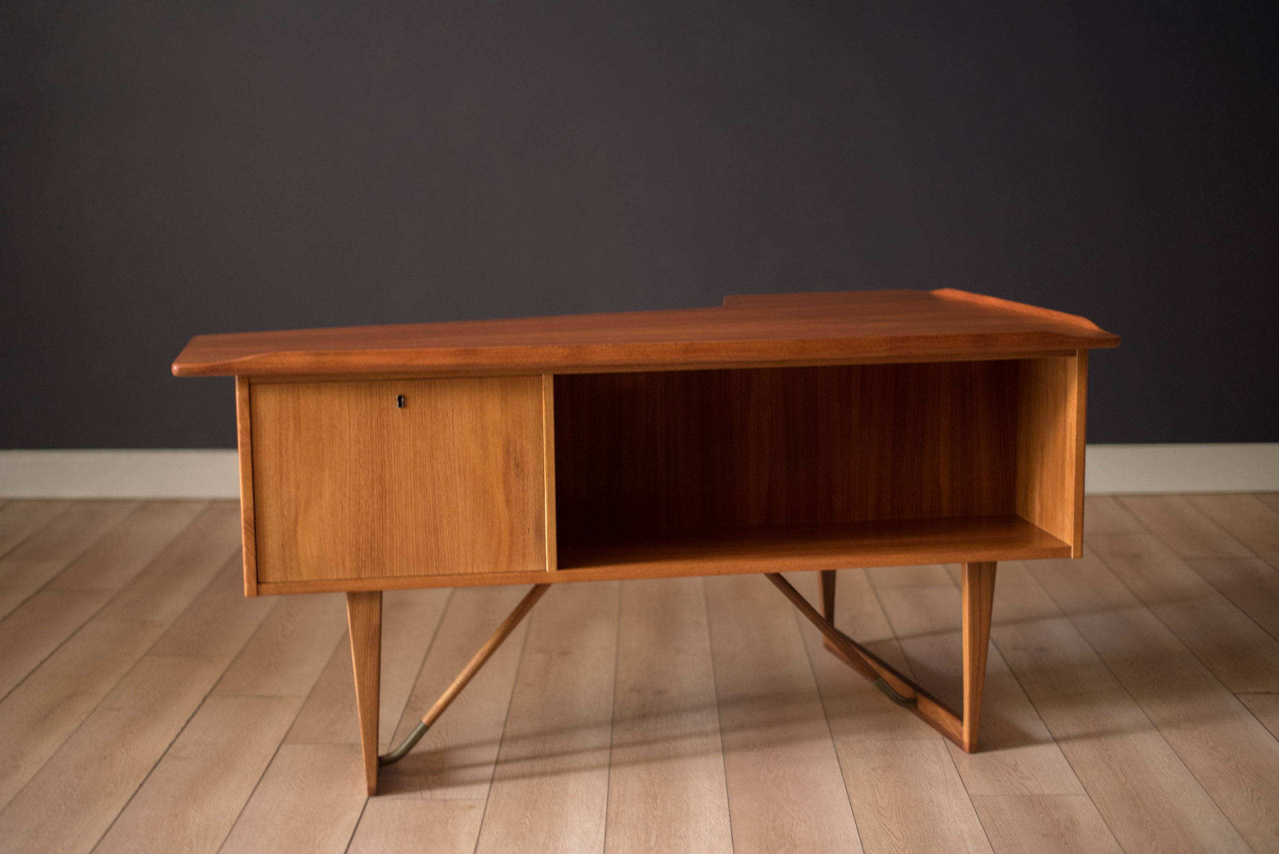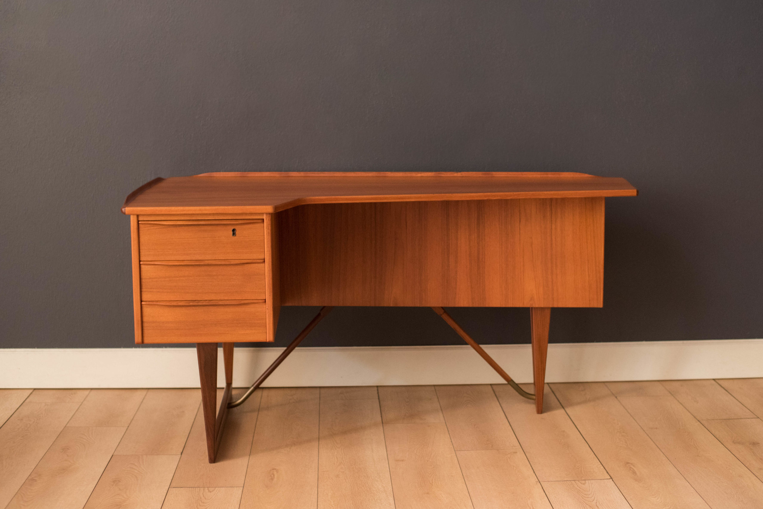 Mid-Century Modern writing desk in teak designed by Peter Lovig Nielsen for Dansk circa 1960’s. Features a unique boomerang shaped top with a raised lip edge and tapered legs with brass supports. This piece includes three dovetailed drawers accented with solid wood sculpted handles and one organizing slide out tray. The backside is finished and provides additional storage with a locking bar cabinet and bookshelf display making it easy to showcase from any angle. Original skeleton key is included.
