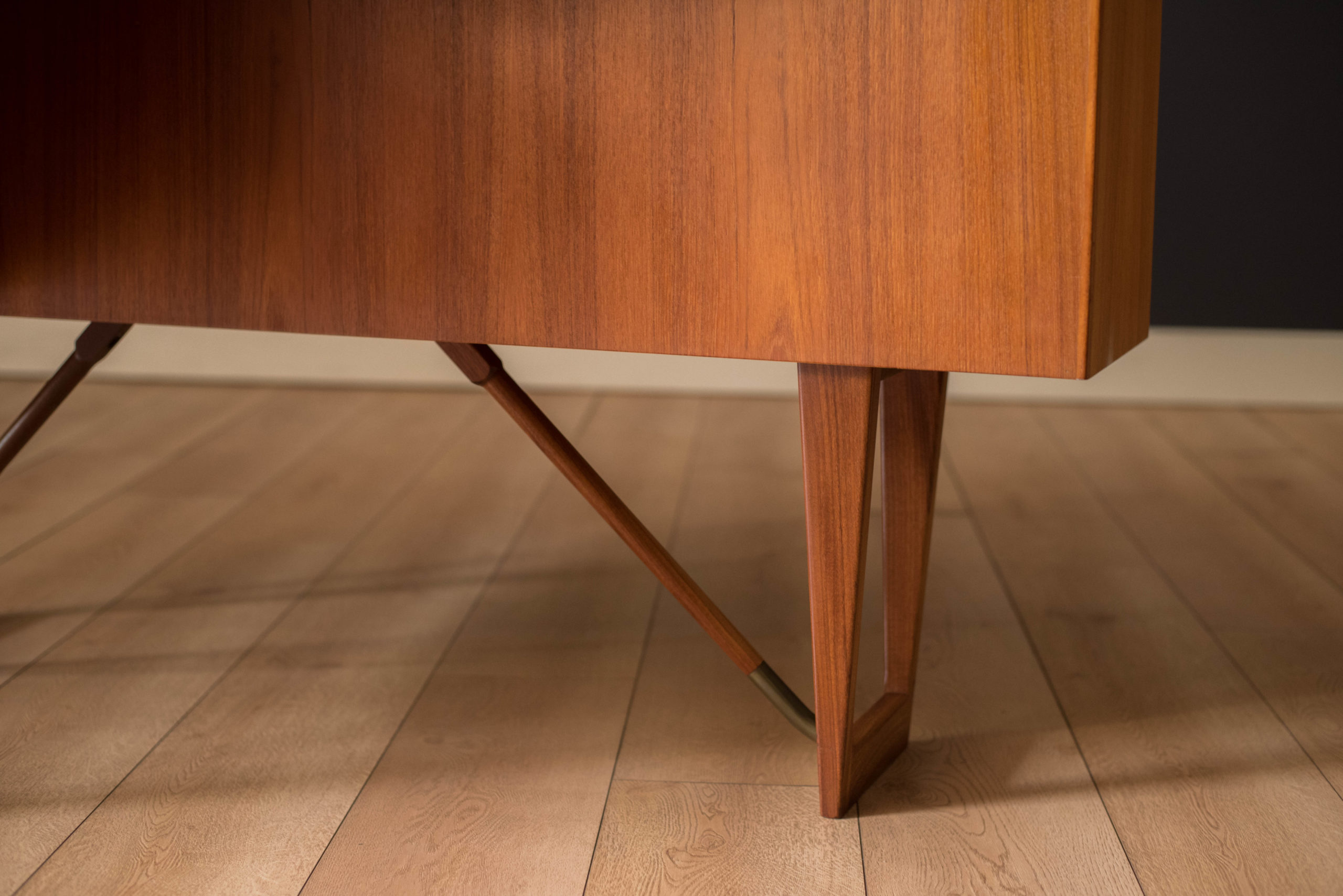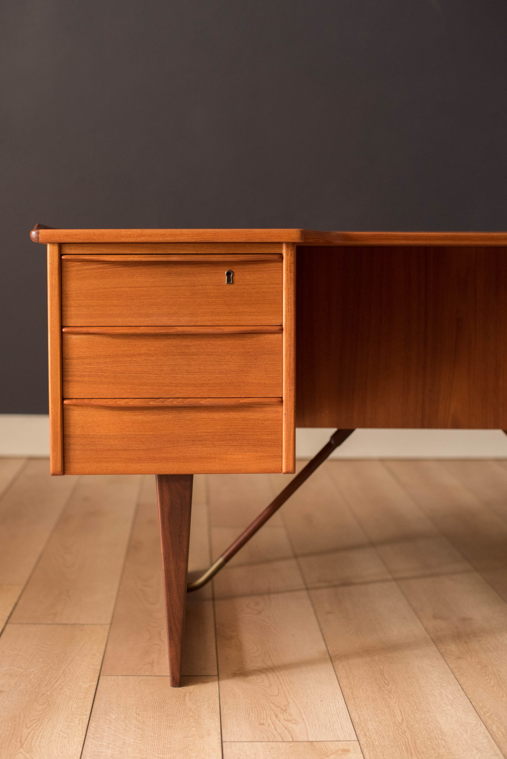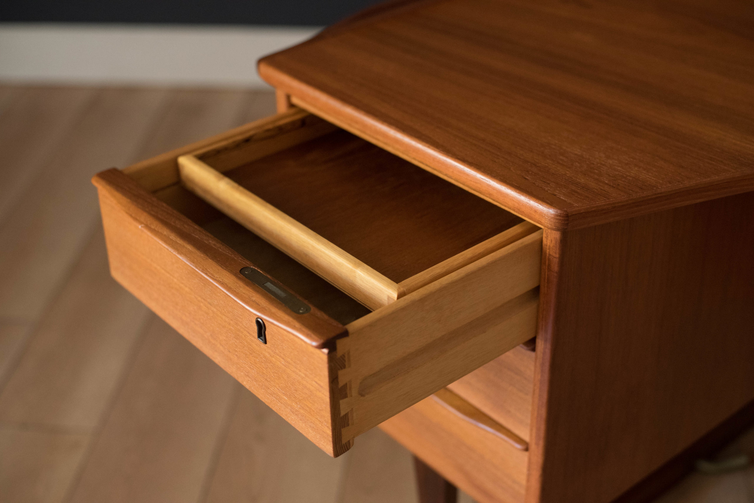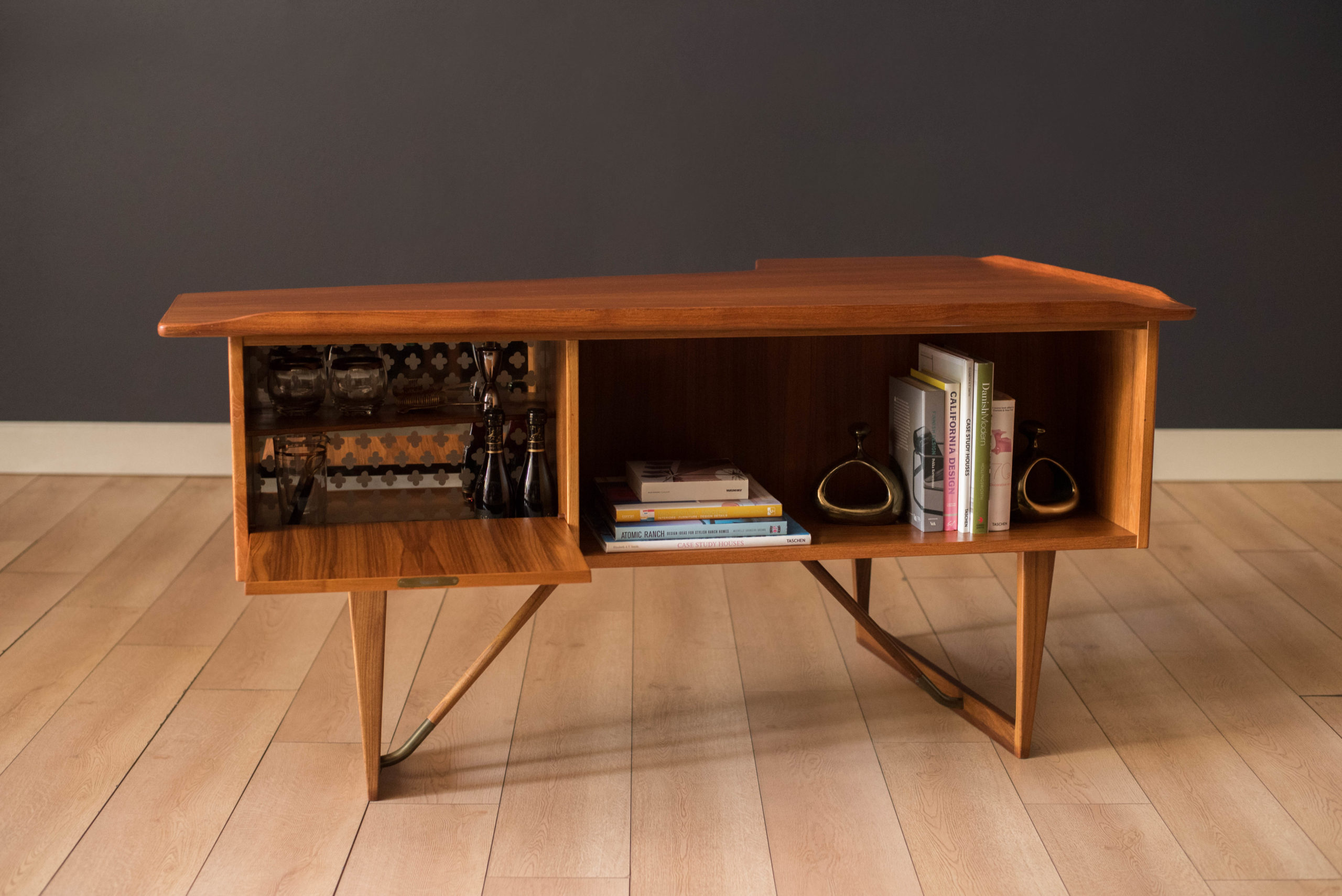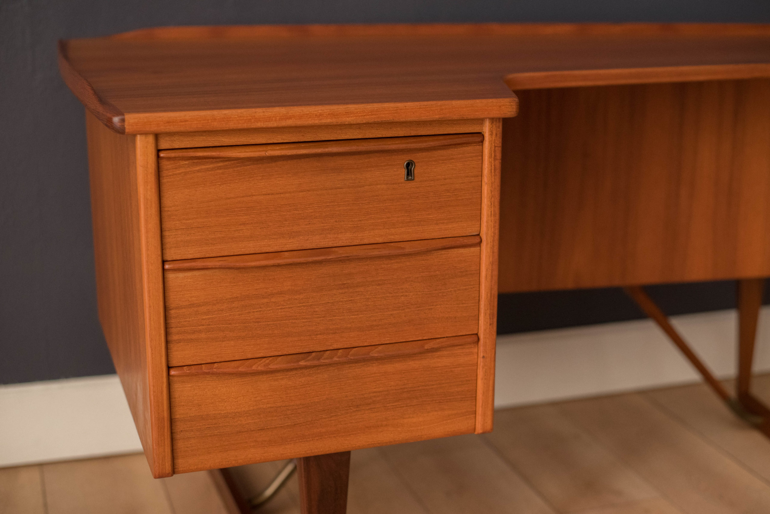 Mid-Century Modern writing desk in teak designed by Peter Lovig Nielsen for Dansk circa 1960’s. Features a unique boomerang shaped top with a raised lip edge and tapered legs with brass supports. This piece includes three dovetailed drawers accented with solid wood sculpted handles and one organizing slide out tray. The backside is finished and provides additional storage with a locking bar cabinet and bookshelf display making it easy to showcase from any angle. Original skeleton key is included.