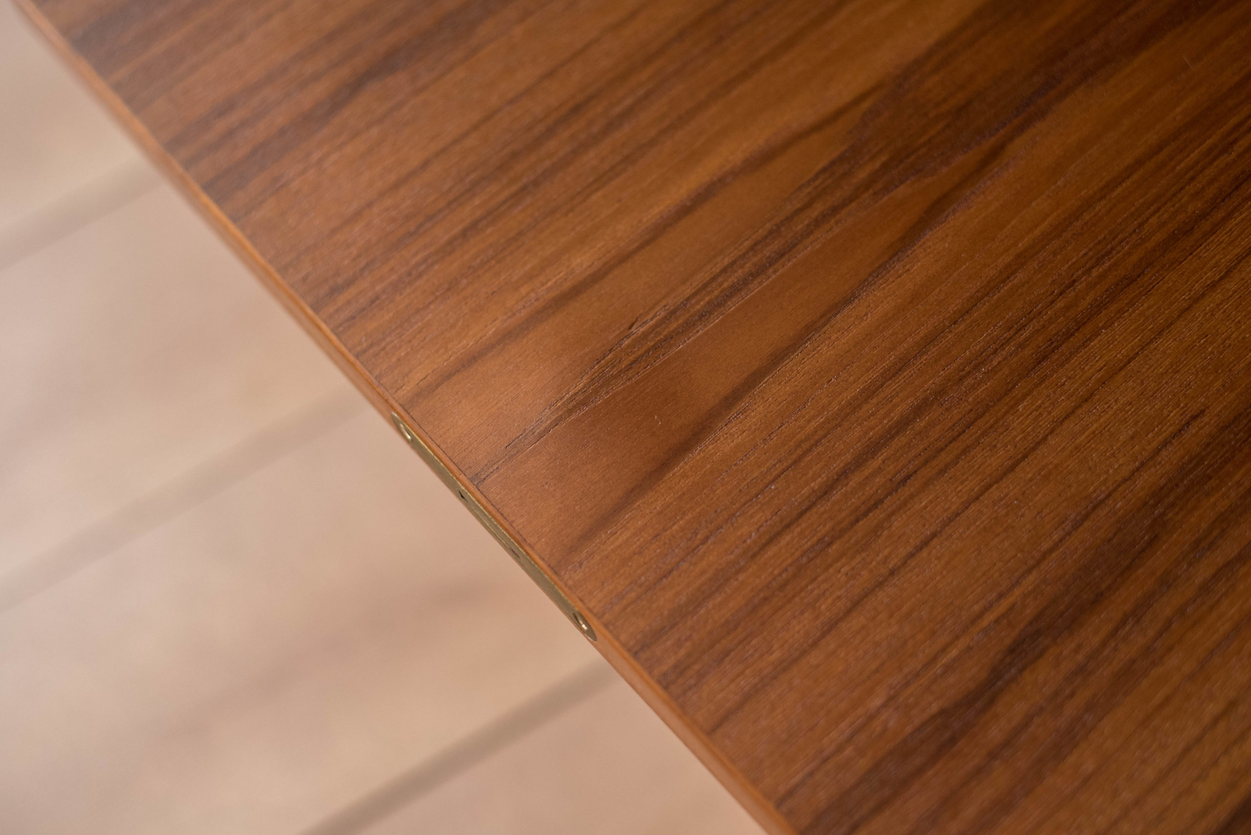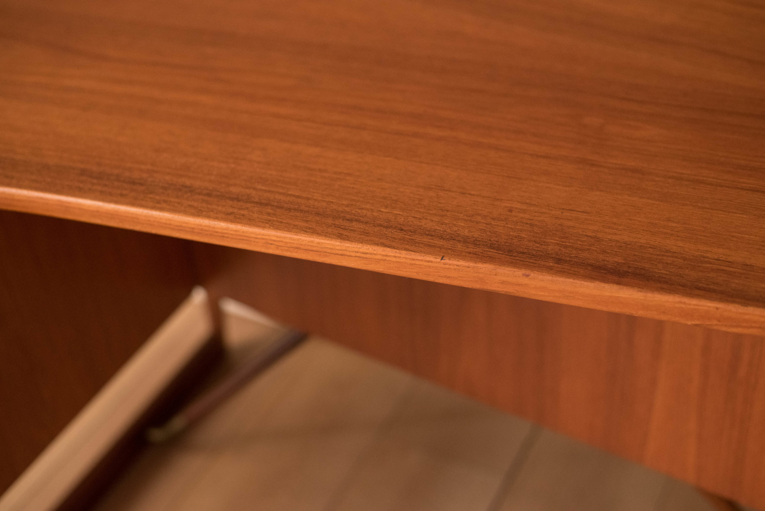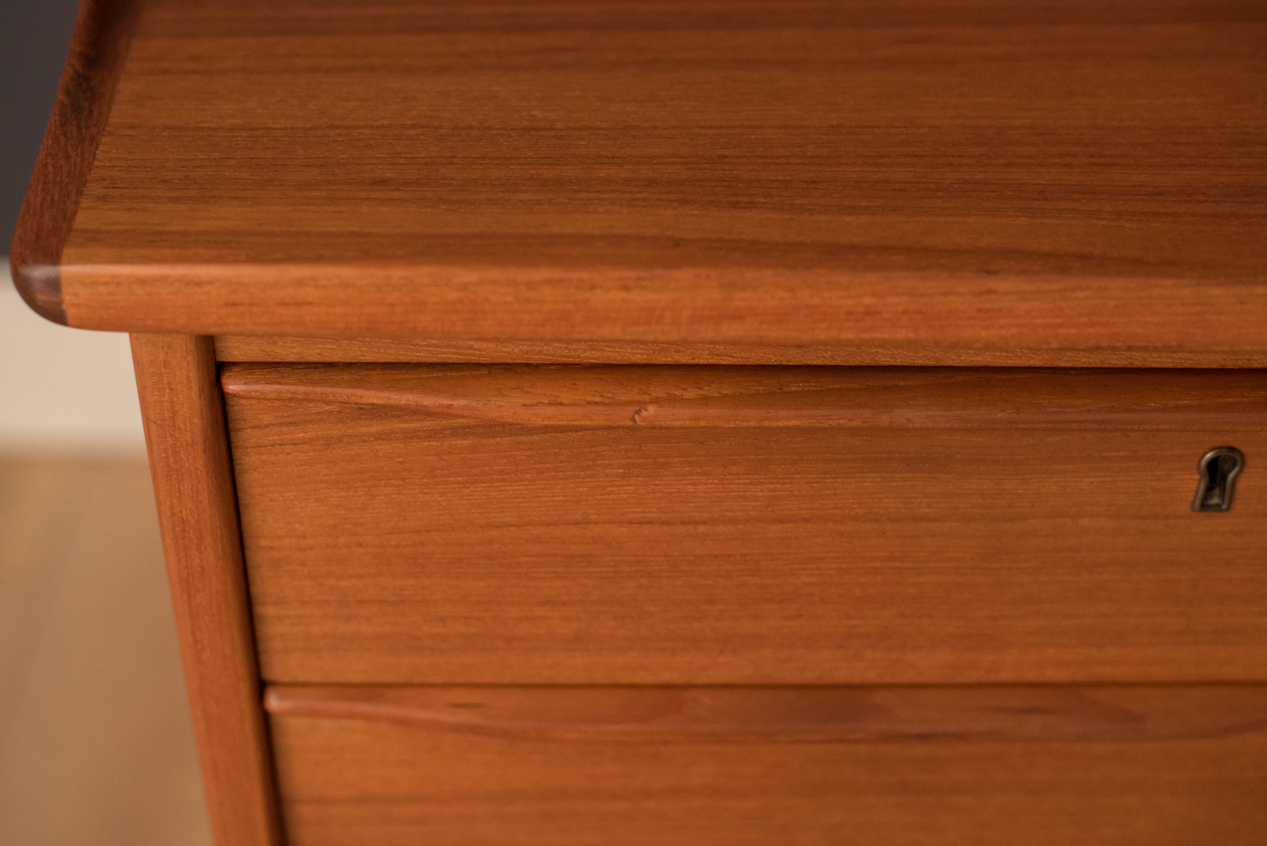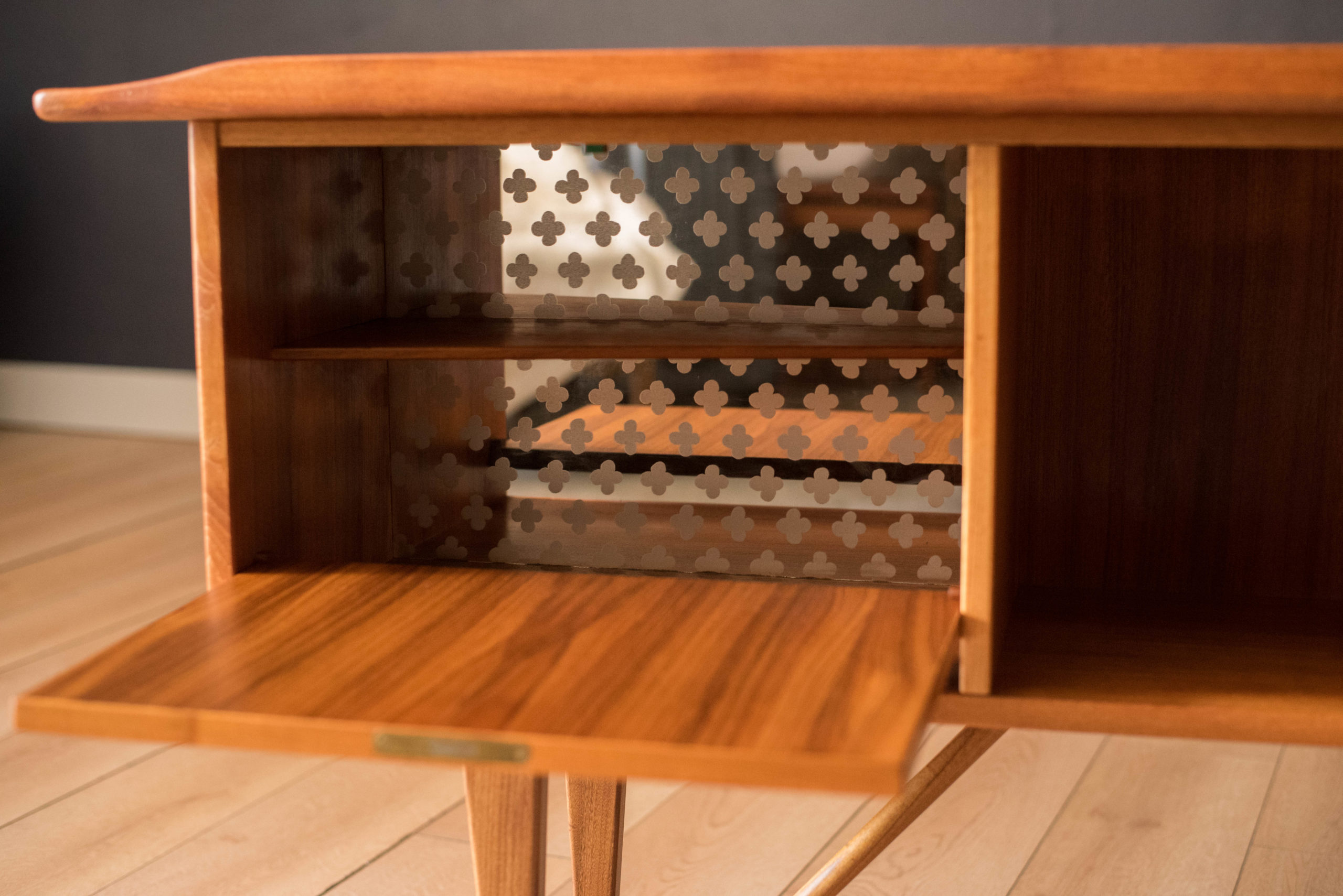 Mid-Century Modern writing desk in teak designed by Peter Lovig Nielsen for Dansk circa 1960’s. Features a unique boomerang shaped top with a raised lip edge and tapered legs with brass supports. This piece includes three dovetailed drawers accented with solid wood sculpted handles and one organizing slide out tray. The backside is finished and provides additional storage with a locking bar cabinet and bookshelf display making it easy to showcase from any angle. Original skeleton key is included.