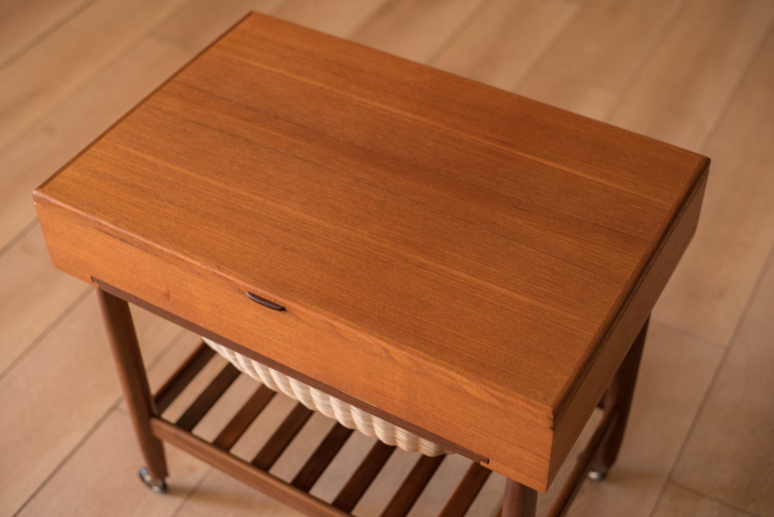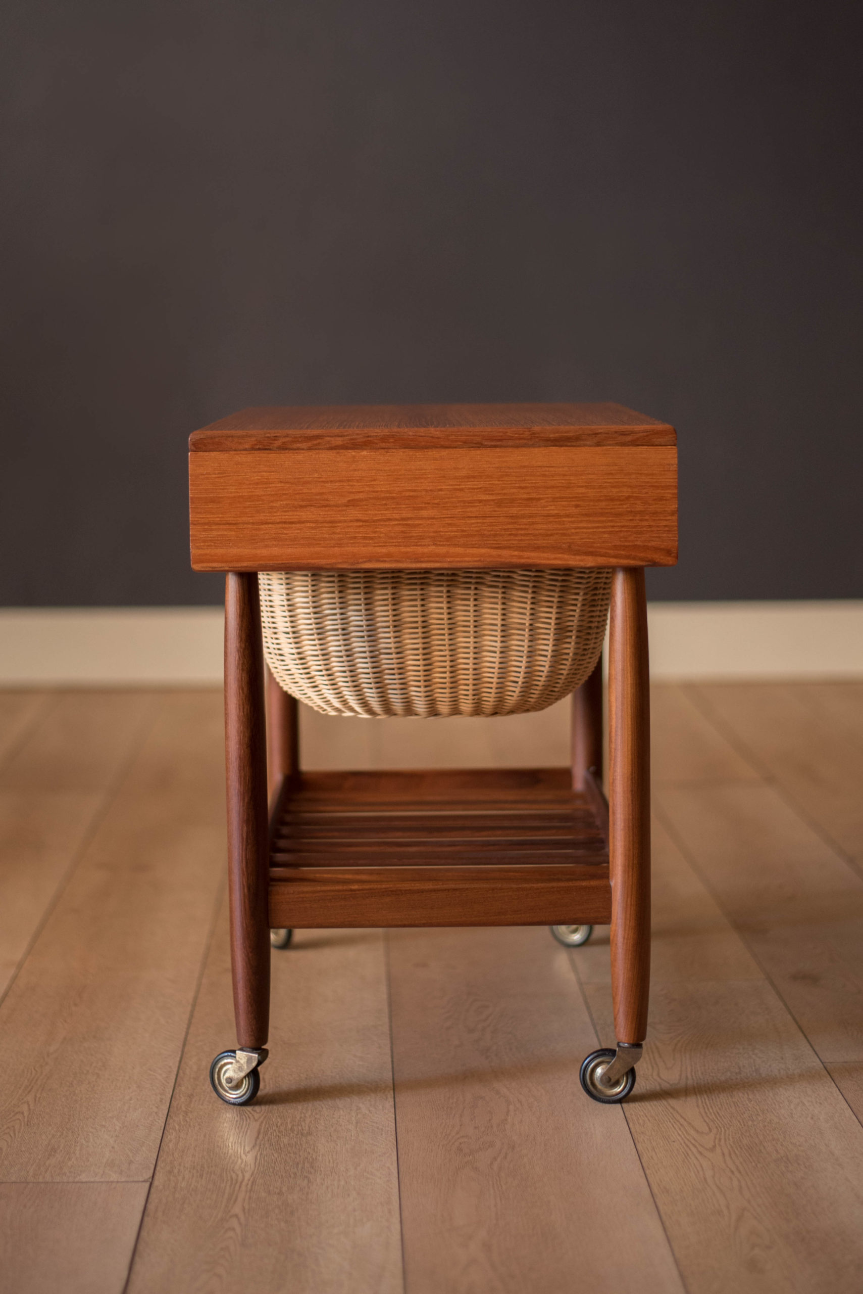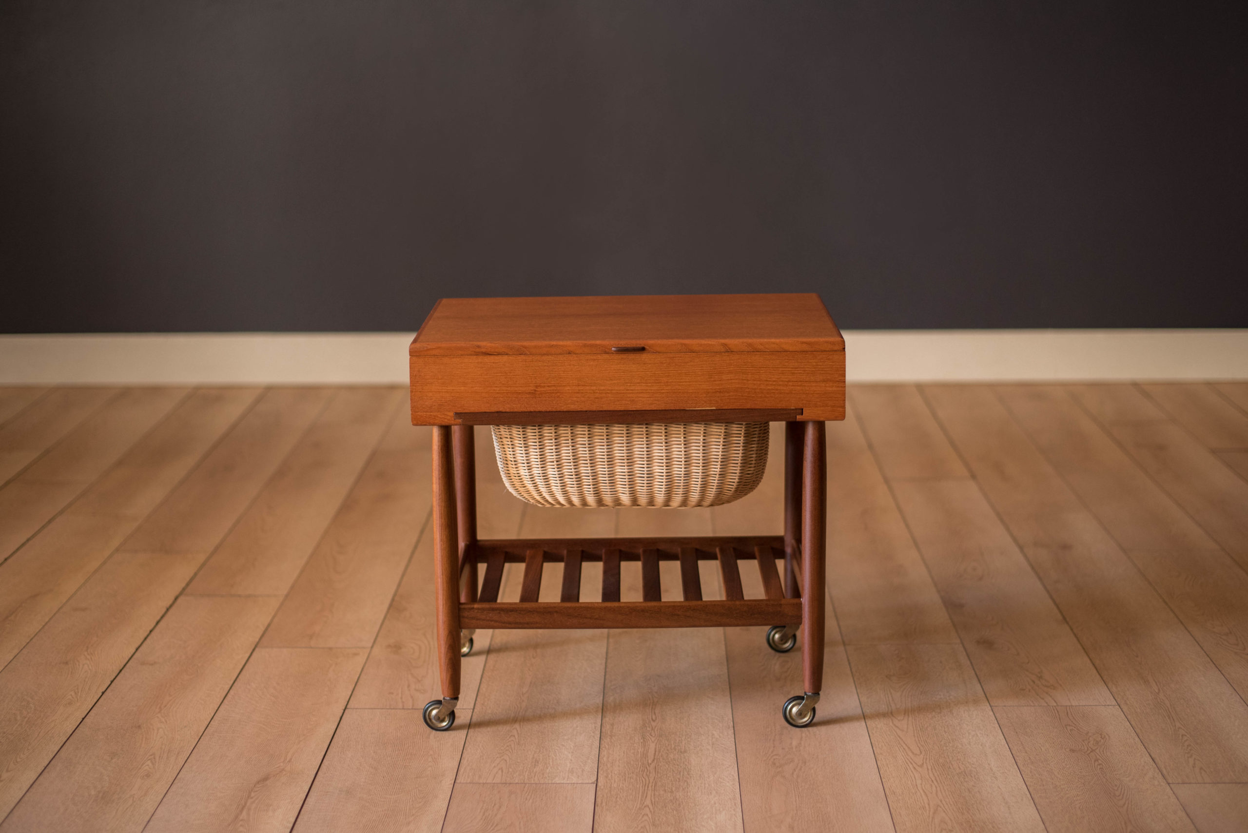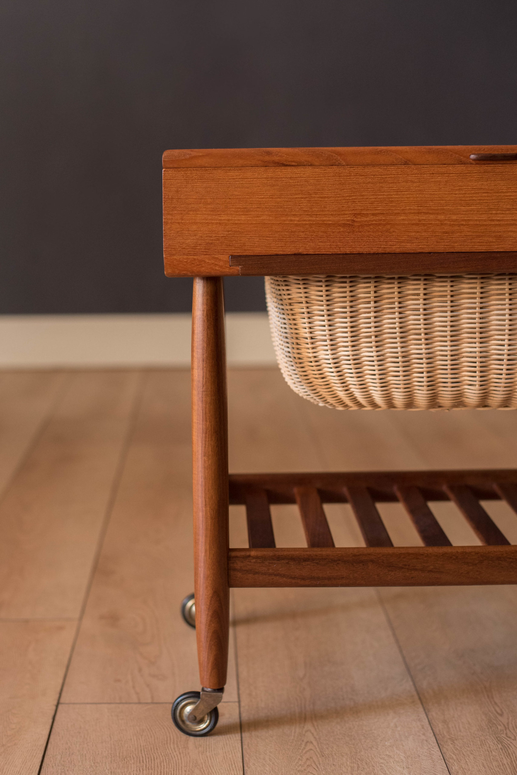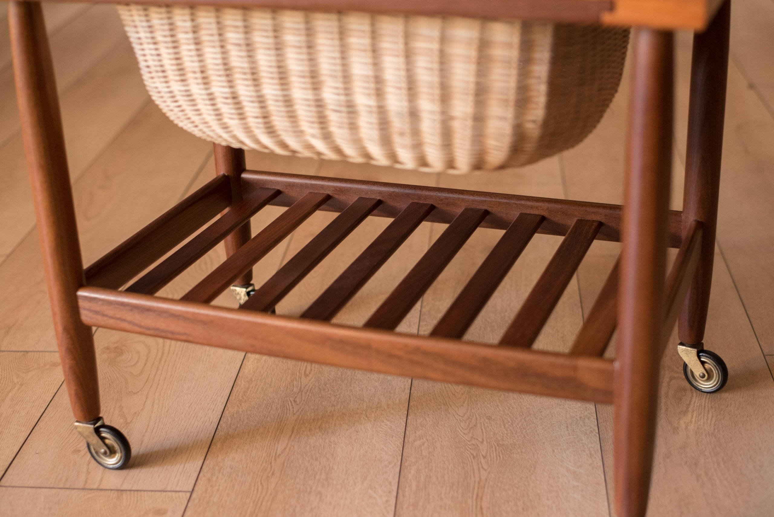 Mid century modern sewing end table in teak designed by Ejvind A. Johansson for FDB Mobler, Denmark. This two-tone piece is made with old growth teak featuring a storage organizing compartment with dividers, a seamless slide-out wicker basket tray, and slatted bottom display shelf. This versatile piece fits as an end table, nightstand, or entryway piece. Rolls easily on original brass casters.