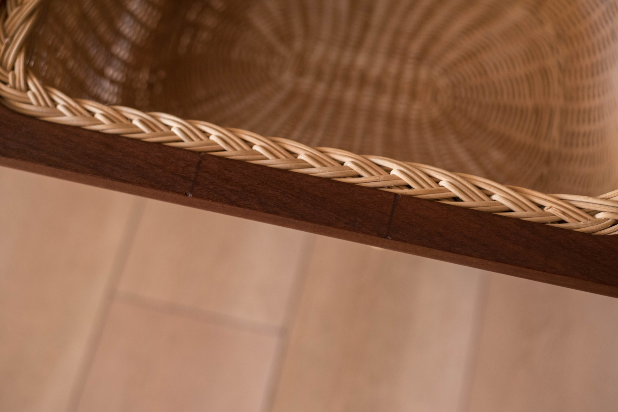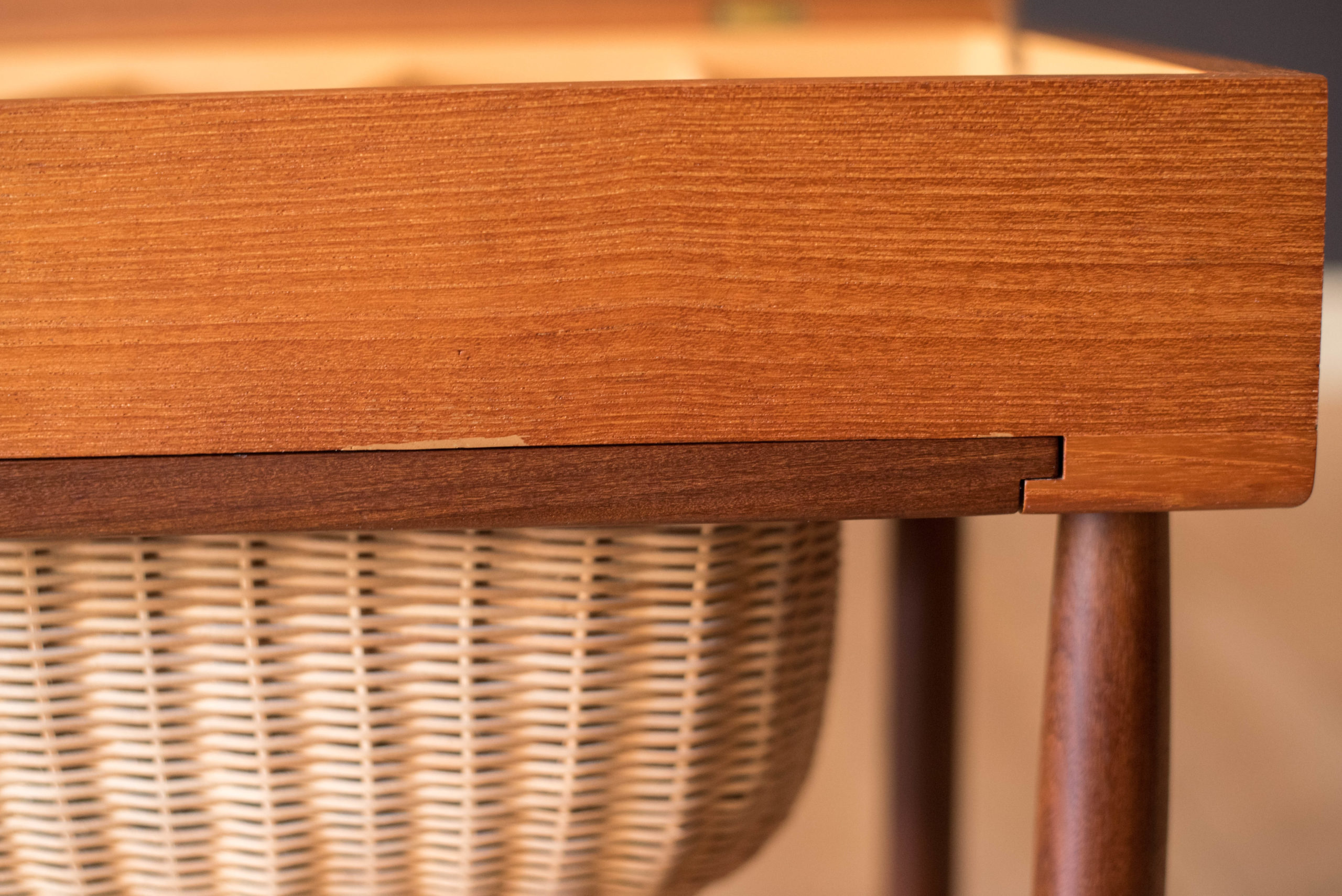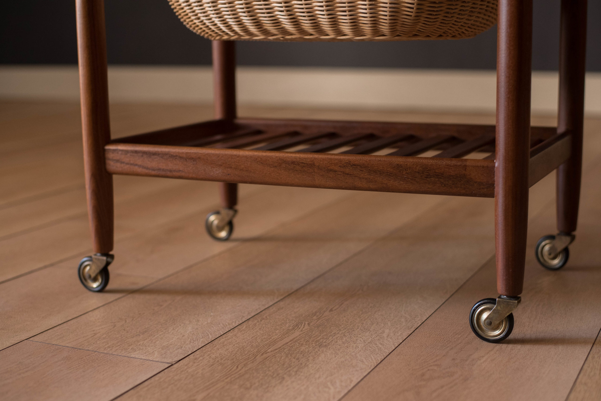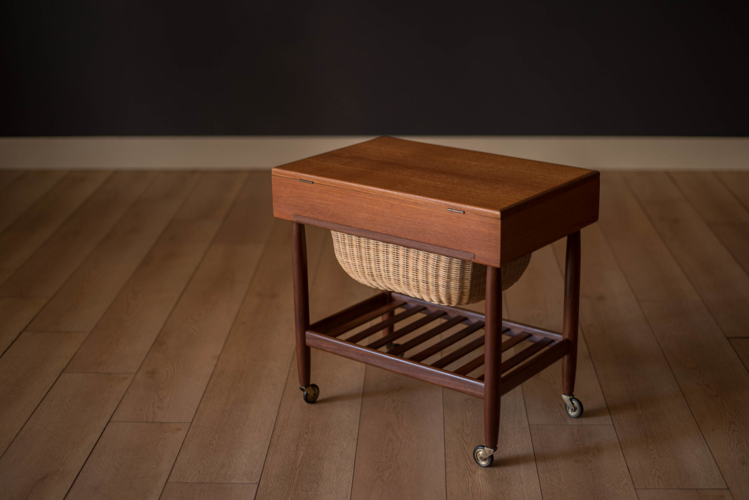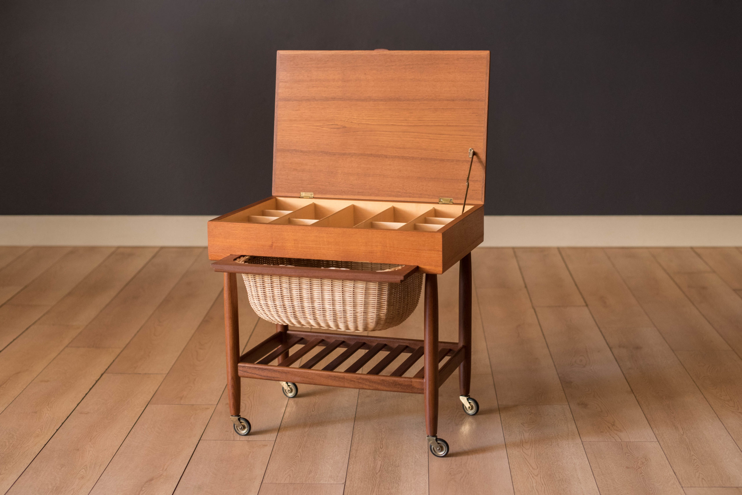 Mid century modern sewing end table in teak designed by Ejvind A. Johansson for FDB Mobler, Denmark. This two-tone piece is made with old growth teak featuring a storage organizing compartment with dividers, a seamless slide-out wicker basket tray, and slatted bottom display shelf. This versatile piece fits as an end table, nightstand, or entryway piece. Rolls easily on original brass casters.