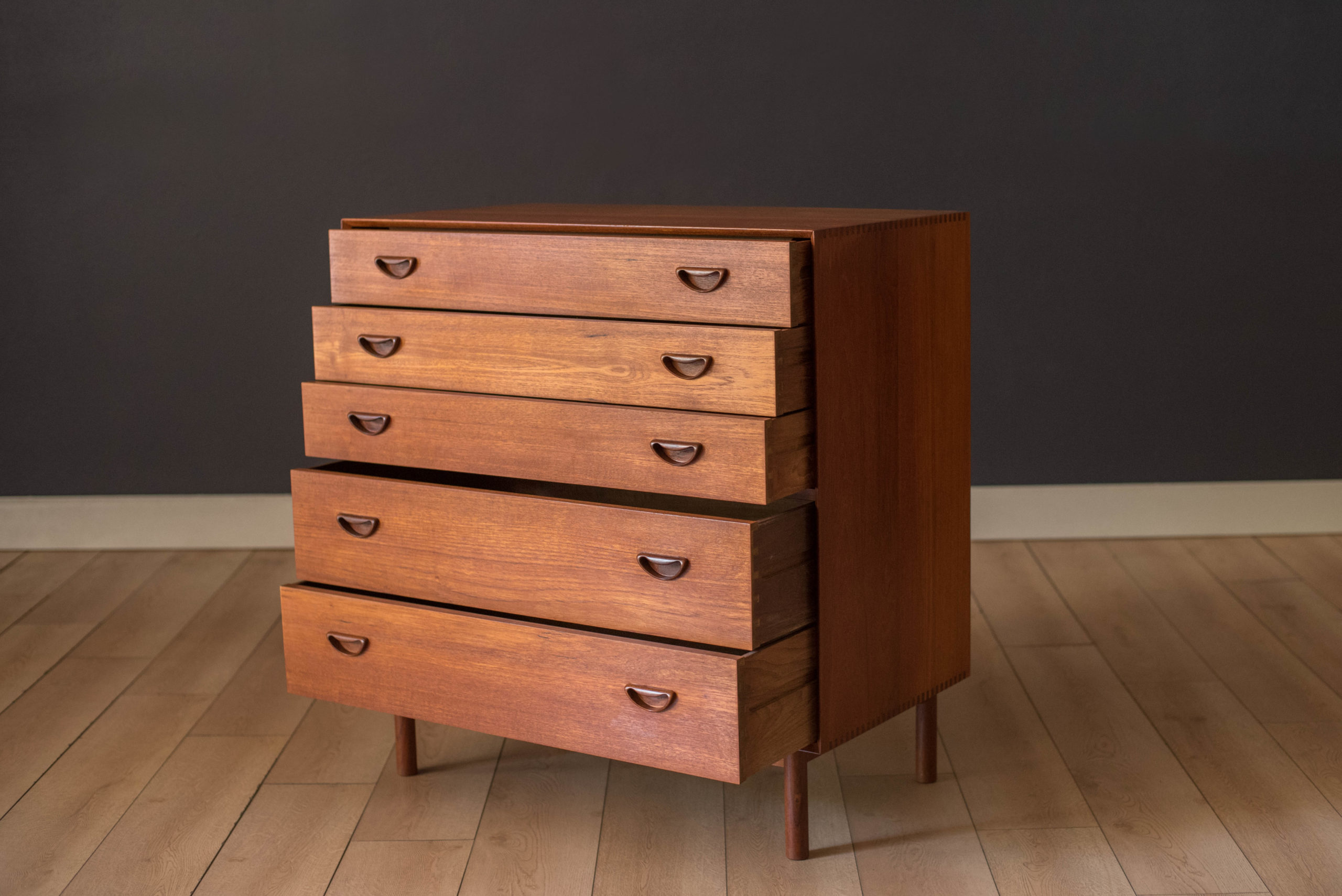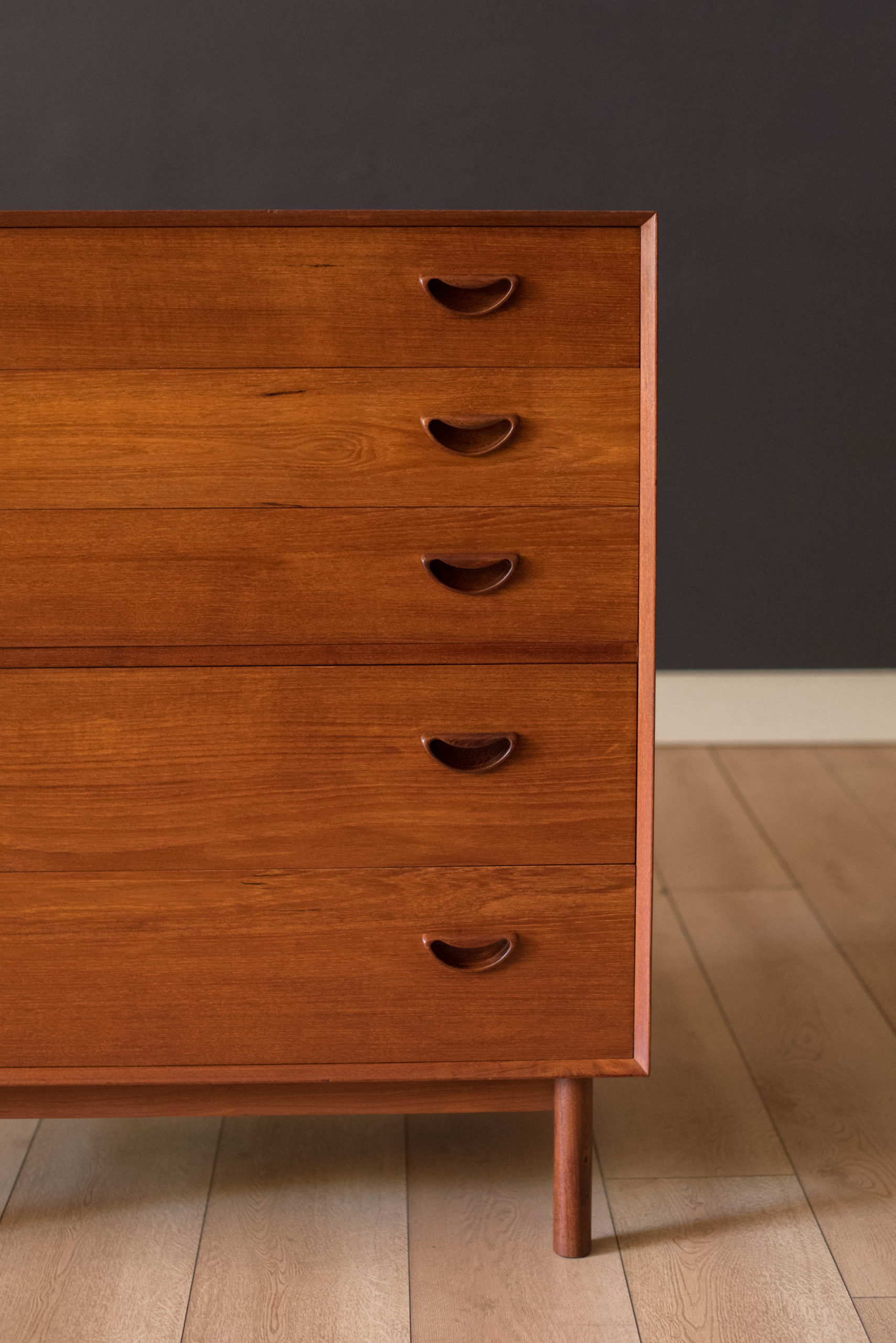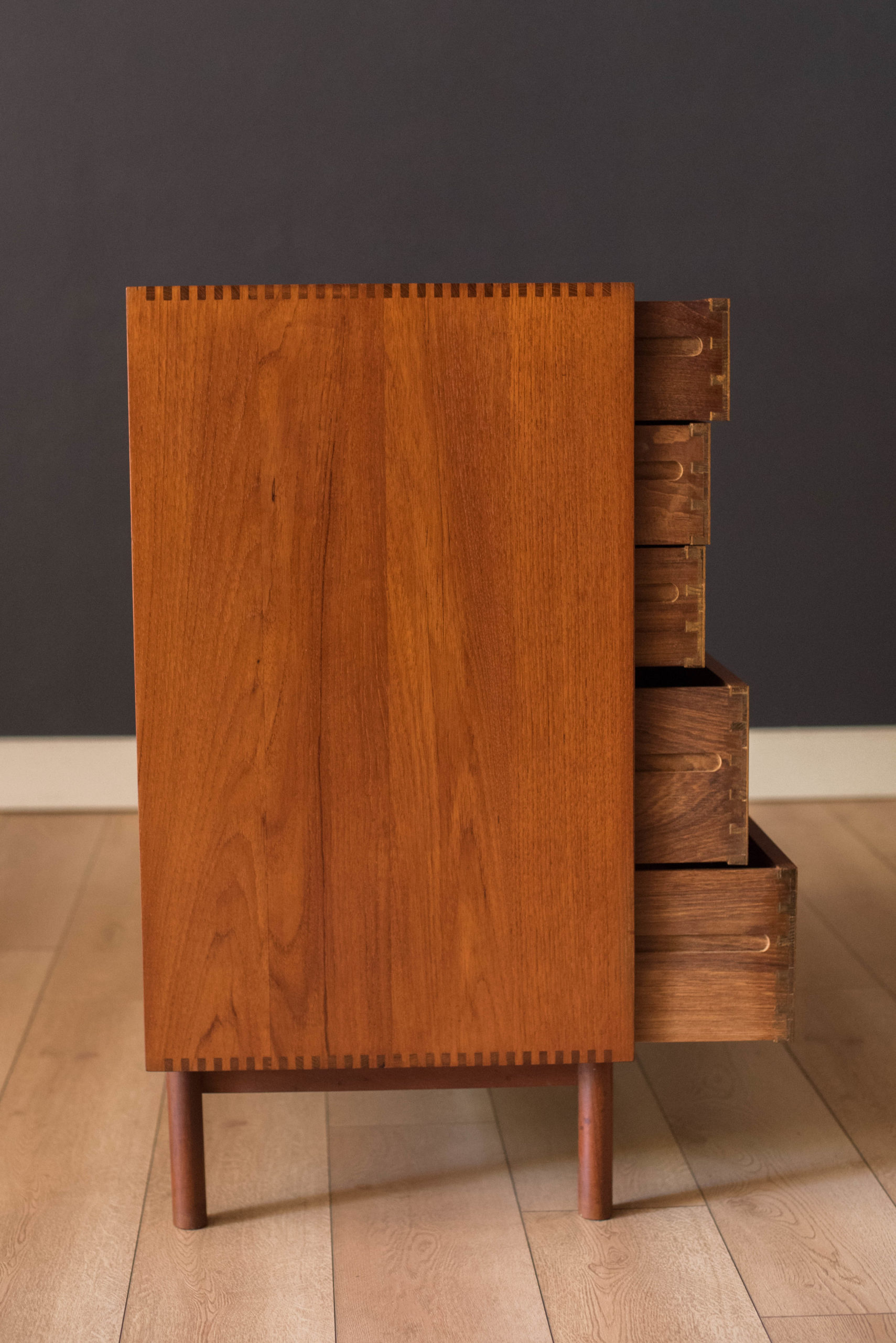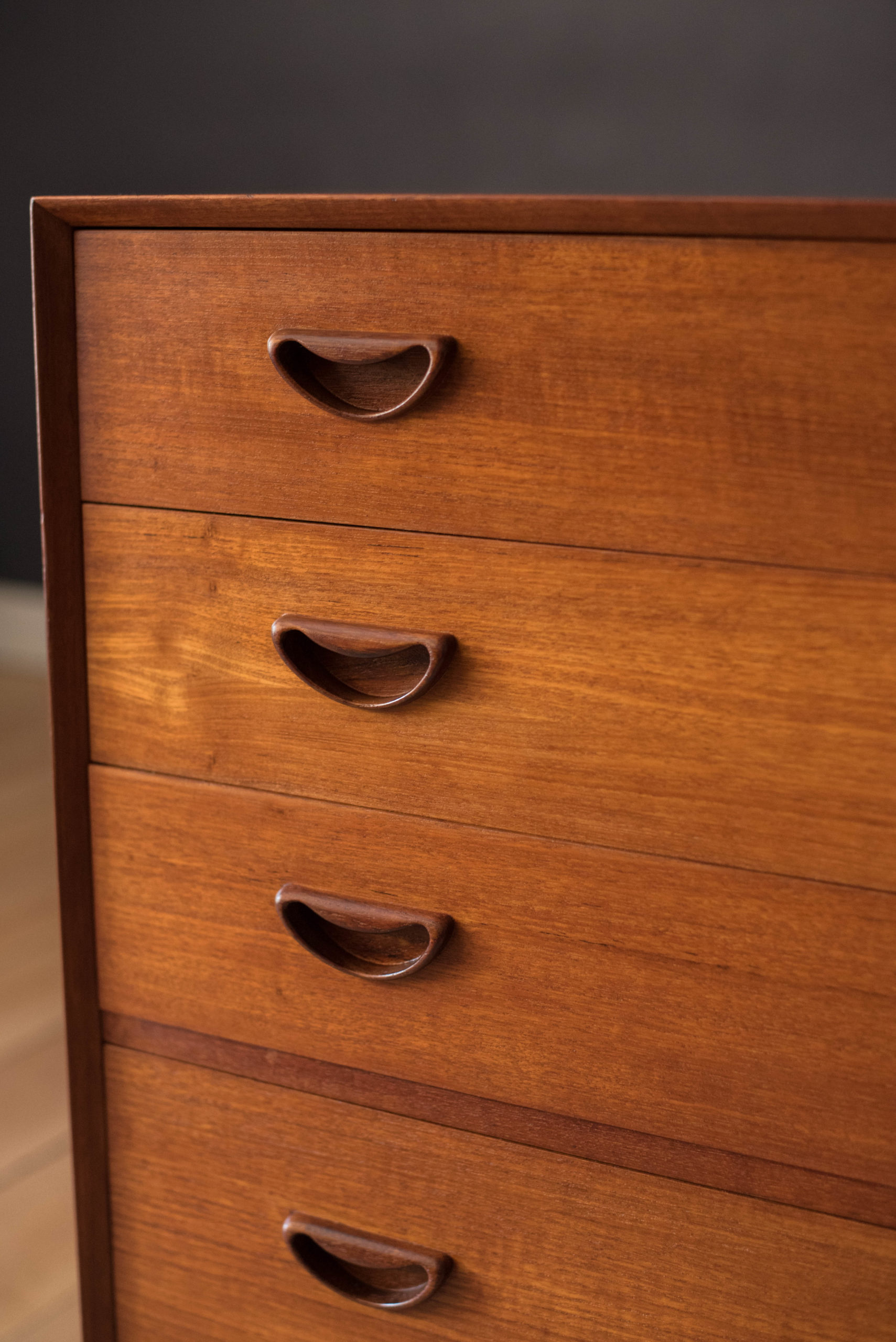 Mid Century Modern dresser chest designed by Peter Hvidt and Orla Mølgaard-Nielsen for Søborg Møbler in solid teak. Features detailed finger joinery and signature sculpted pulls. This unique piece includes five dovetail drawers finished with teak interior construction.