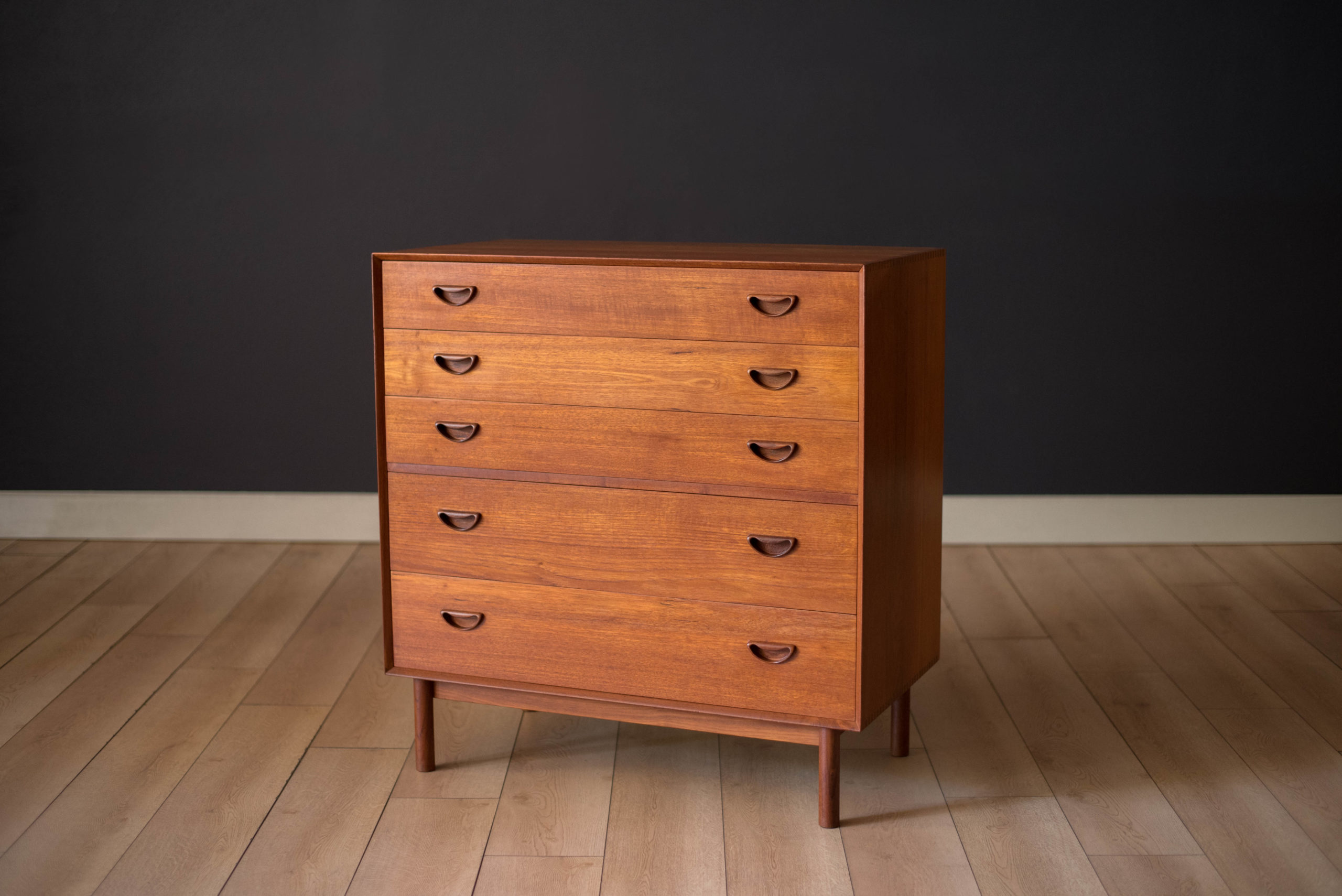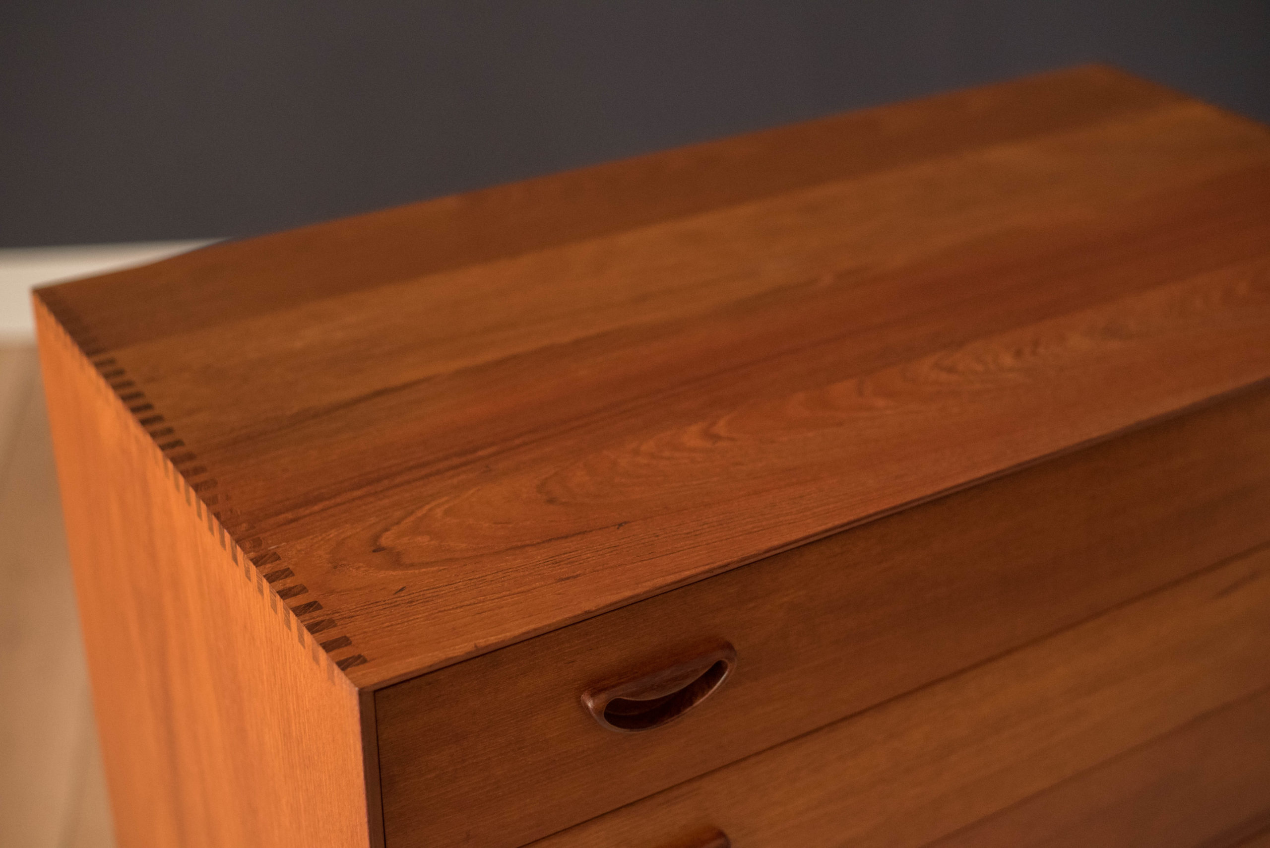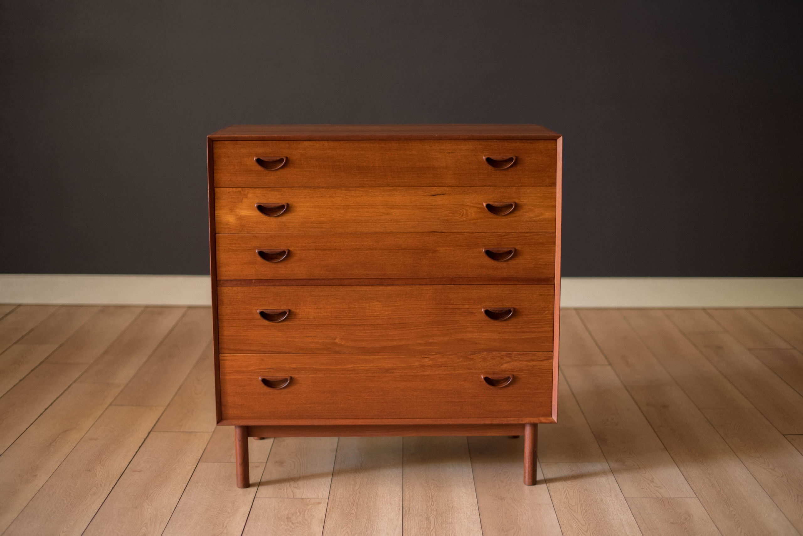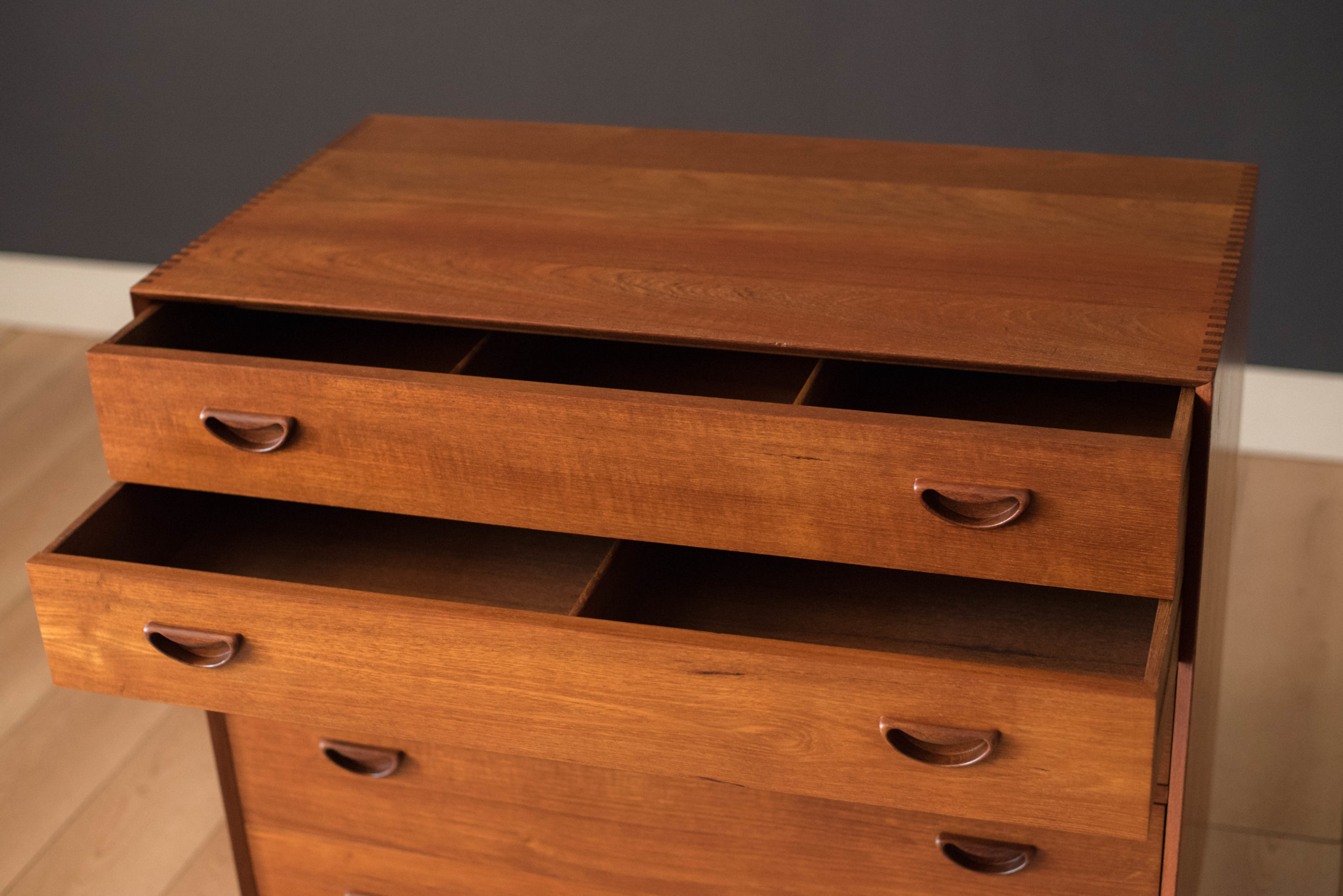 Mid Century Modern dresser chest designed by Peter Hvidt and Orla Mølgaard-Nielsen for Søborg Møbler in solid teak. Features detailed finger joinery and signature sculpted pulls. This unique piece includes five dovetail drawers finished with teak interior construction.