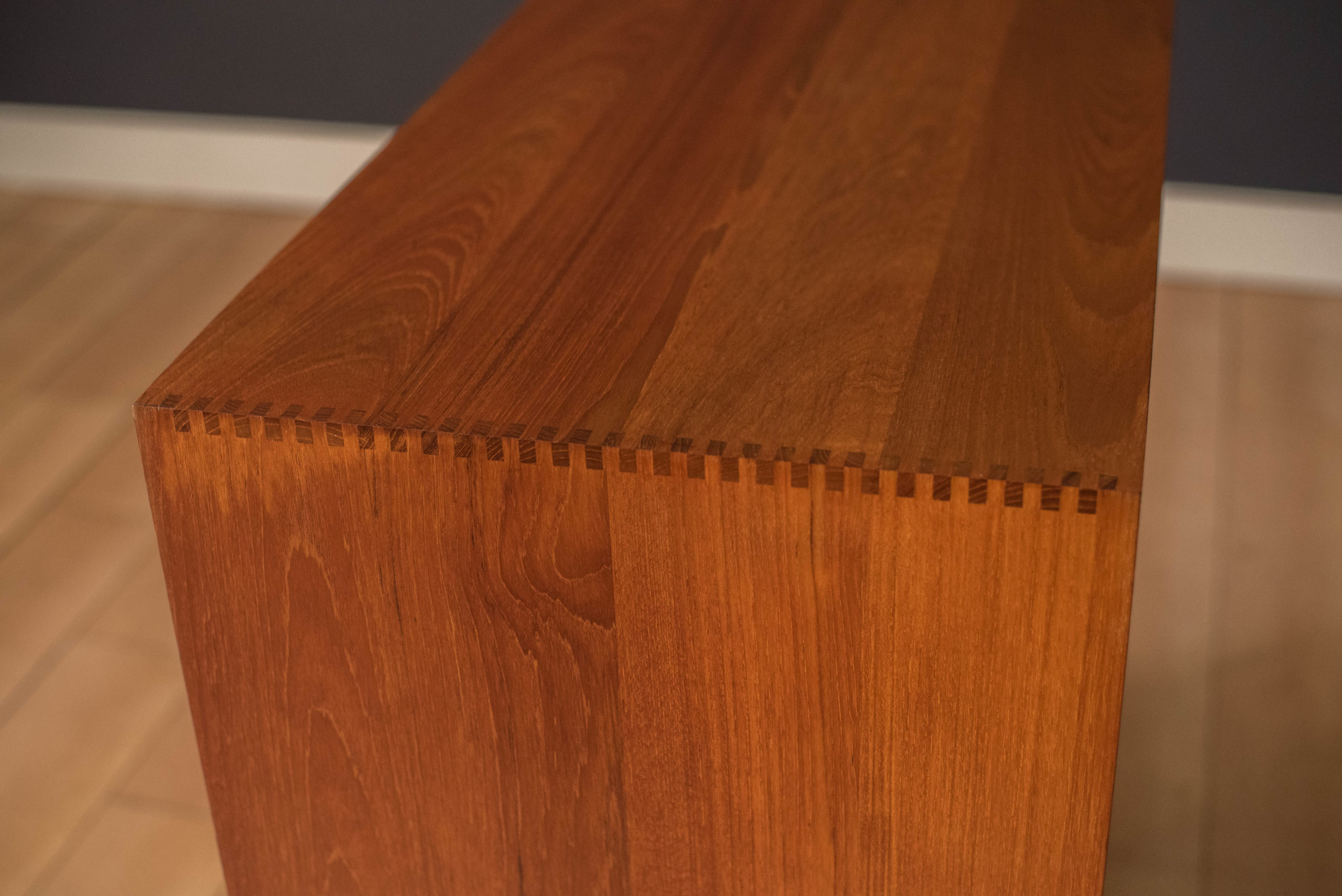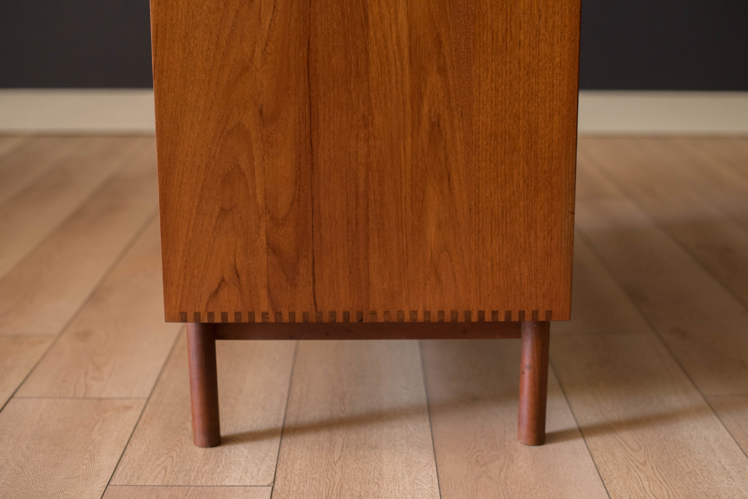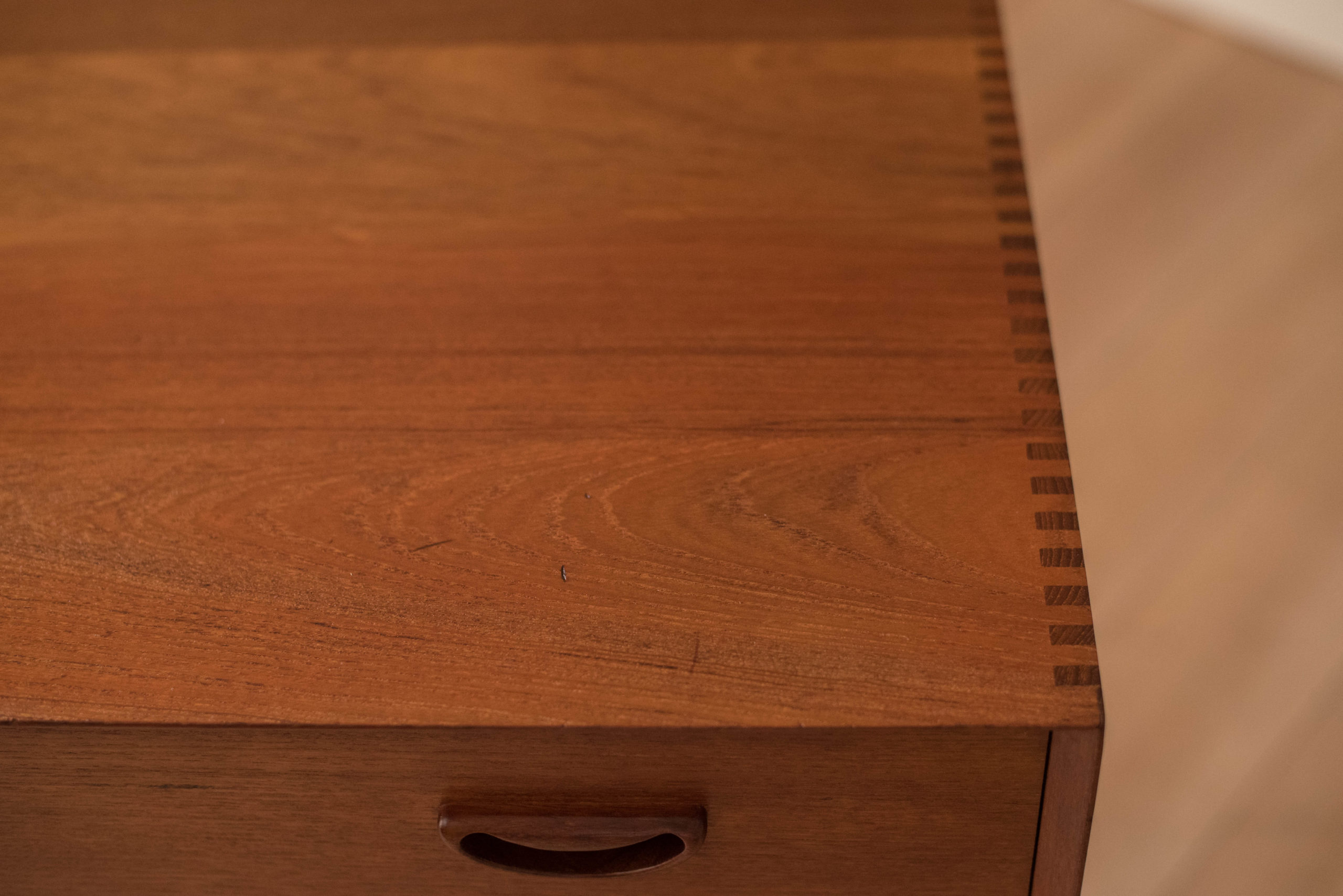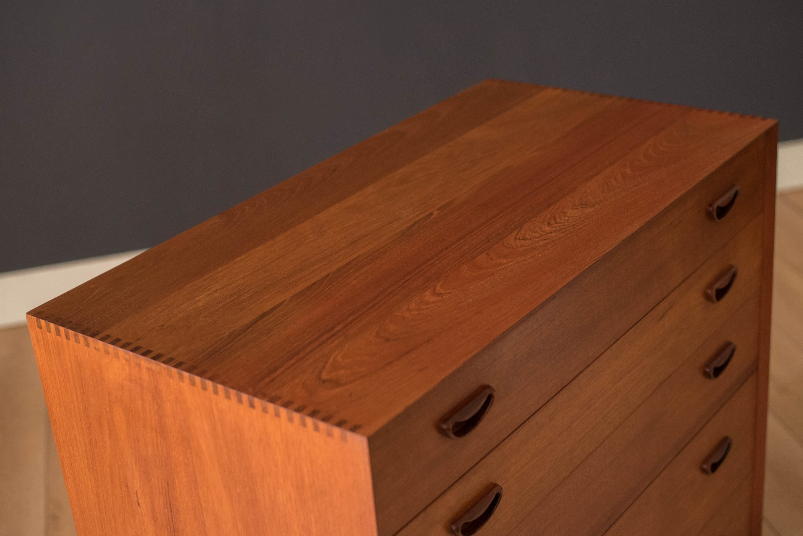 Mid Century Modern dresser chest designed by Peter Hvidt and Orla Mølgaard-Nielsen for Søborg Møbler in solid teak. Features detailed finger joinery and signature sculpted pulls. This unique piece includes five dovetail drawers finished with teak interior construction.