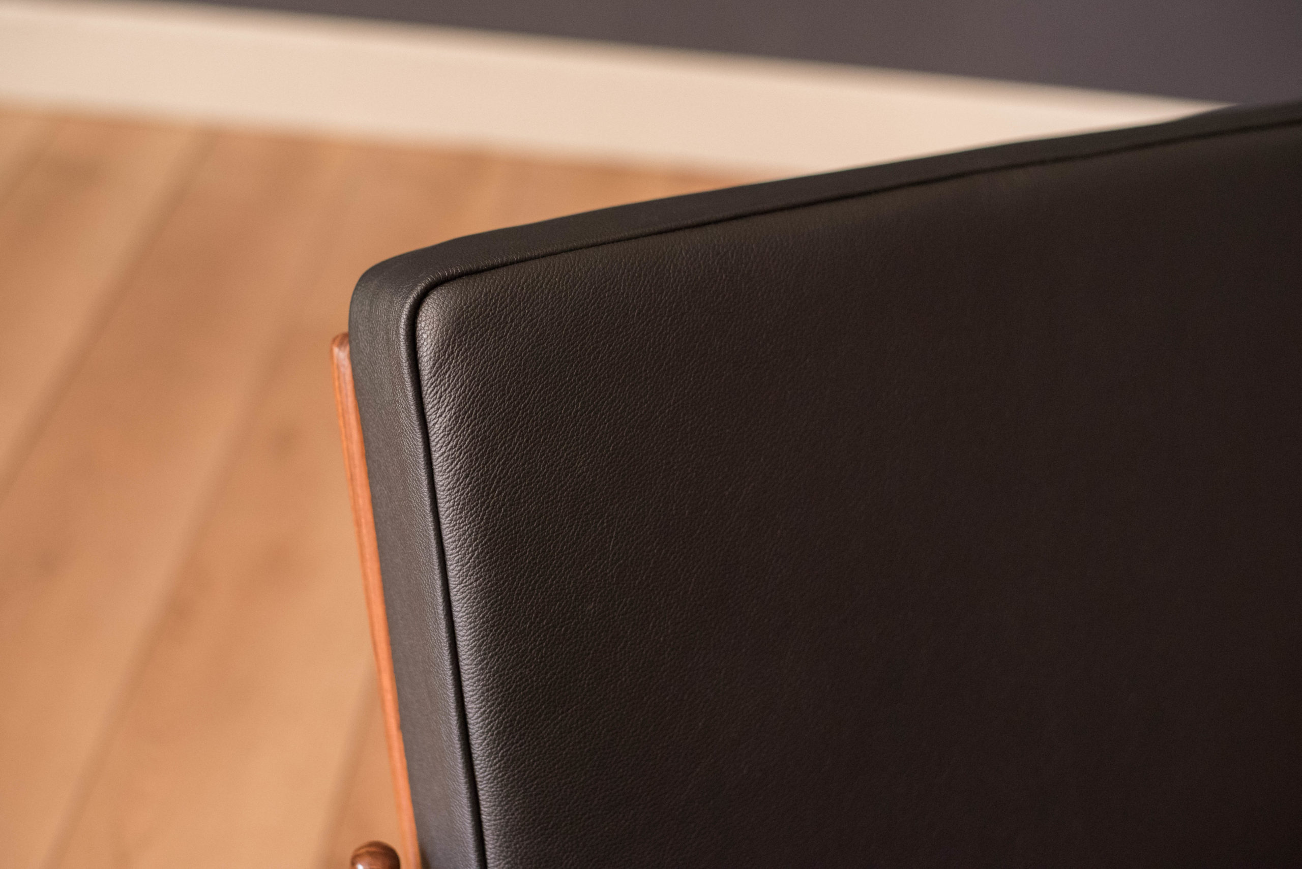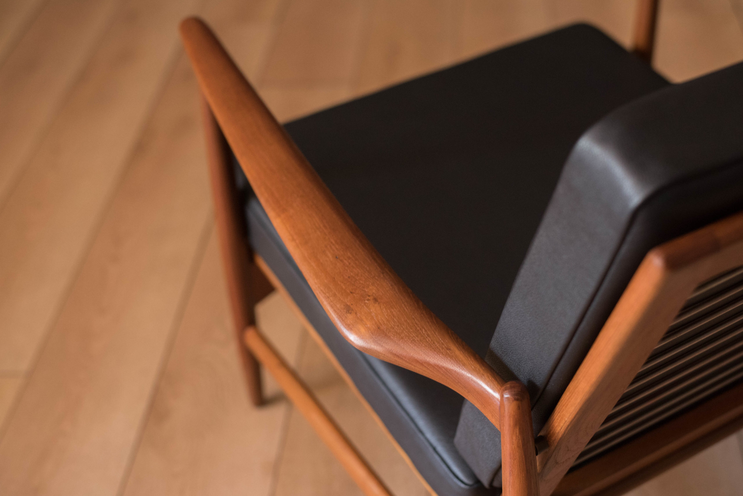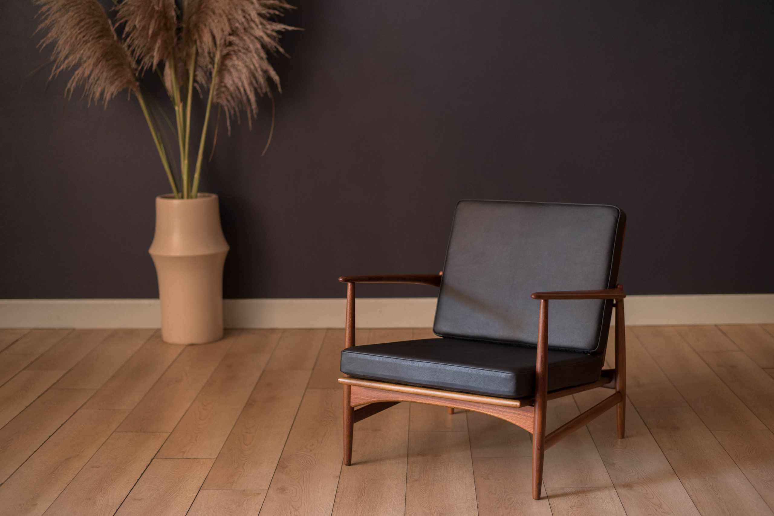 Mid-Century Modern lounge armchair in teak designed by Ib Kofod-Larsen for Selig, Denmark, circa 1960’s. This vintage piece has been reupholstered in black leather with brand new foam and webbing. Features a sculptural teak frame with brass accents that showcases from all angles.