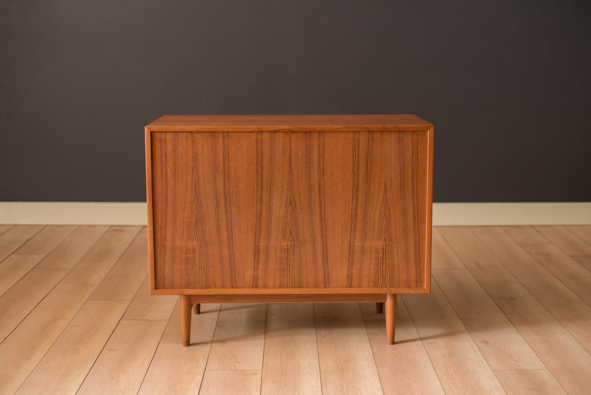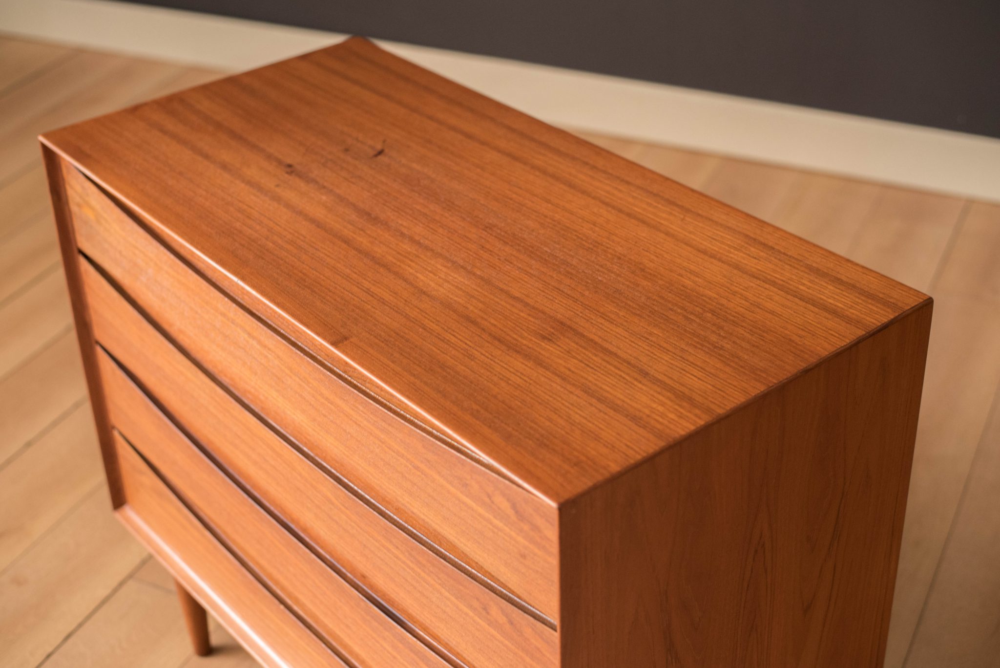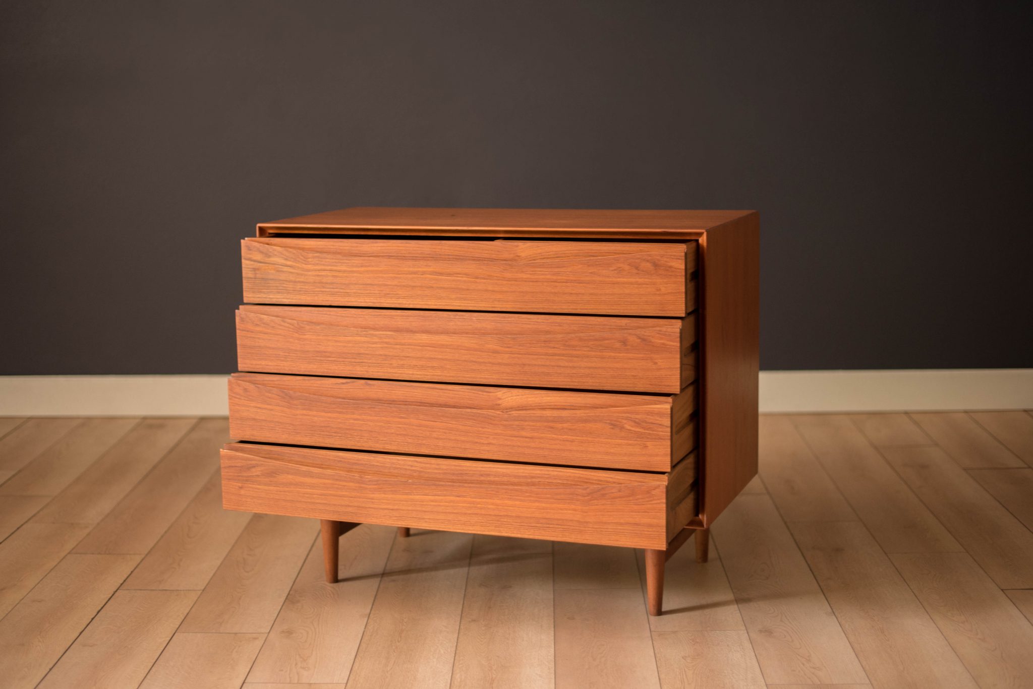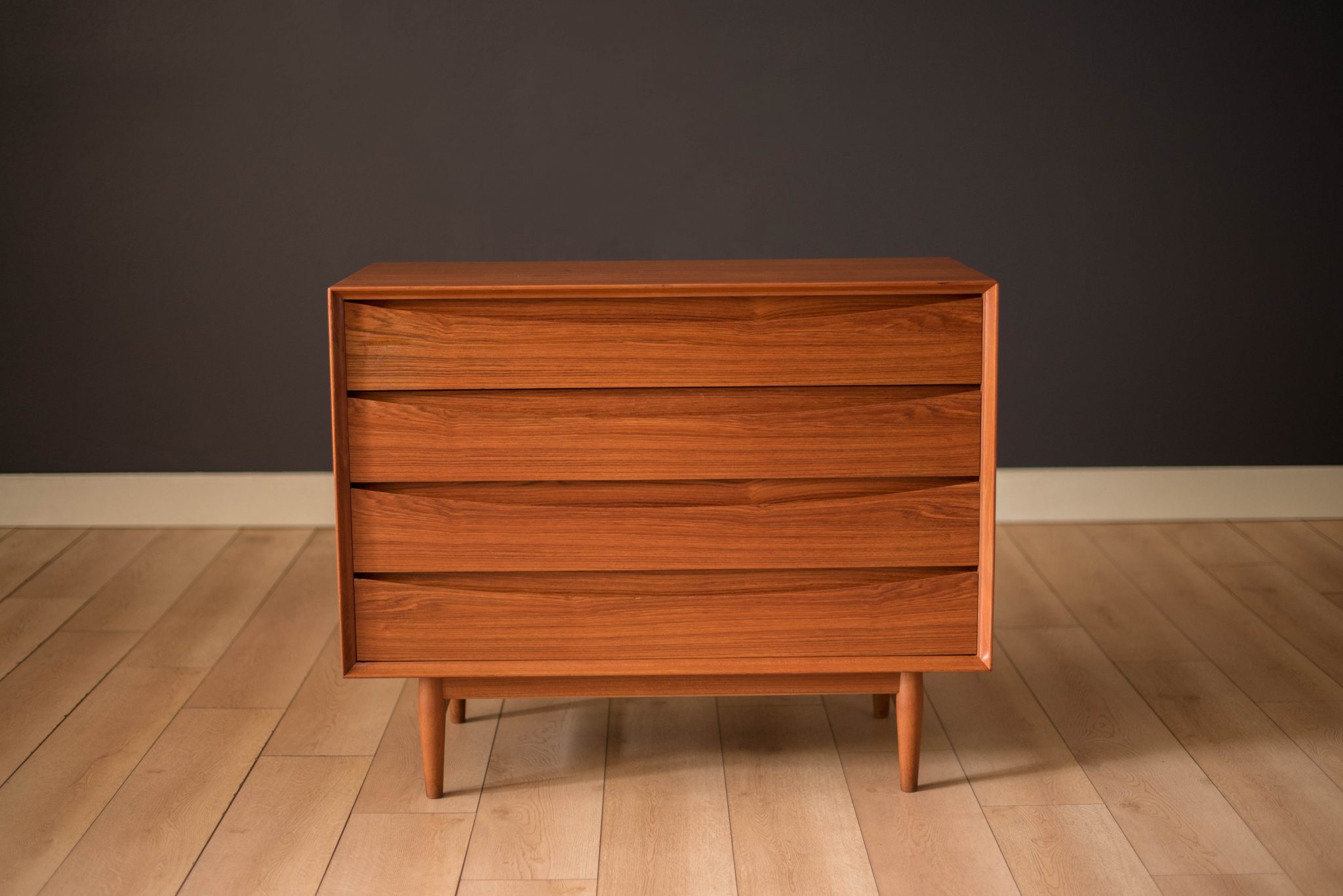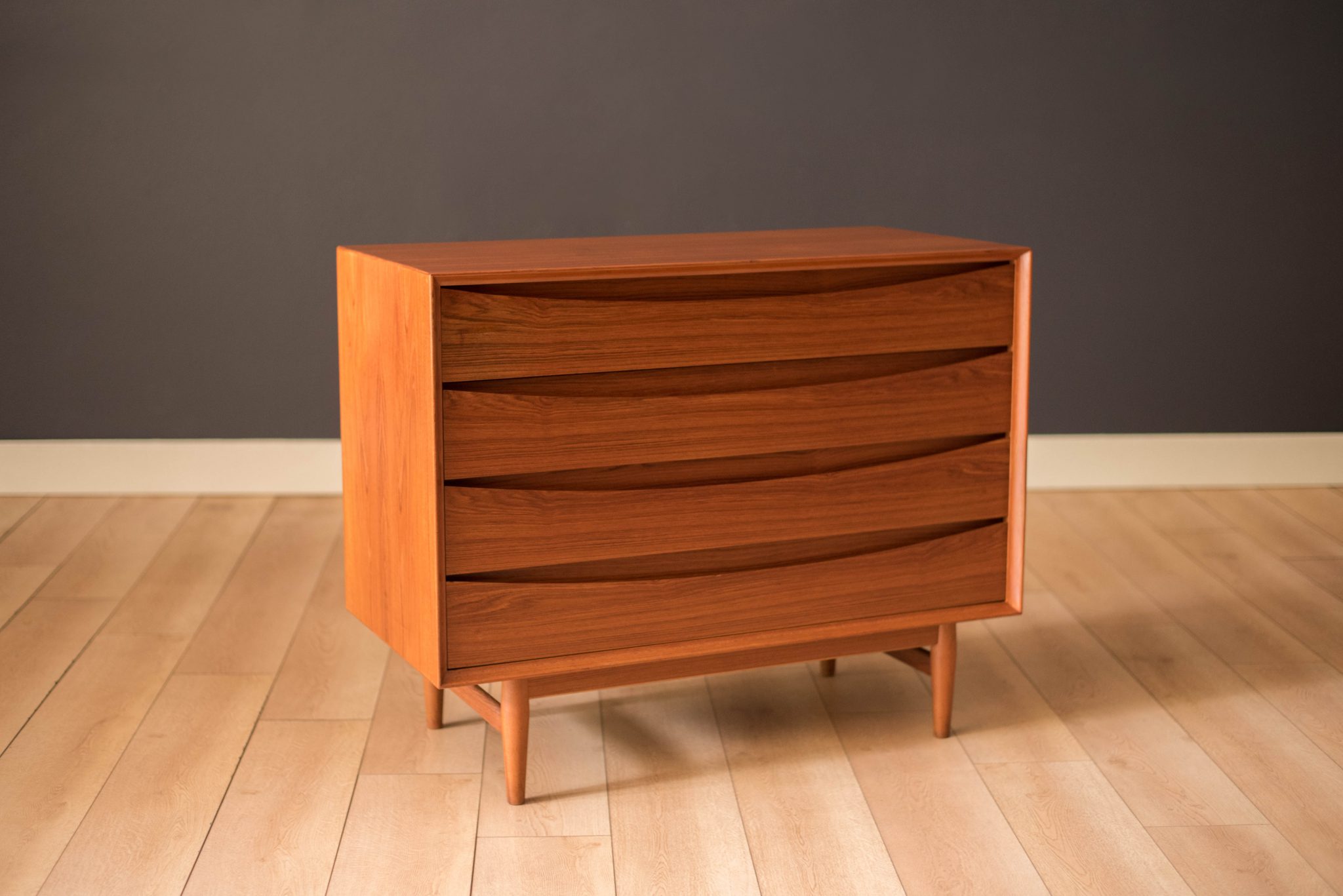 Mid-Century Modern dresser chest in teak designed by Arne Vodder for Sibast Furniture, circa 1960’s. Created with an exceptional skill of cabinetry, this case piece is built with four dovetailed drawers, signature sculpted handles, and deep storage space. The top drawer provides a unique sliding tray for small belongings and three organizing dividers. Complete with a finished backside to showcase in the center of a room.