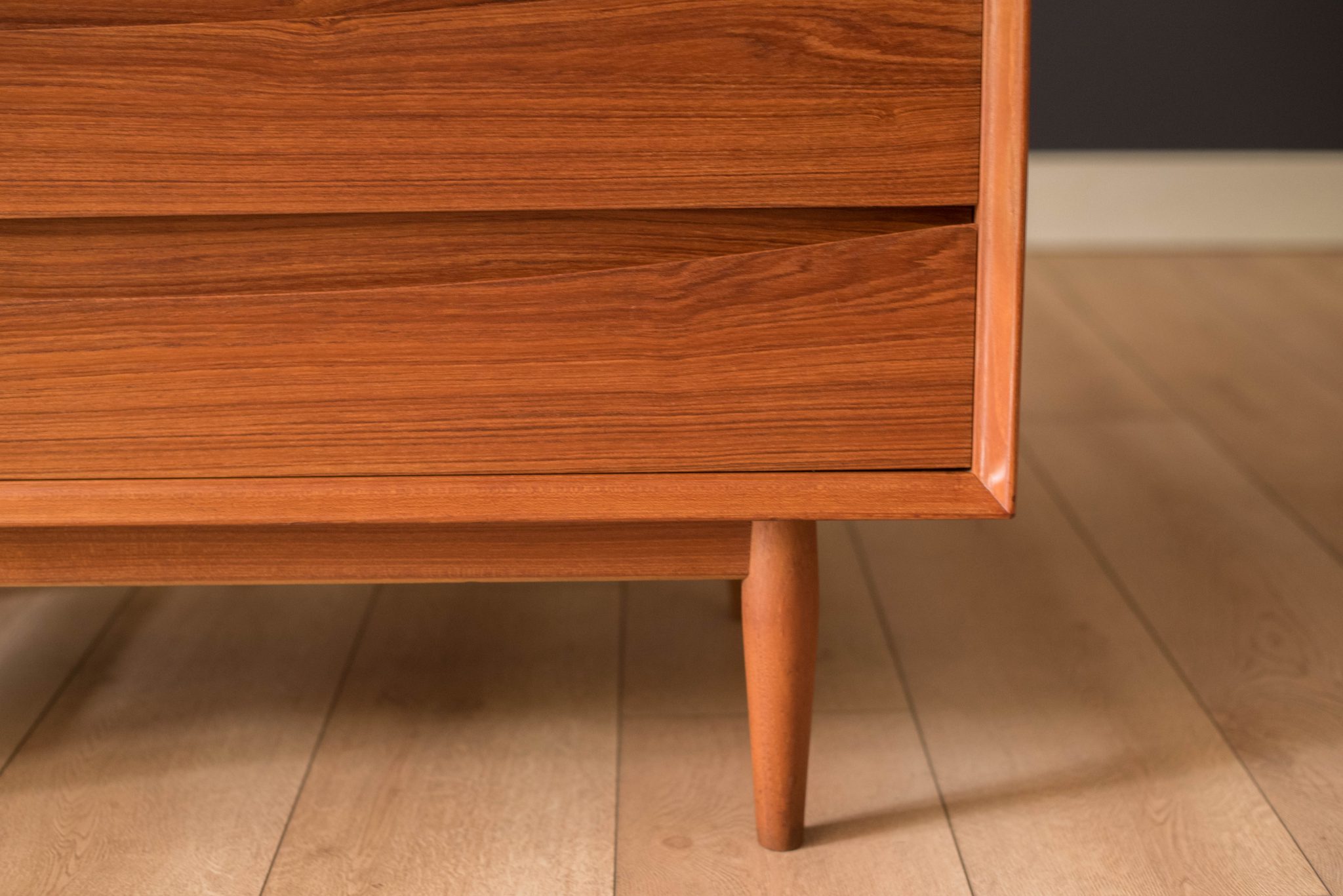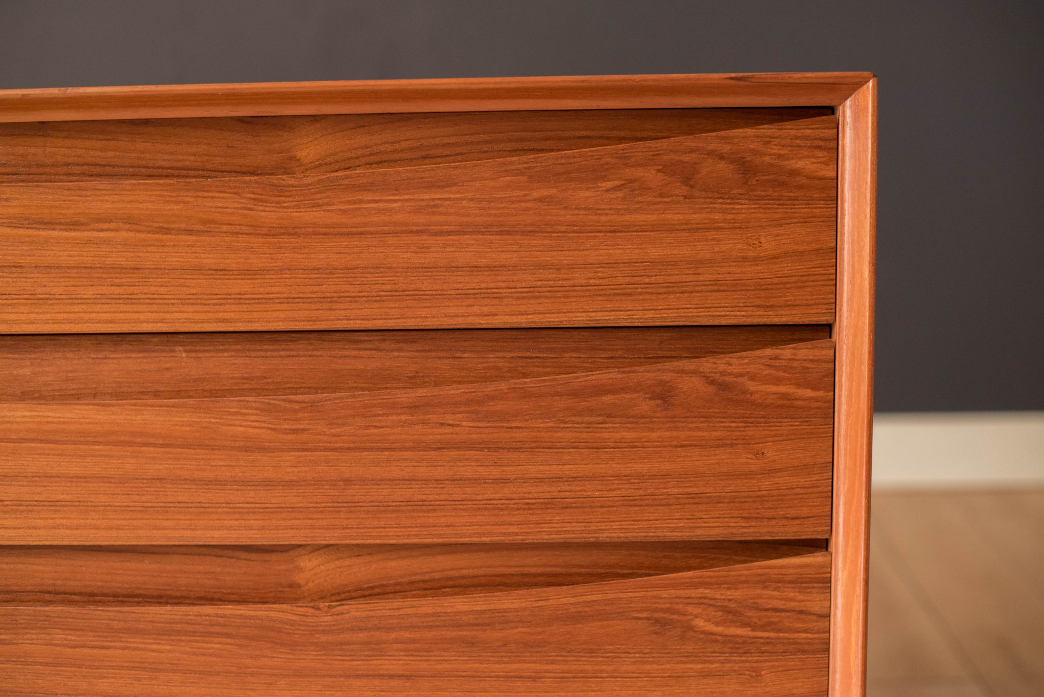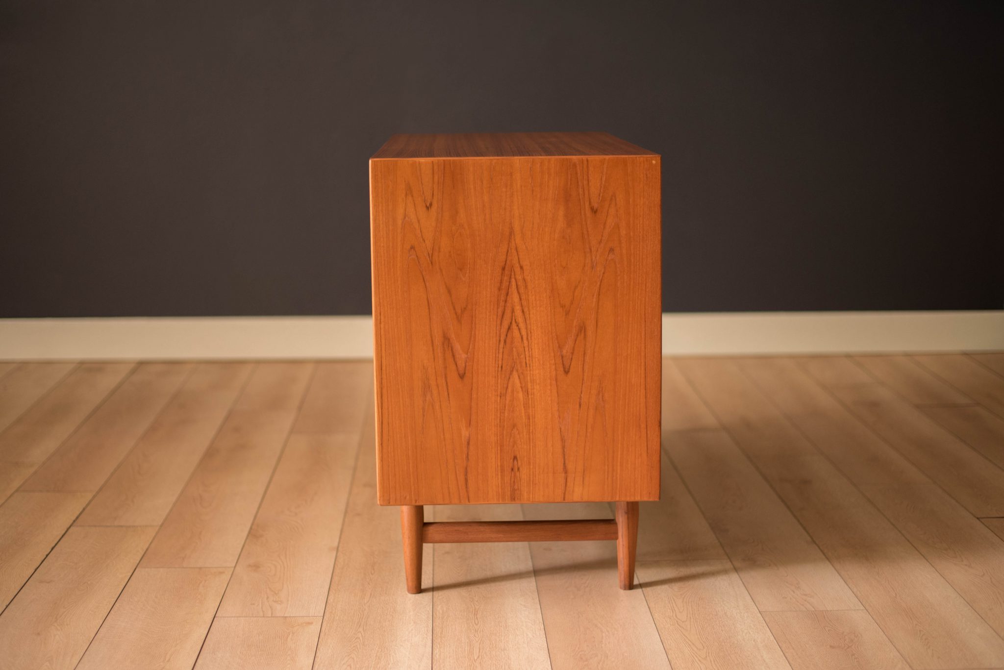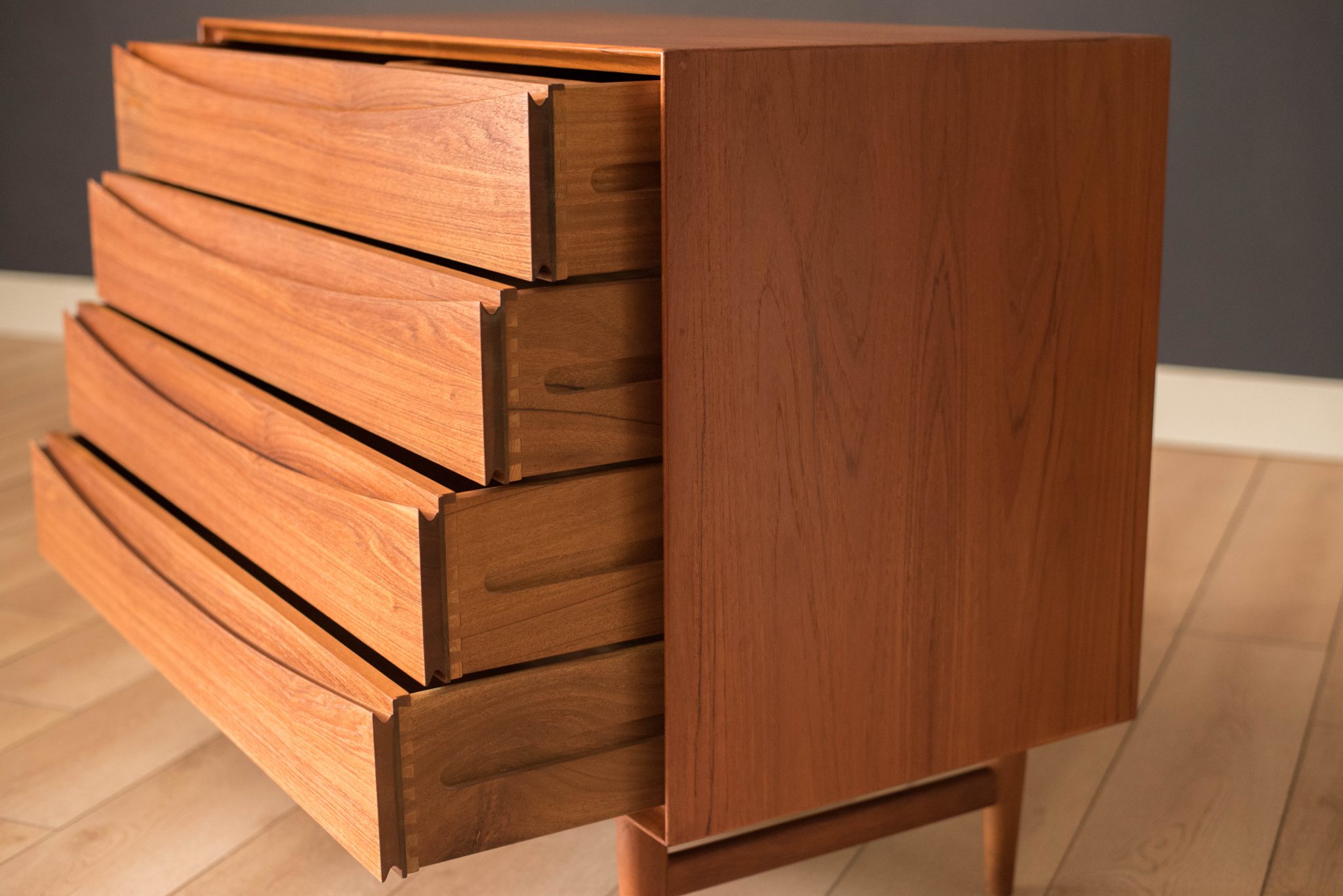 Mid-Century Modern dresser chest in teak designed by Arne Vodder for Sibast Furniture, circa 1960’s. Created with an exceptional skill of cabinetry, this case piece is built with four dovetailed drawers, signature sculpted handles, and deep storage space. The top drawer provides a unique sliding tray for small belongings and three organizing dividers. Complete with a finished backside to showcase in the center of a room.