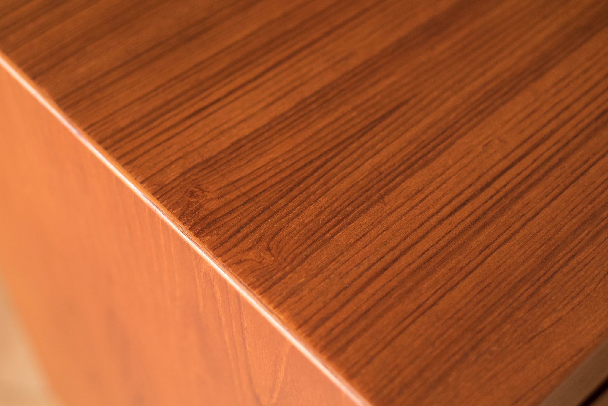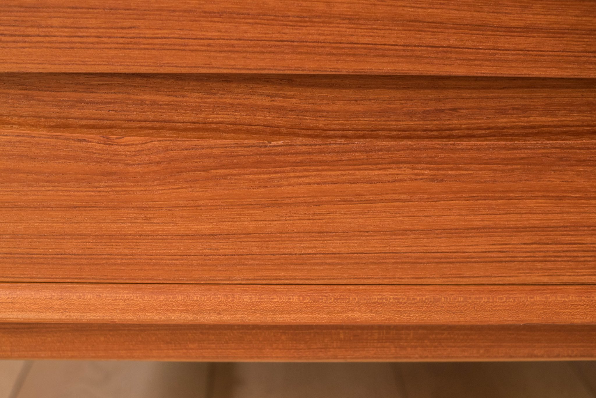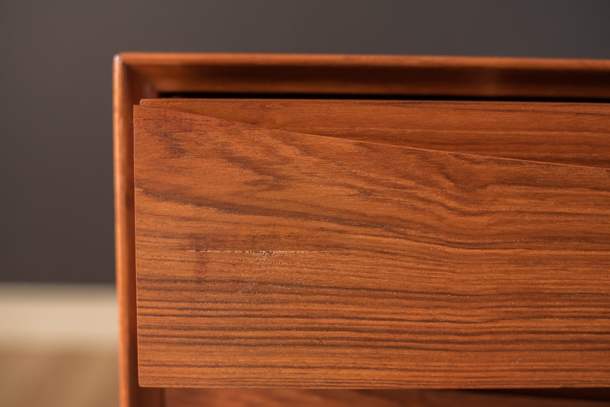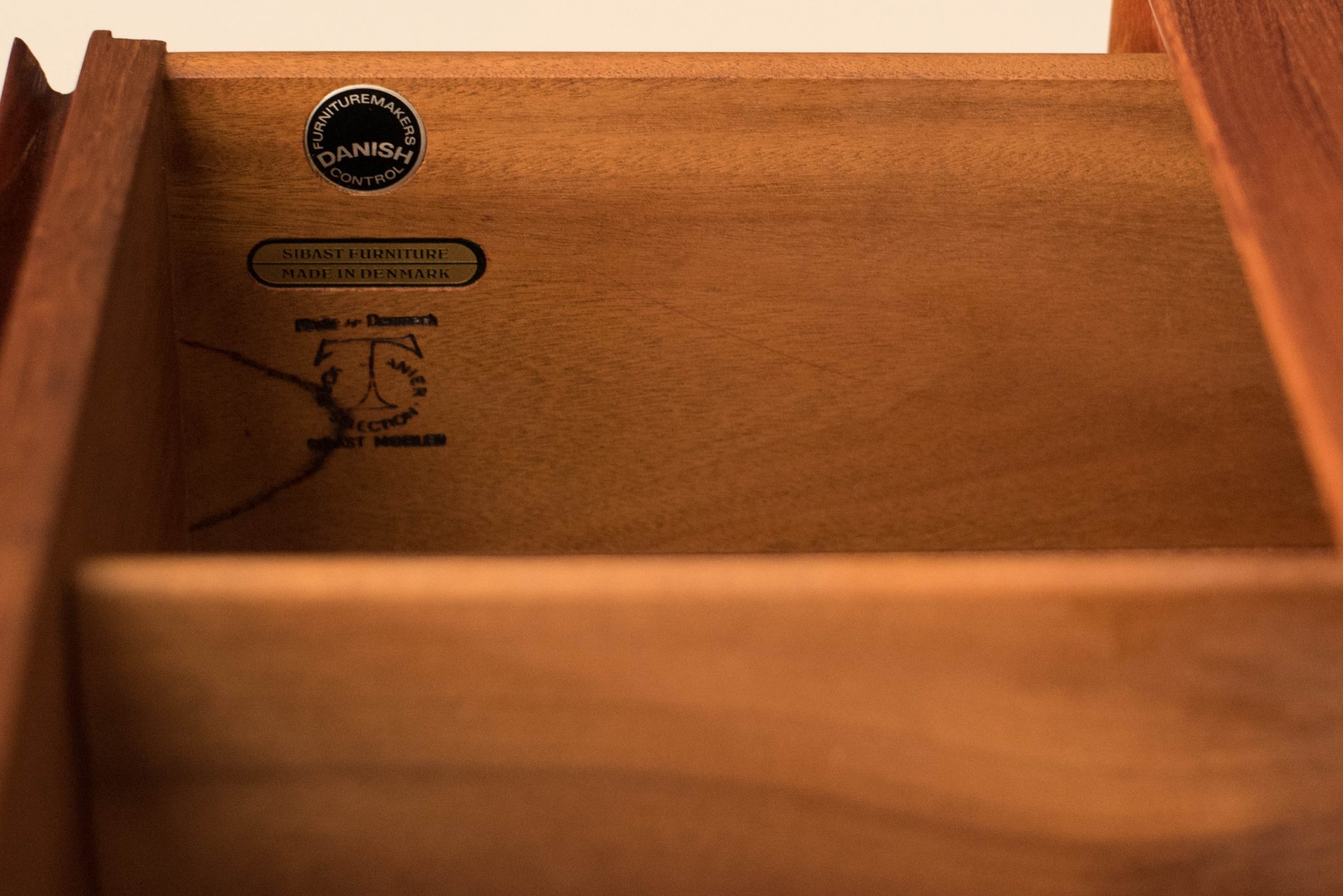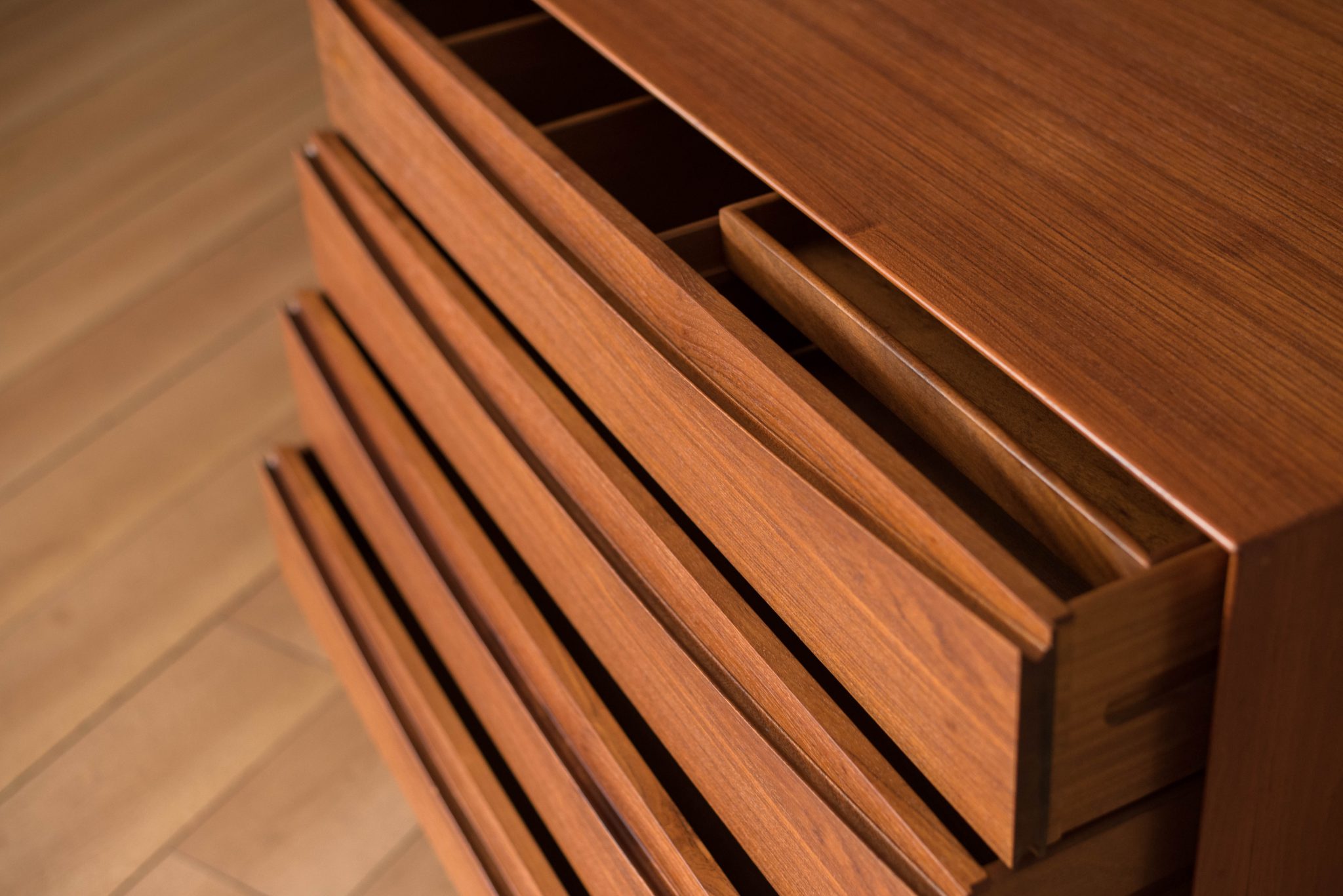 Mid-Century Modern dresser chest in teak designed by Arne Vodder for Sibast Furniture, circa 1960’s. Created with an exceptional skill of cabinetry, this case piece is built with four dovetailed drawers, signature sculpted handles, and deep storage space. The top drawer provides a unique sliding tray for small belongings and three organizing dividers. Complete with a finished backside to showcase in the center of a room.