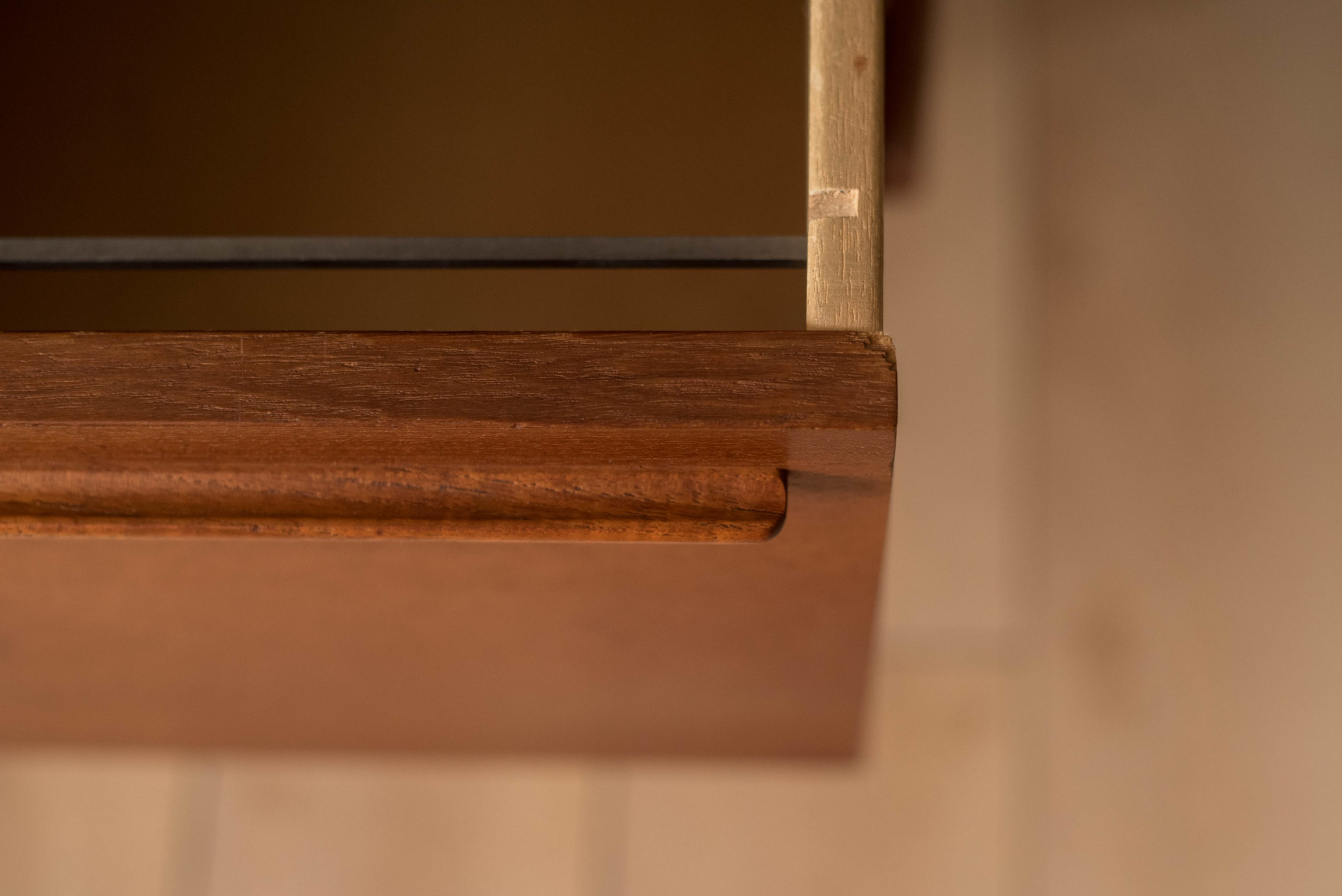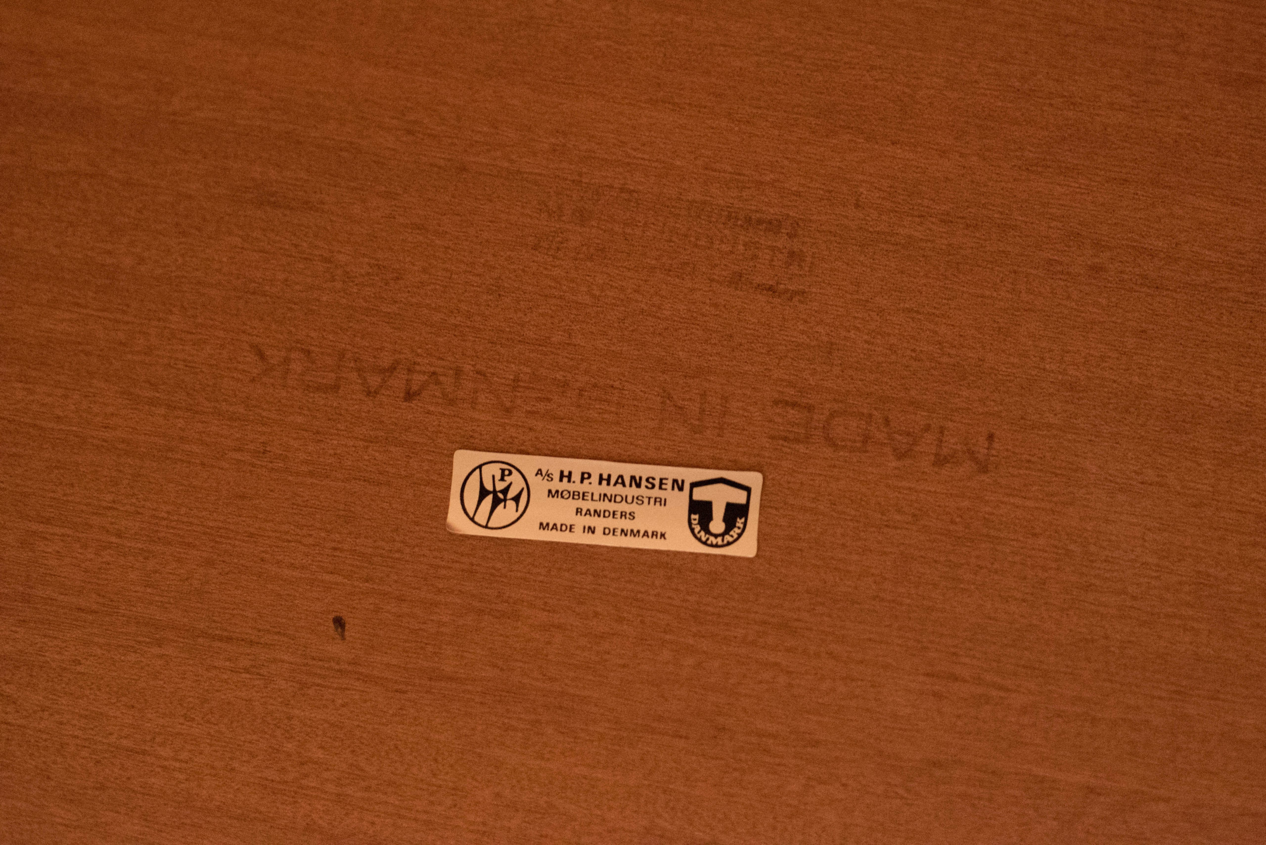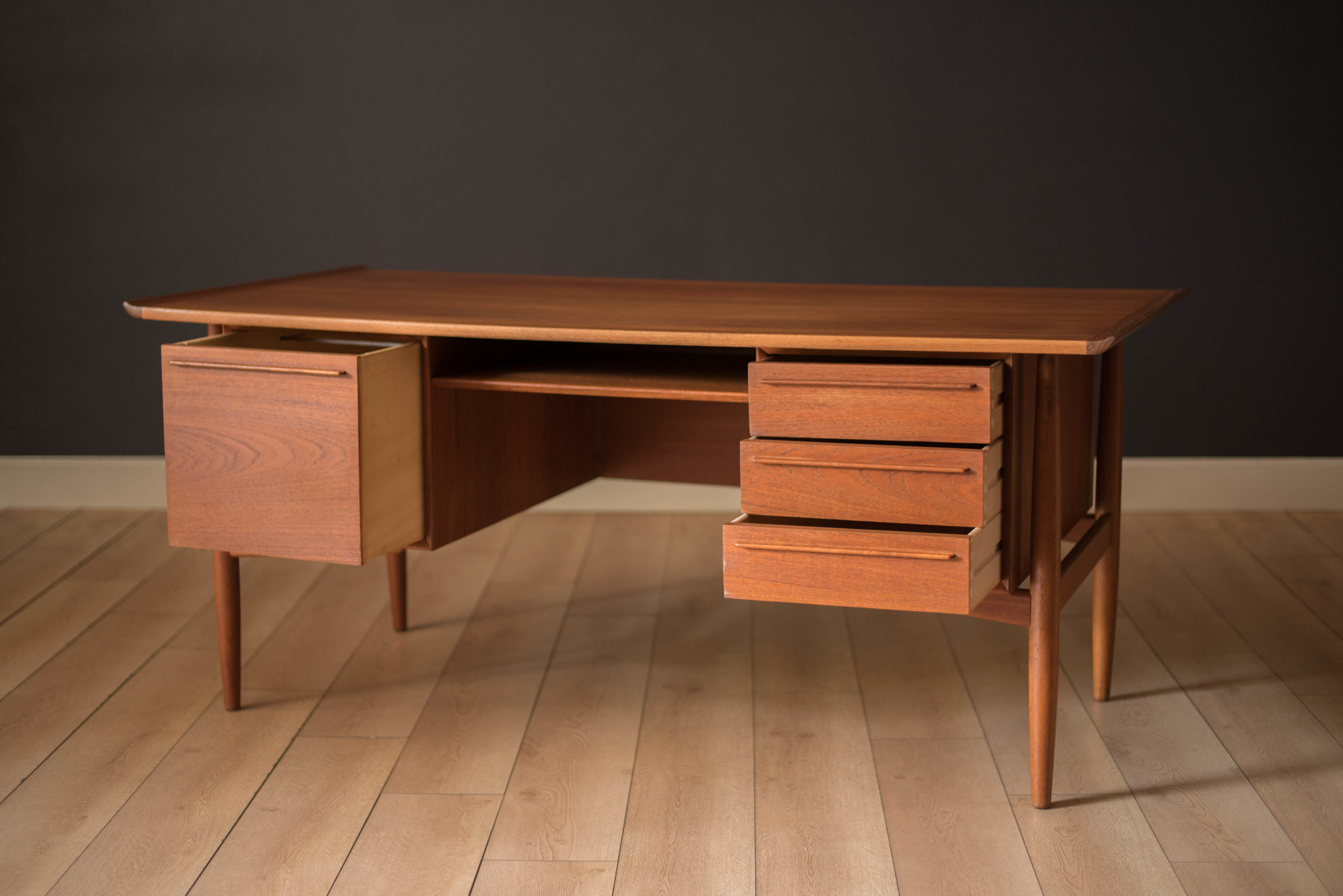 Mid century executive desk in teak manufactured by H.P. Hansen, Denmark, circa 1960s. Features a raised sculpted top and floating external legs. This versatile desk can be showcased from all angles and includes a backside bookshelf compartment with brass accents. Offers plenty of storage and is equipped with three dovetailed drawers and a filing cabinet.