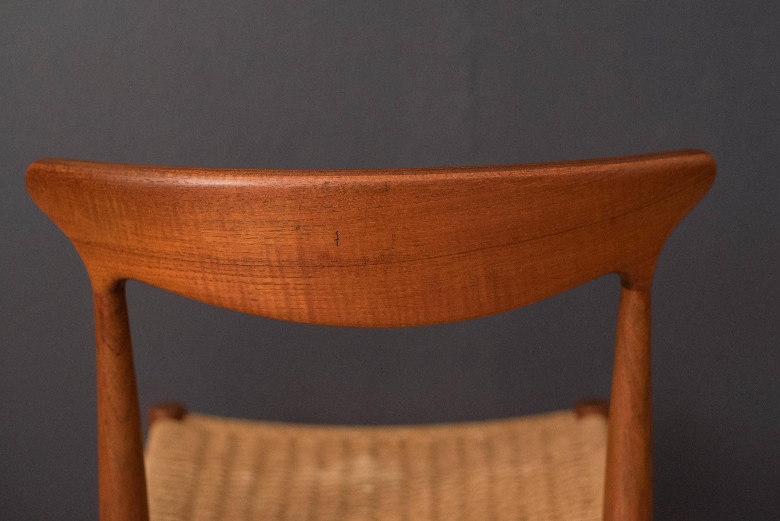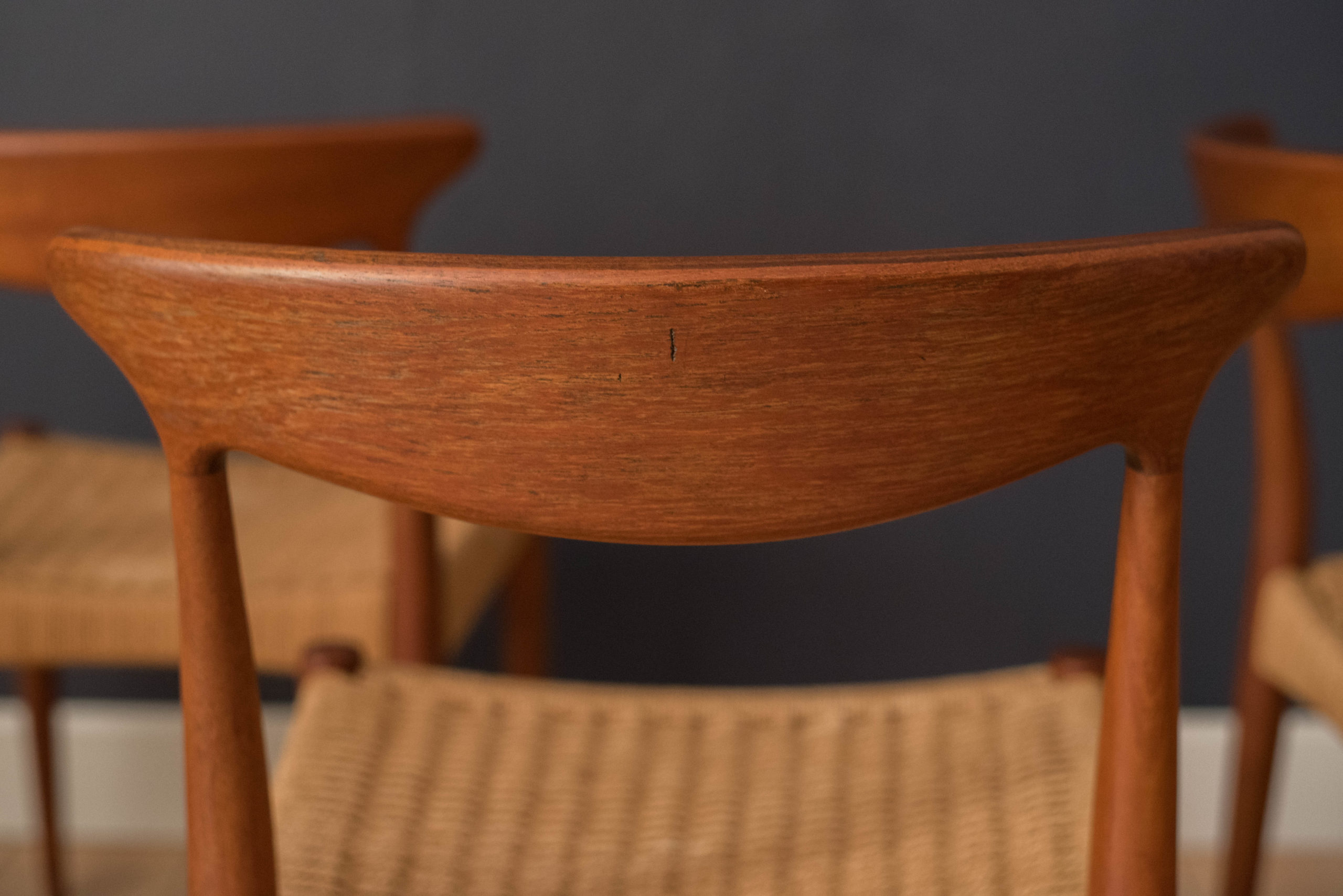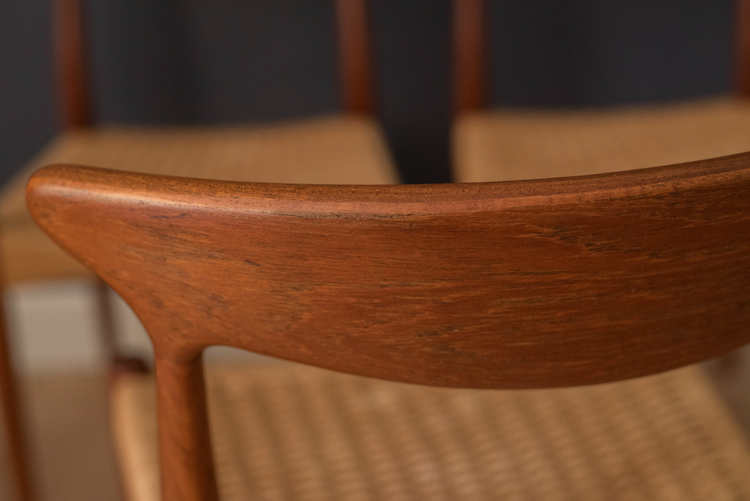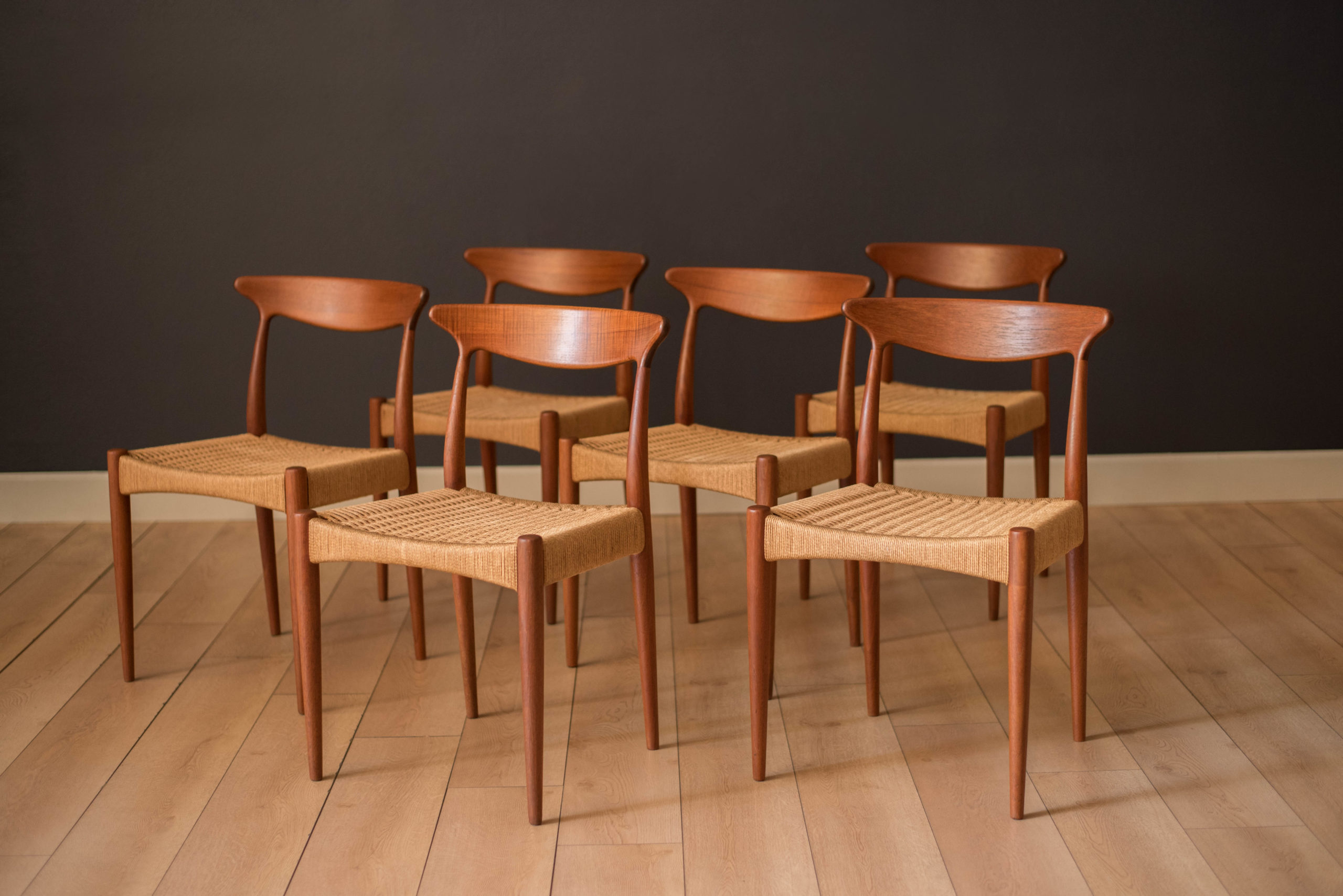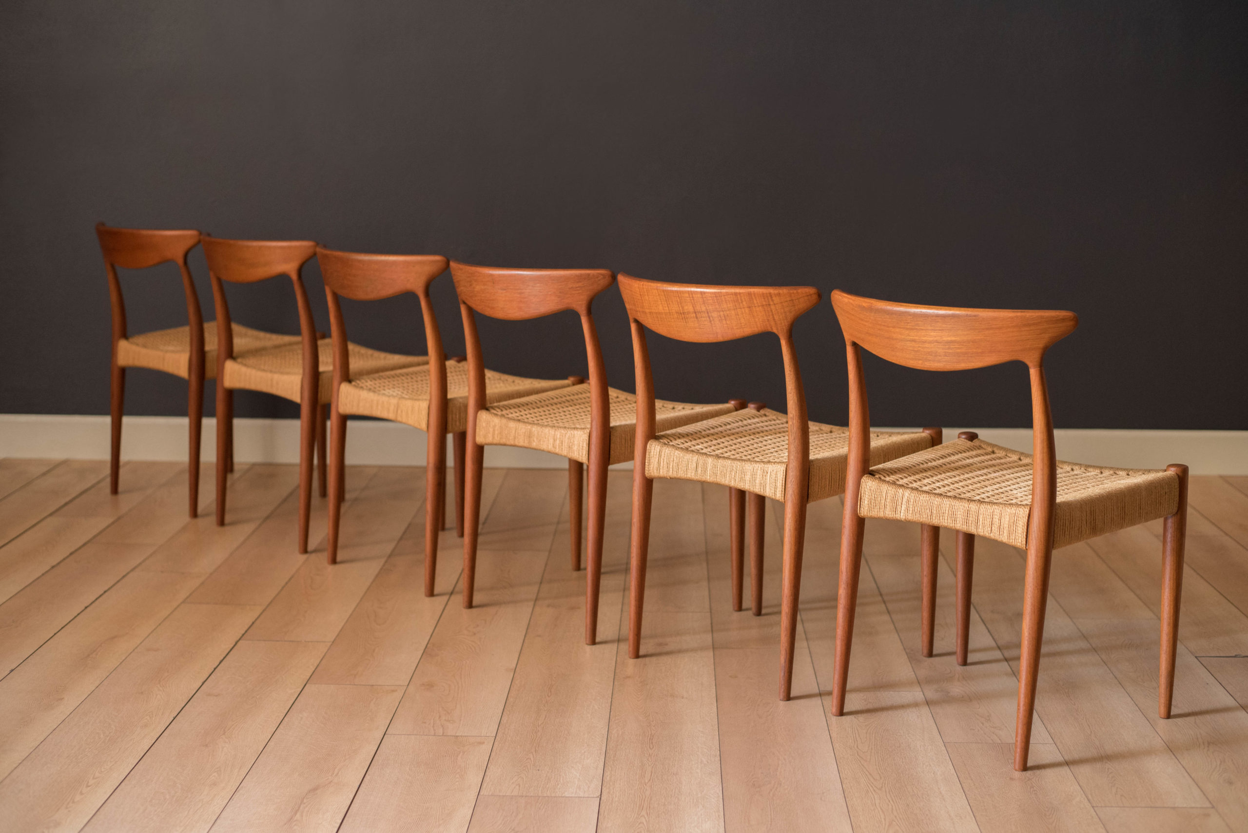 Mid-Century Modern set of six dining chairs in teak designed by Arne Hovmand-Olsen for Mogens Kold, circa 1950’s. Features sculptural teak frames with the original papercord seating all intact.